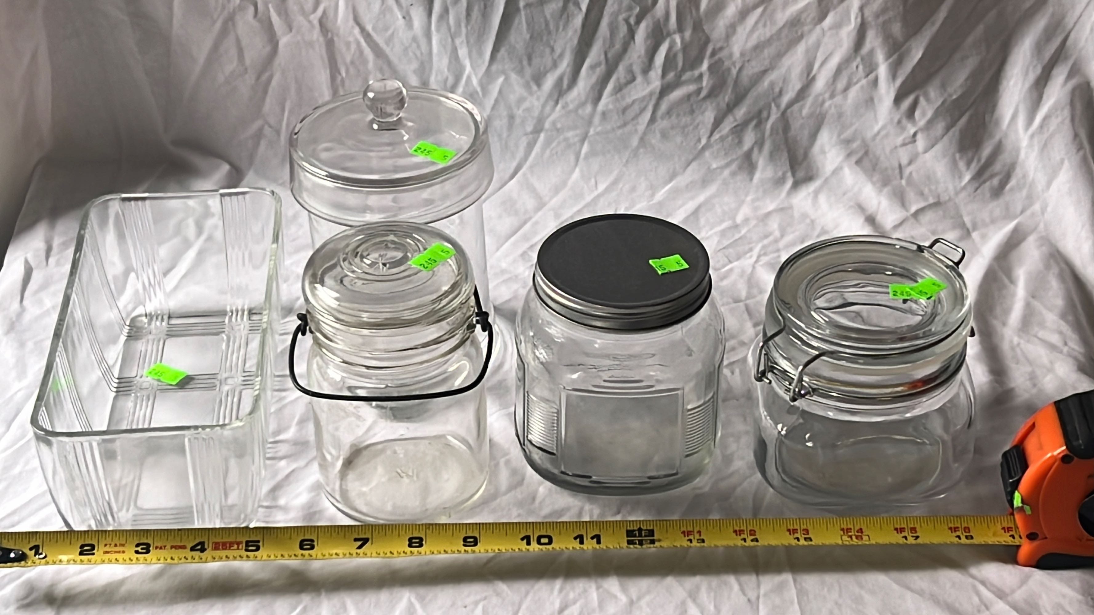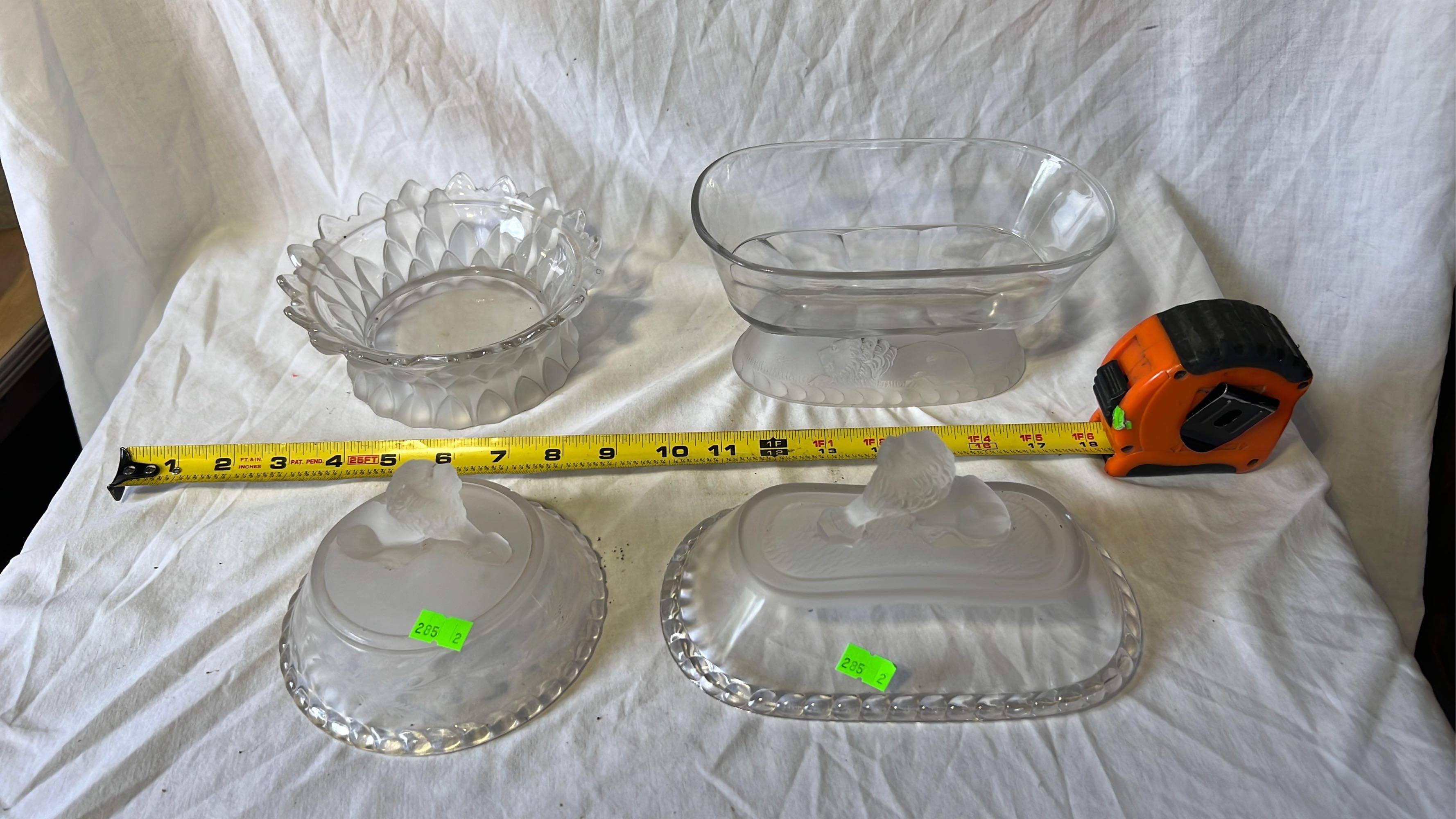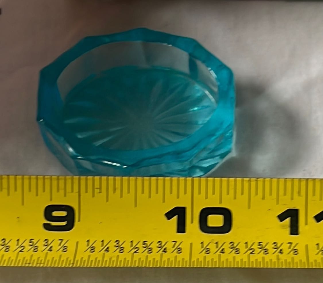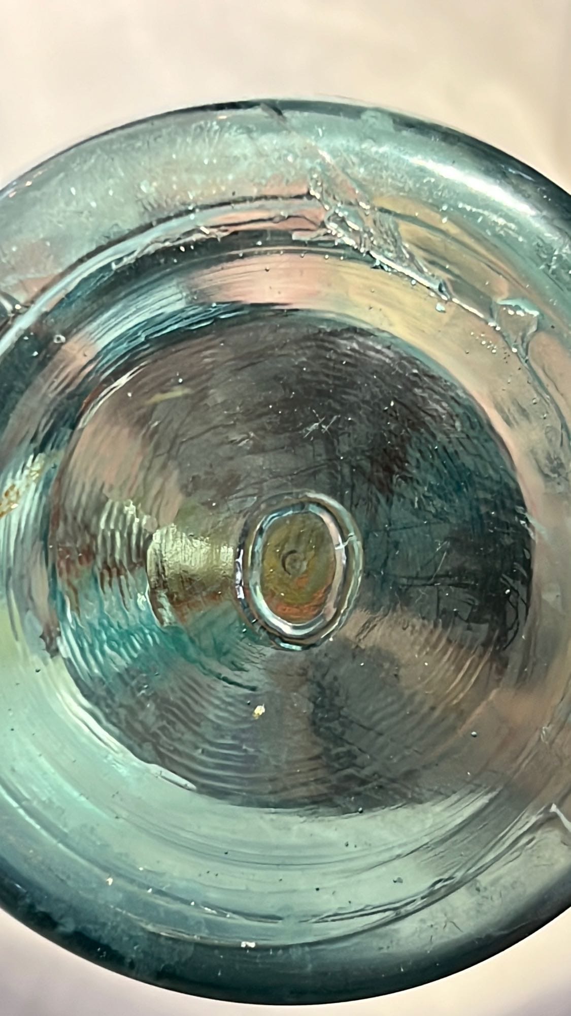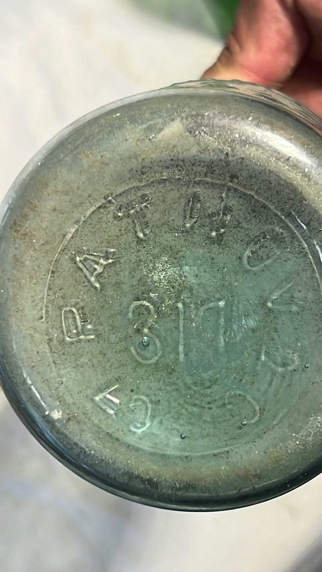 106 Gibson Blue Glass Lid 2.5” • Clear Ball No. 10 Lid 2.25” • Vintage Letter Opener • Brown Funeral Home Thermometer Advertisement 6.5” • Peacock Feathers 16”