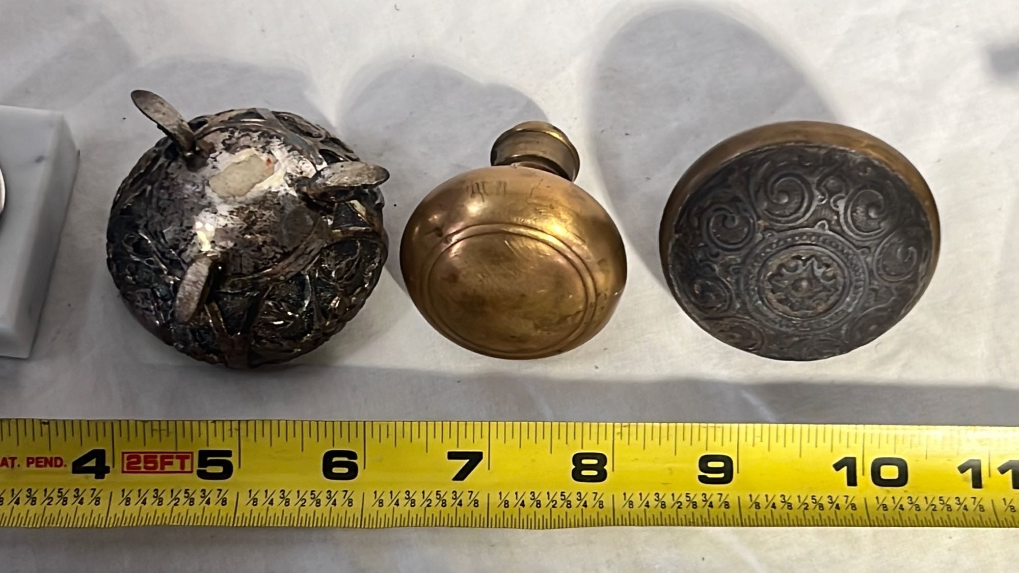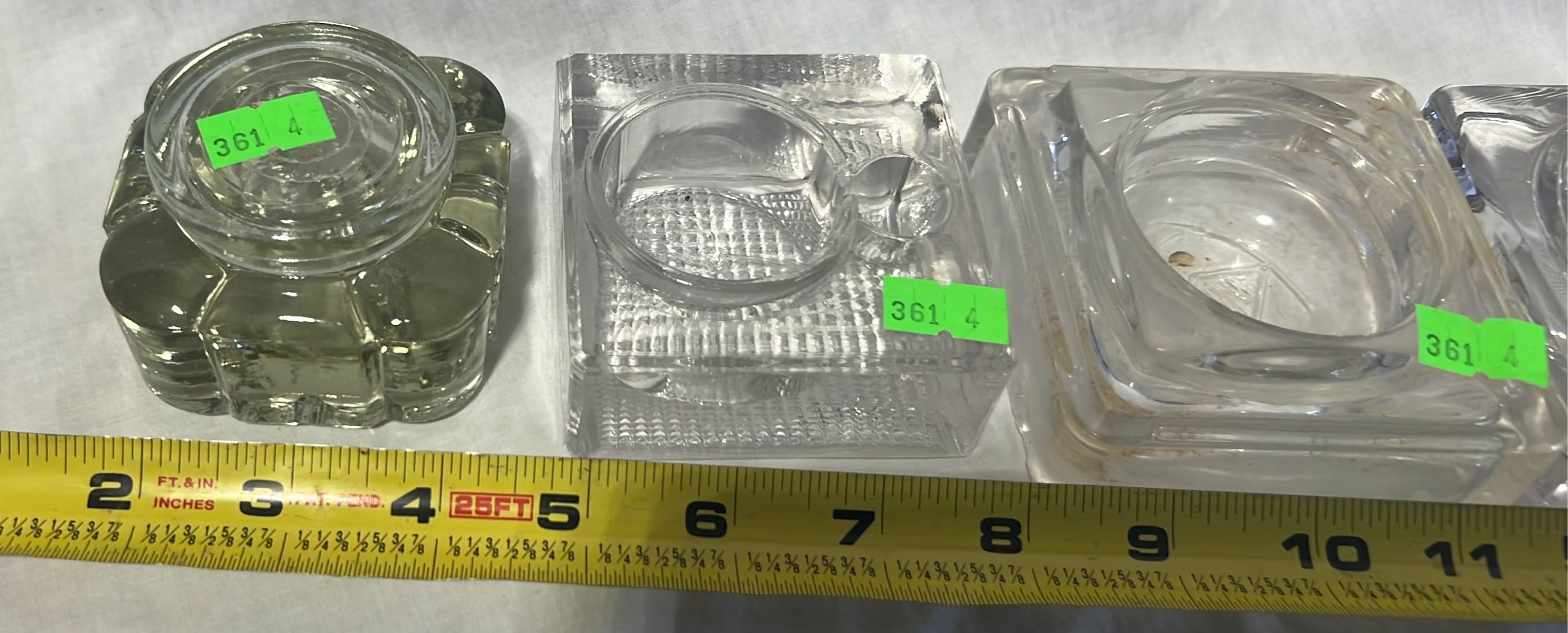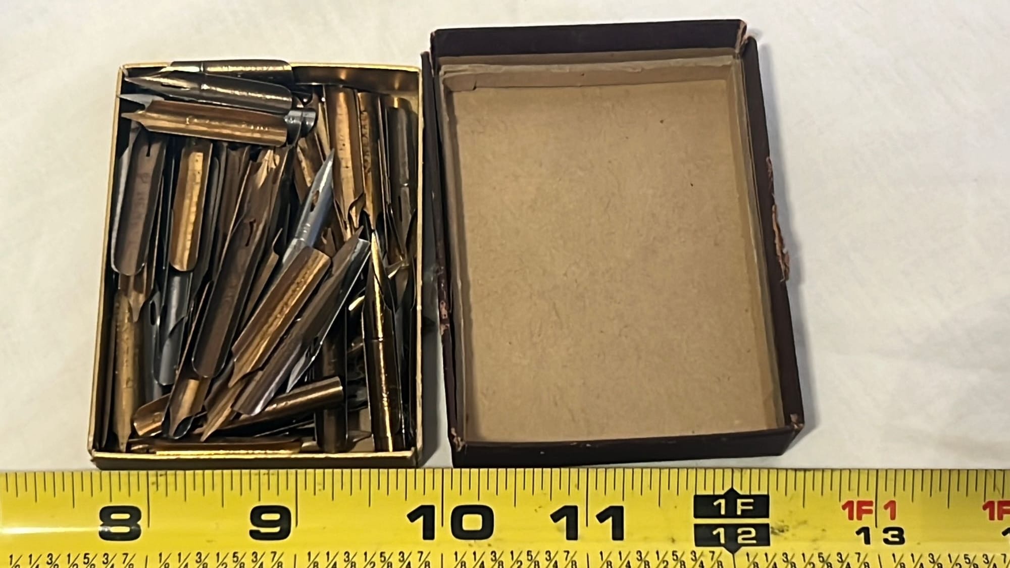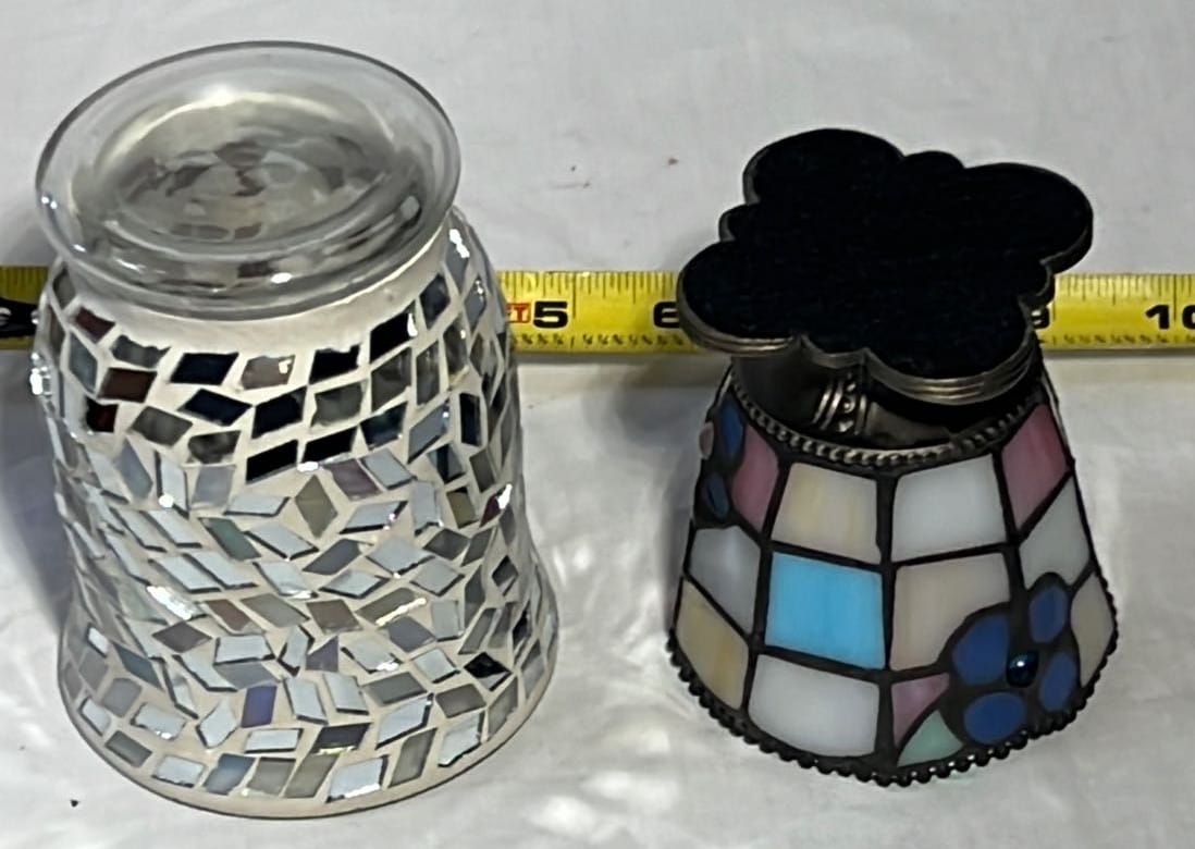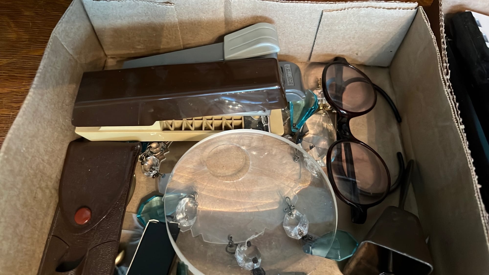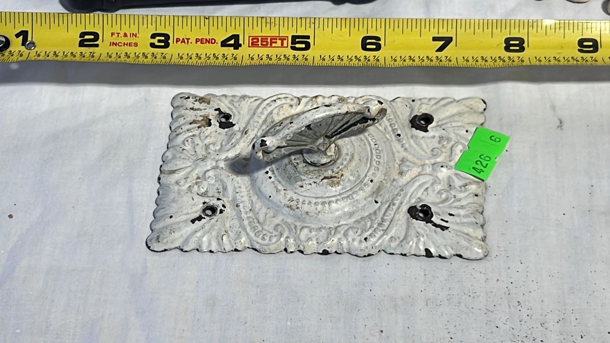 106 Gibson Blue Glass Lid 2.5” • Clear Ball No. 10 Lid 2.25” • Vintage Letter Opener • Brown Funeral Home Thermometer Advertisement 6.5” • Peacock Feathers 16”