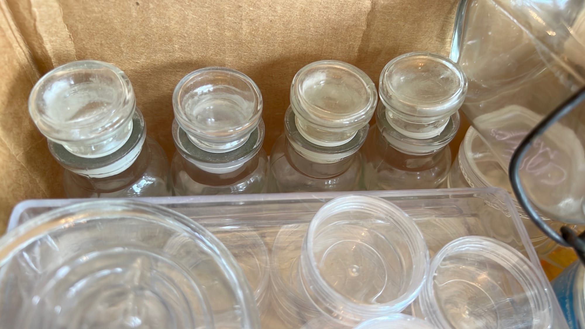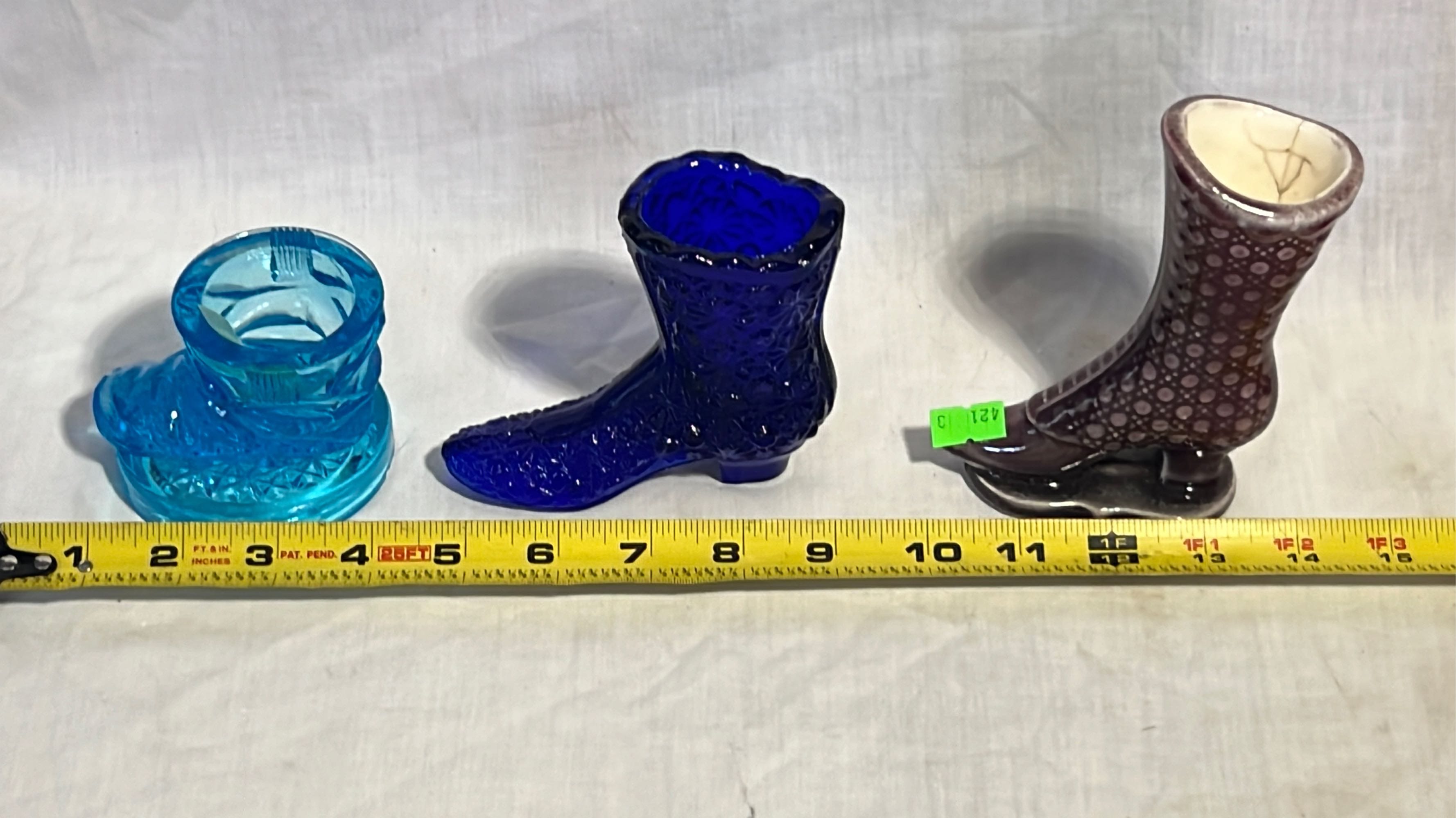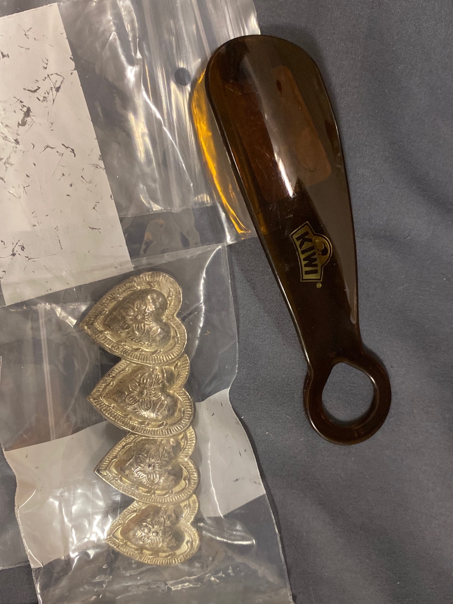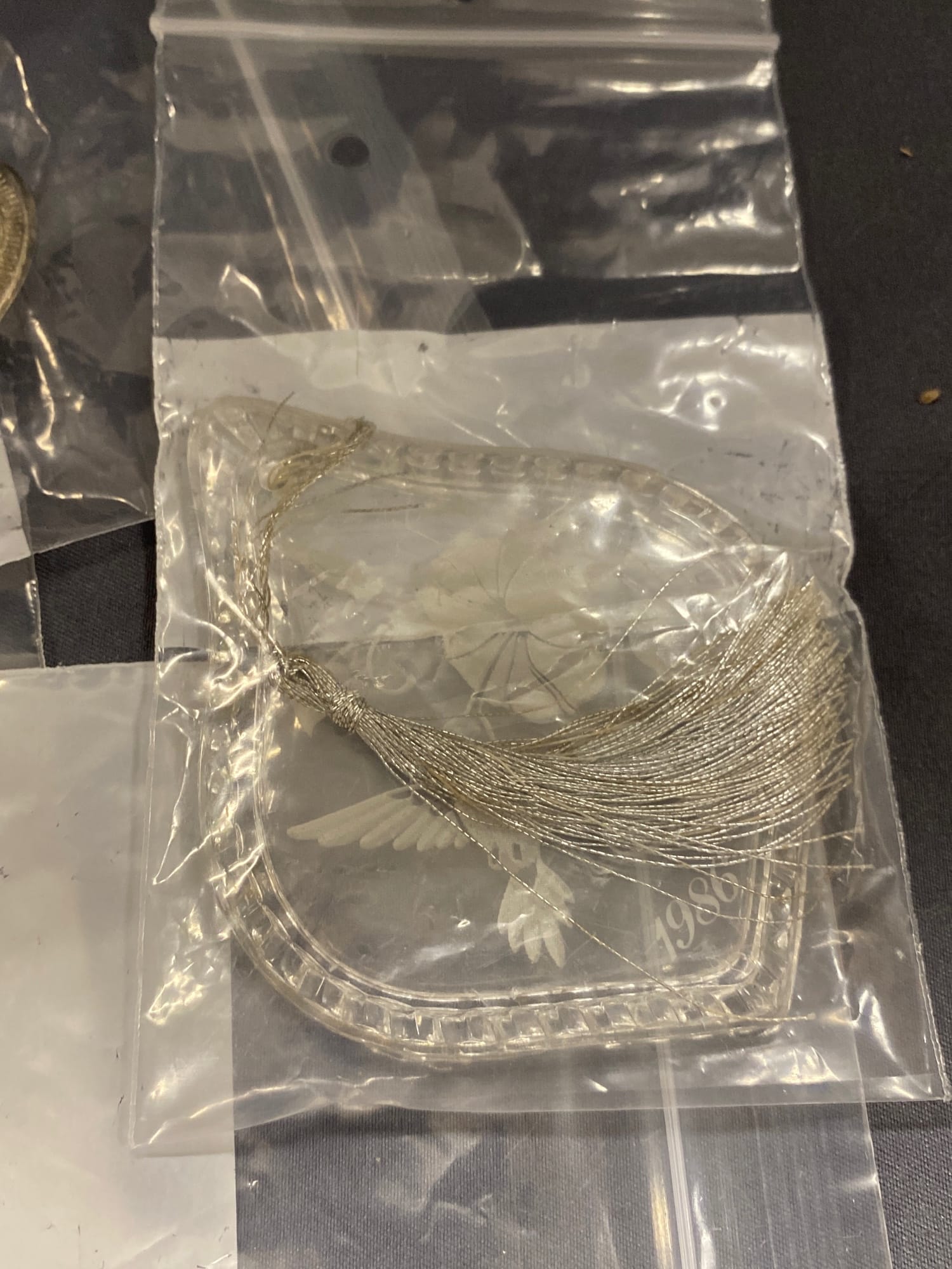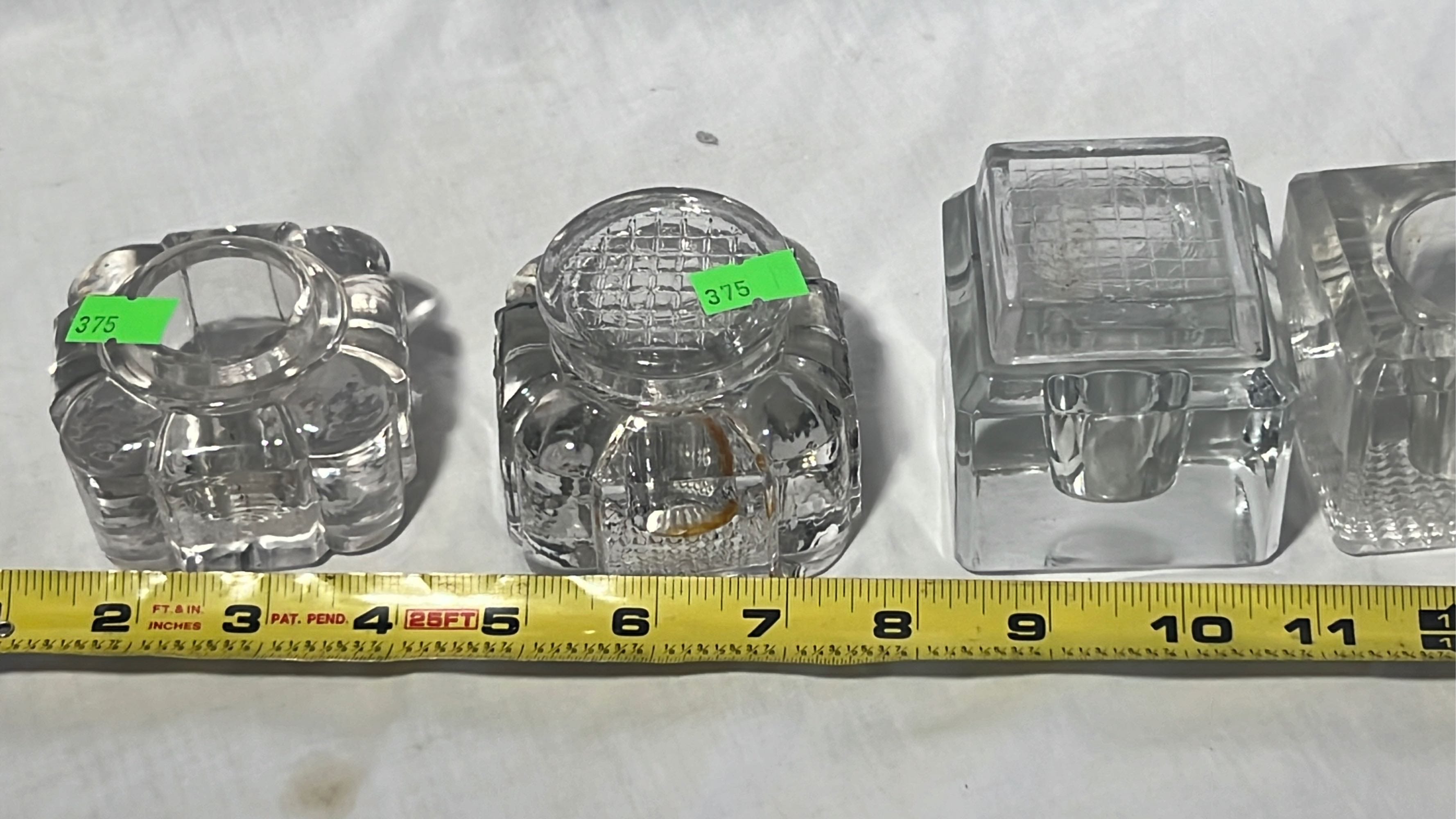 106 Gibson Blue Glass Lid 2.5” • Clear Ball No. 10 Lid 2.25” • Vintage Letter Opener • Brown Funeral Home Thermometer Advertisement 6.5” • Peacock Feathers 16”