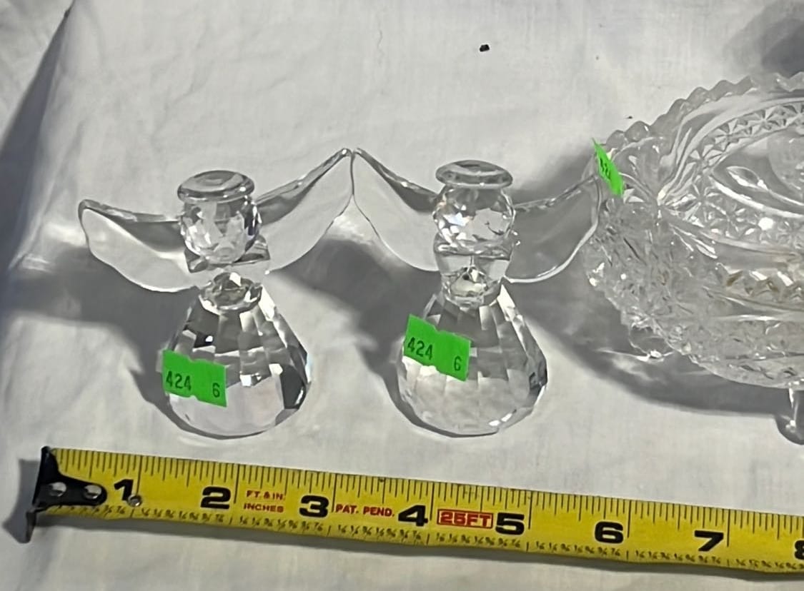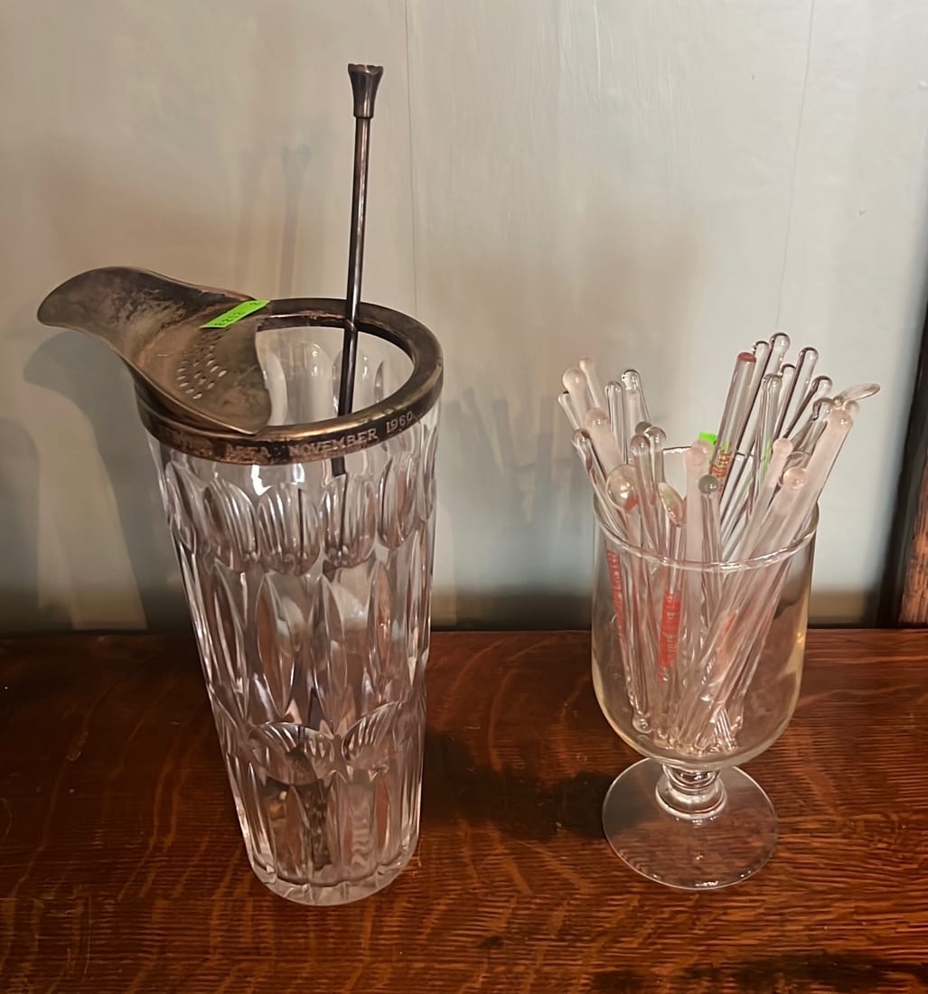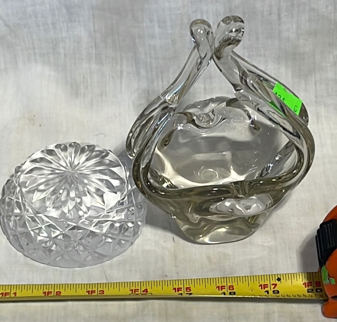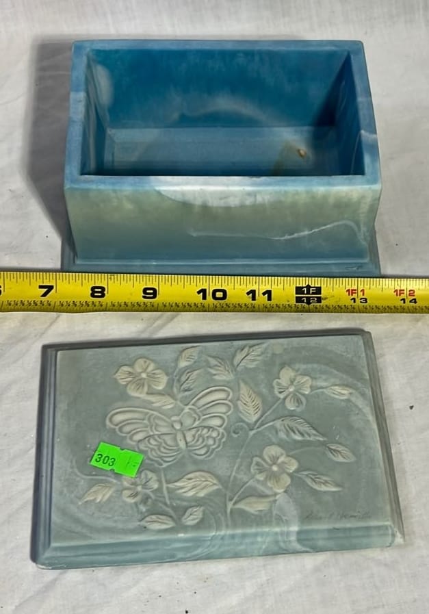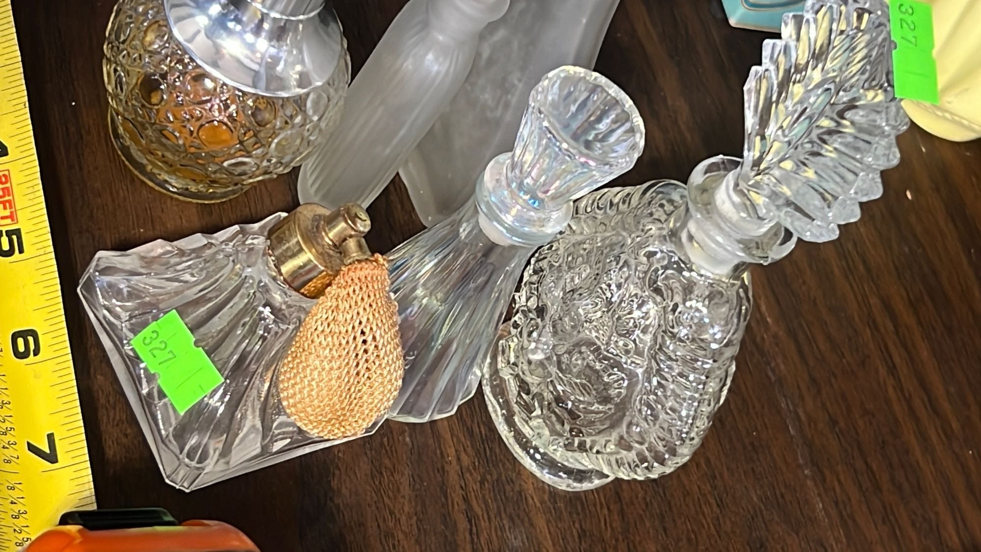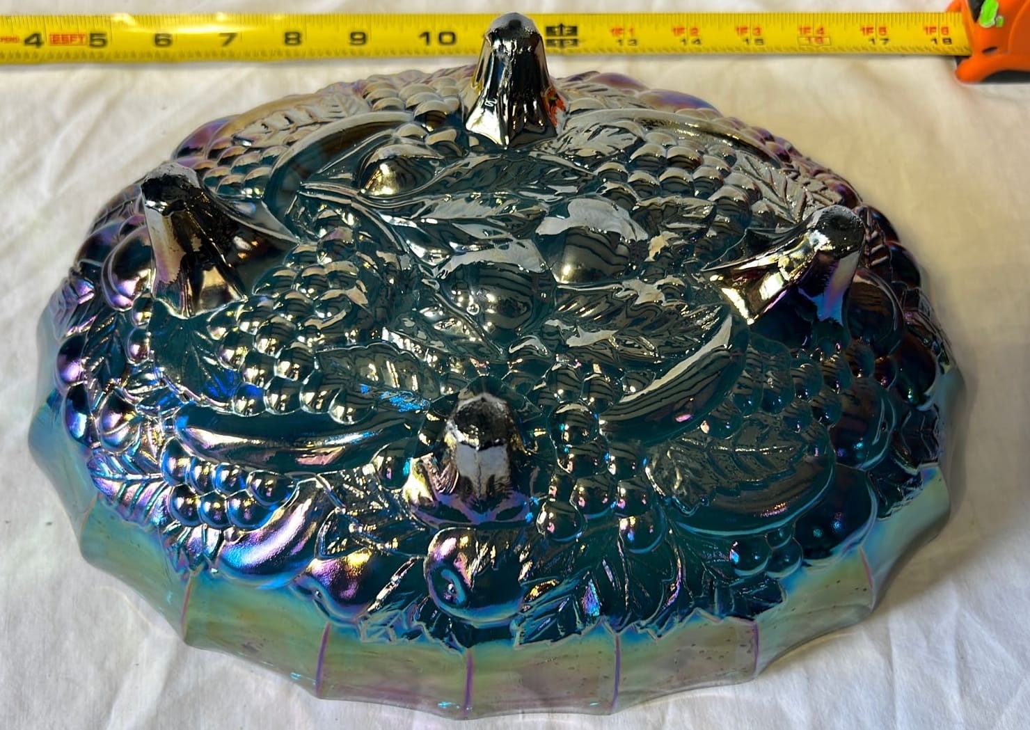 106 Gibson Blue Glass Lid 2.5” • Clear Ball No. 10 Lid 2.25” • Vintage Letter Opener • Brown Funeral Home Thermometer Advertisement 6.5” • Peacock Feathers 16”