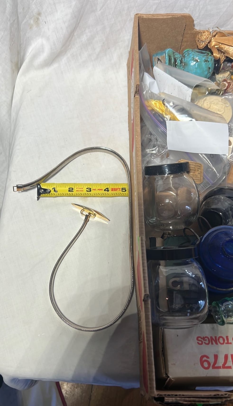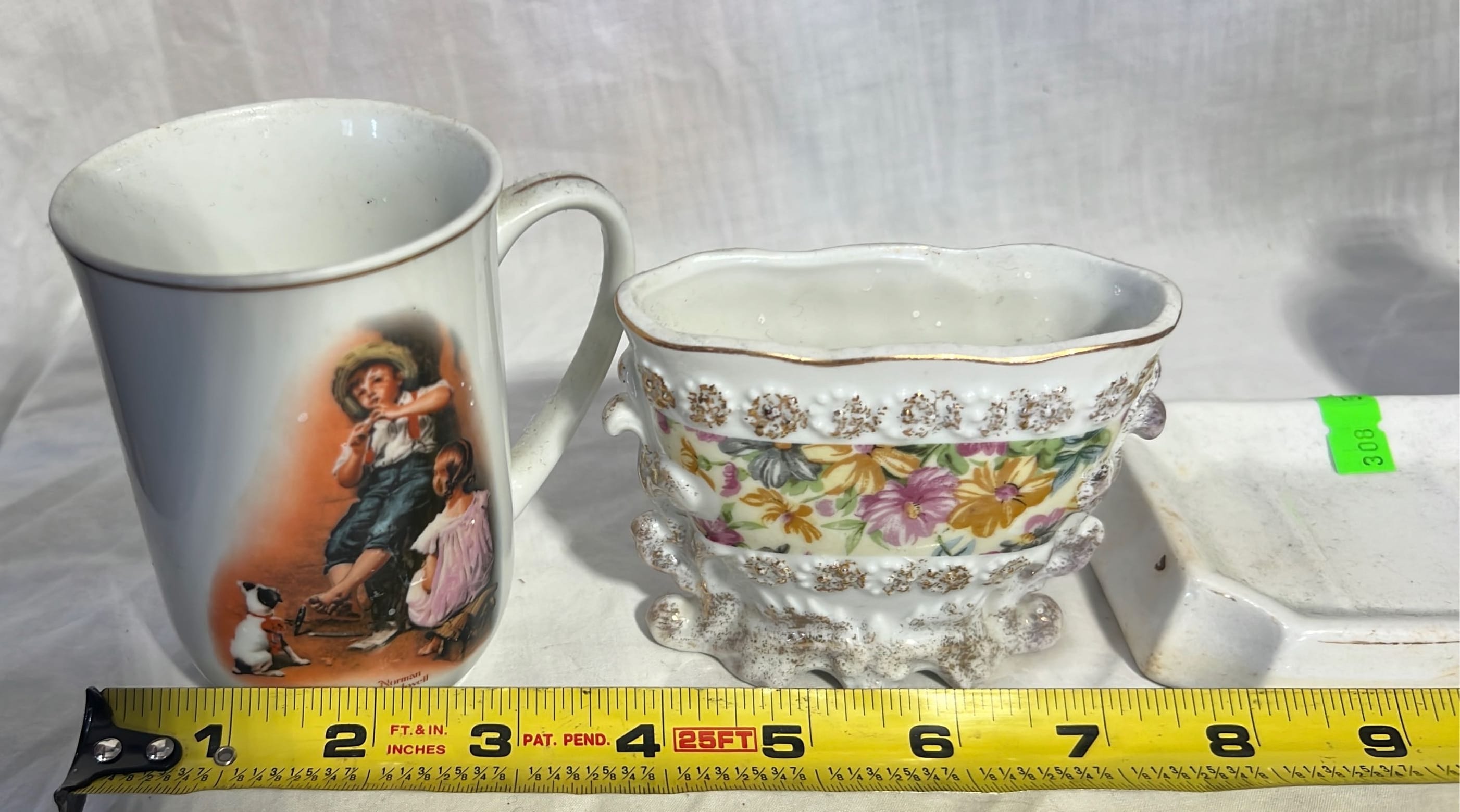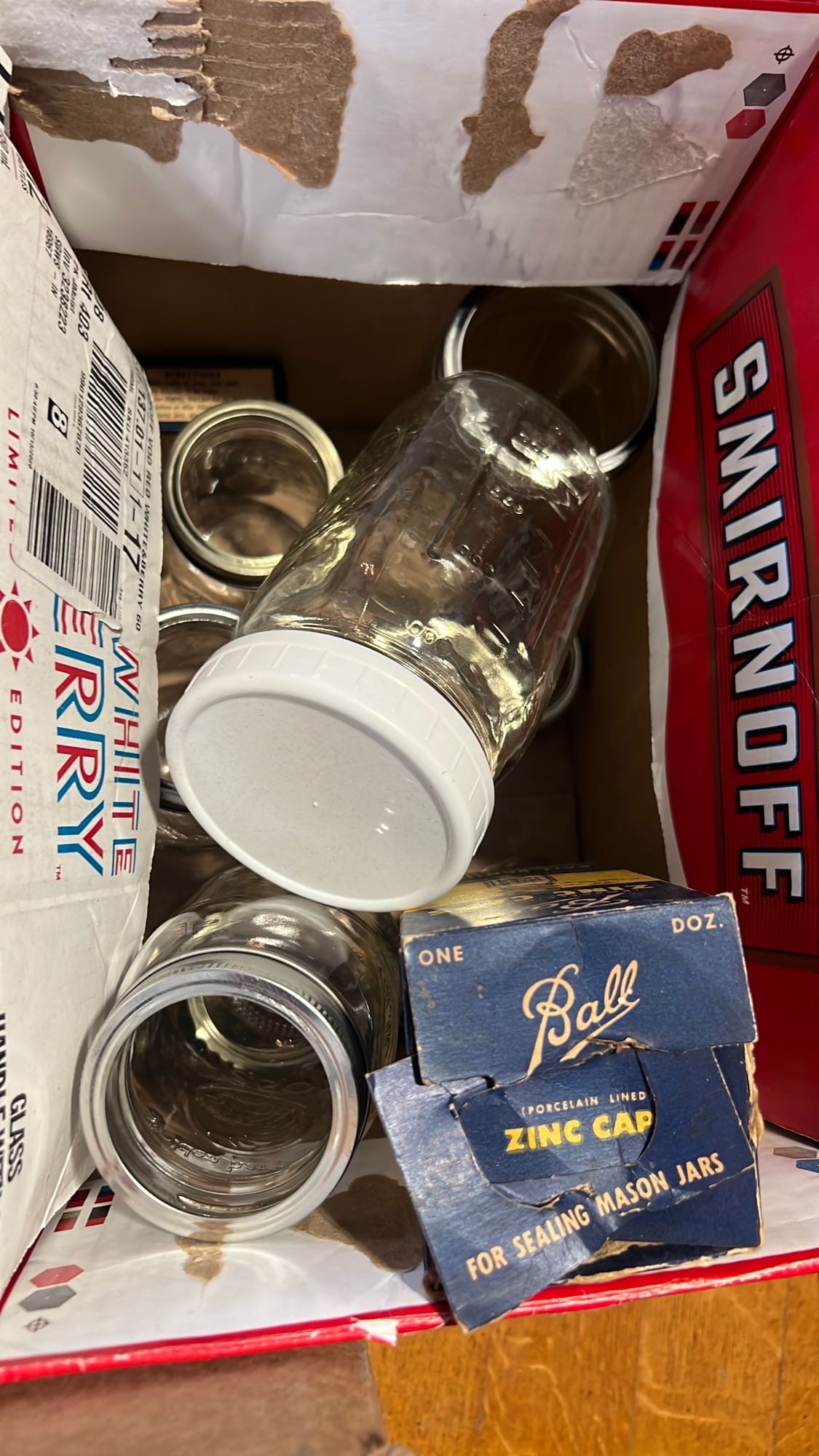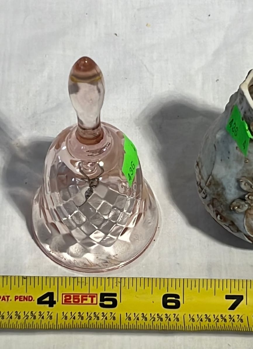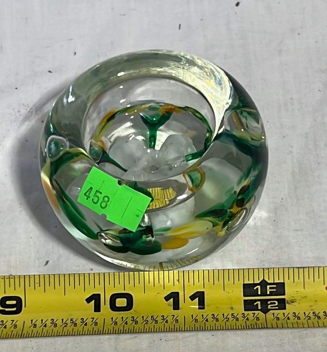 106 Gibson Blue Glass Lid 2.5” • Clear Ball No. 10 Lid 2.25” • Vintage Letter Opener • Brown Funeral Home Thermometer Advertisement 6.5” • Peacock Feathers 16”
