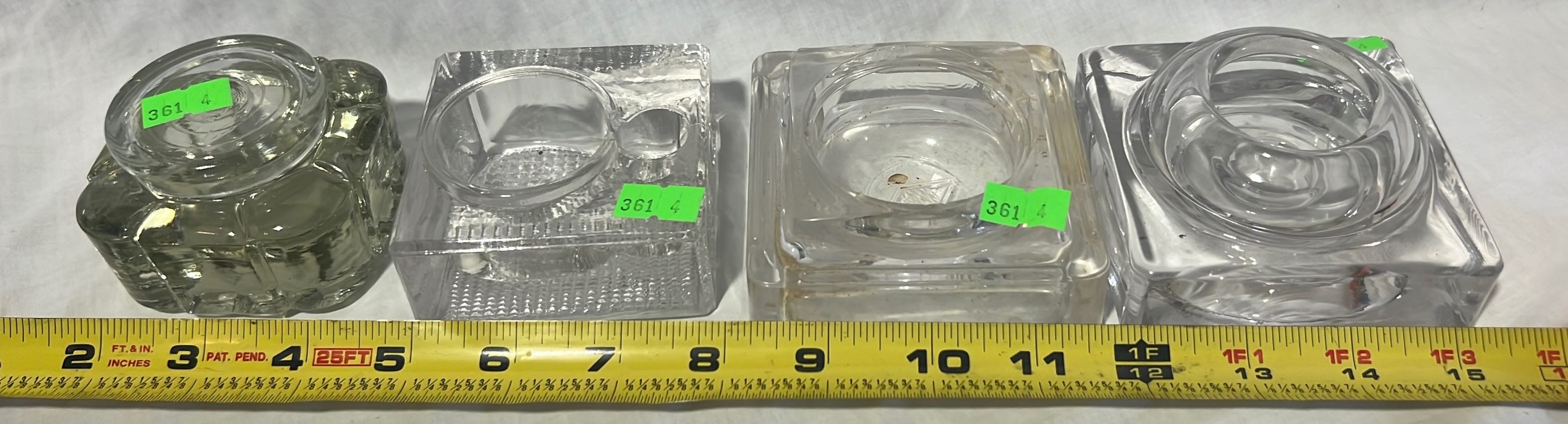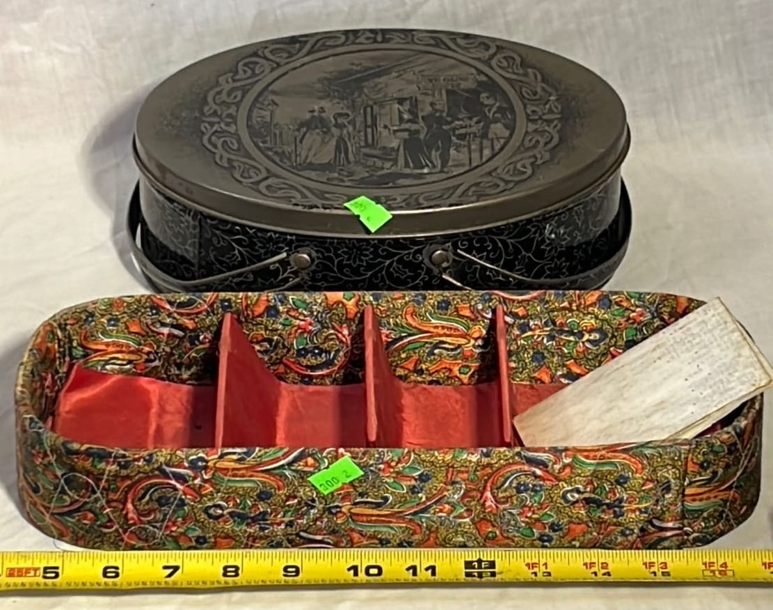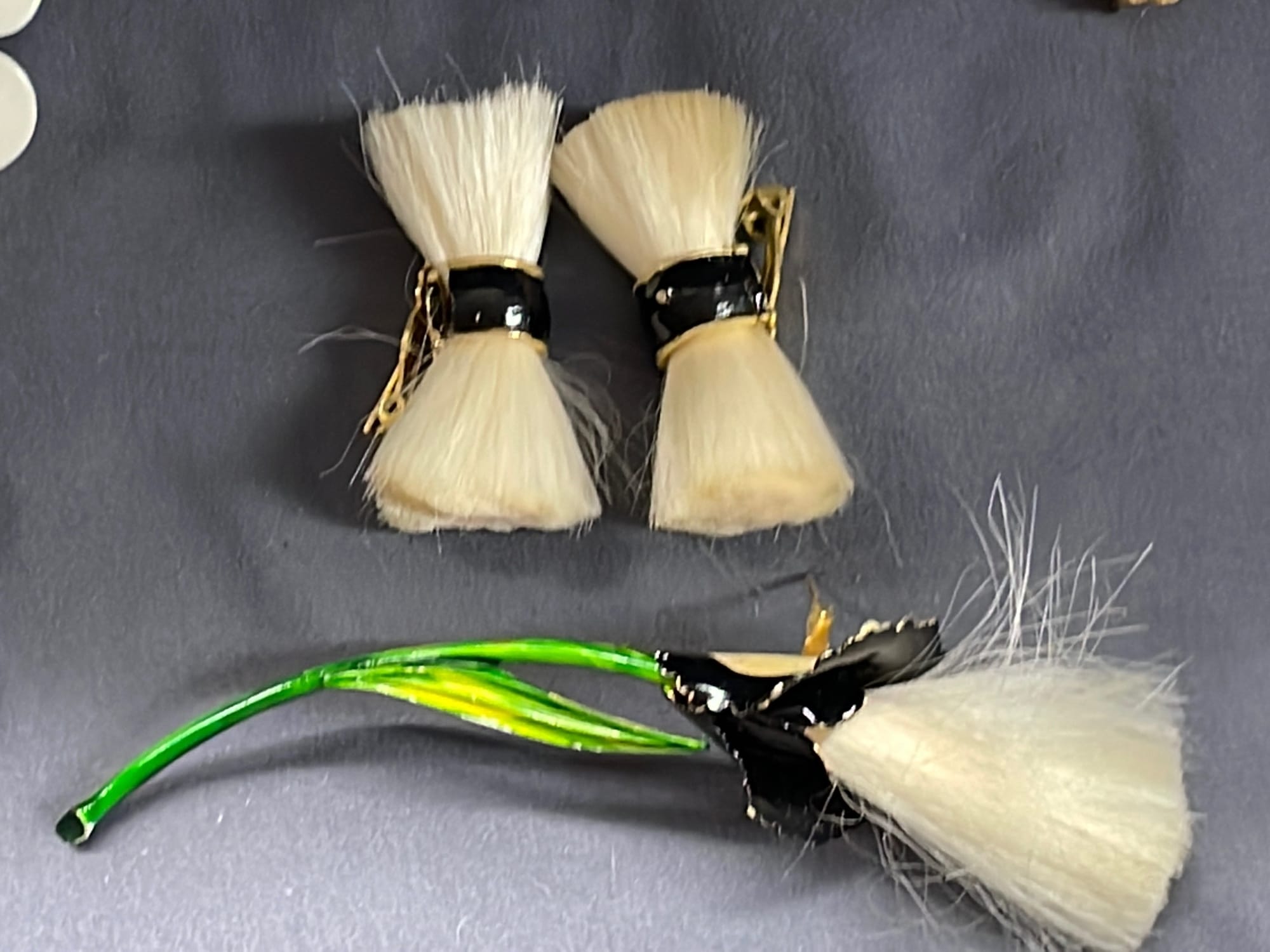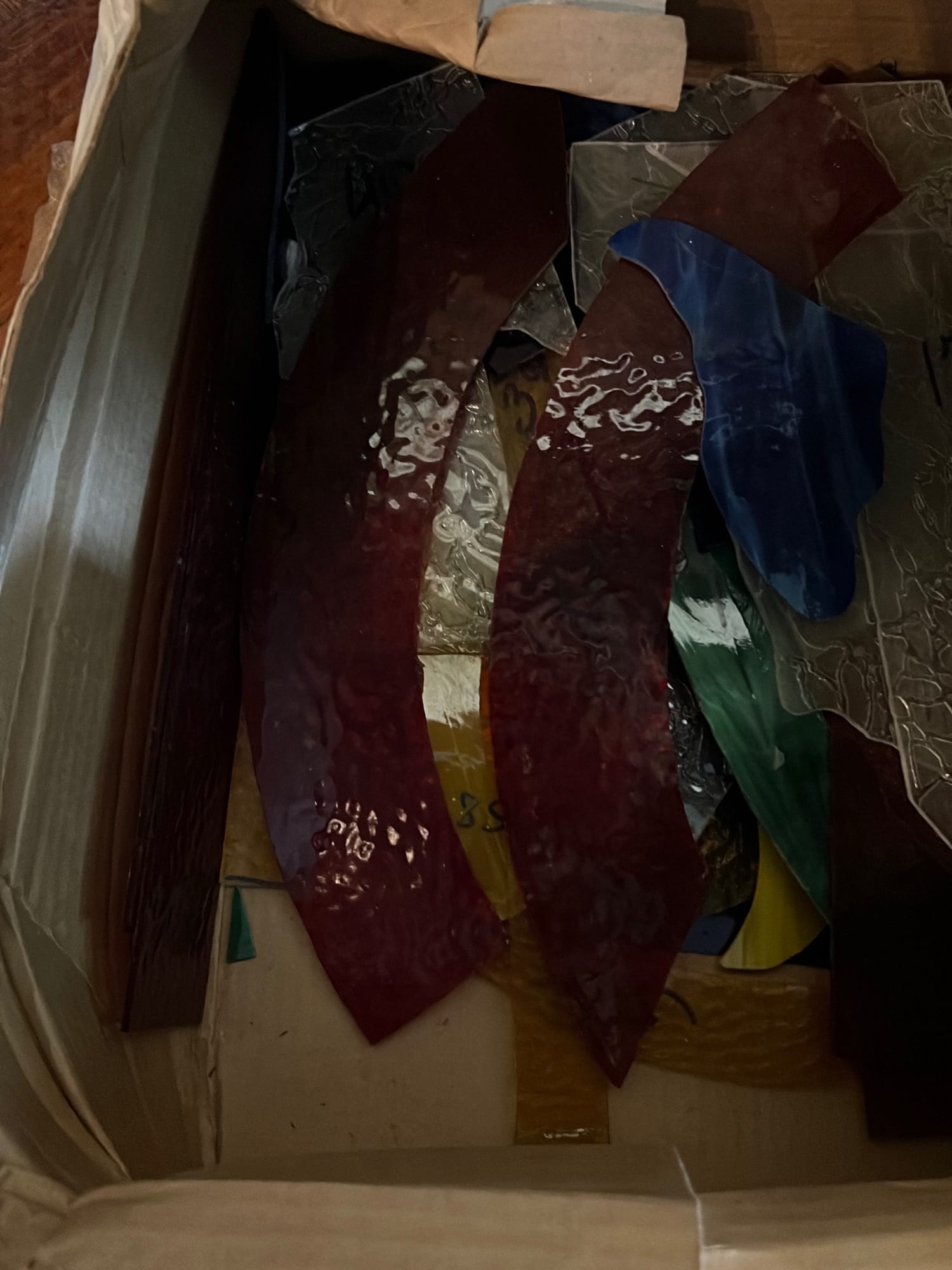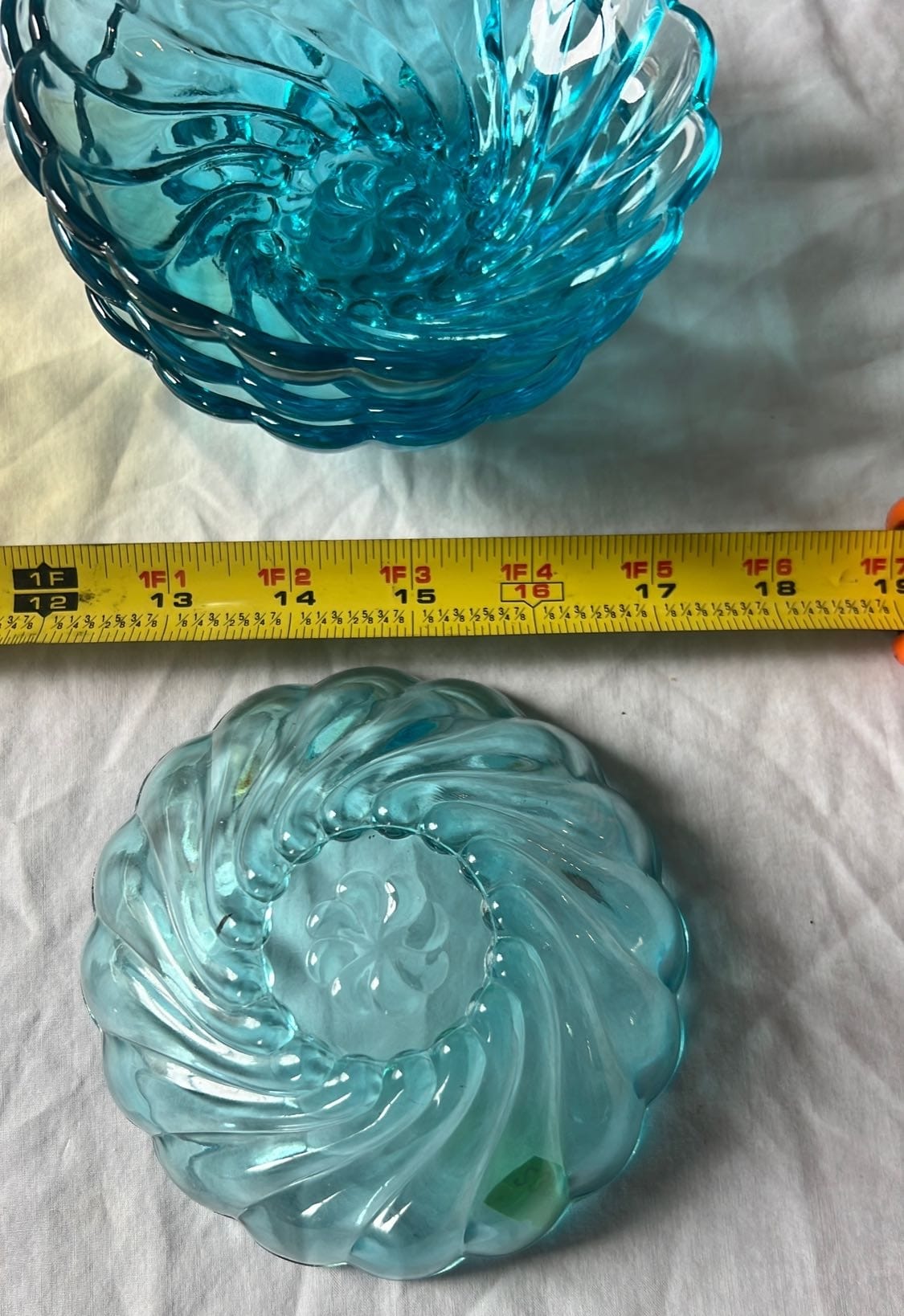 106 Gibson Blue Glass Lid 2.5” • Clear Ball No. 10 Lid 2.25” • Vintage Letter Opener • Brown Funeral Home Thermometer Advertisement 6.5” • Peacock Feathers 16”