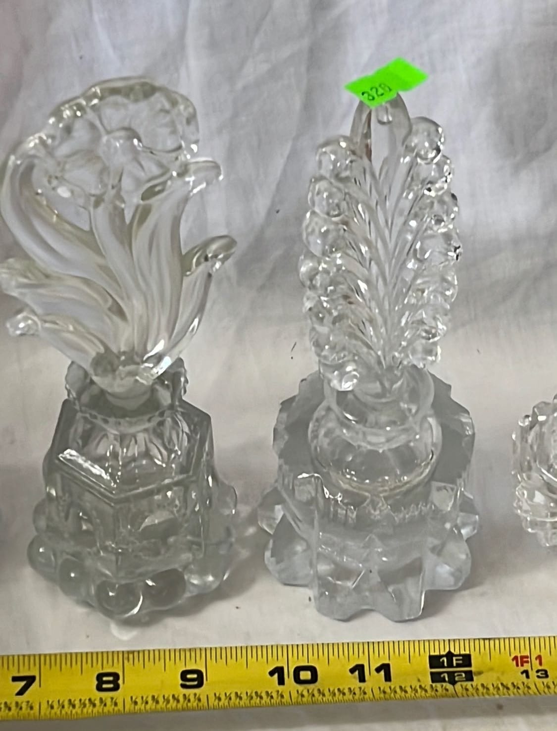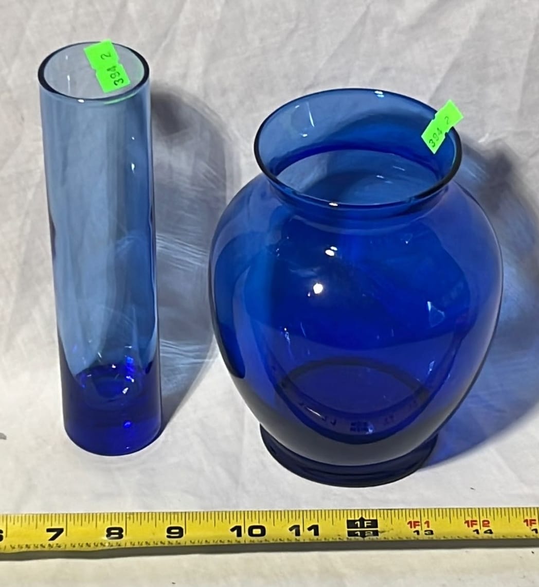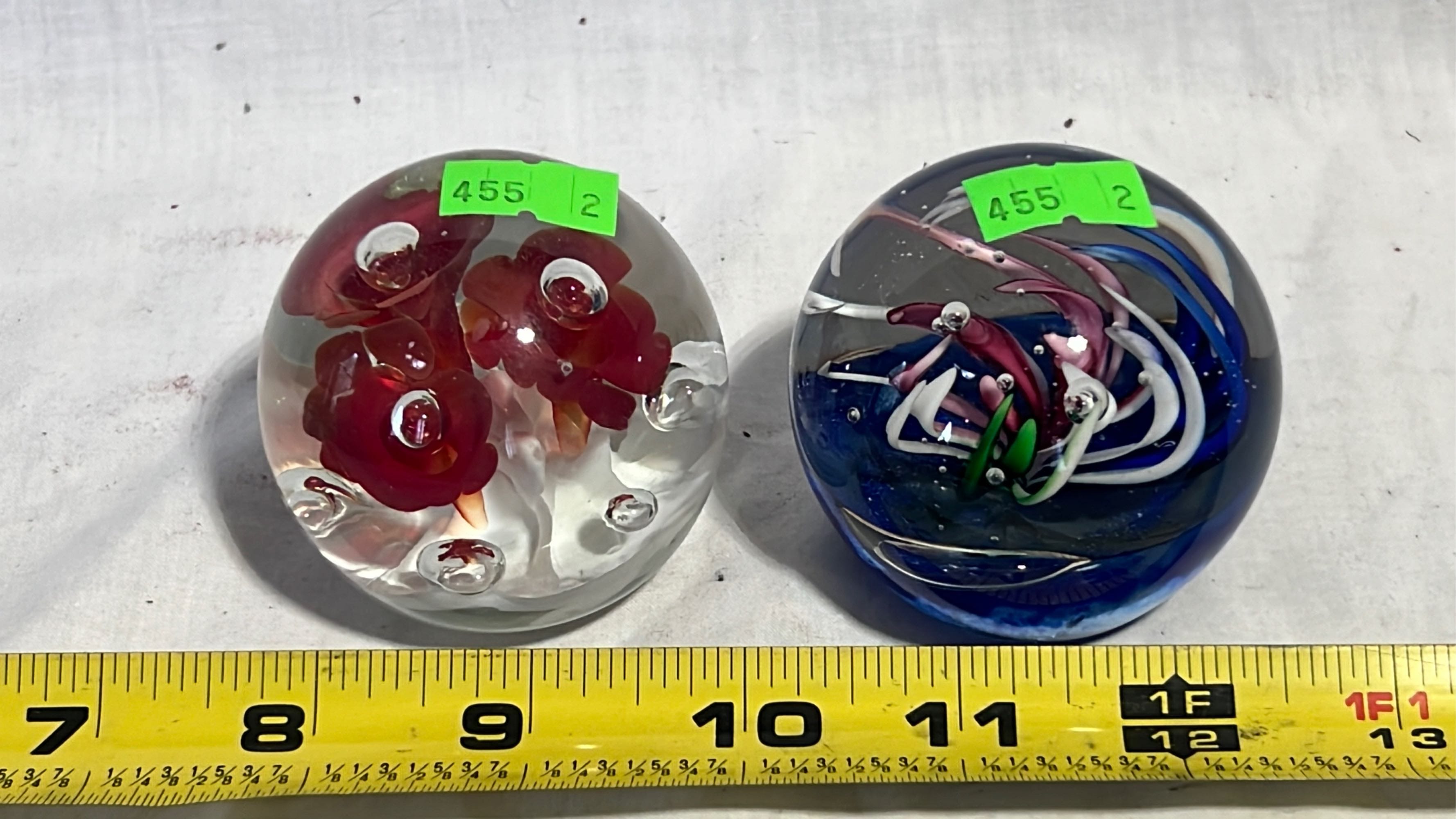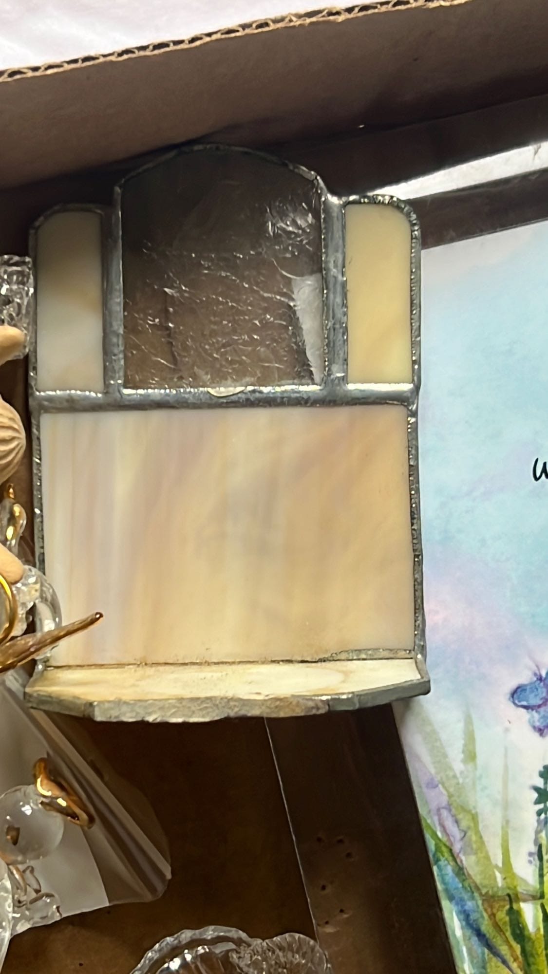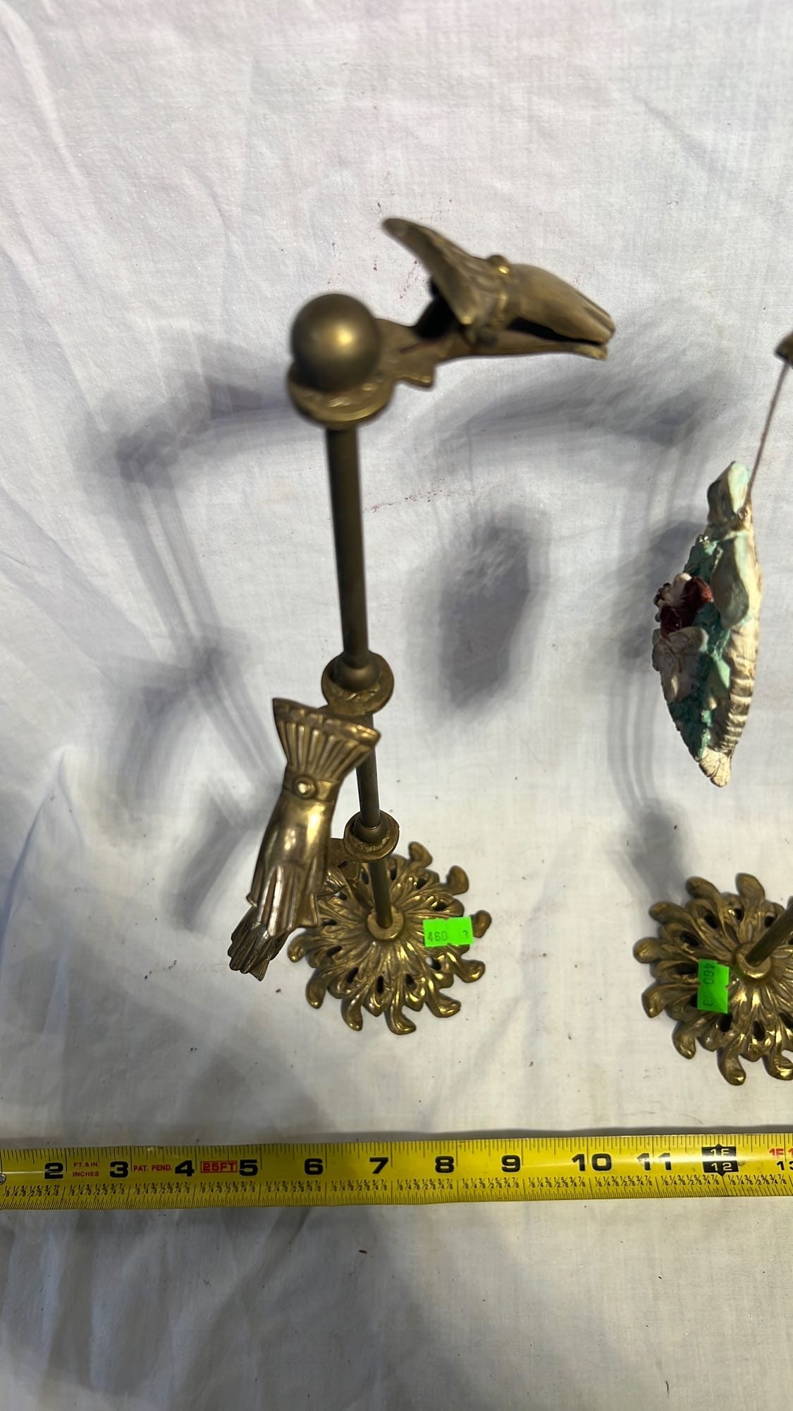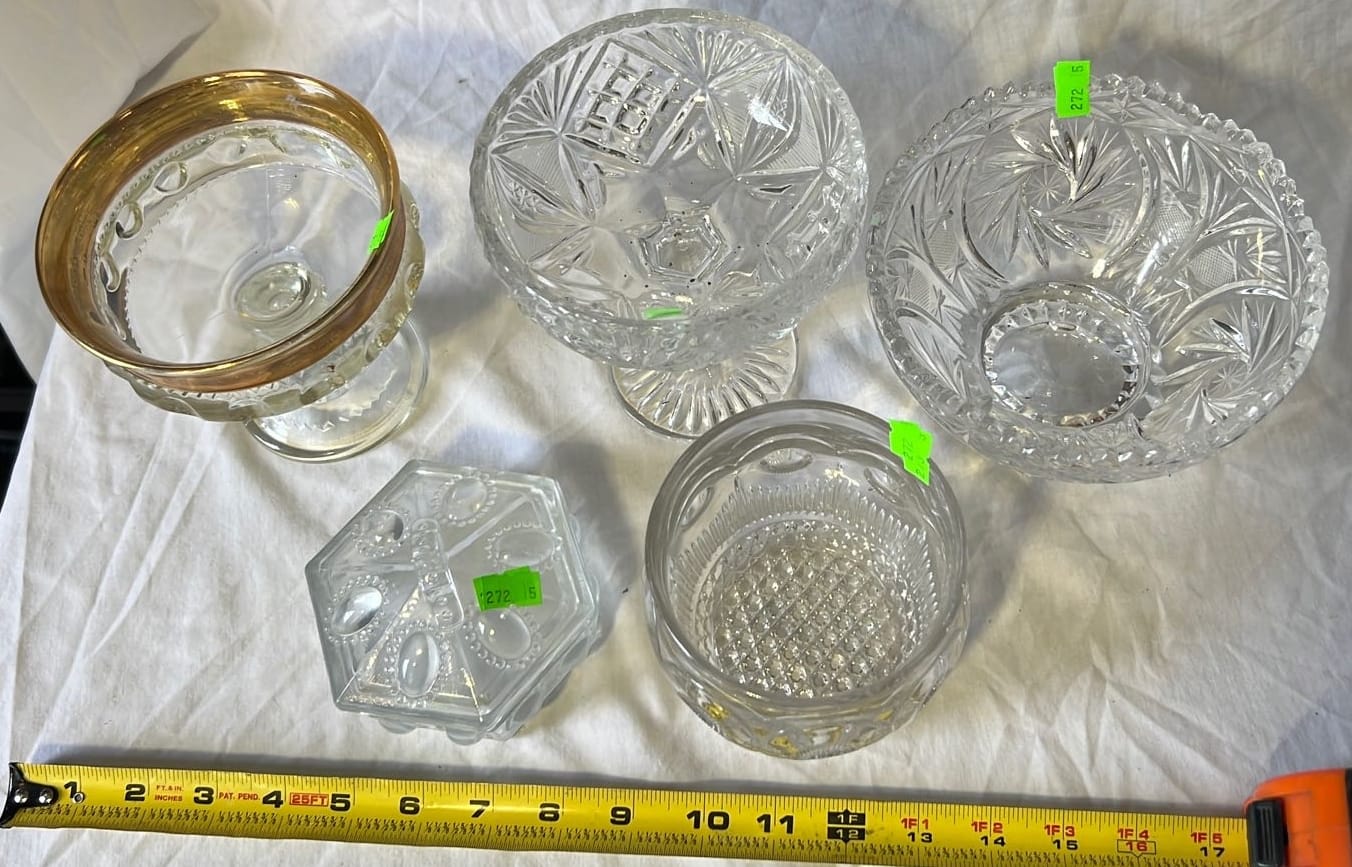 106 Gibson Blue Glass Lid 2.5” • Clear Ball No. 10 Lid 2.25” • Vintage Letter Opener • Brown Funeral Home Thermometer Advertisement 6.5” • Peacock Feathers 16”