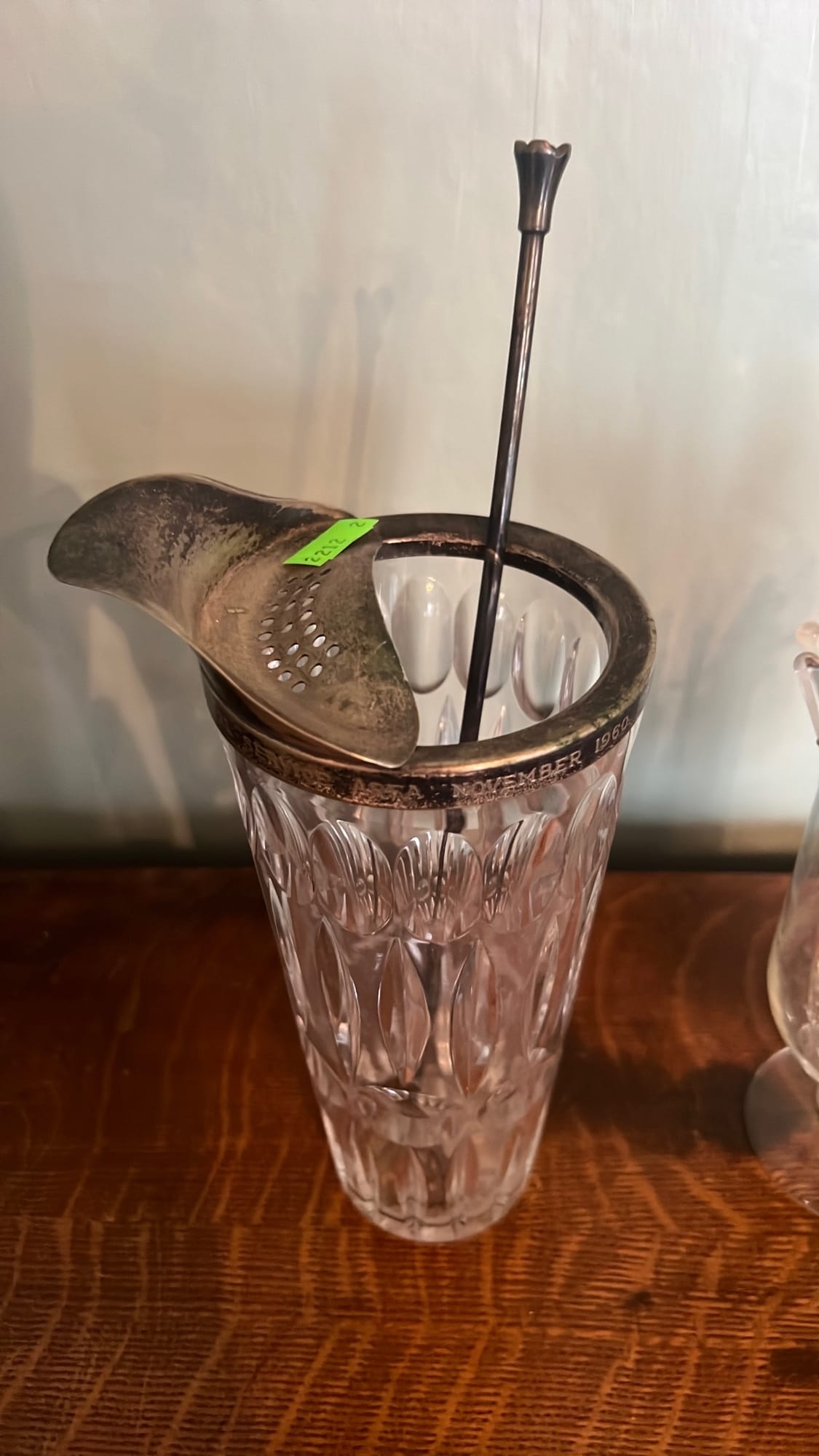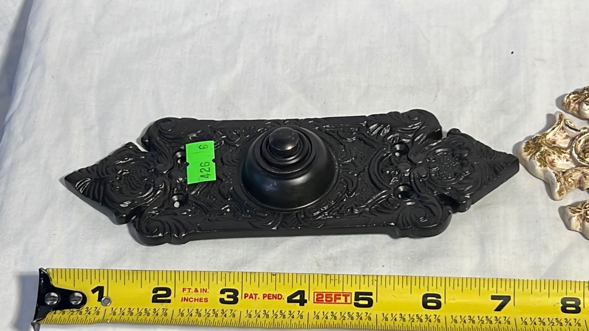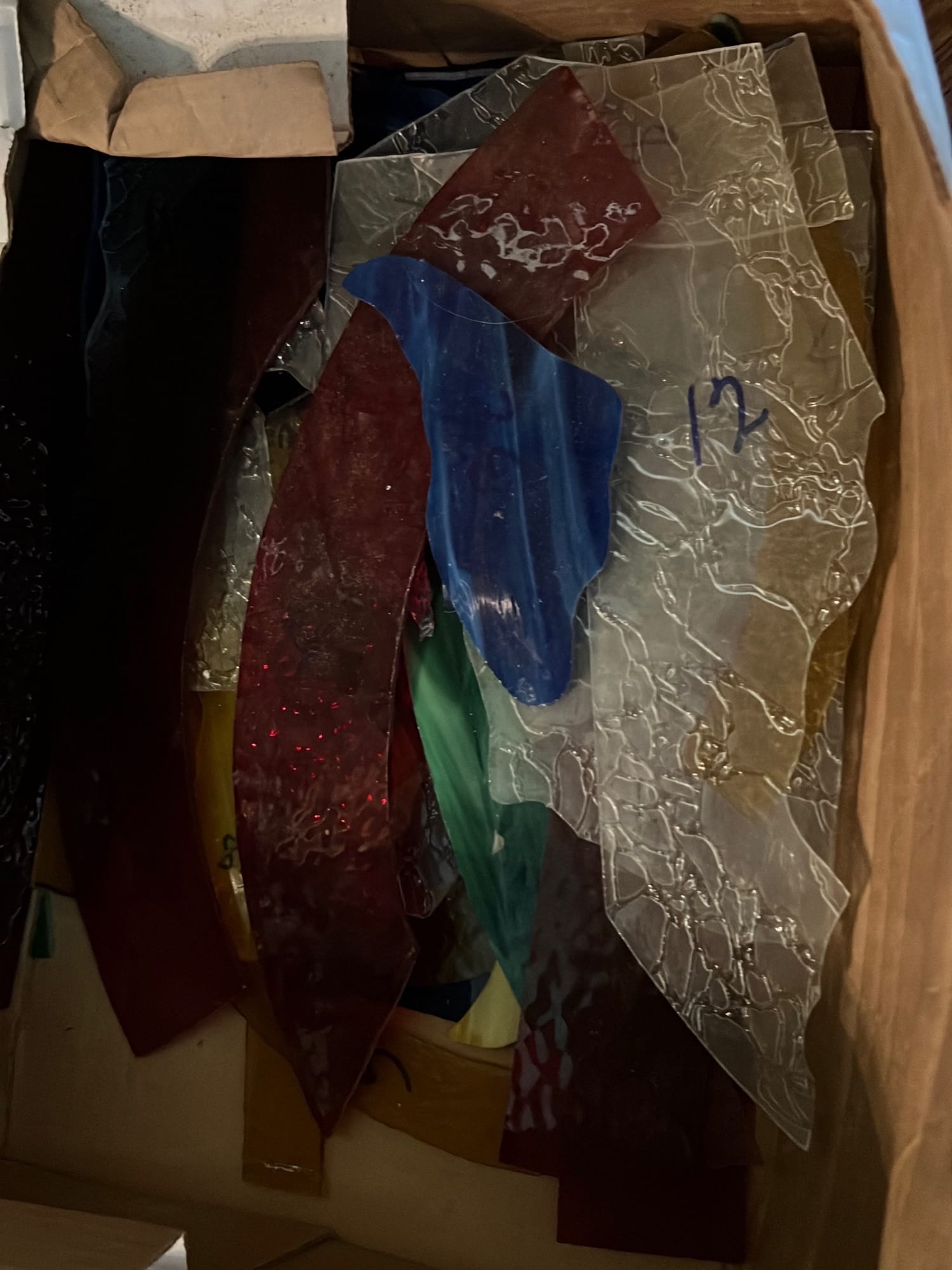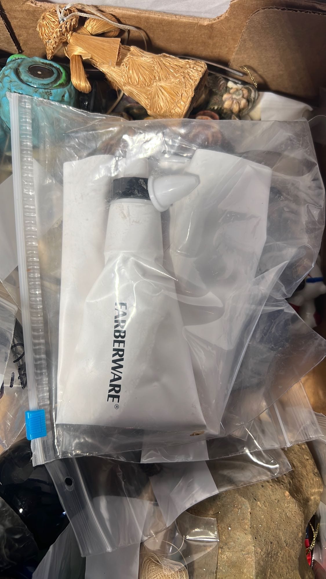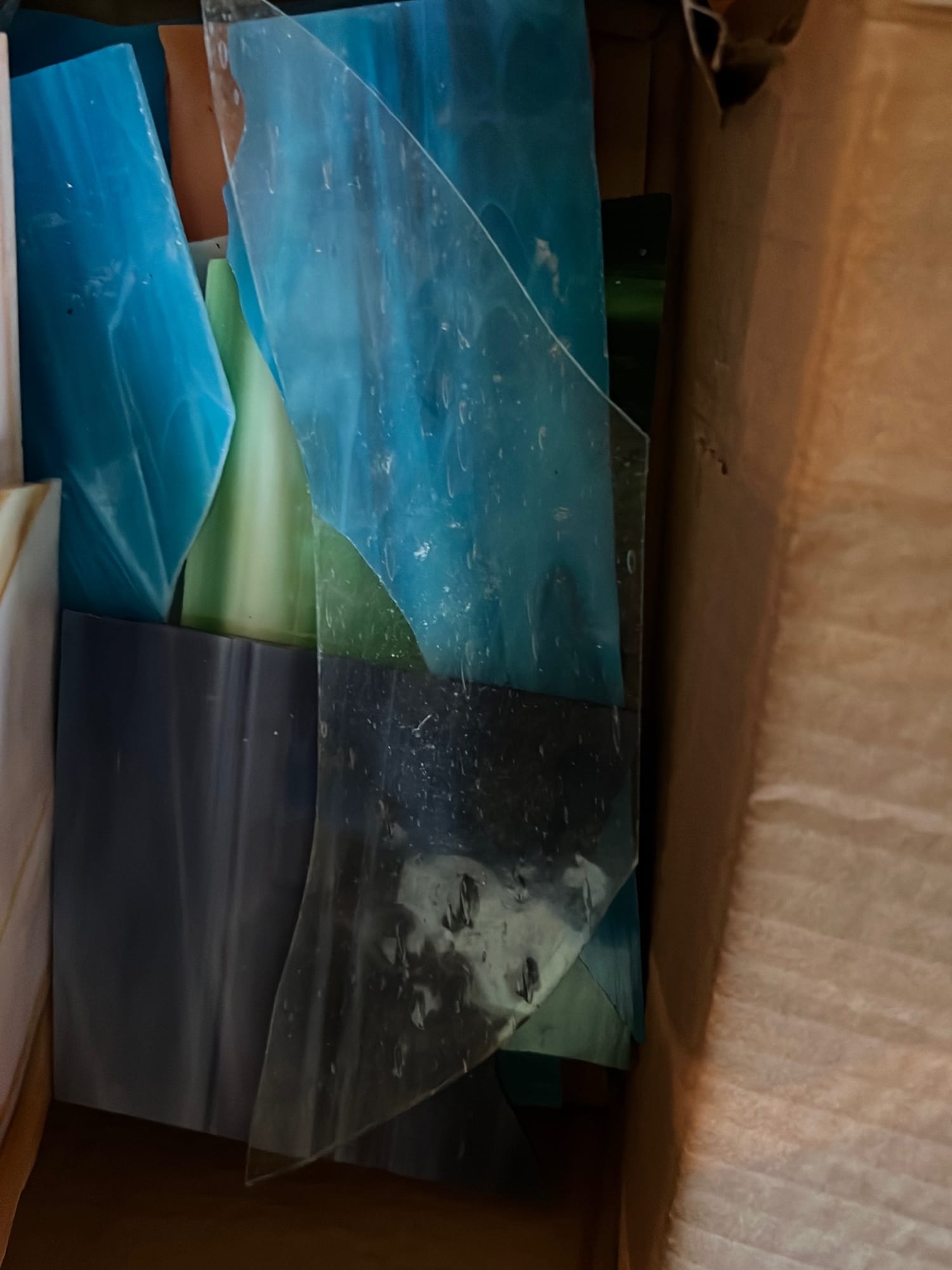 106 Gibson Blue Glass Lid 2.5” • Clear Ball No. 10 Lid 2.25” • Vintage Letter Opener • Brown Funeral Home Thermometer Advertisement 6.5” • Peacock Feathers 16”