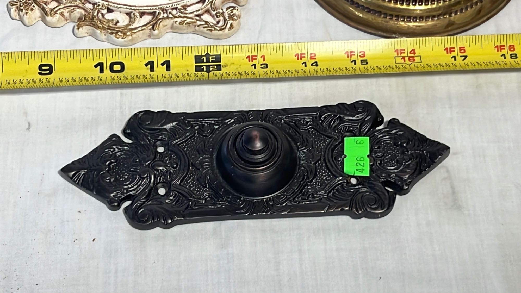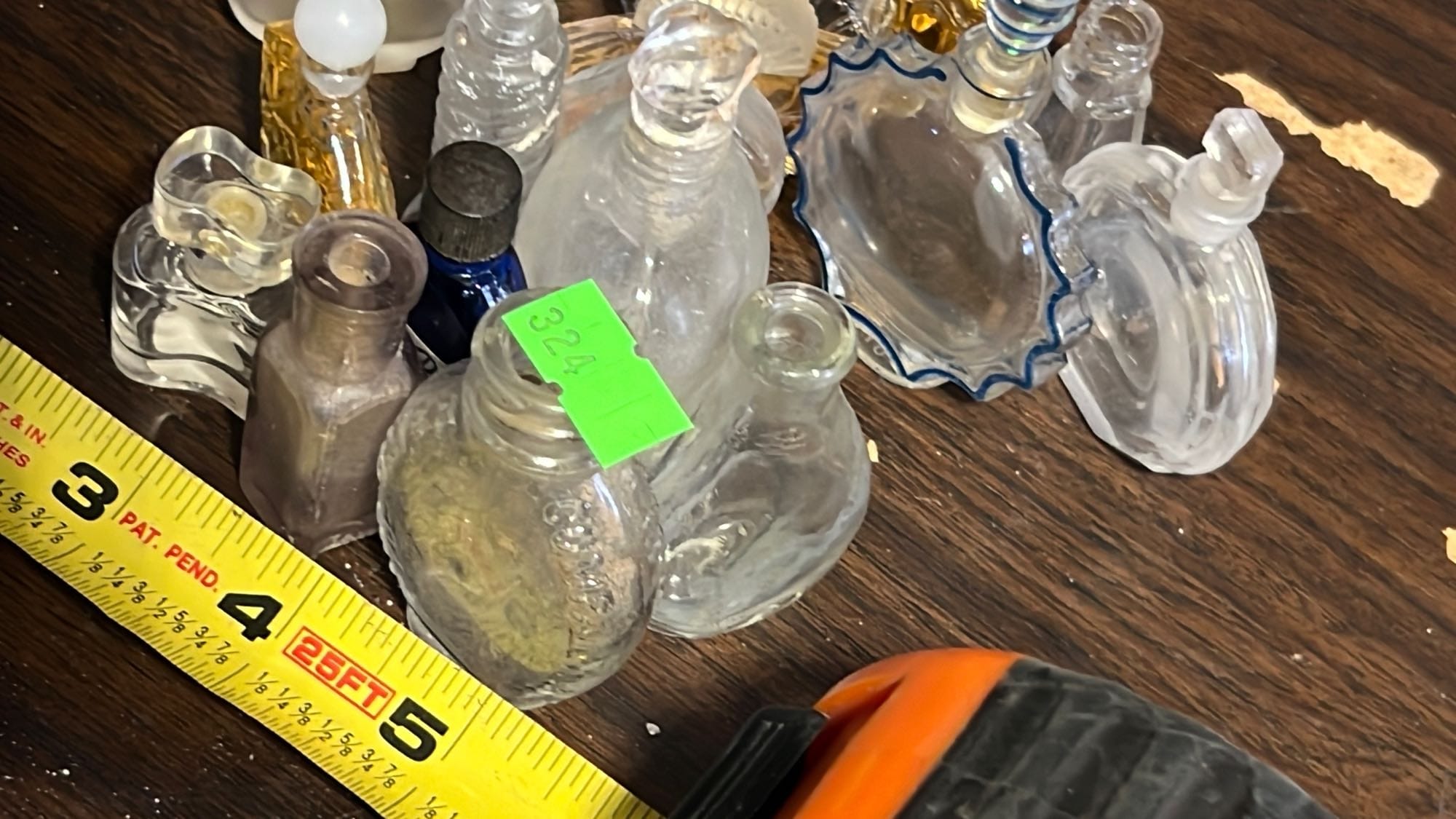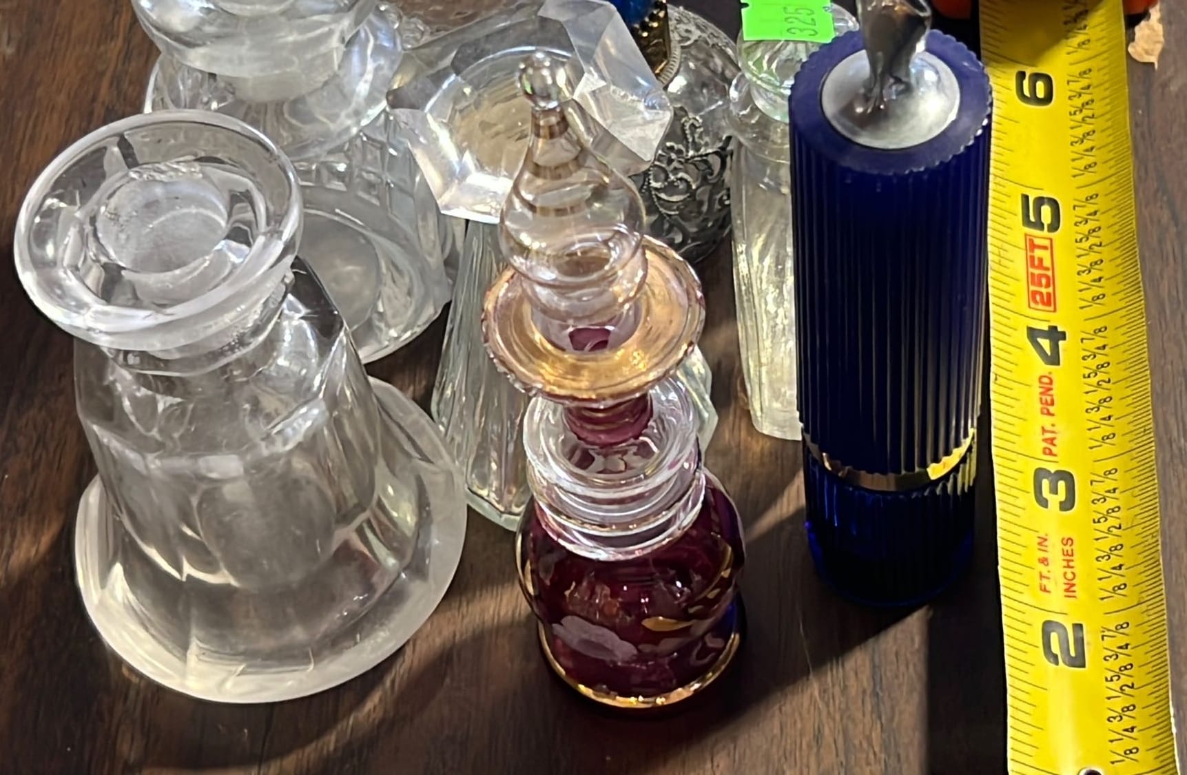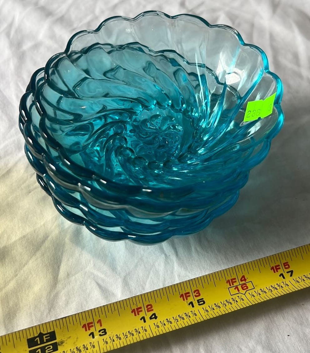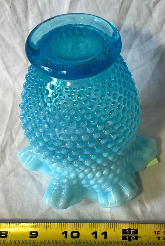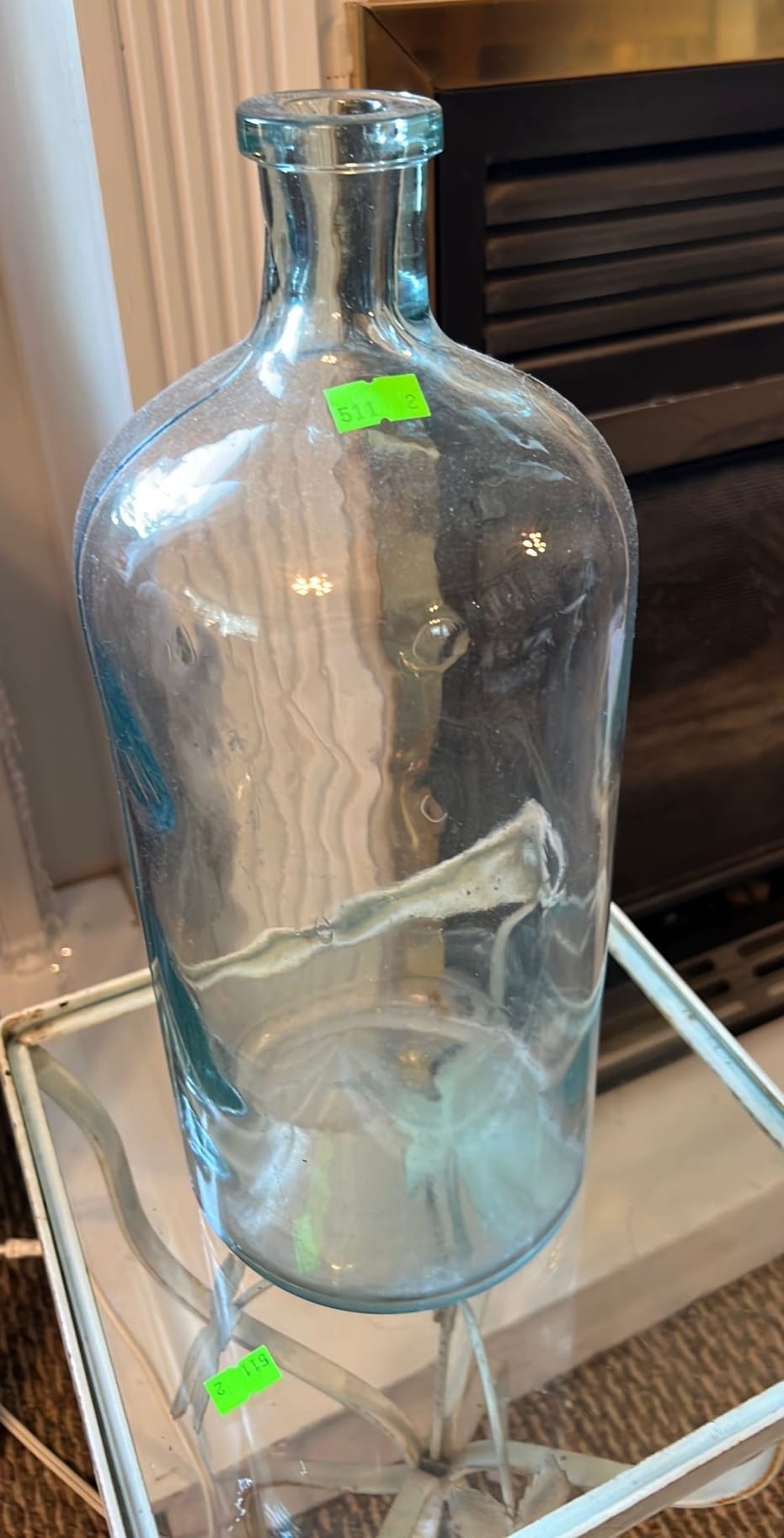 106 Gibson Blue Glass Lid 2.5” • Clear Ball No. 10 Lid 2.25” • Vintage Letter Opener • Brown Funeral Home Thermometer Advertisement 6.5” • Peacock Feathers 16”