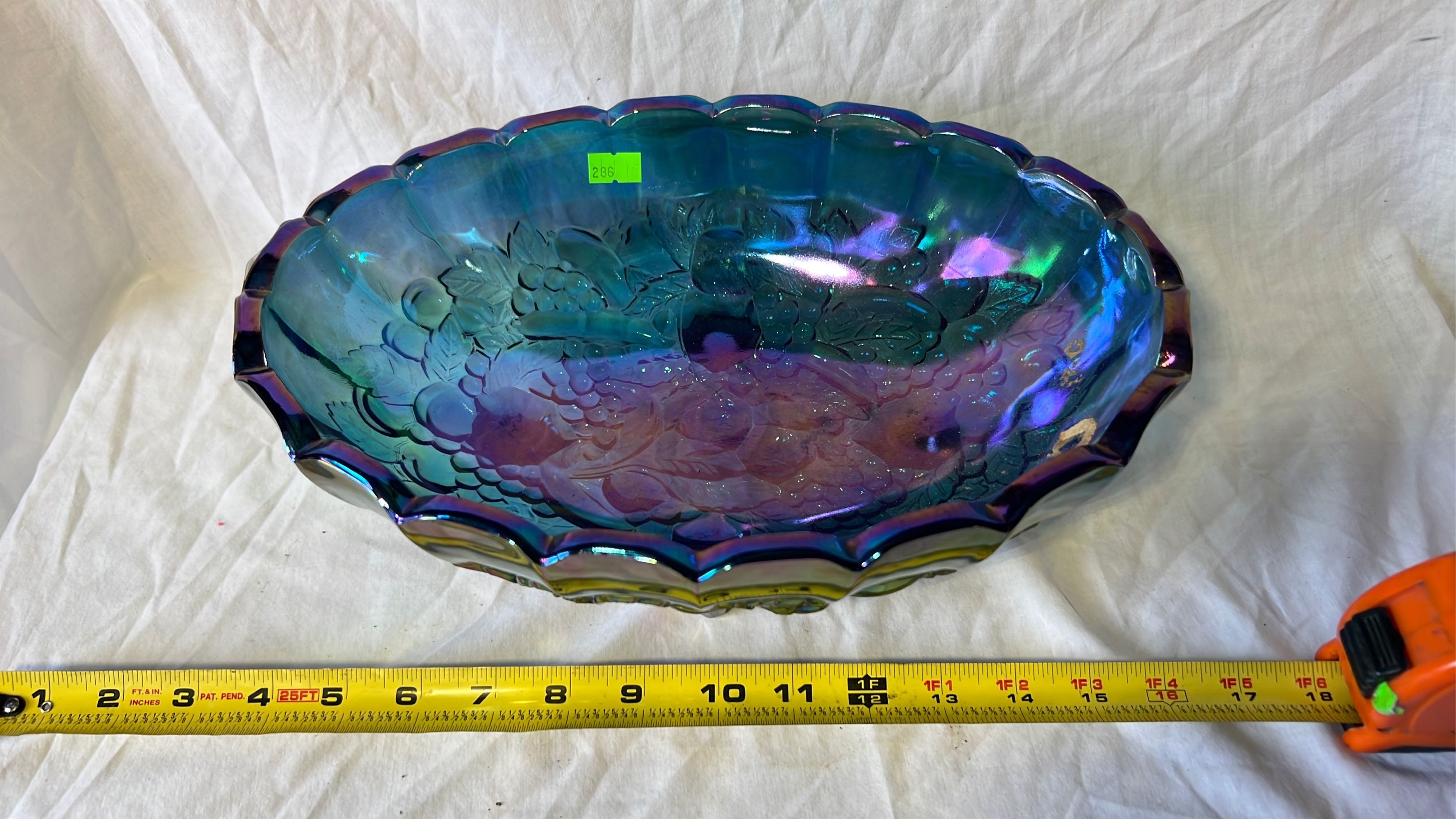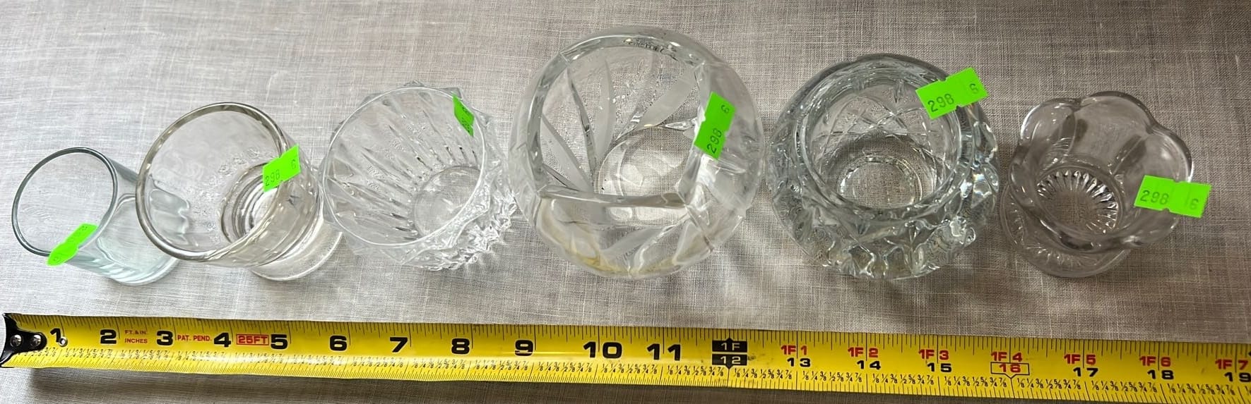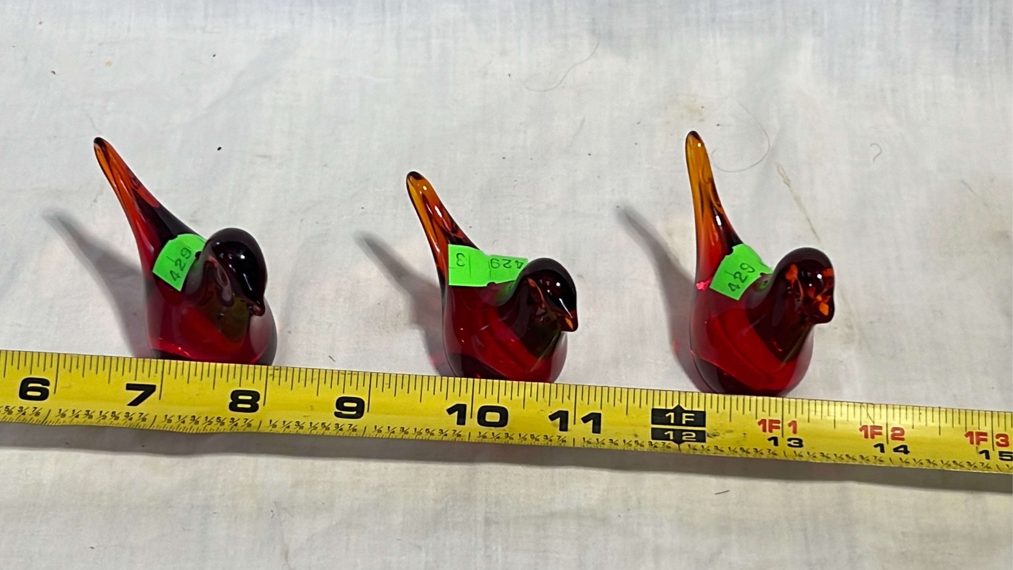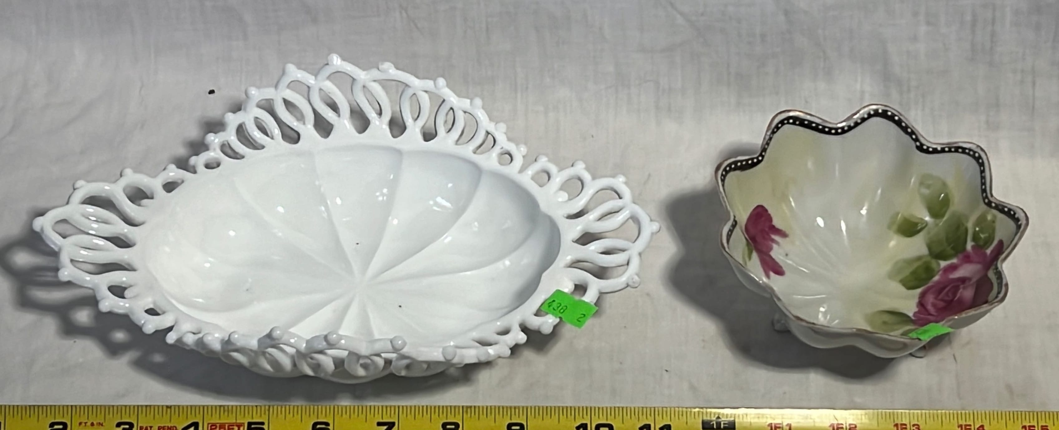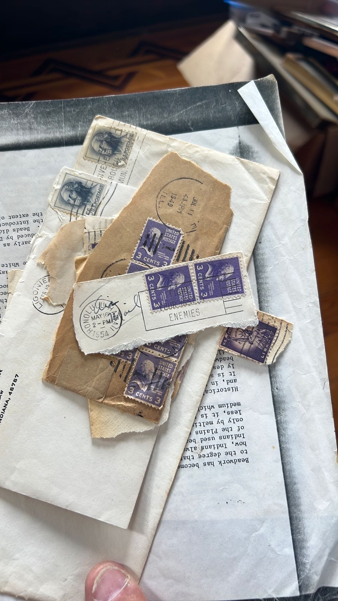 106 Gibson Blue Glass Lid 2.5” • Clear Ball No. 10 Lid 2.25” • Vintage Letter Opener • Brown Funeral Home Thermometer Advertisement 6.5” • Peacock Feathers 16”