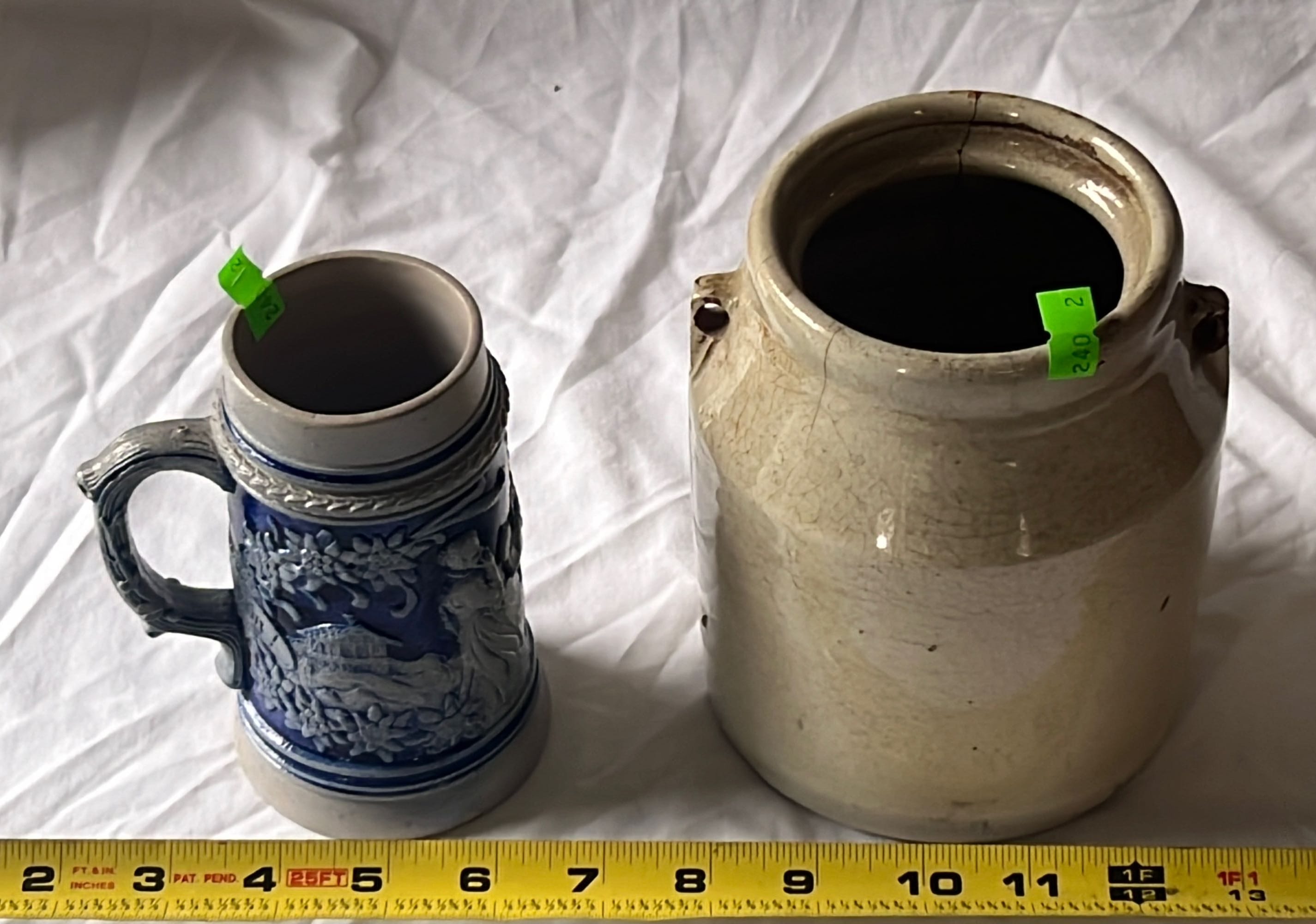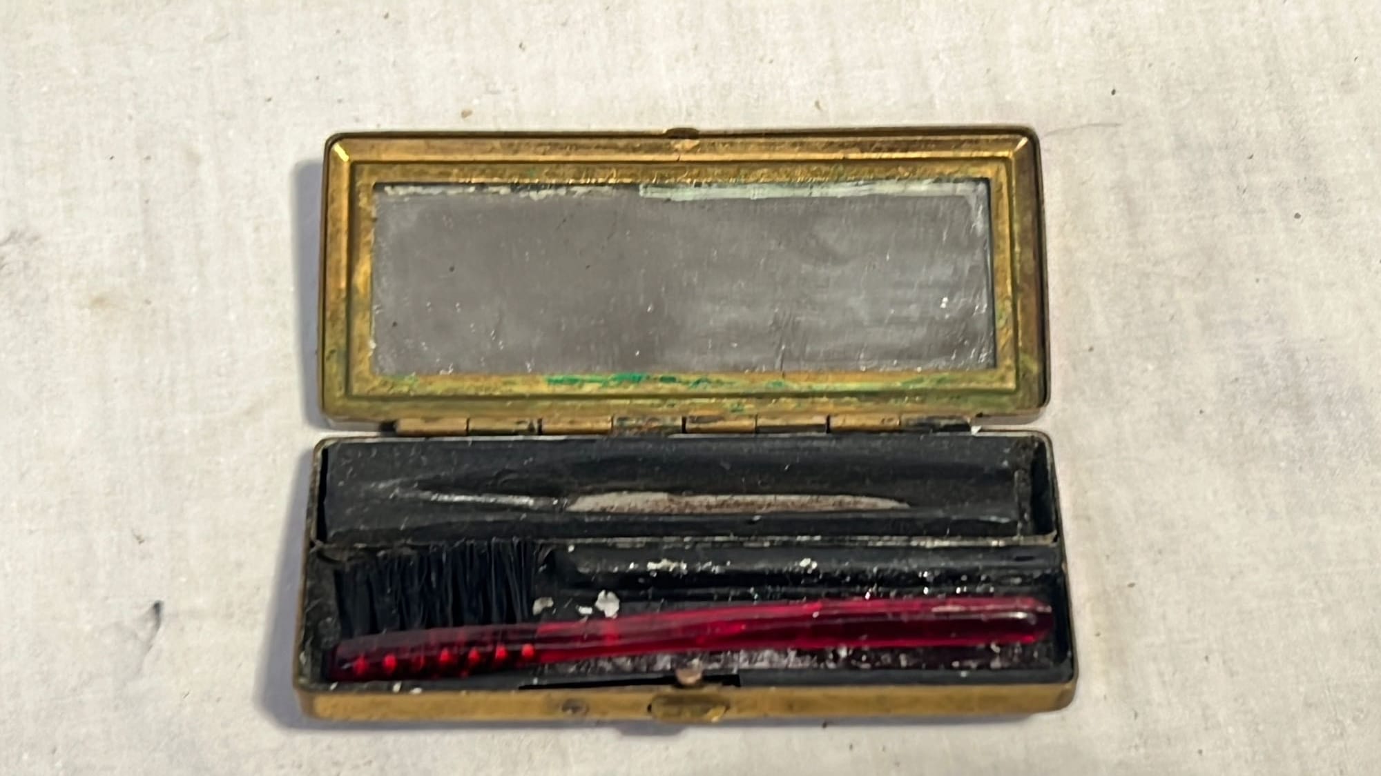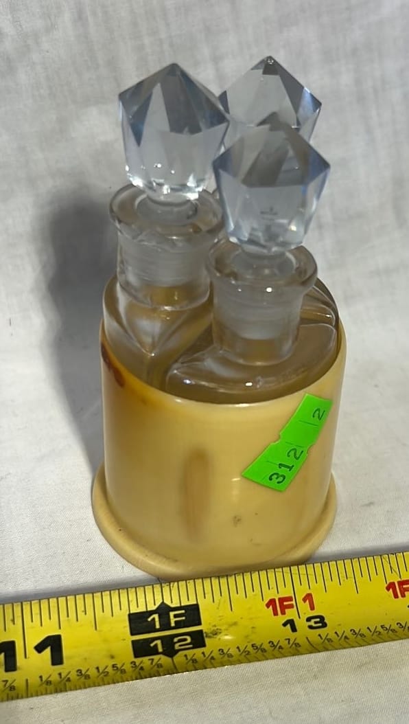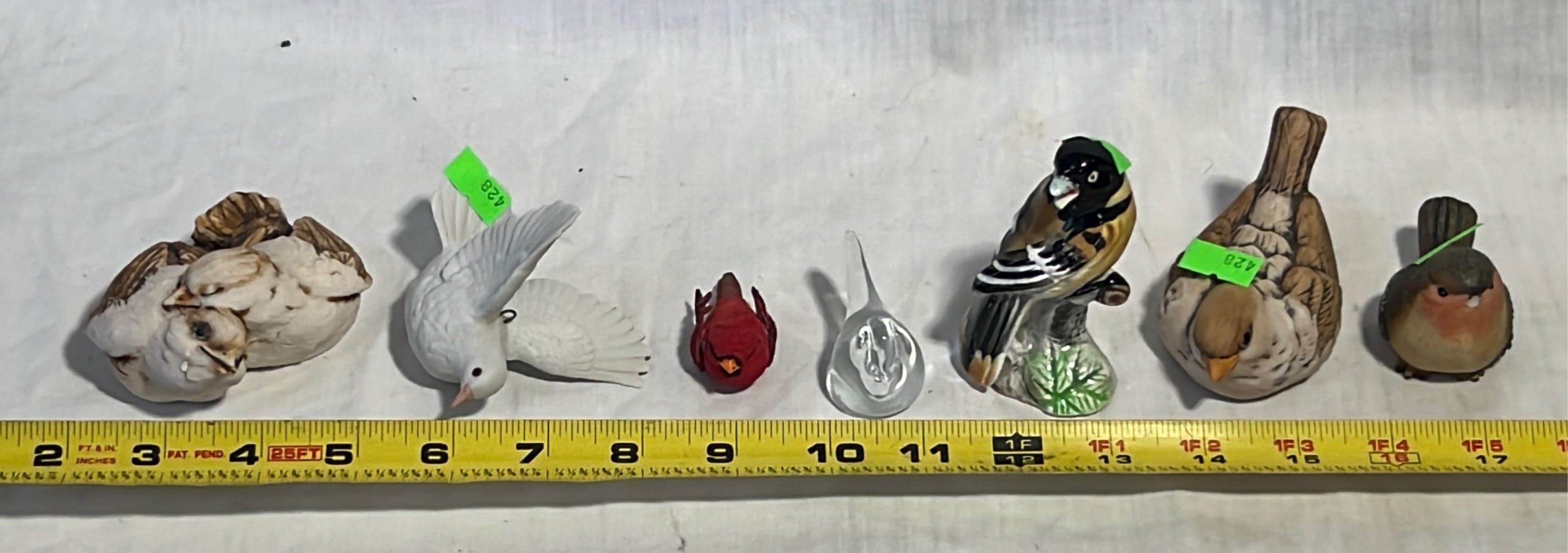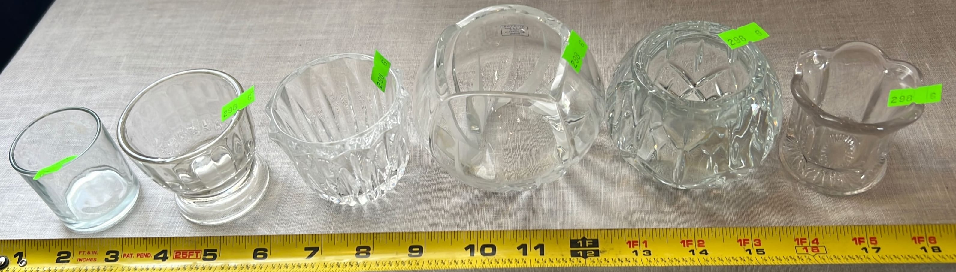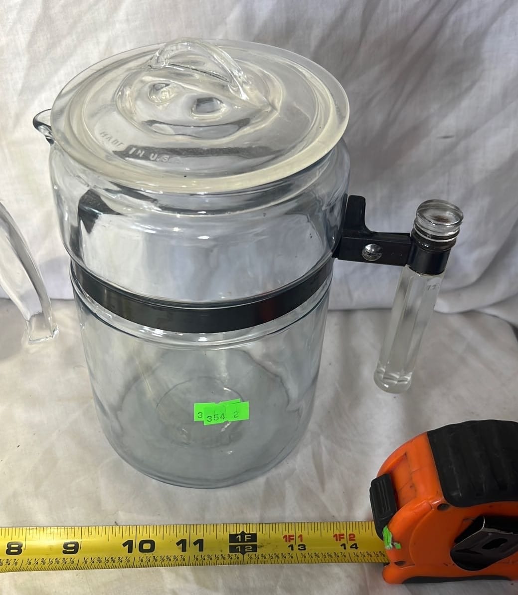 106 Gibson Blue Glass Lid 2.5” • Clear Ball No. 10 Lid 2.25” • Vintage Letter Opener • Brown Funeral Home Thermometer Advertisement 6.5” • Peacock Feathers 16”