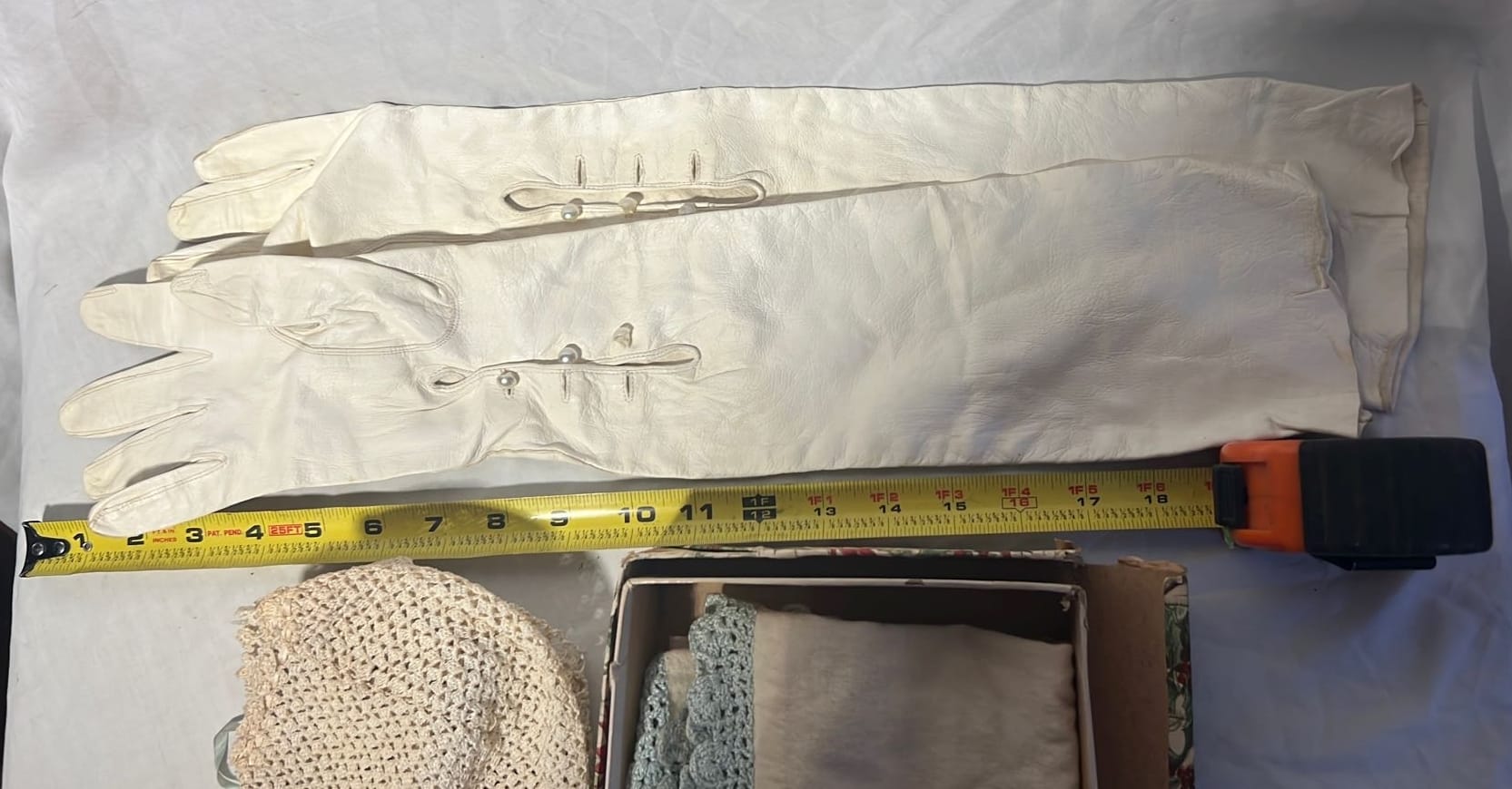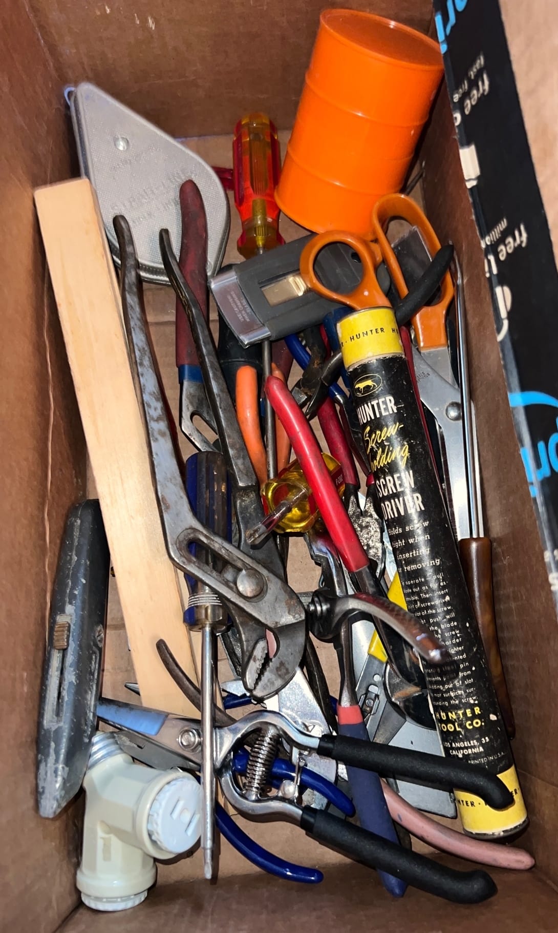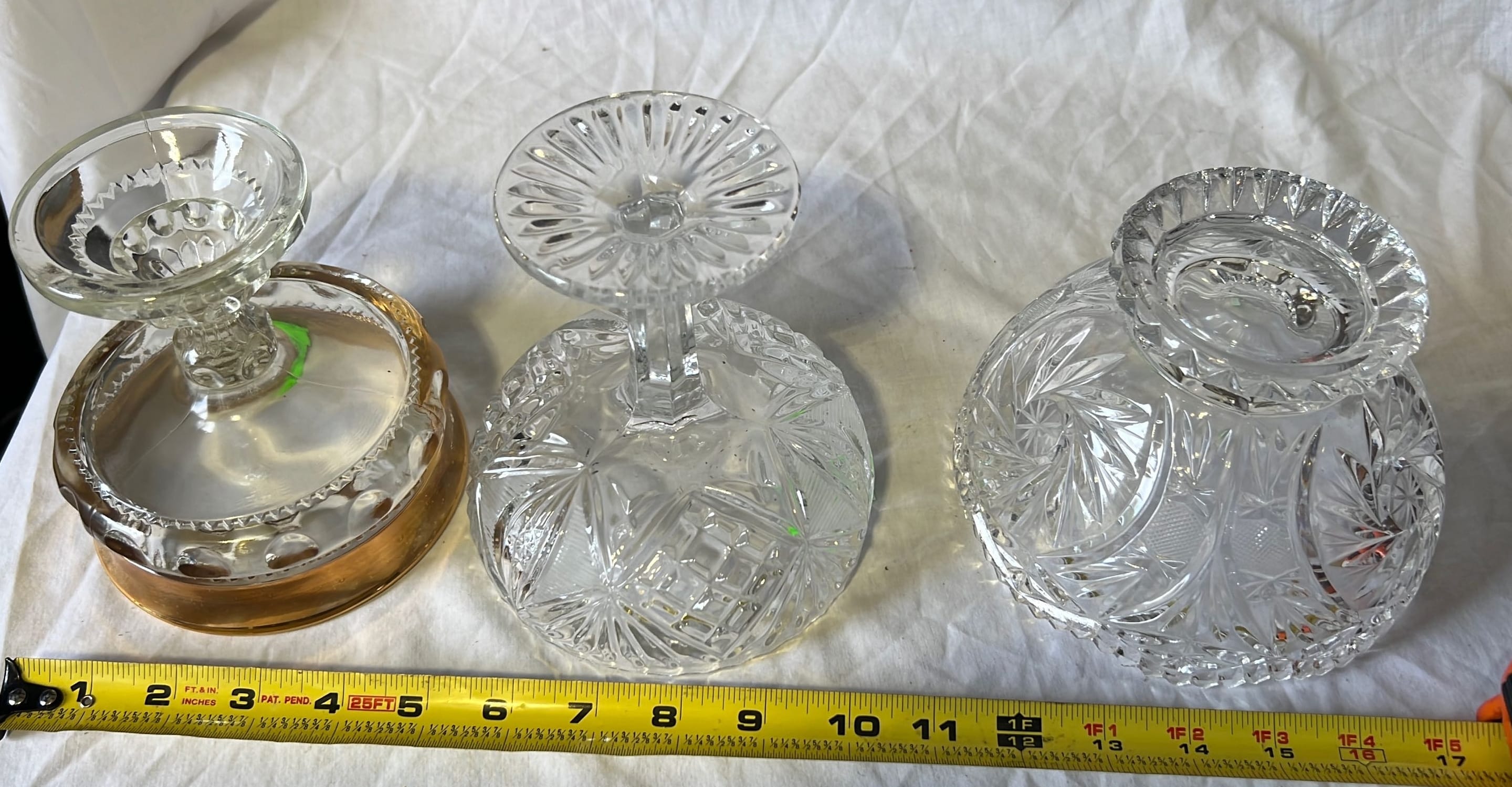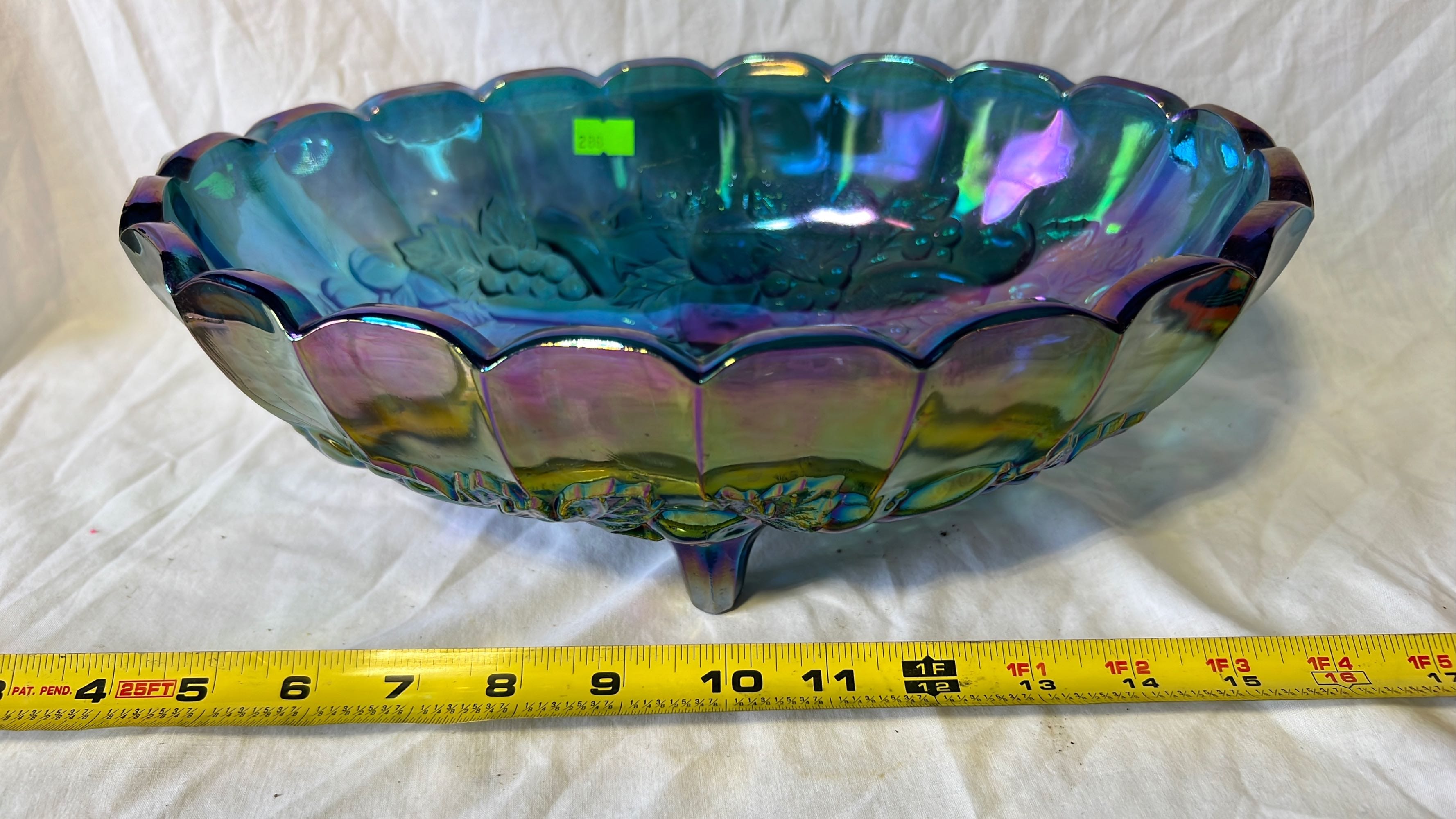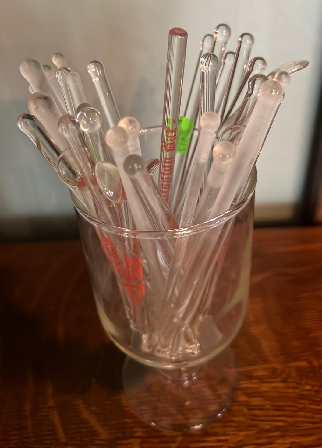 106 Gibson Blue Glass Lid 2.5” • Clear Ball No. 10 Lid 2.25” • Vintage Letter Opener • Brown Funeral Home Thermometer Advertisement 6.5” • Peacock Feathers 16”