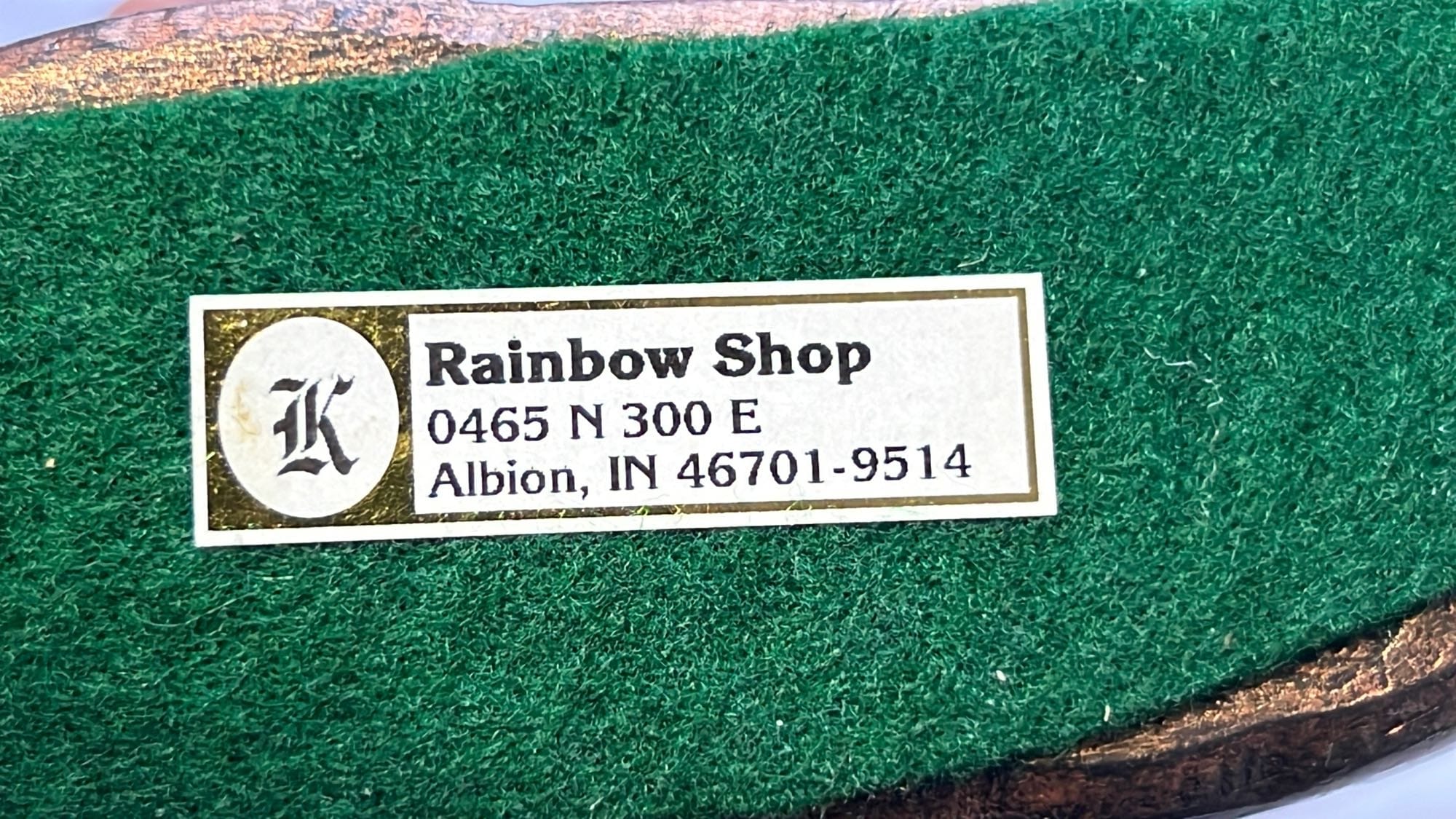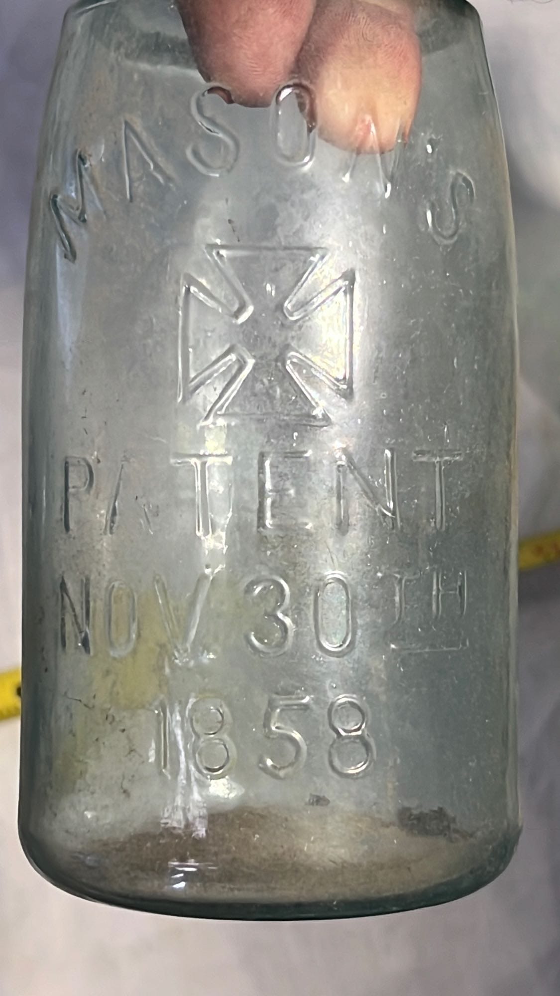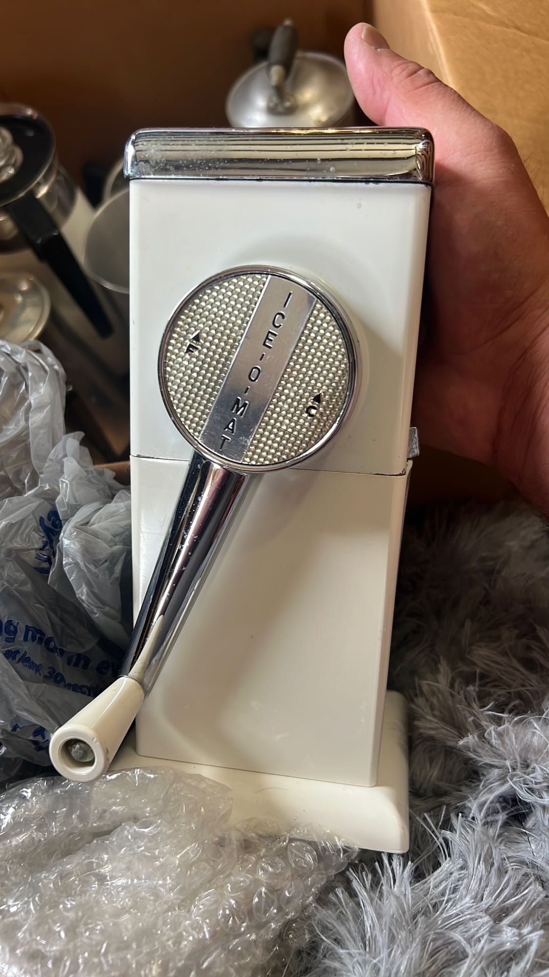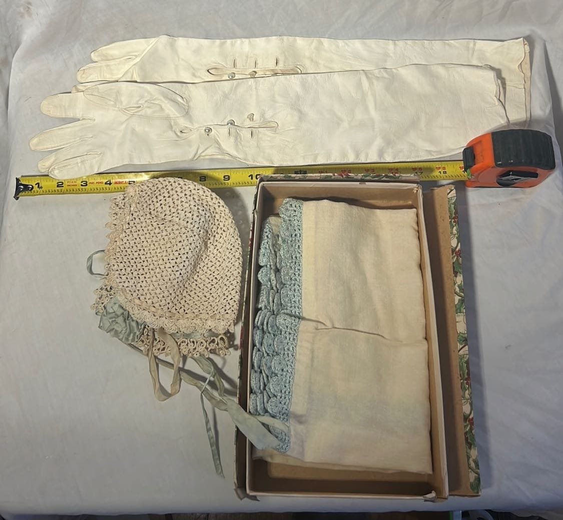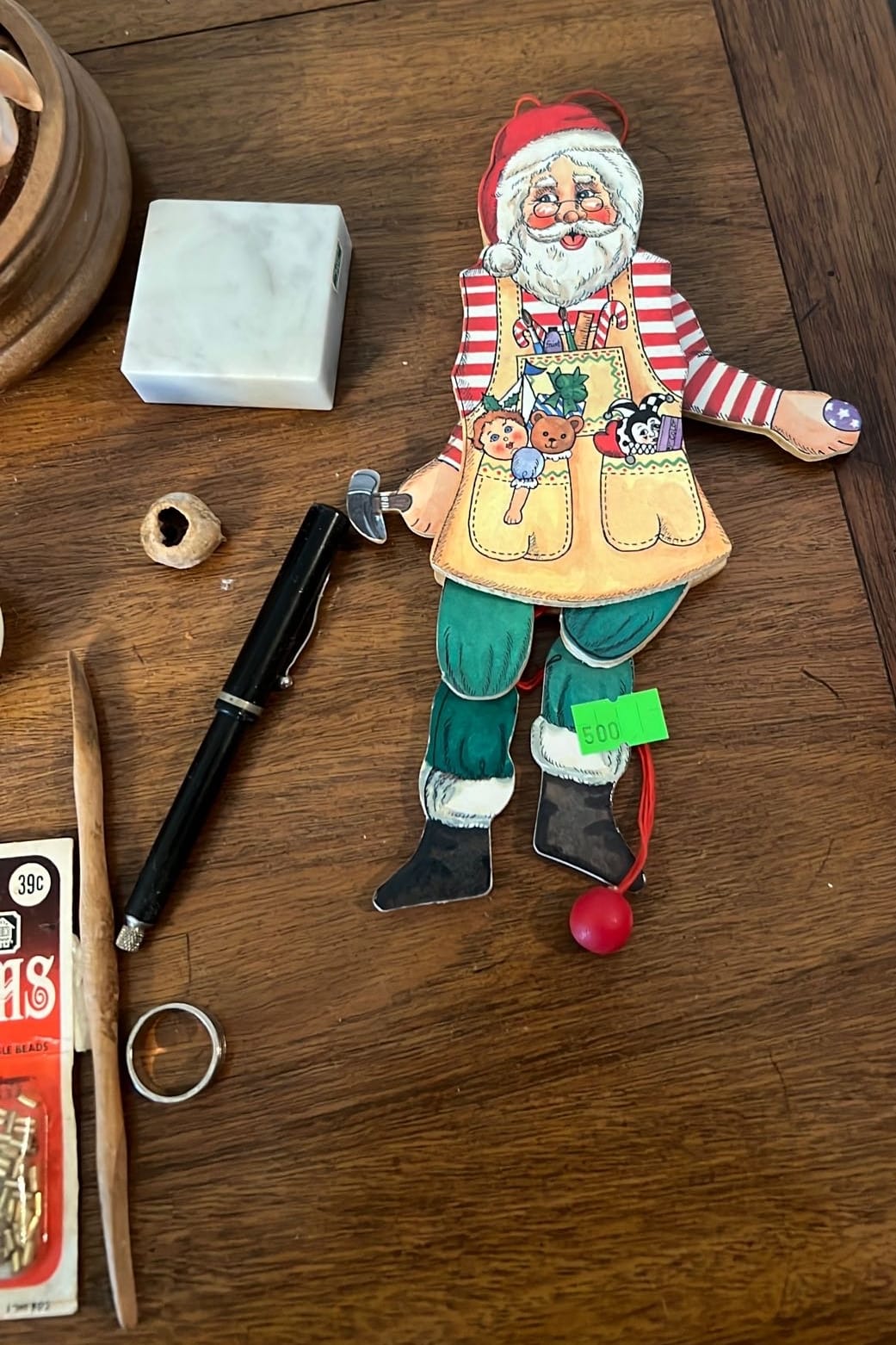 106 Gibson Blue Glass Lid 2.5” • Clear Ball No. 10 Lid 2.25” • Vintage Letter Opener • Brown Funeral Home Thermometer Advertisement 6.5” • Peacock Feathers 16”