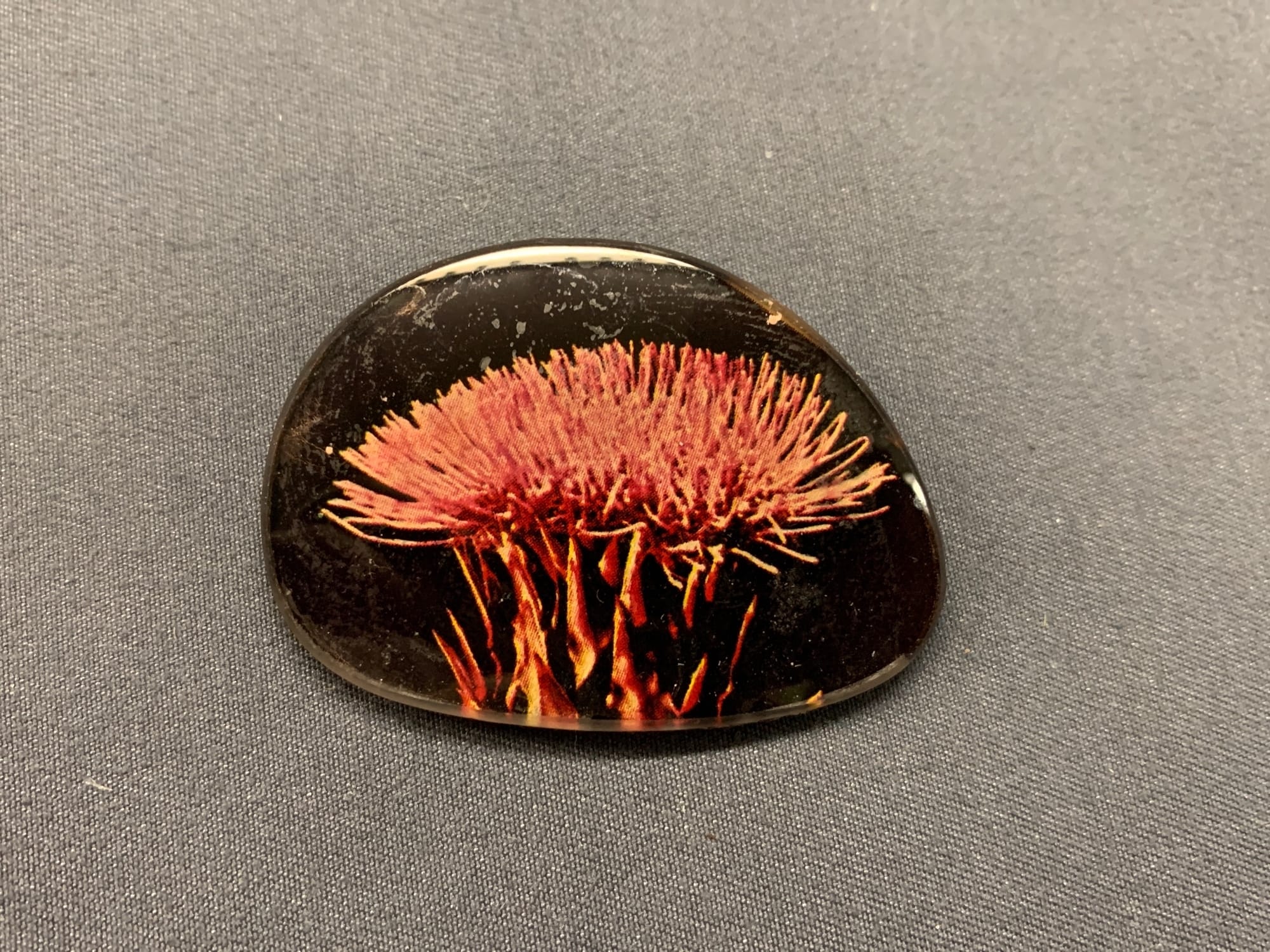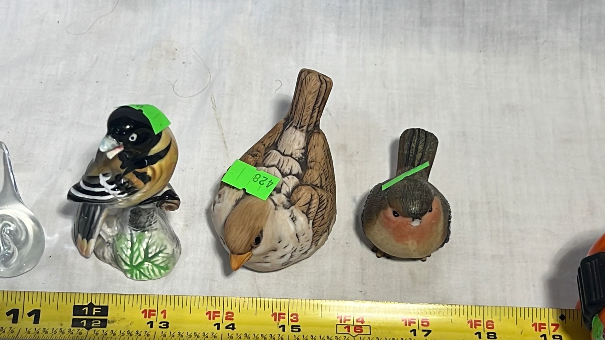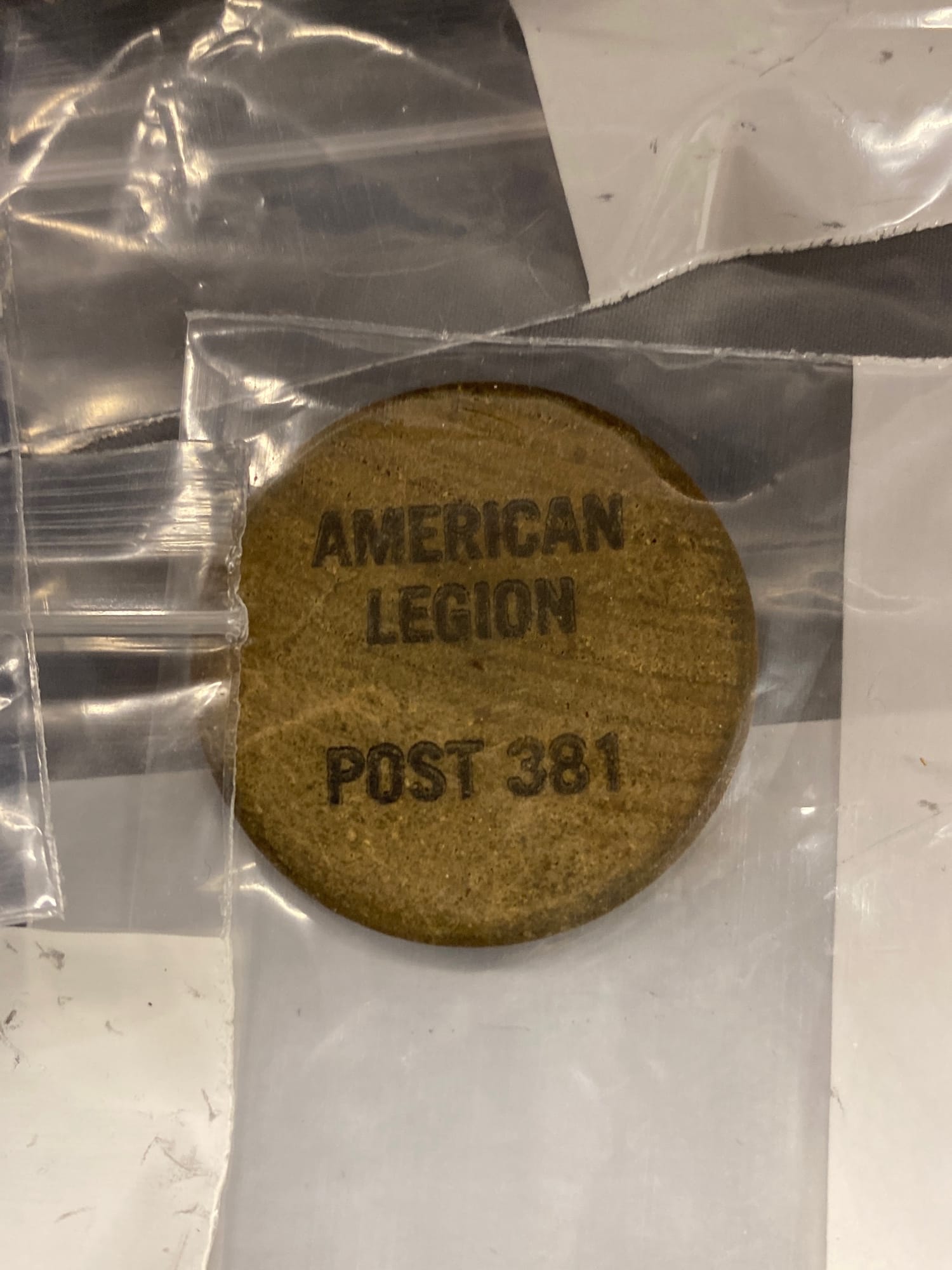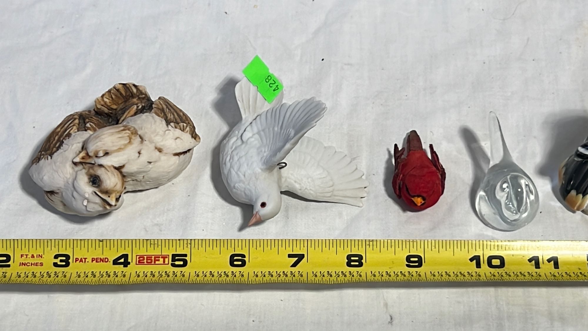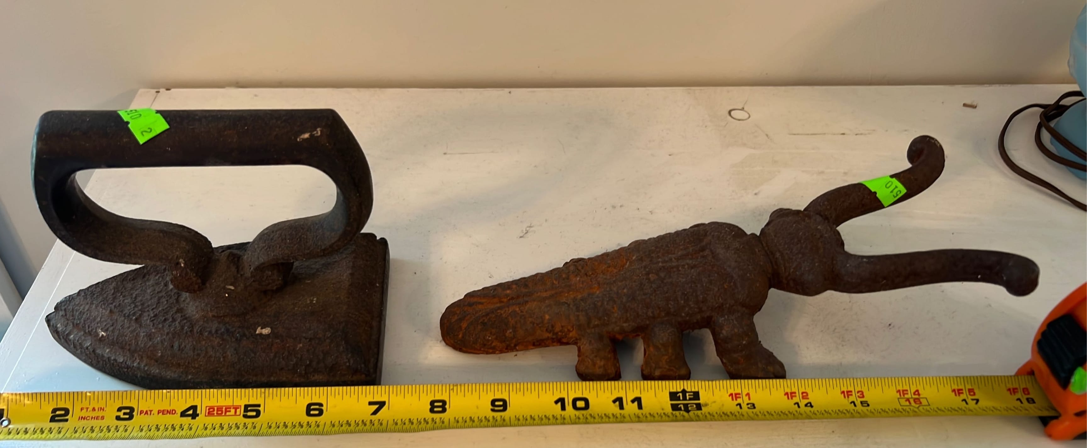 106 Gibson Blue Glass Lid 2.5” • Clear Ball No. 10 Lid 2.25” • Vintage Letter Opener • Brown Funeral Home Thermometer Advertisement 6.5” • Peacock Feathers 16”