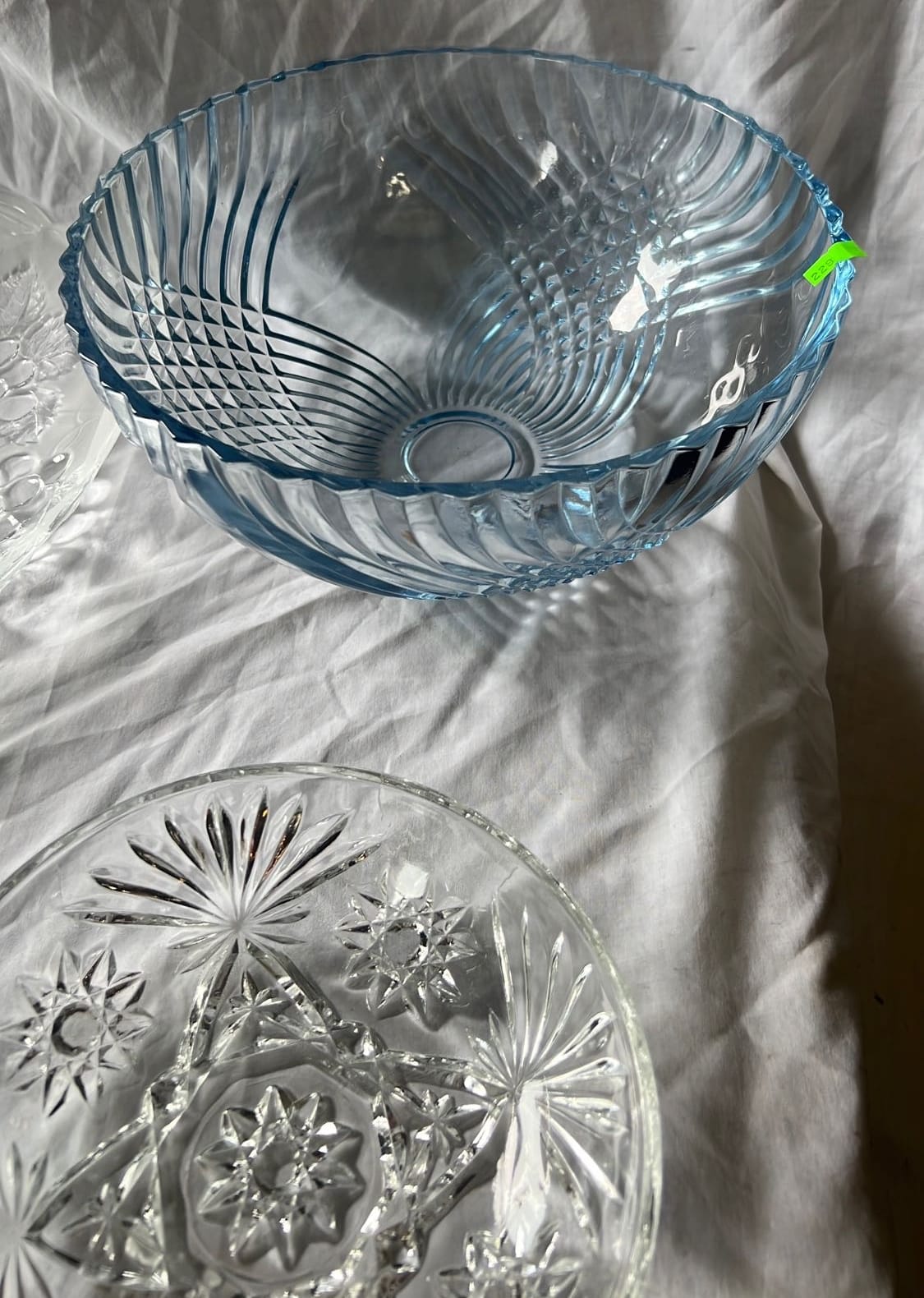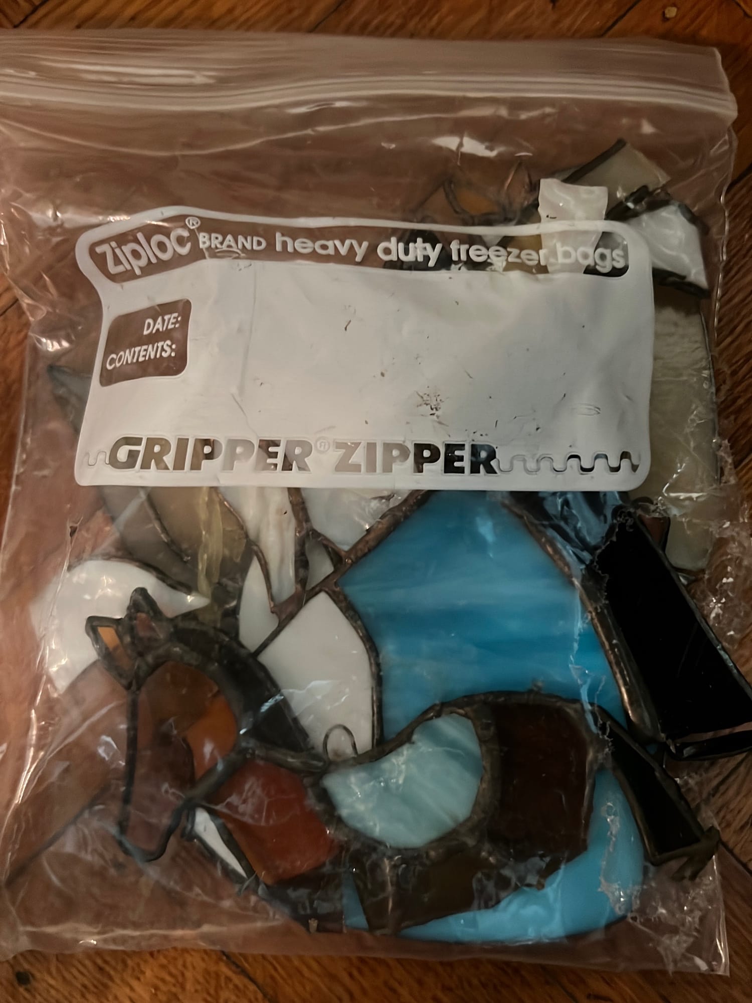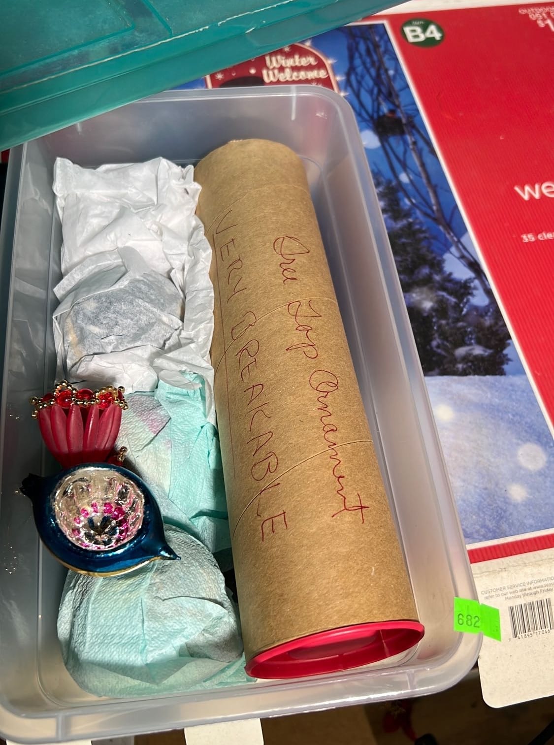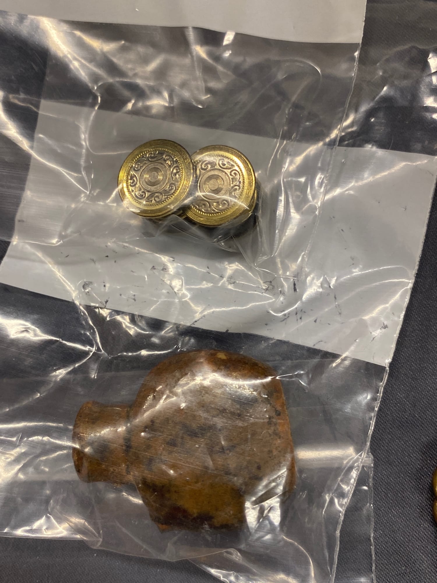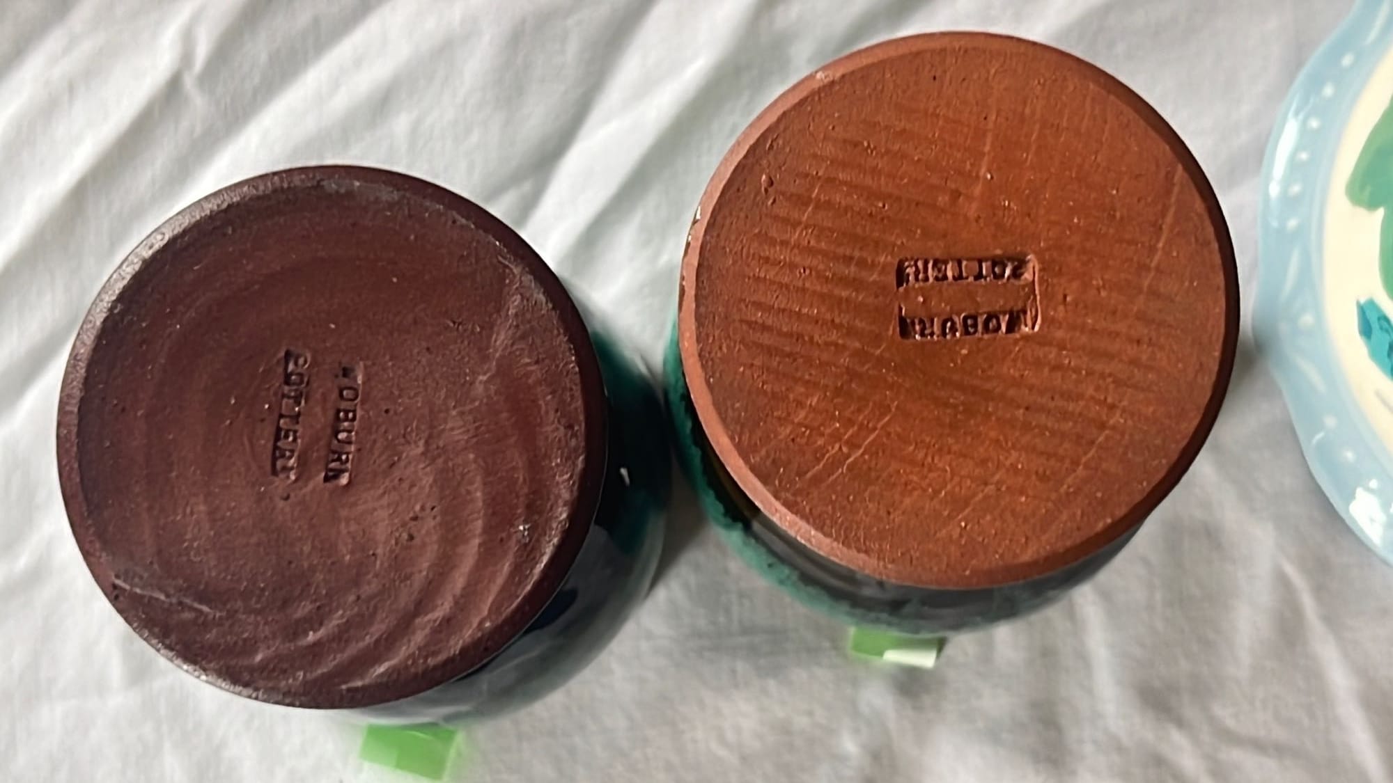 106 Gibson Blue Glass Lid 2.5” • Clear Ball No. 10 Lid 2.25” • Vintage Letter Opener • Brown Funeral Home Thermometer Advertisement 6.5” • Peacock Feathers 16”