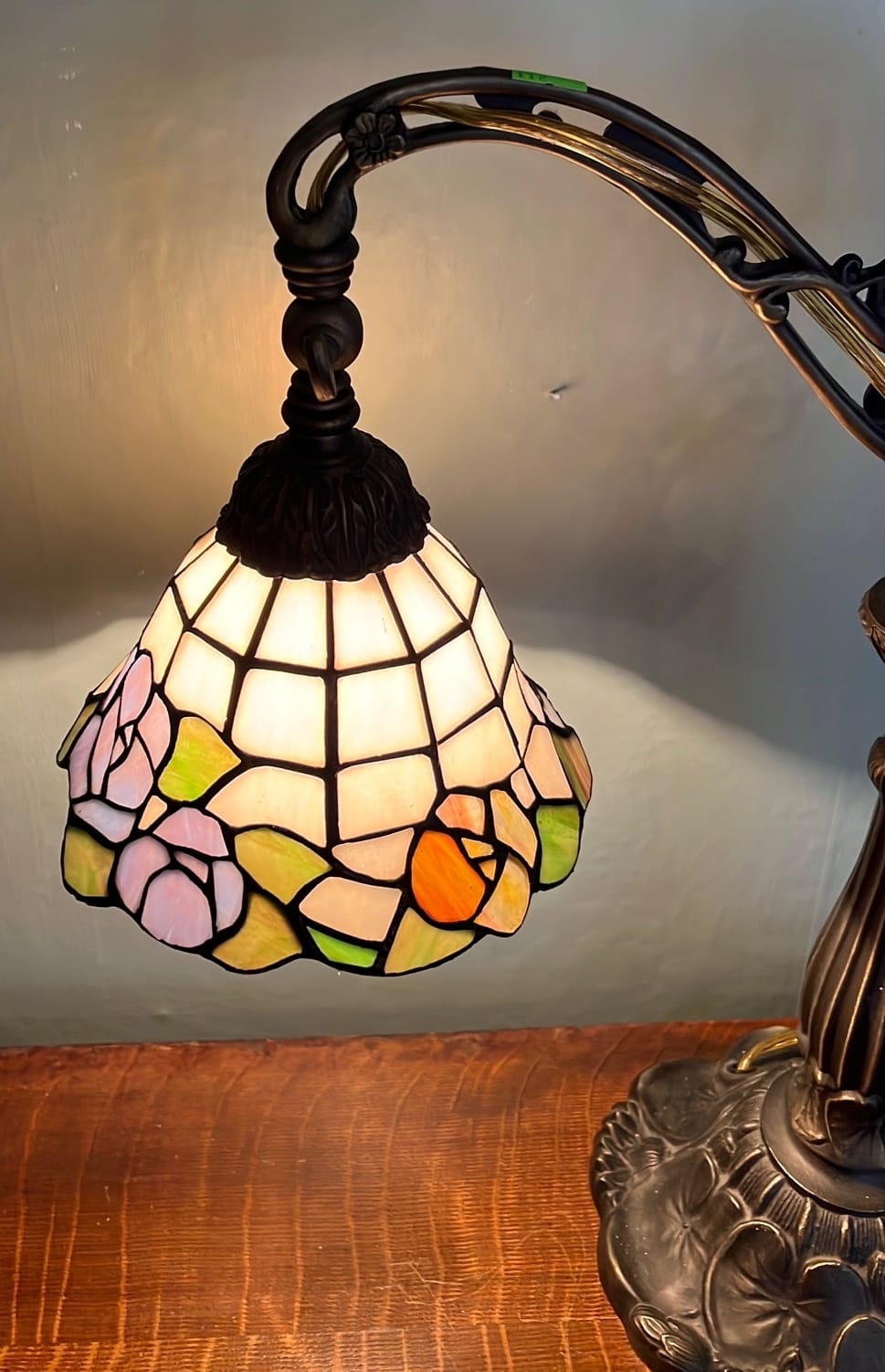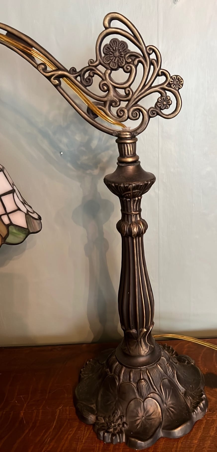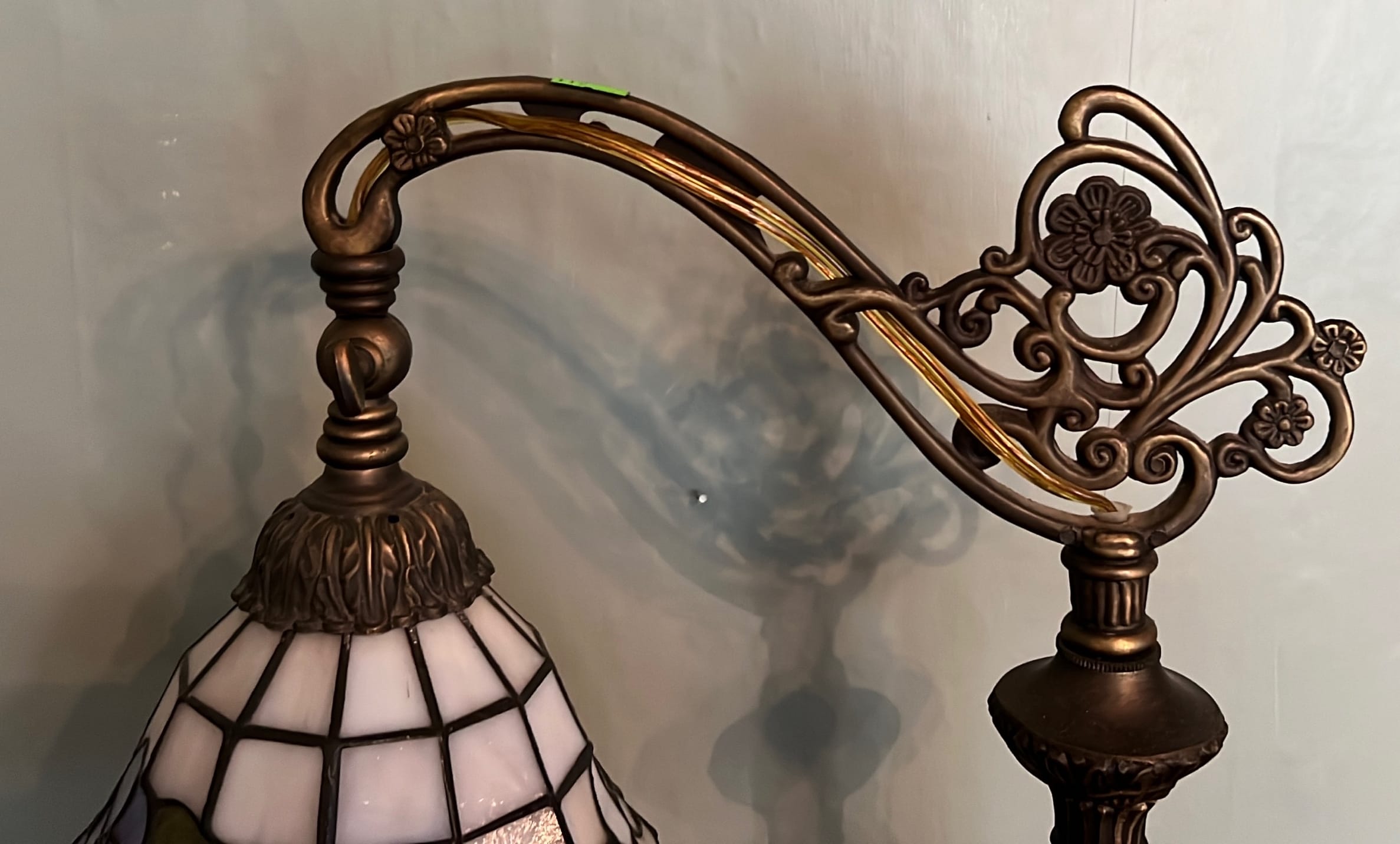 112 Vtg Floral Tiffany Style Ting Shen Gooseneck Table, Desk Lamp. 22 in Tall