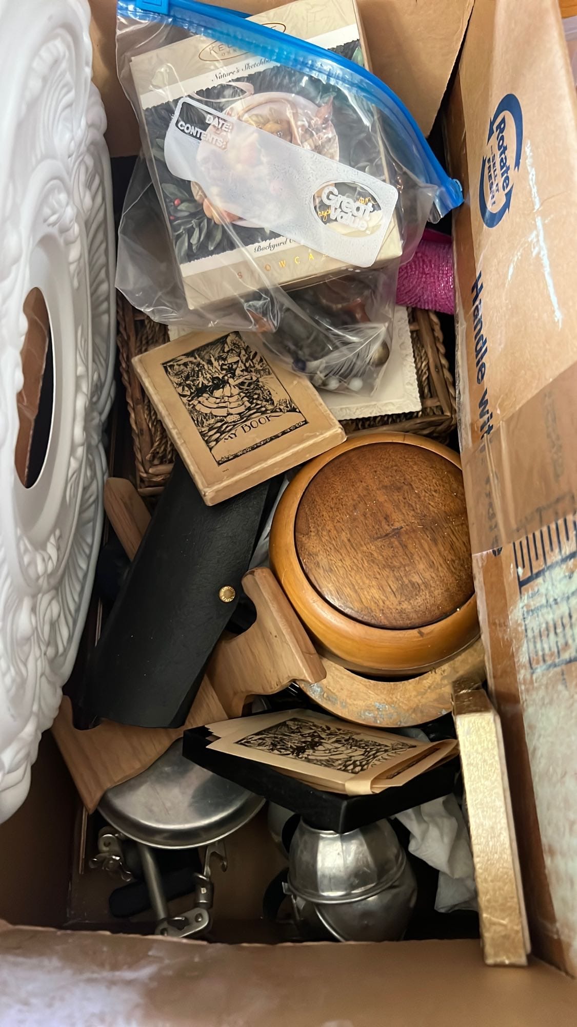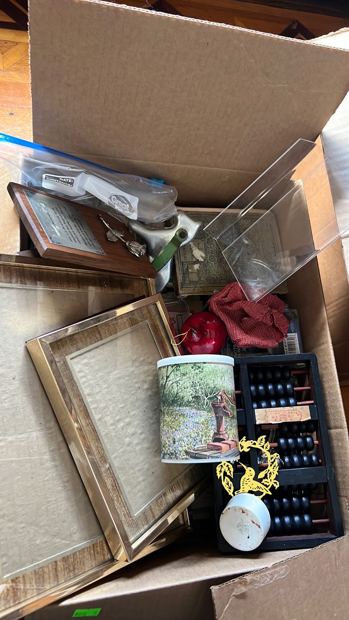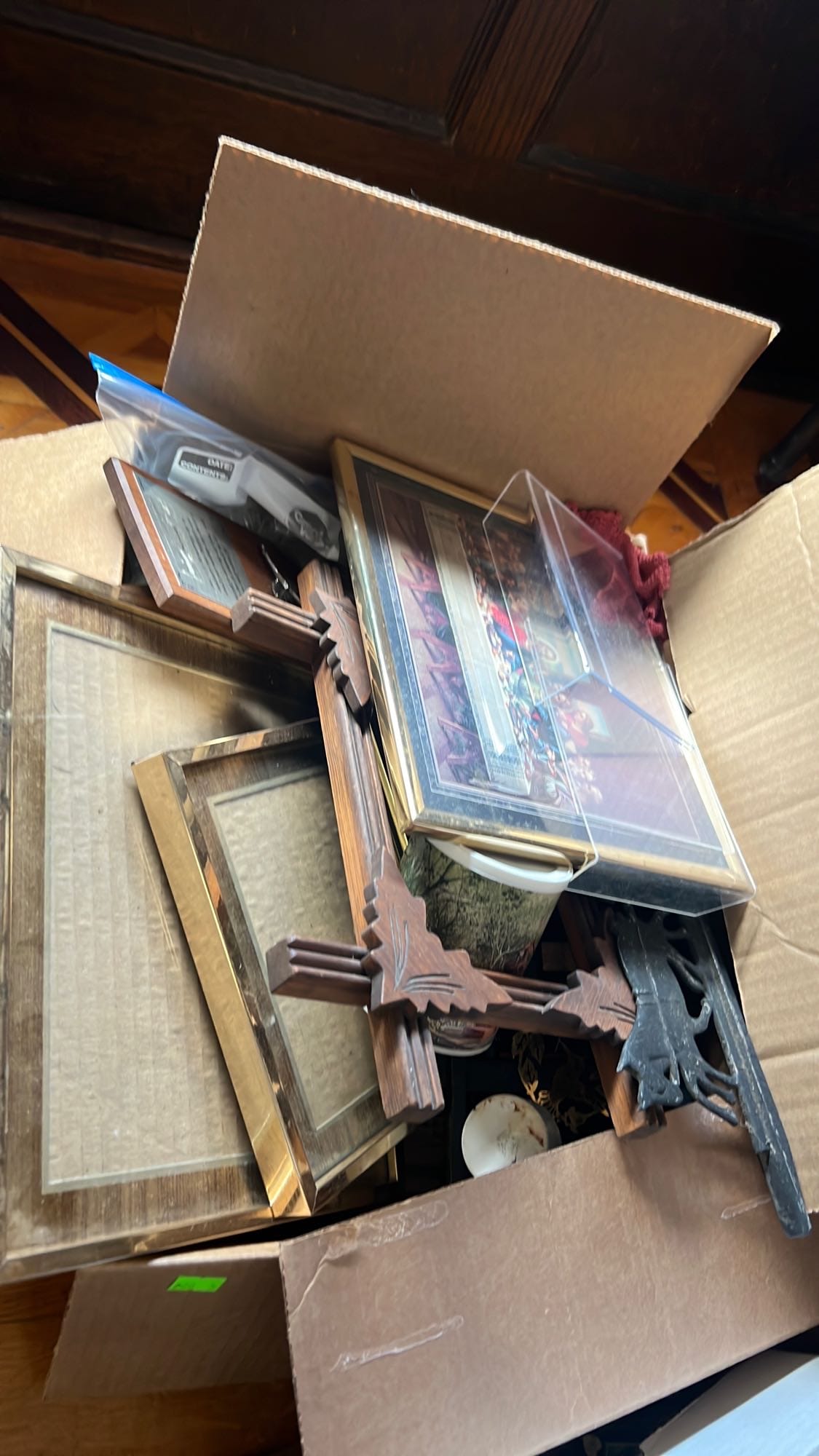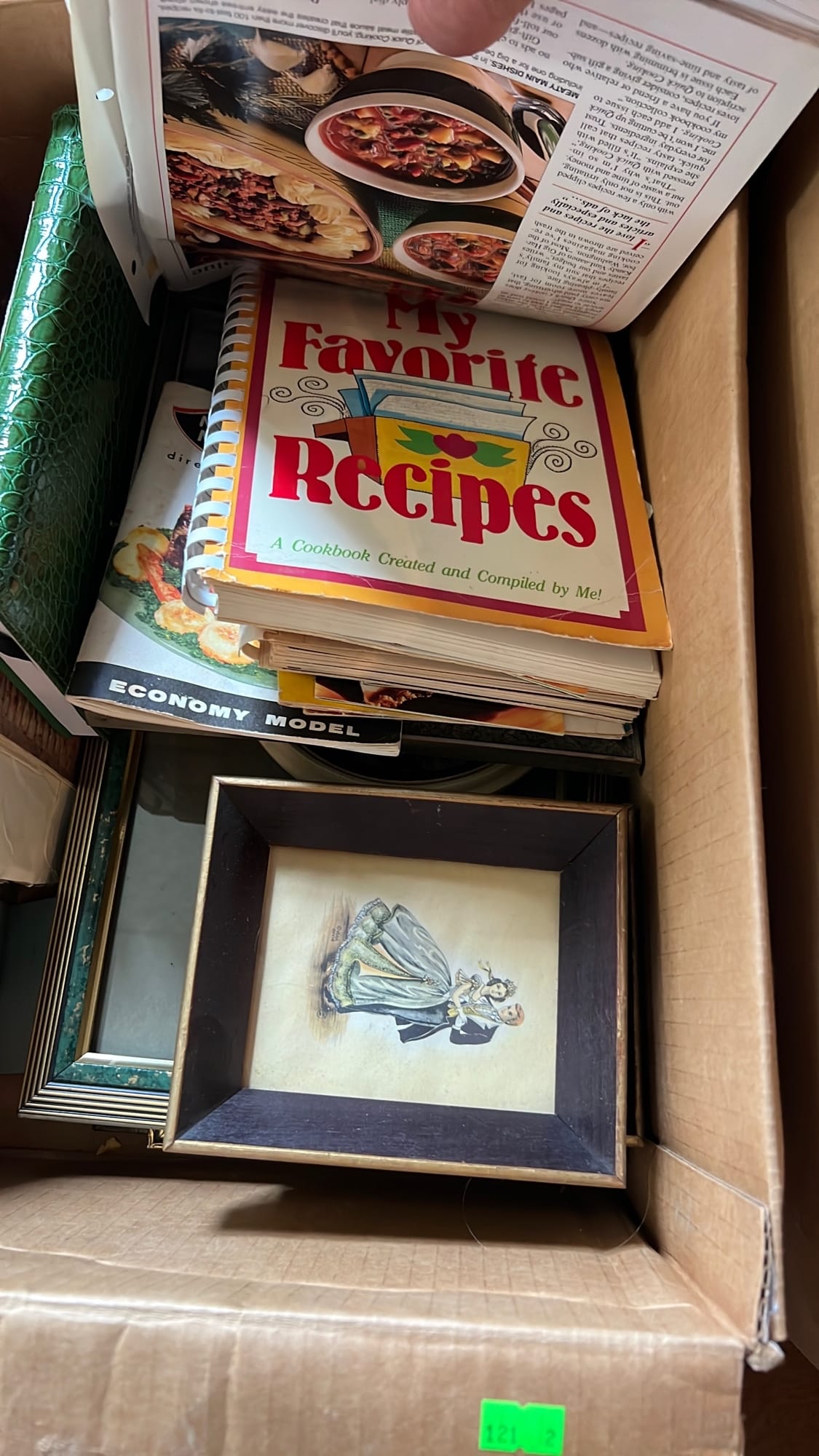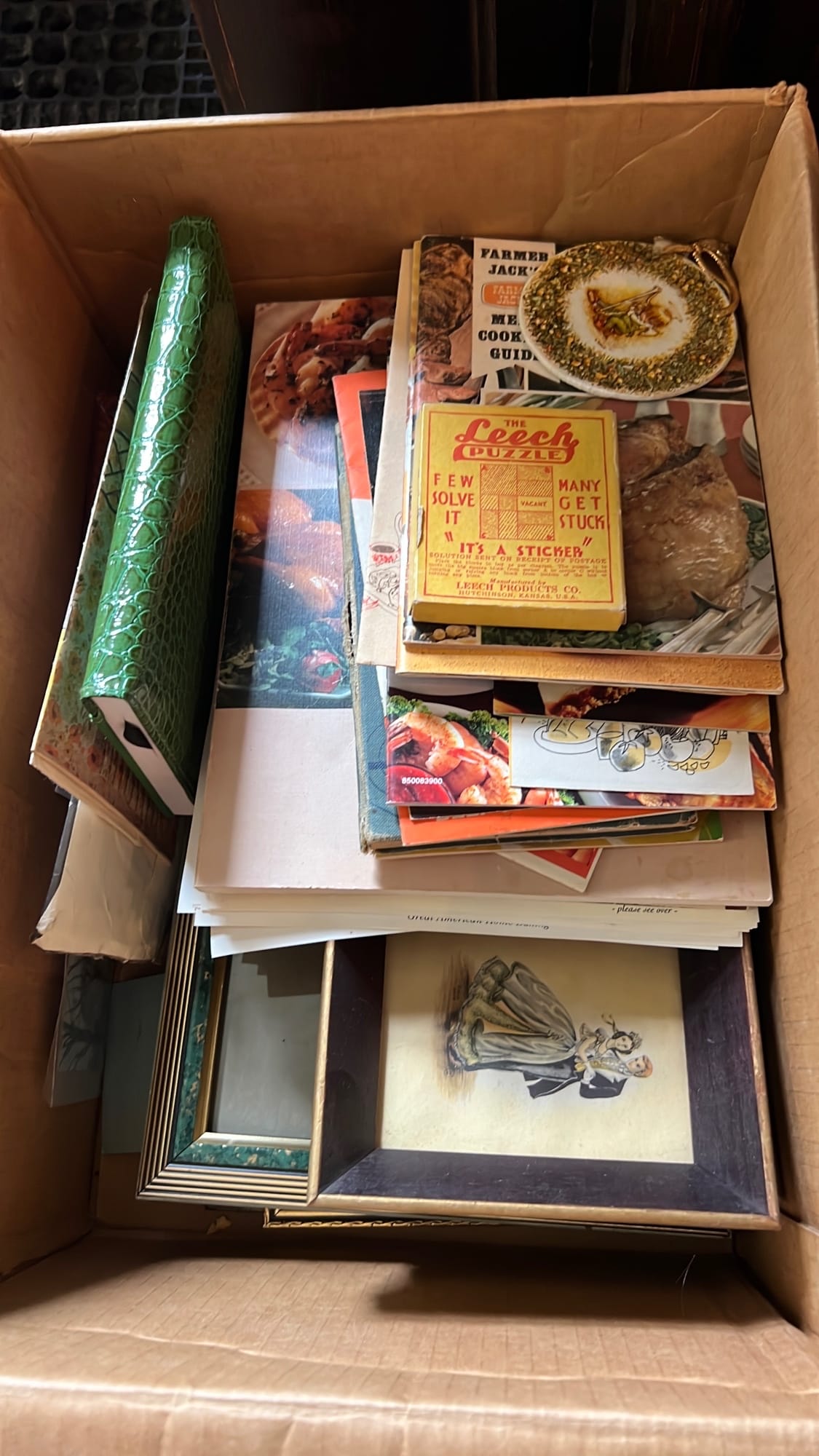 121 Picture & Frames Various sizes • Recipe assortment • The Leech Puzzle in box • Vintage Post Card • Brass Bird Dish 6.25” • Book assortment • misc
