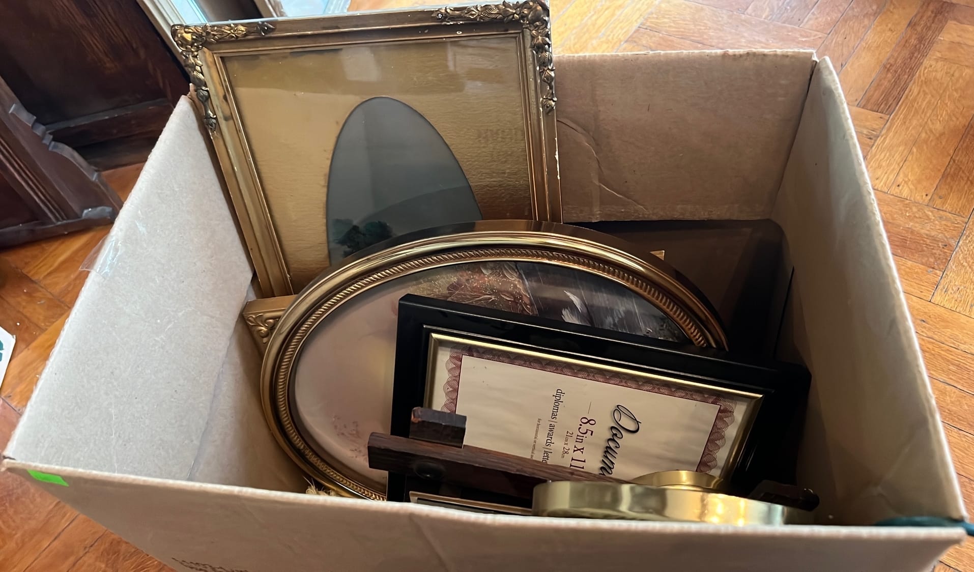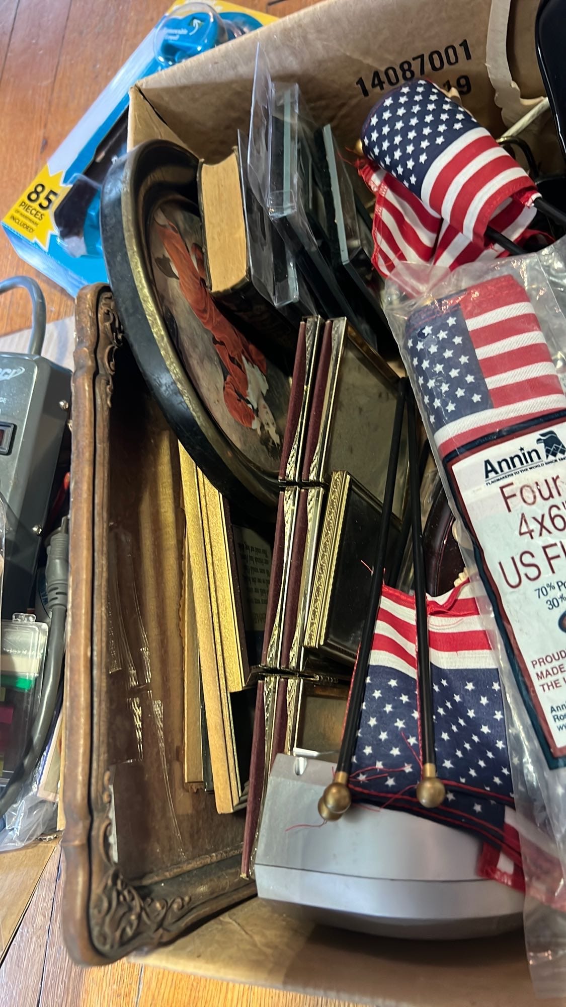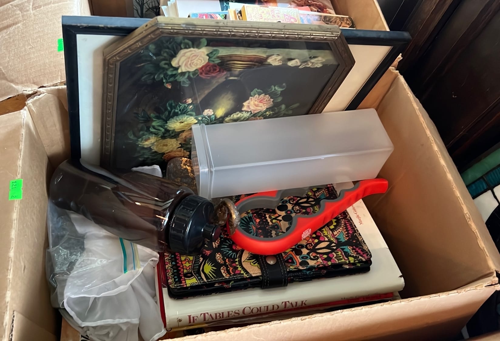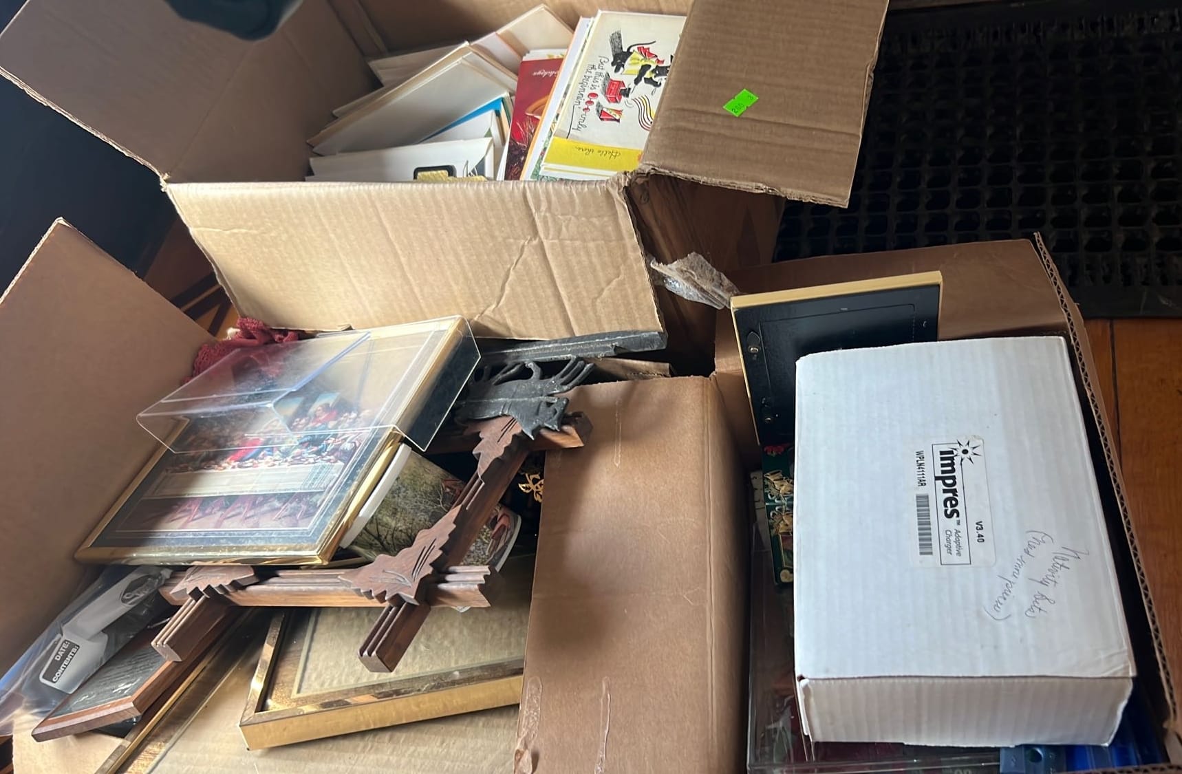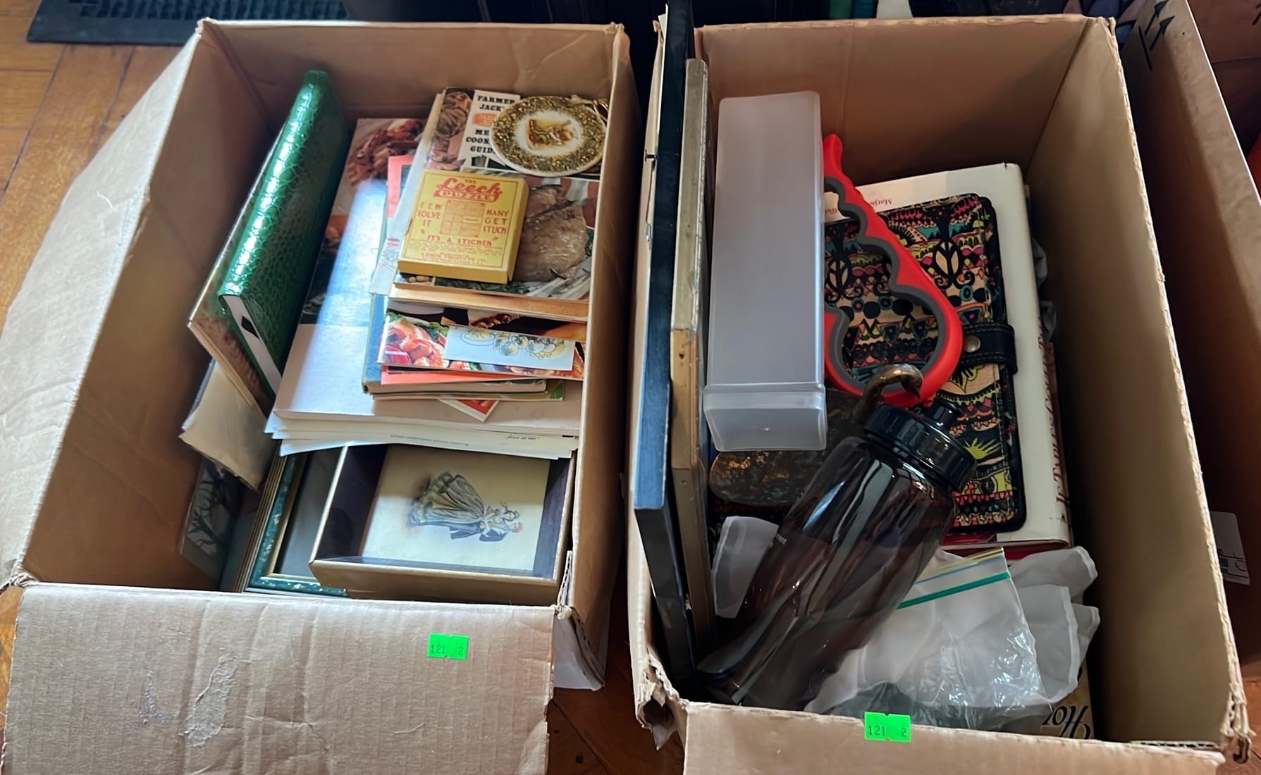121 Picture & Frames Various sizes • Recipe assortment • The Leech Puzzle in box • Vintage Post Card • Brass Bird Dish 6.25” • Book assortment • misc