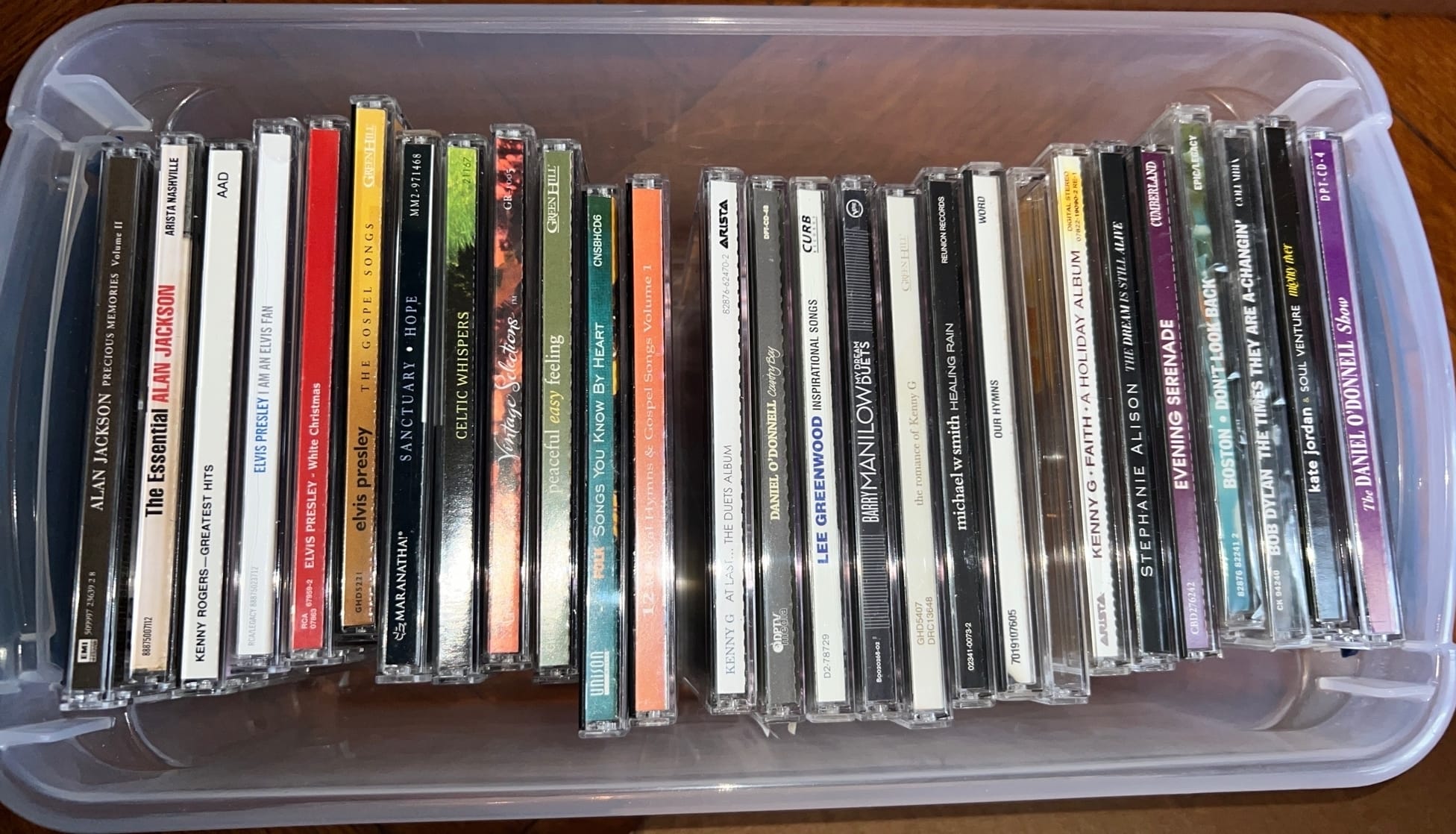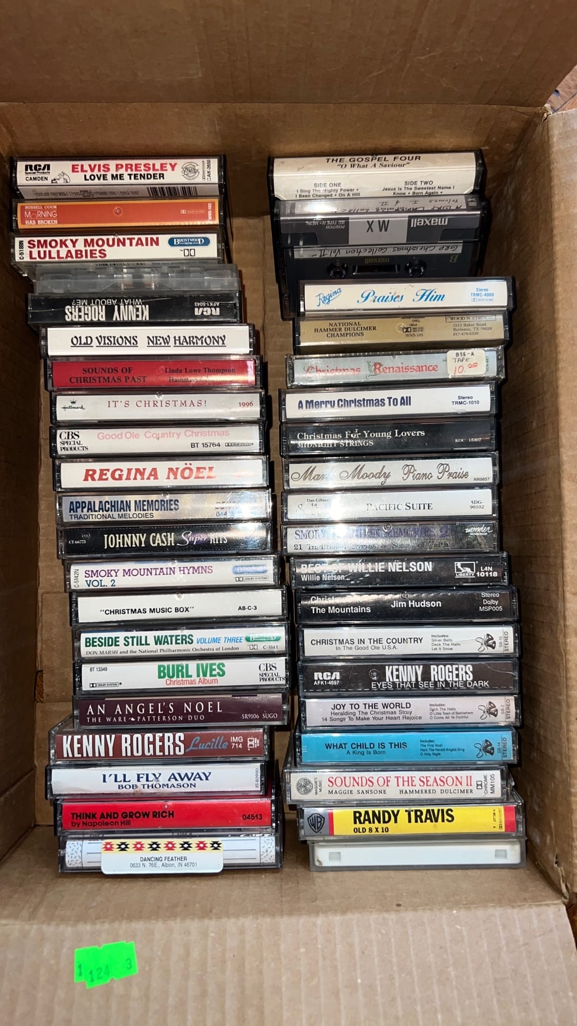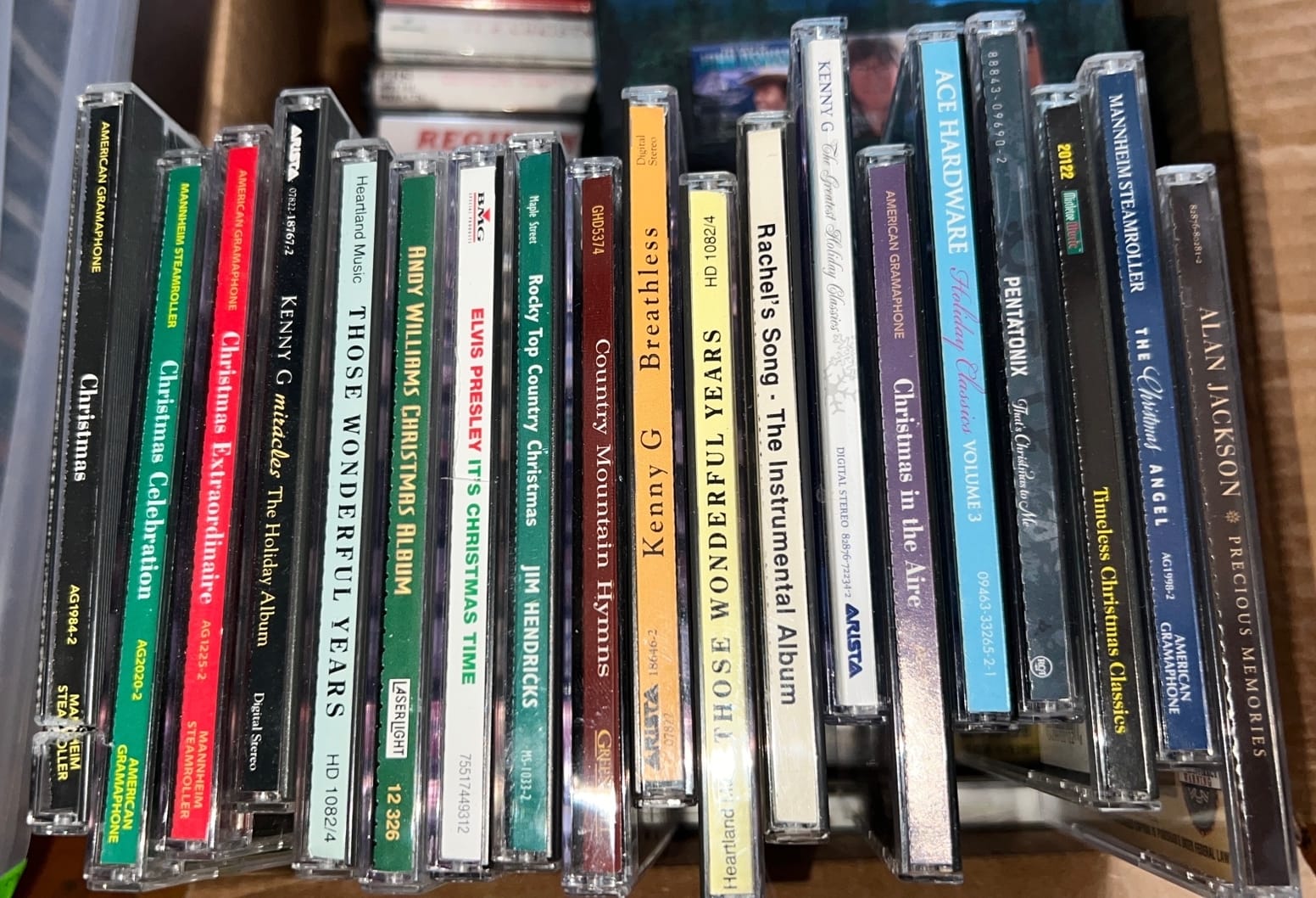 124 CD & Cassette assortment including - Kenny G • Those Wonderful Years • Mannheim Steamroller • Alan Jackson • Holiday Classics • Country Mountain Hyms • Randy Travis • Kenny Rogers • Burl Ives • Elvis Presley & More • Two Records Elvis Presley & Thirteen Women