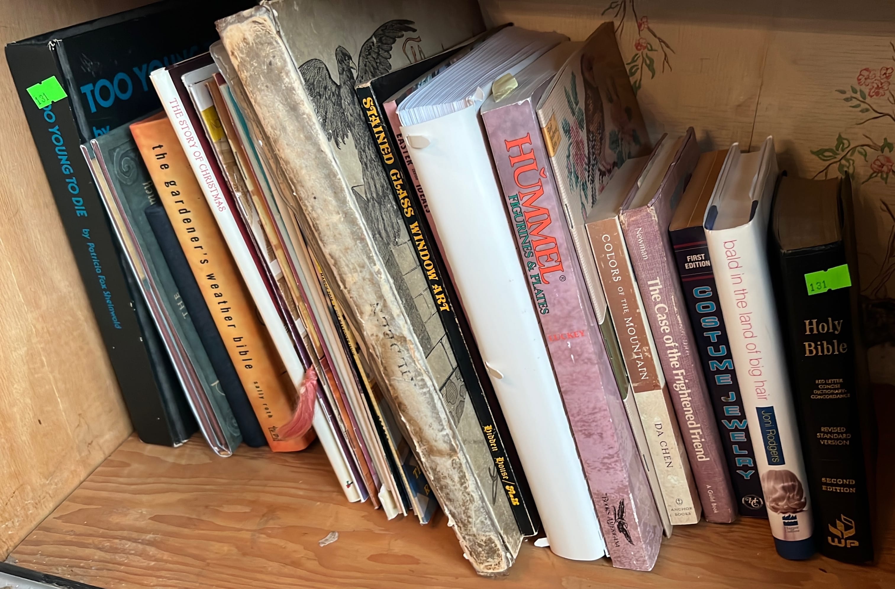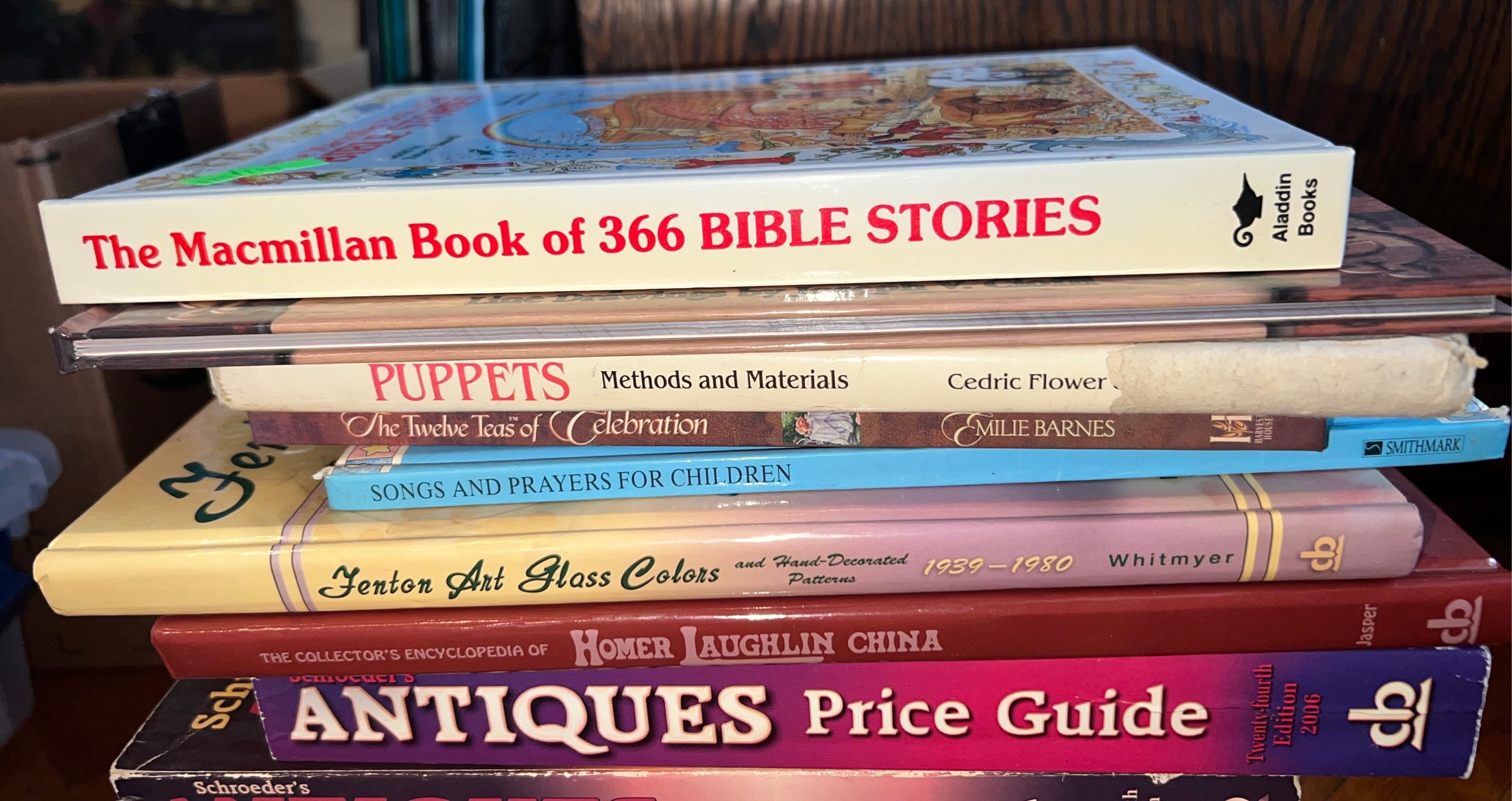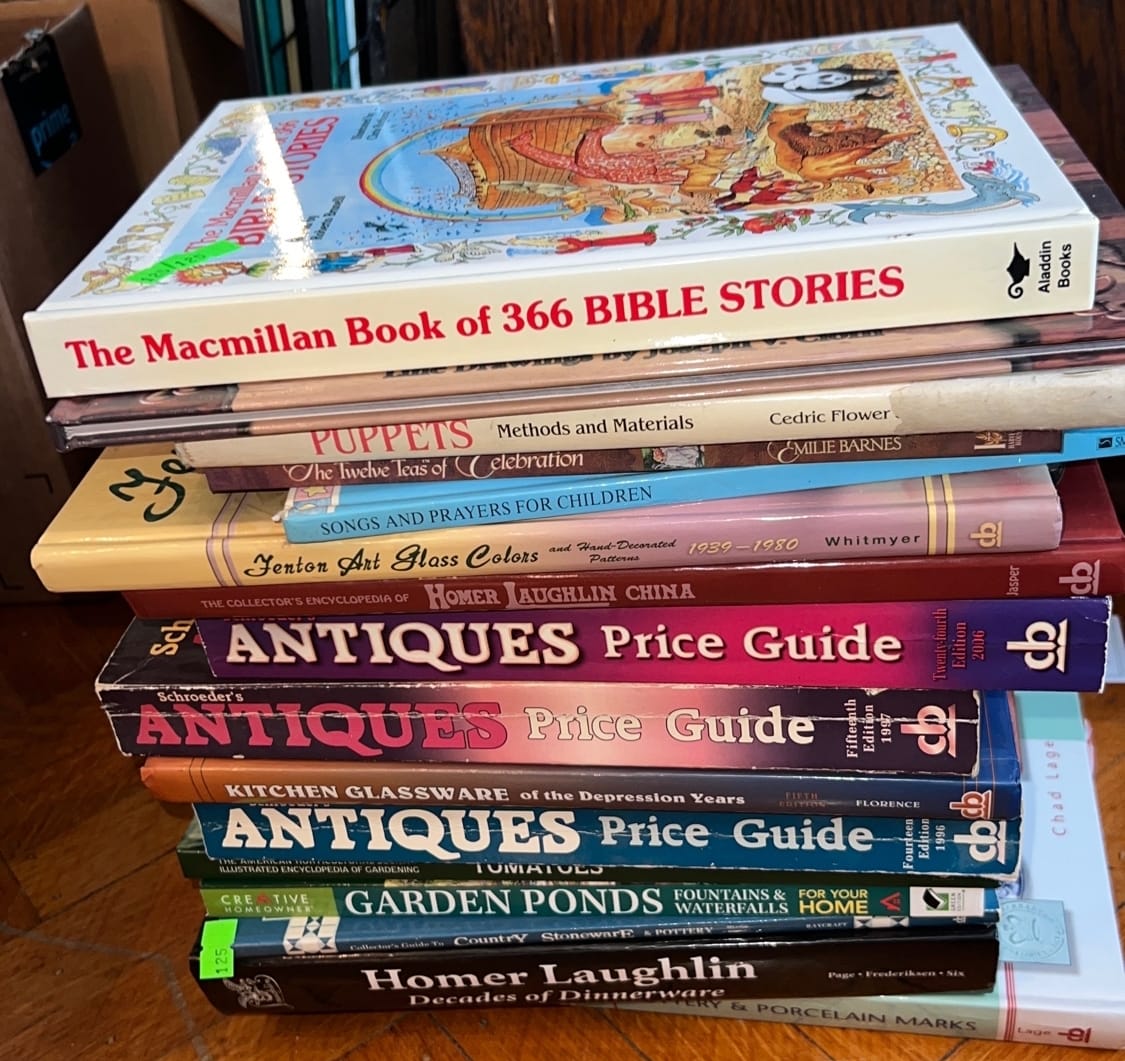 125 Book assortment including • The Macmillan Boom of 366 Bible Stories • Antique Price Guides • Homer Laughlin • Garden Ponds • Puppets • Song & Prayers for children & more