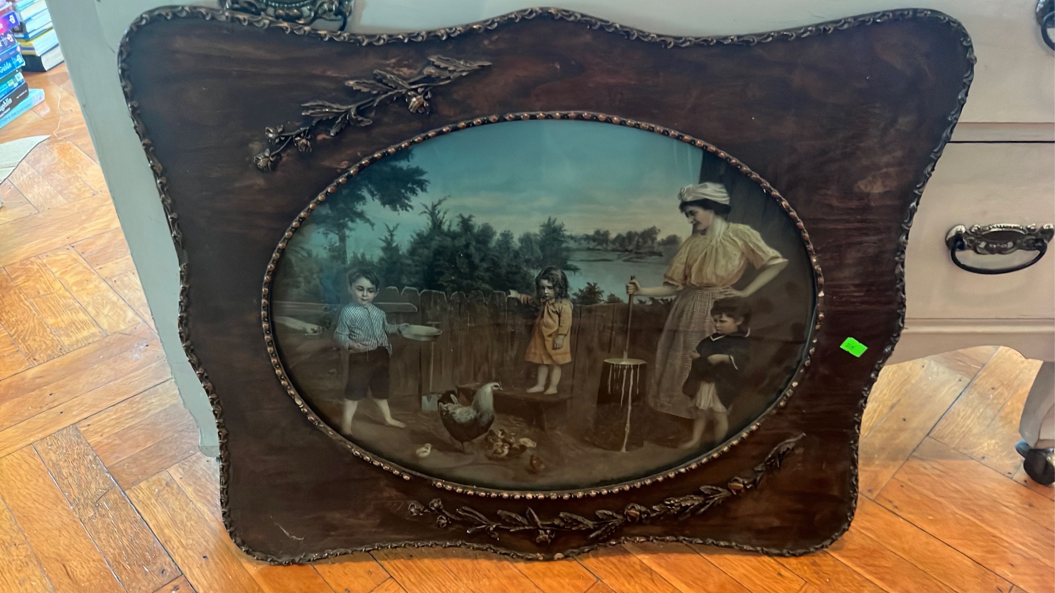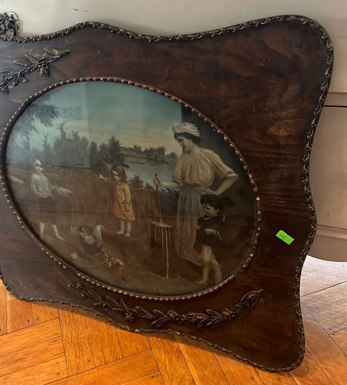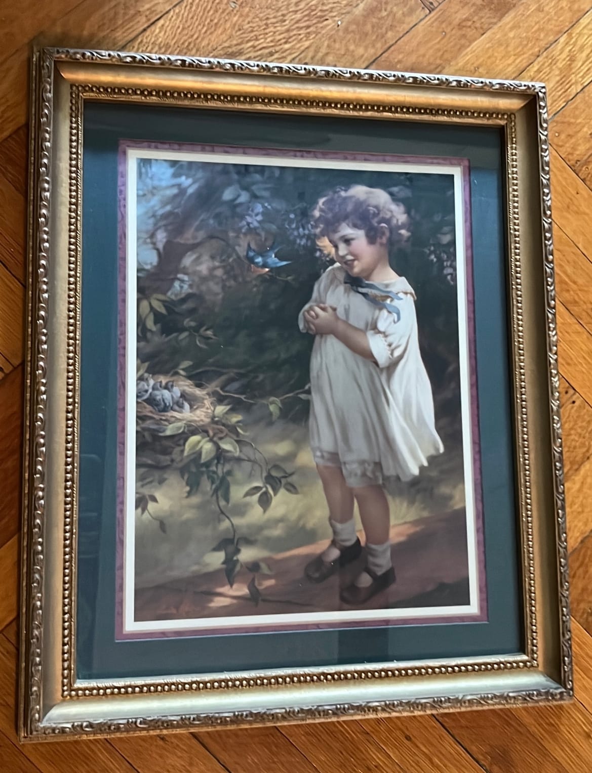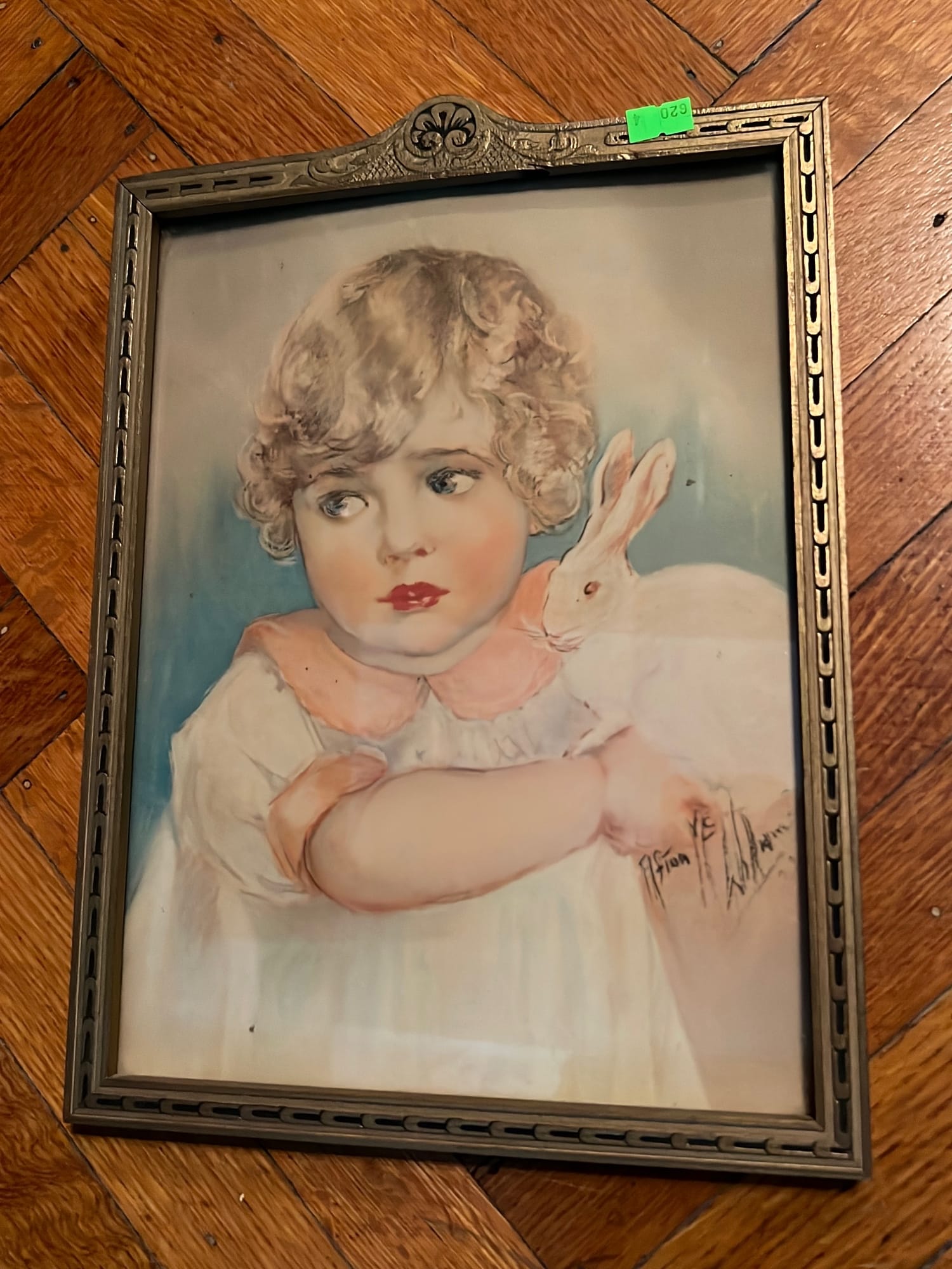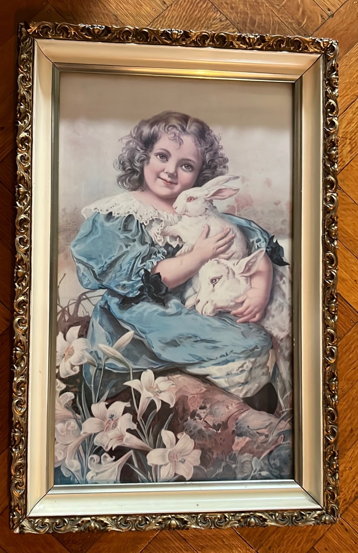 114 Vintage Metal Frame With Curved Front Glass & Picture of Little Girl Praying 15.25”x21.5”