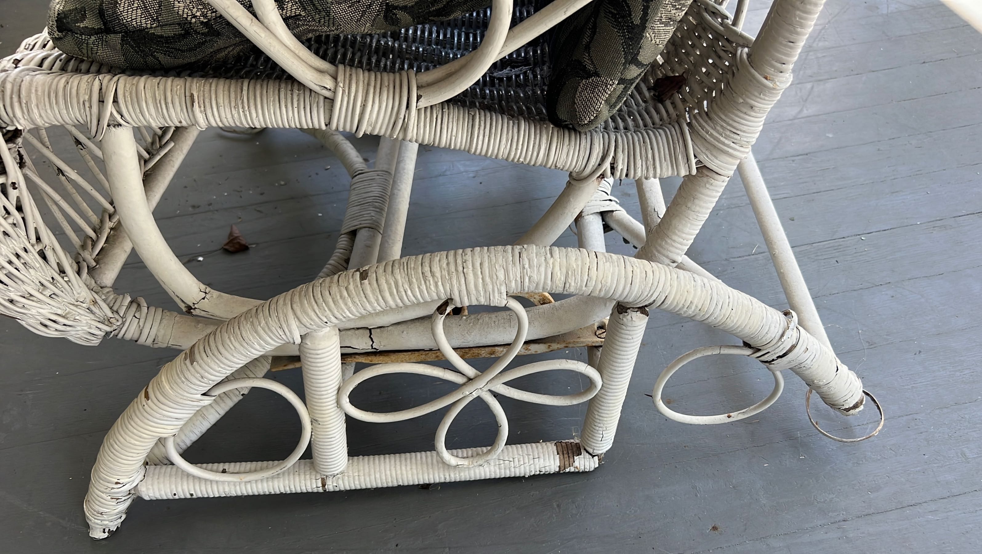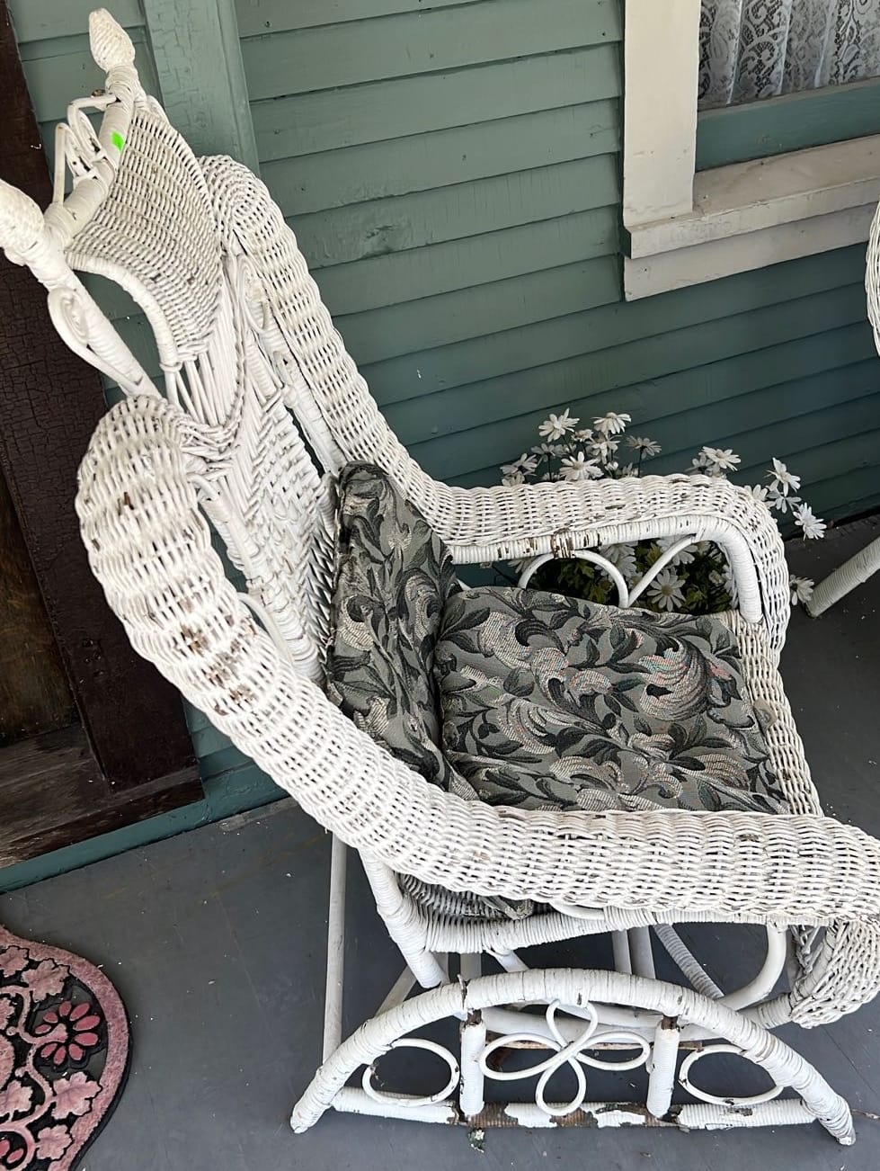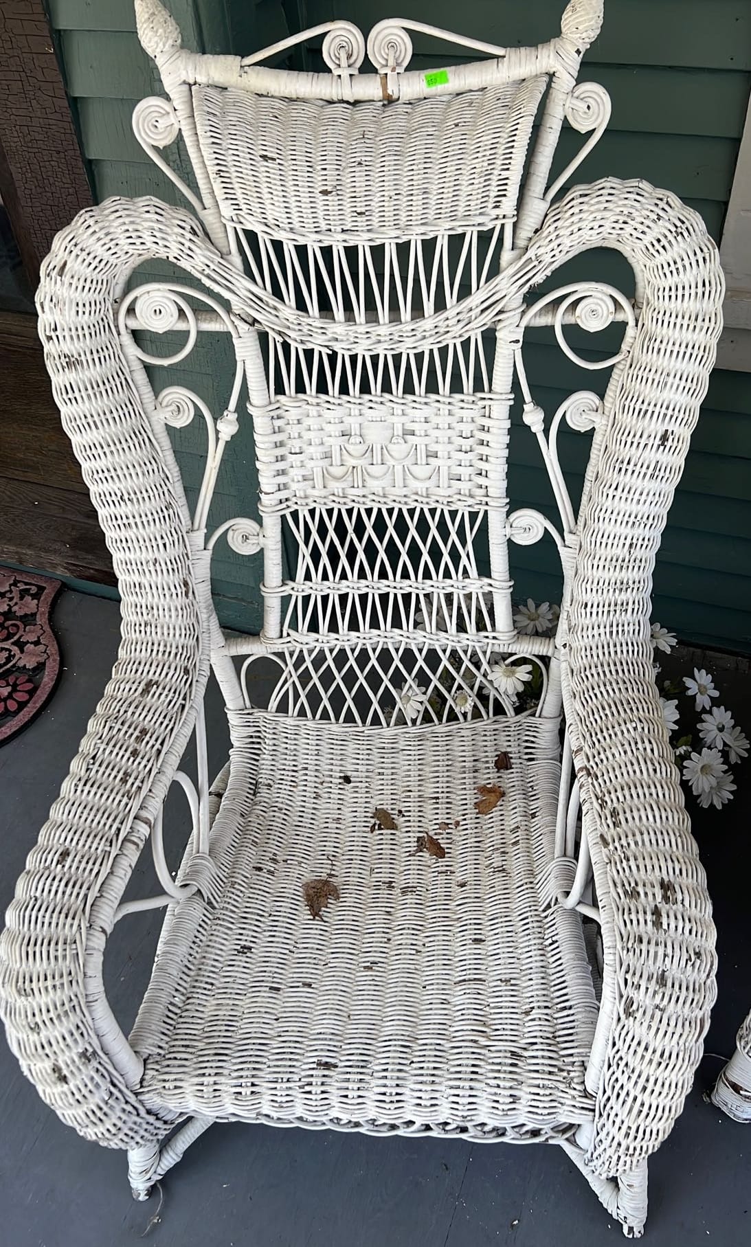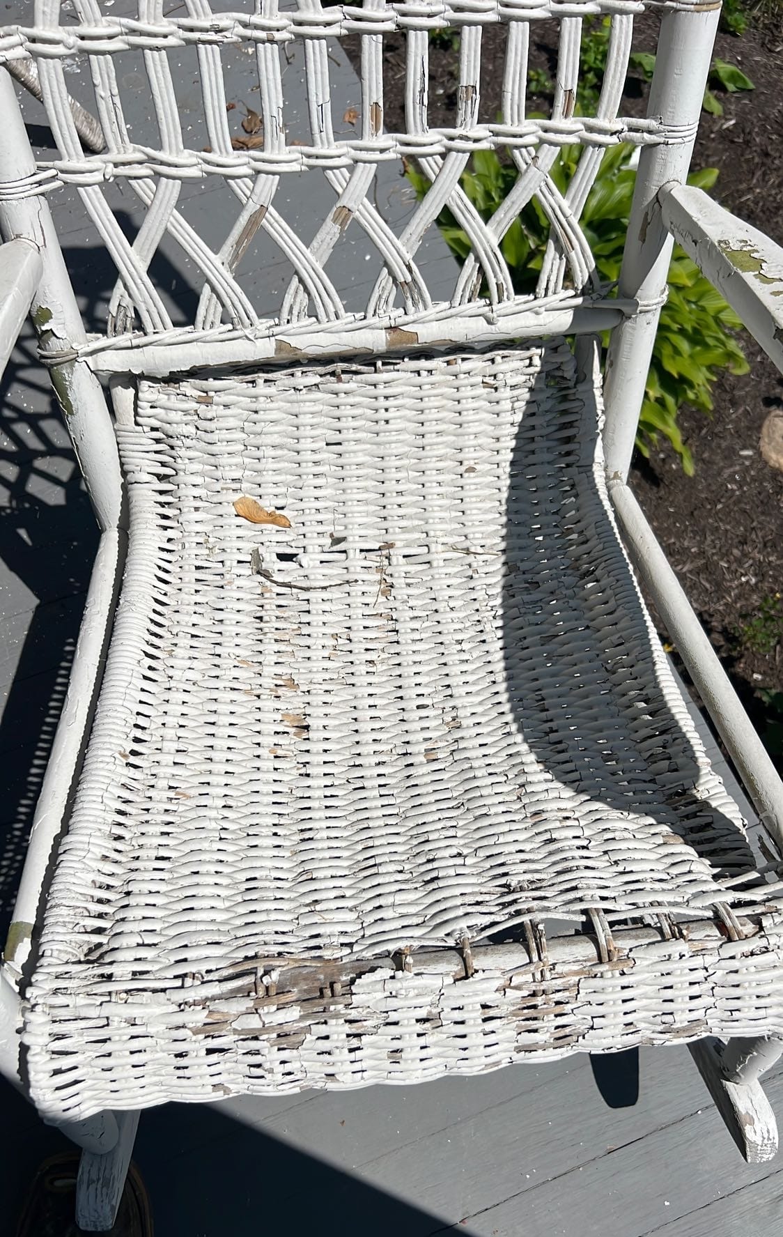 8a Antique Wicker Rolling Rocking Chair 23” wide Seat height 15.5”