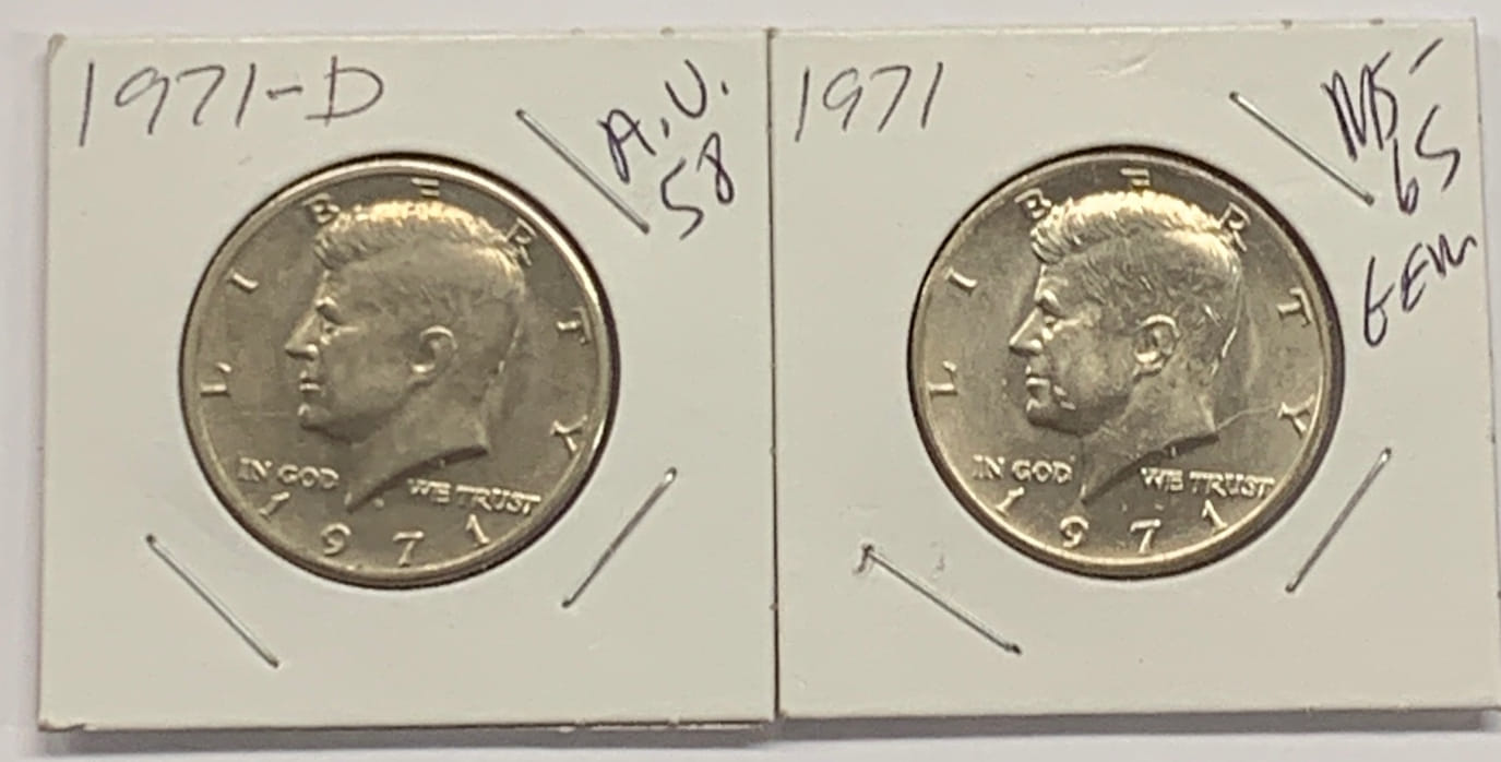 28 2 Kennedy Half Dollars, 1971-D A.U. 58, 1971 MS-65 Gem