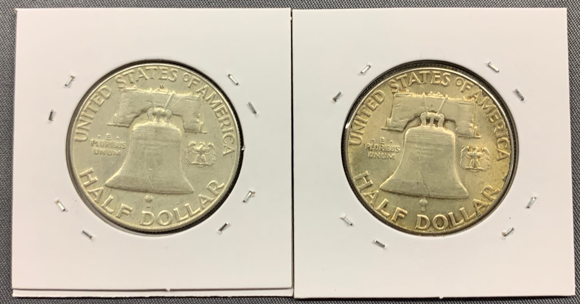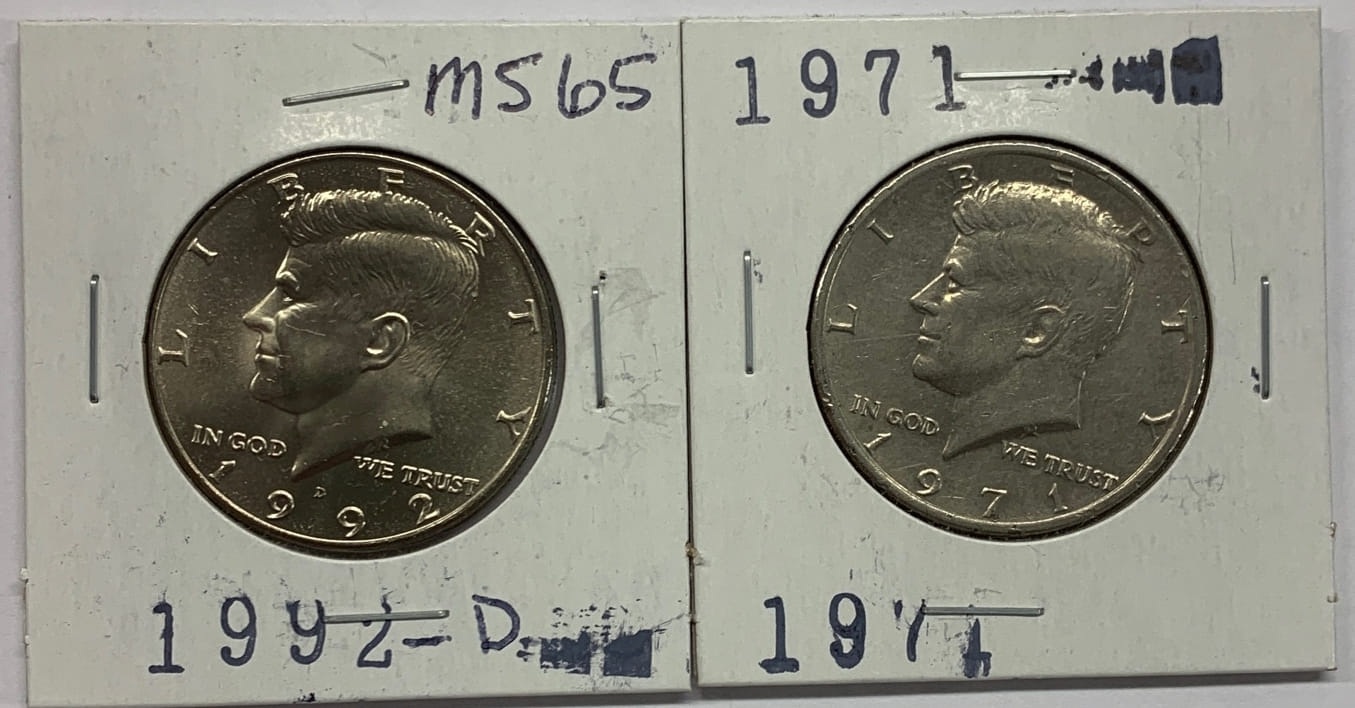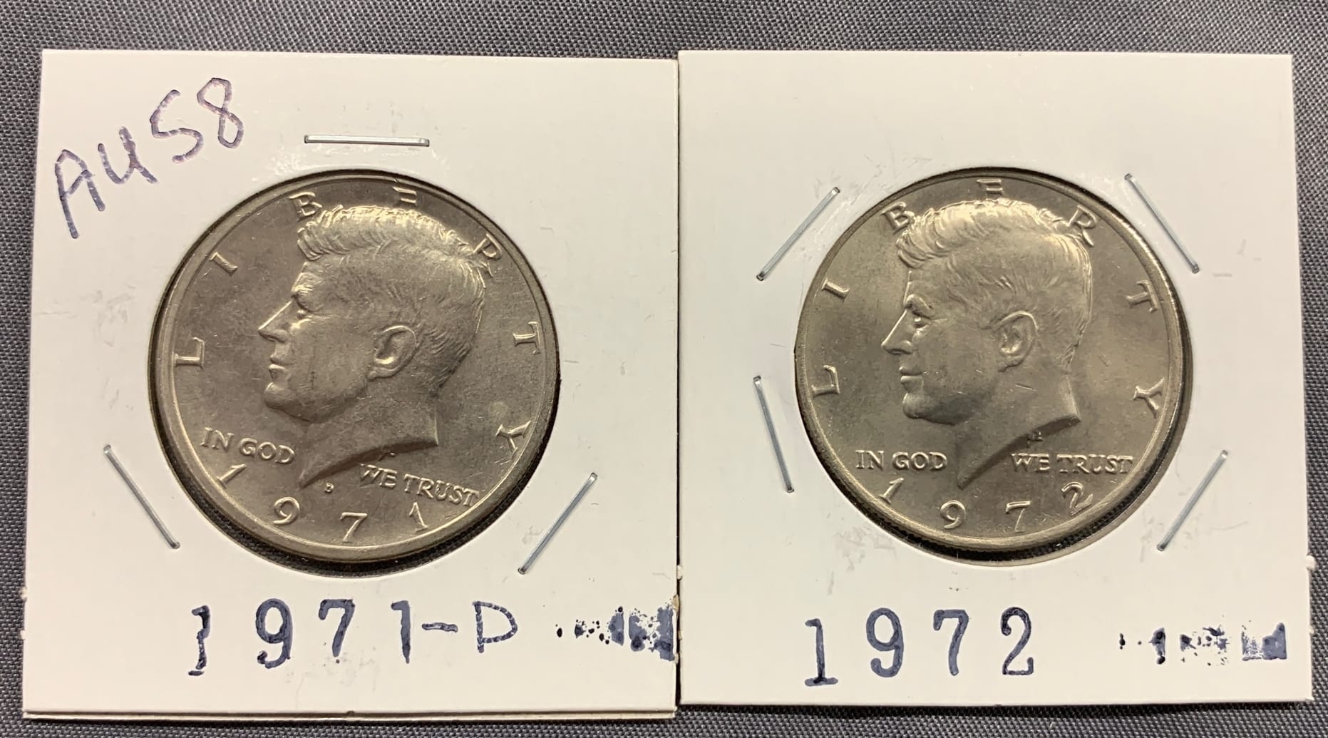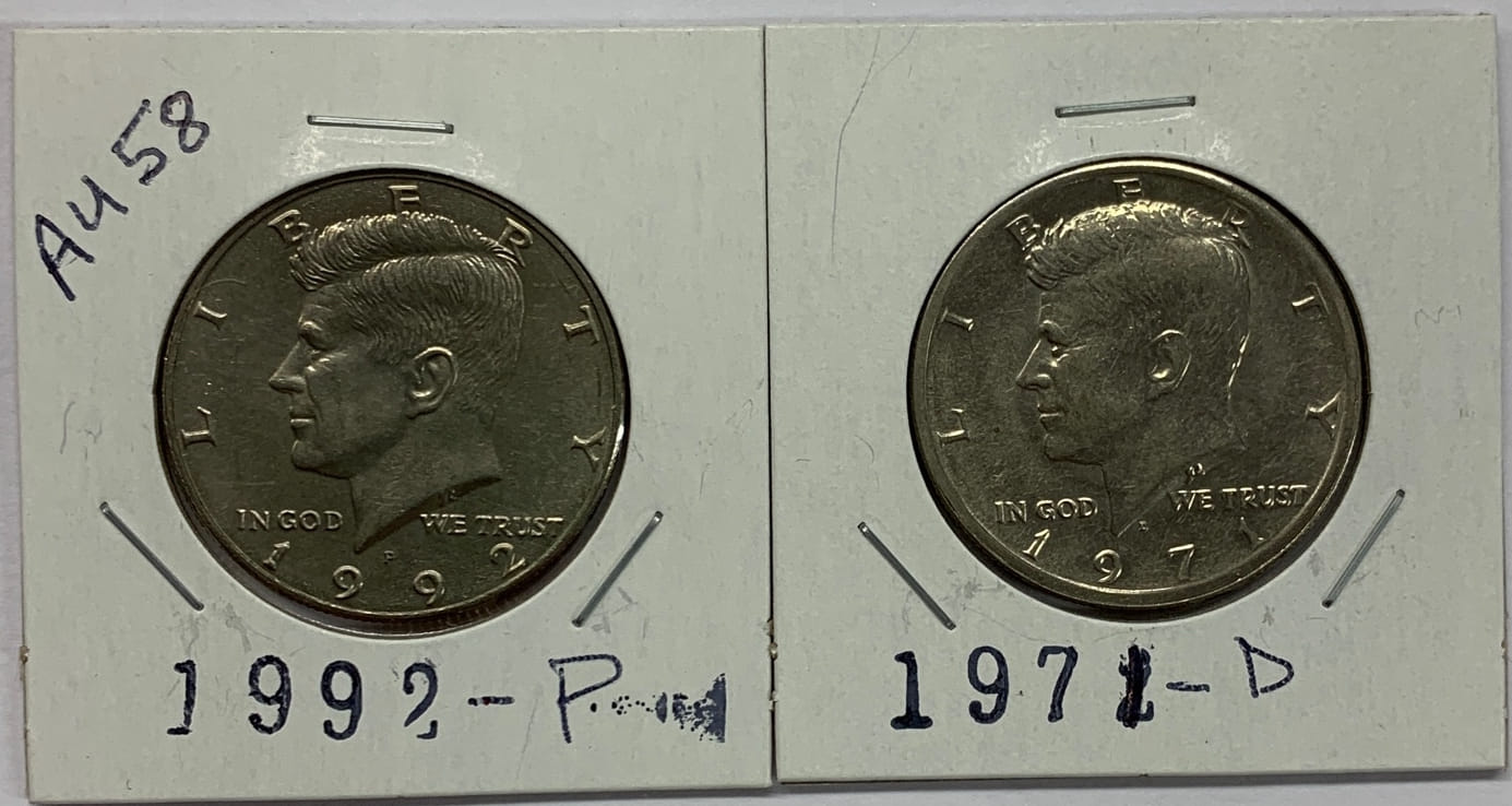 61 2 Kennedy Half Dollars, 1971-D, 1992-P AU 58