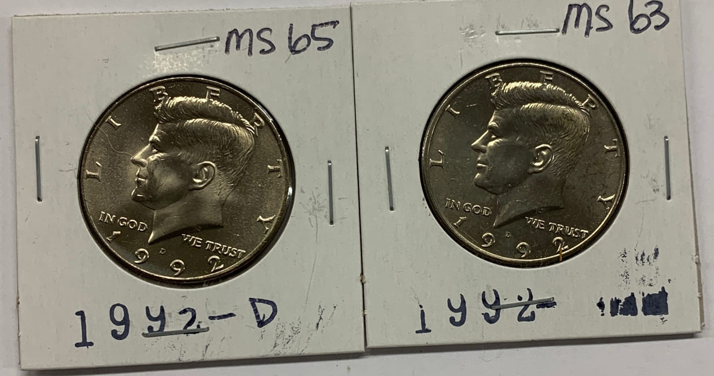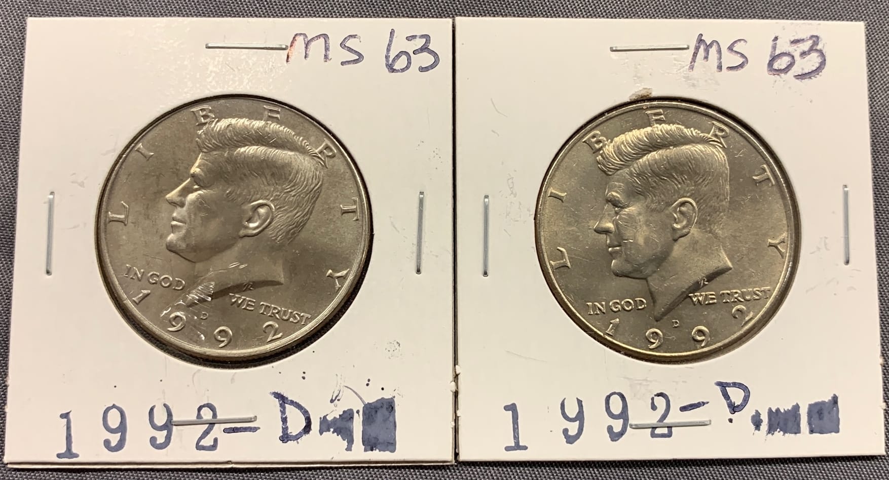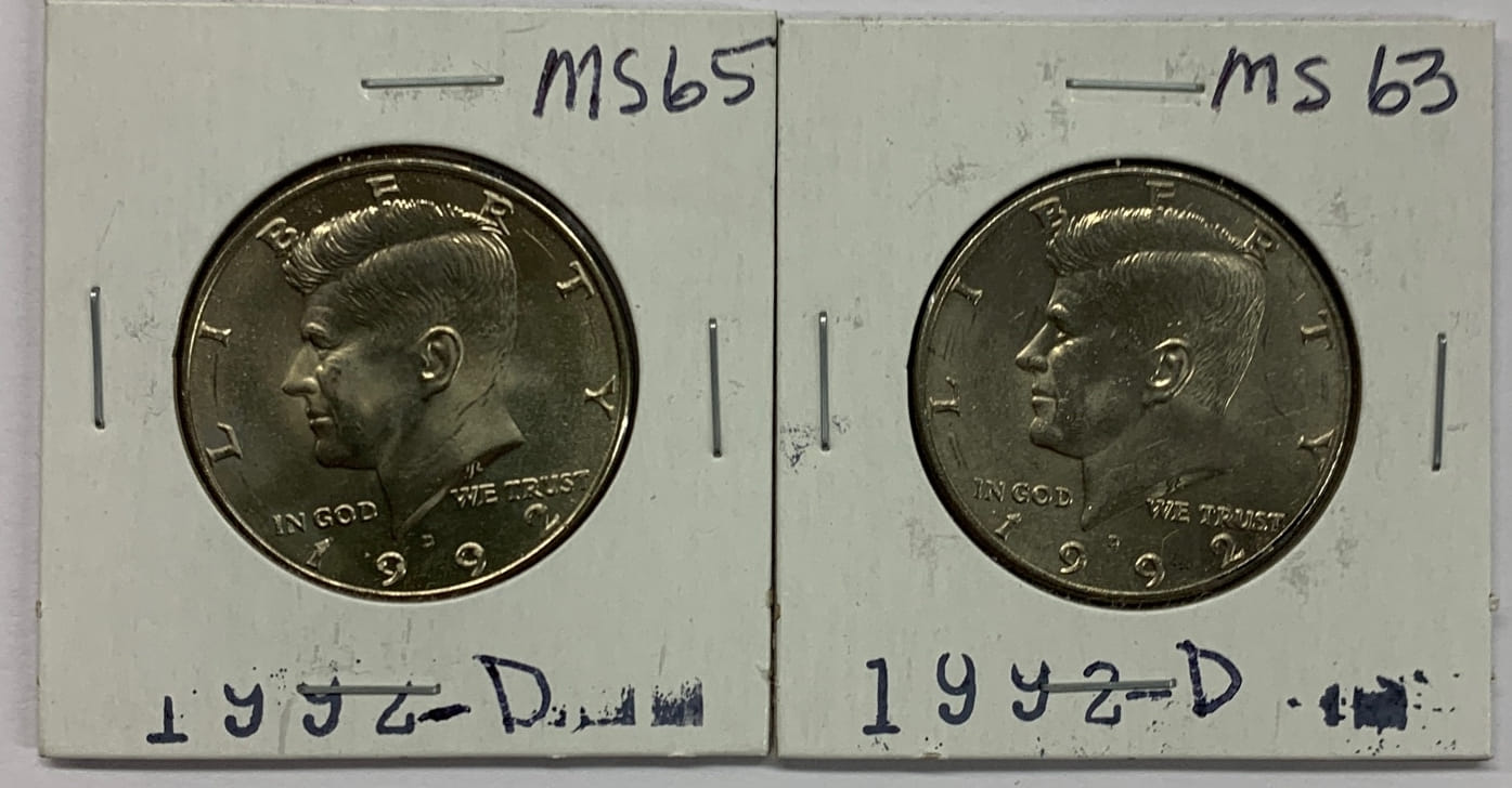 58 2 Kennedy Half Dollars, 1992-D MS 65, 1992-D MS 63