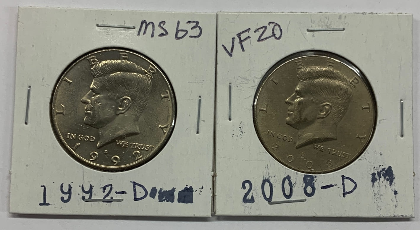 45 2 Kennedy Half Dollars, 1993-D MS 63, 2008-D VF 20