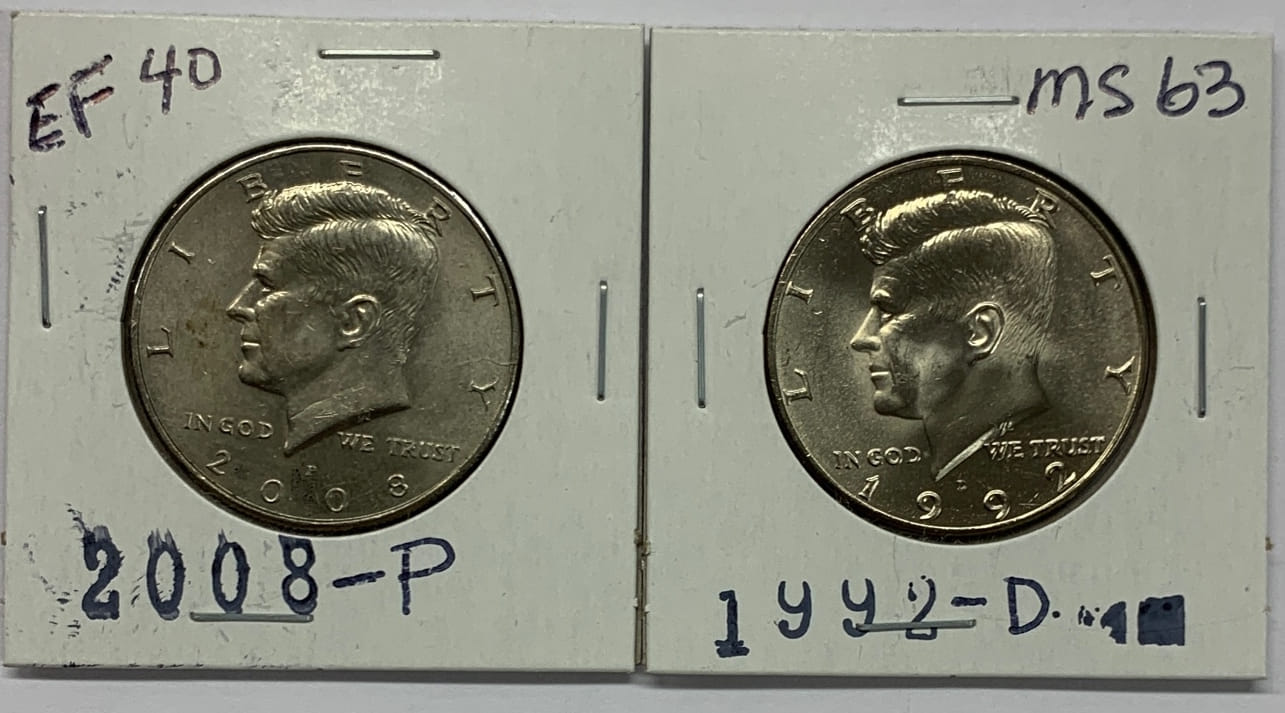 104 2 Kennedy Half Dollars, 1992-D MS-63, 2008-P EF-40