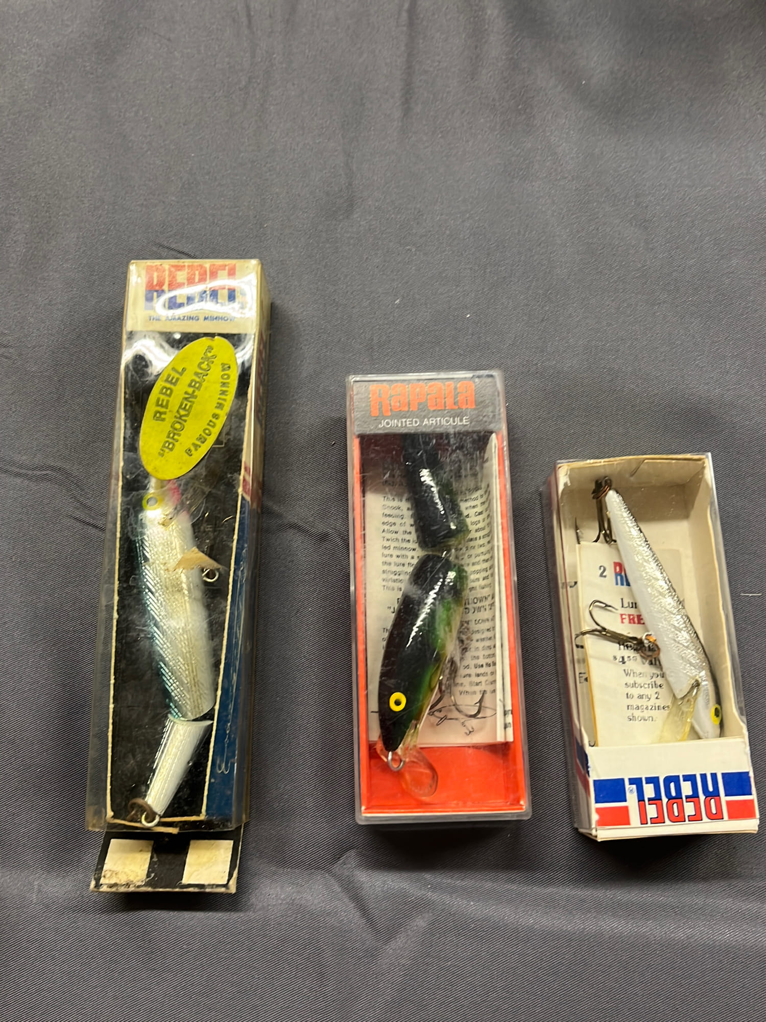 447 3 Fishing Lures - Rebel "Broken-Back" Minnow, Rapala Jointed Articule, Rebel