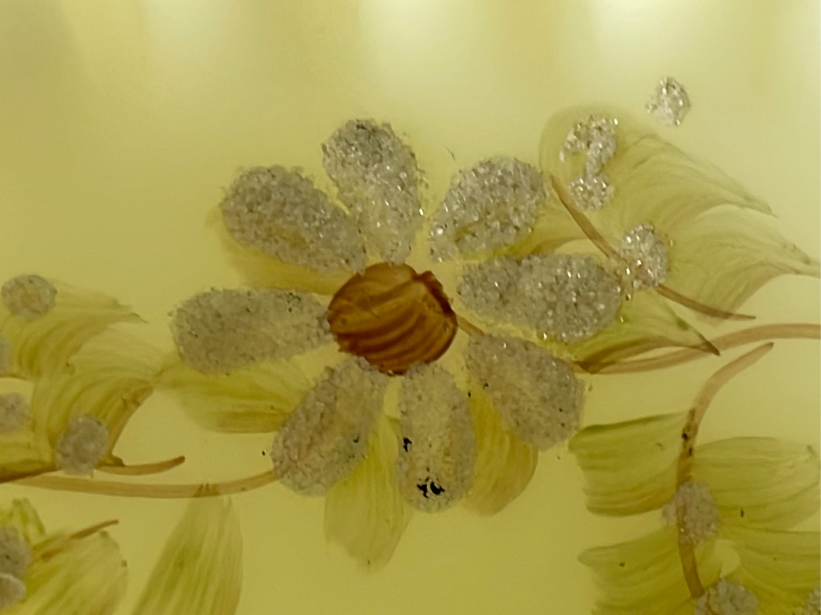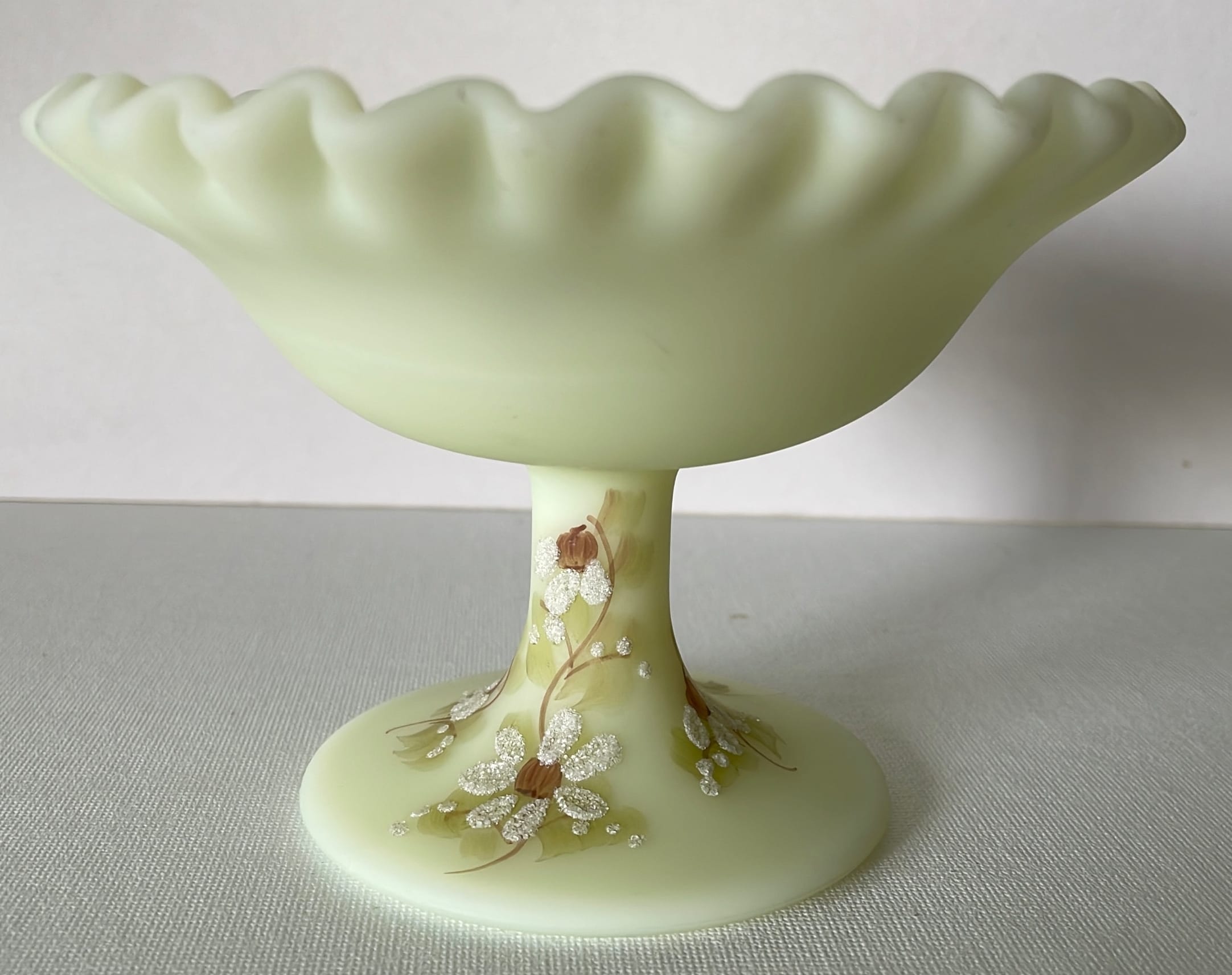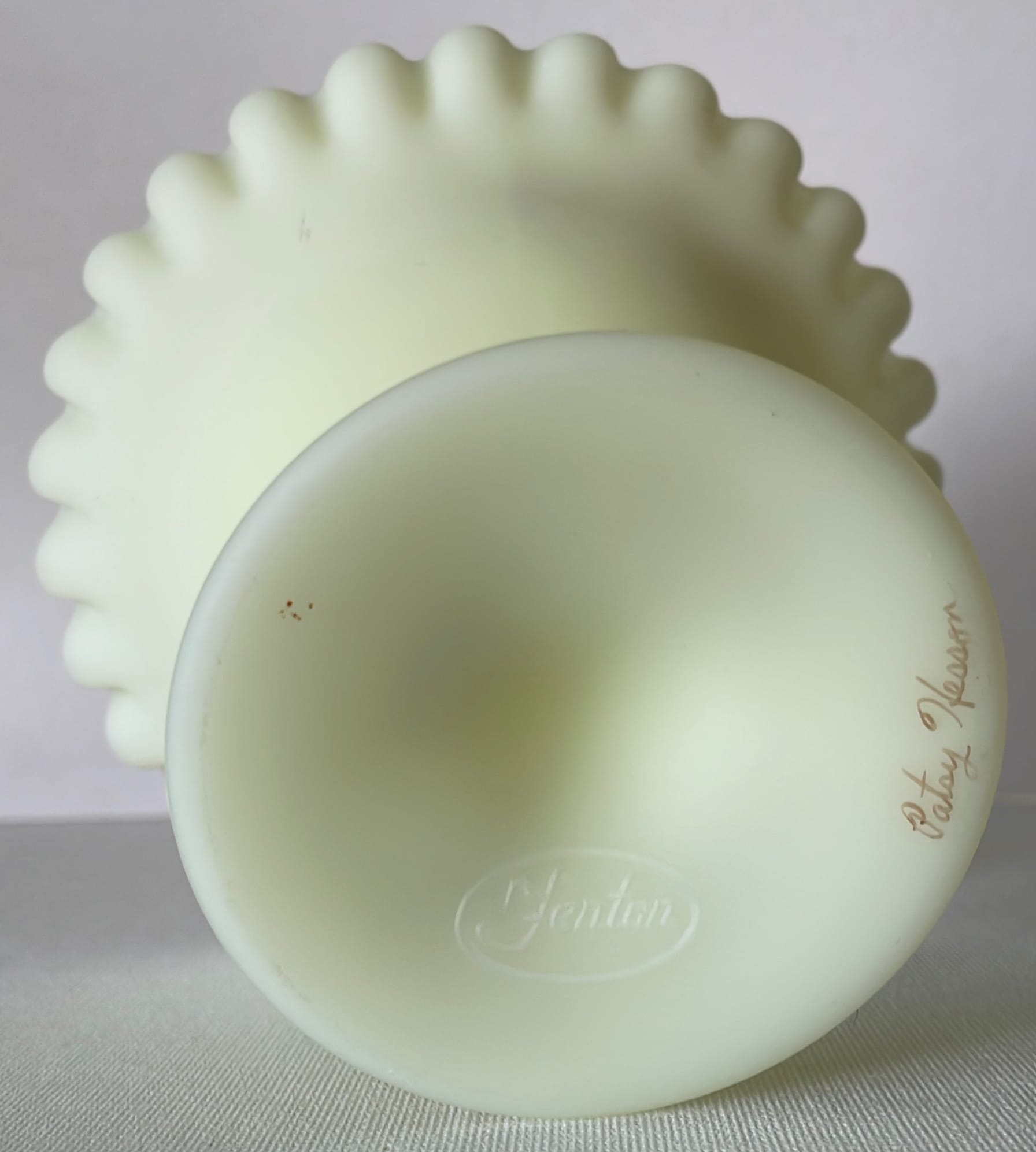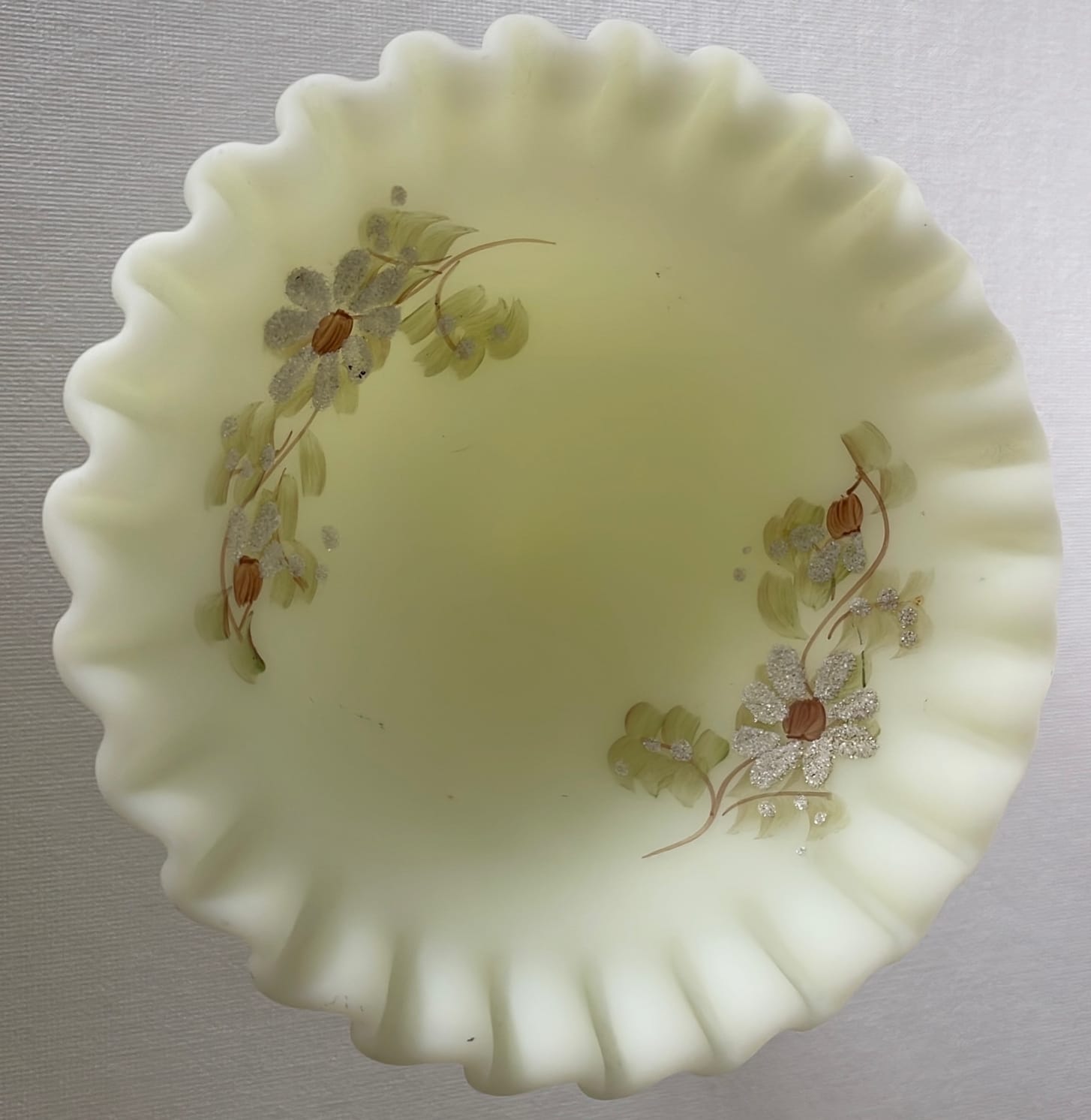 2 Fenton Custard Satin Ruffled Edge Candy Dish 3 5/8”H - Hand Painted By Patsy Hesson - (raised glitter paint with some black marks)