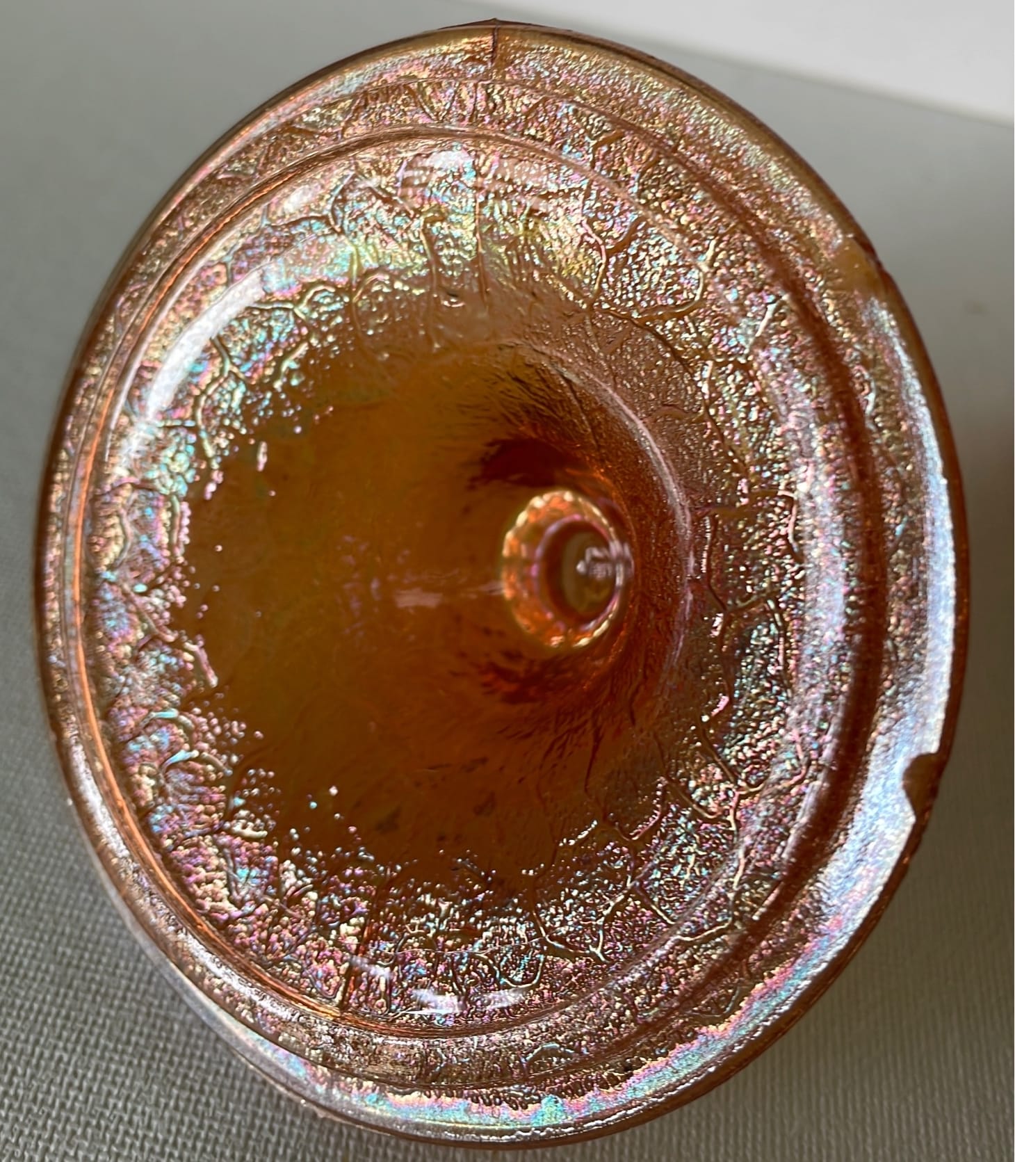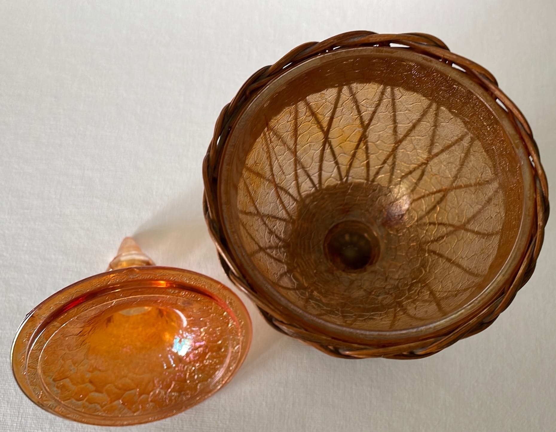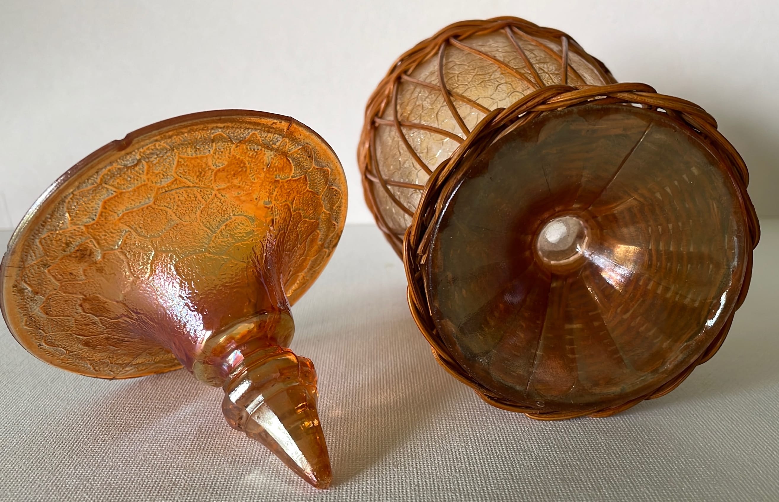 3 Vintage Marigold Glass Candy Dish With Lid In Woven Fiber Casing 7 1/2”H (chipped)