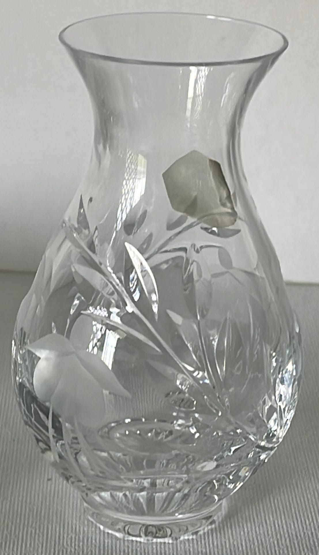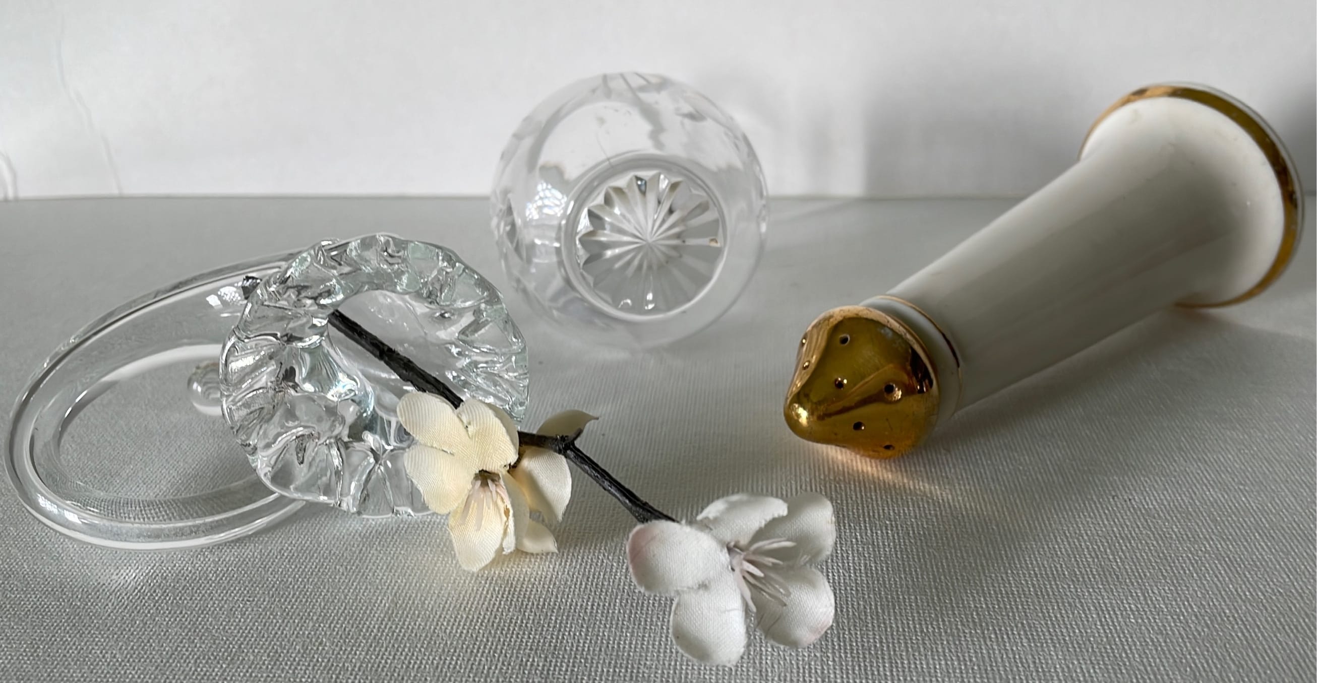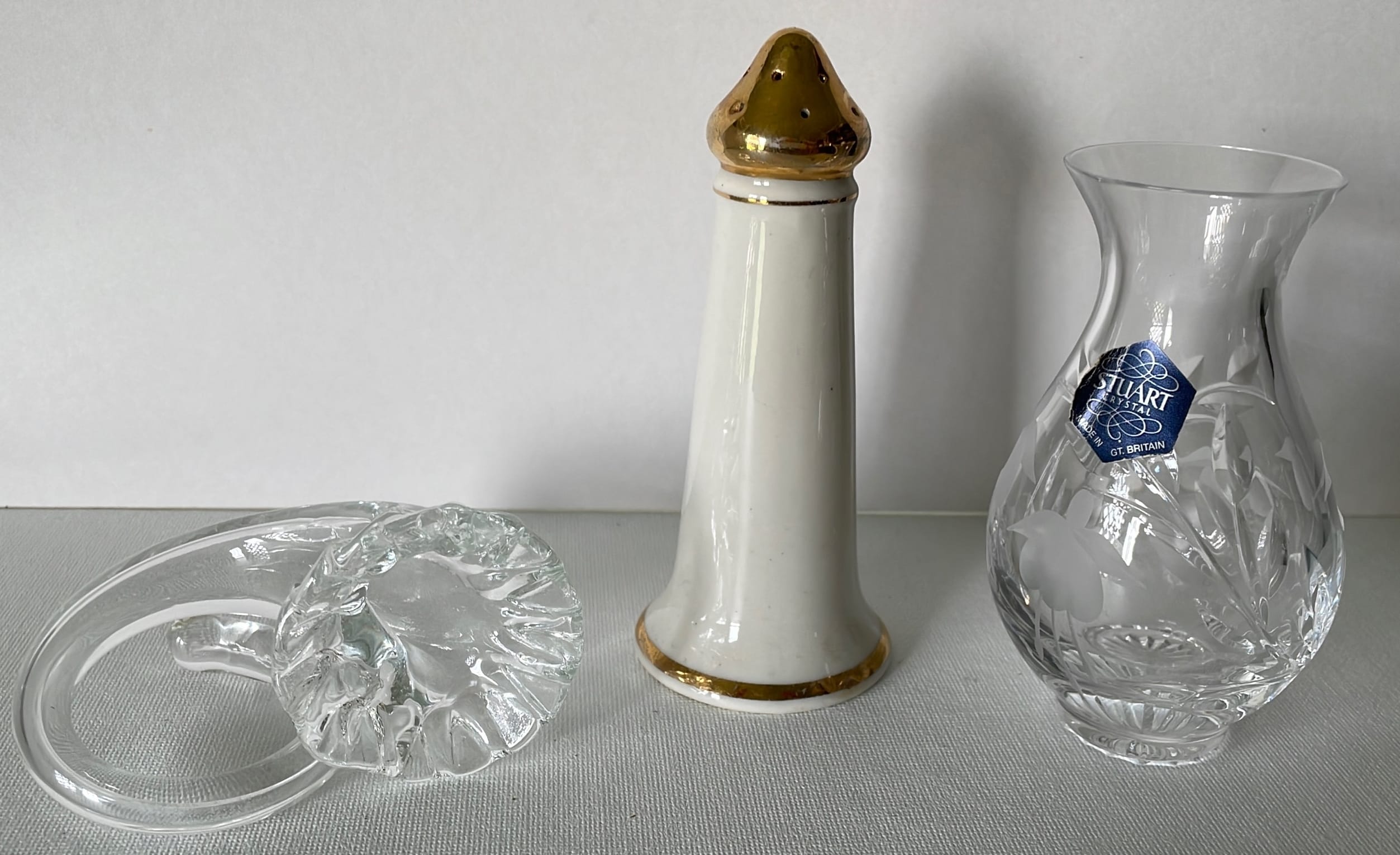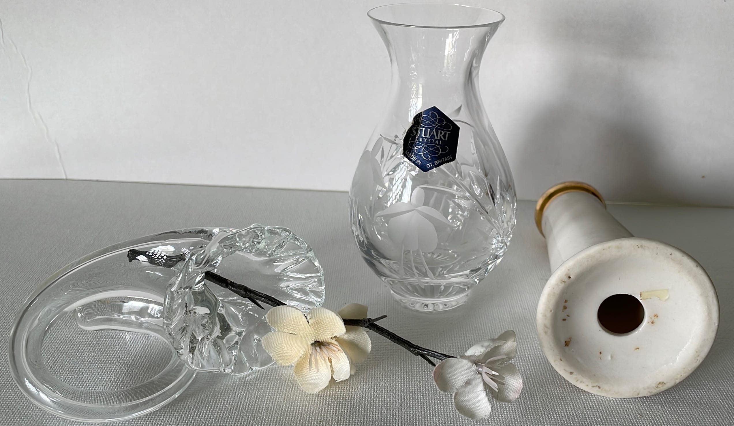 5 3 Items - Hollow Glass Flower Placesetting Vase 4”L, Stuart Crystal Vase 4”H, Ceramic Salt Shaker 4 1/2”H