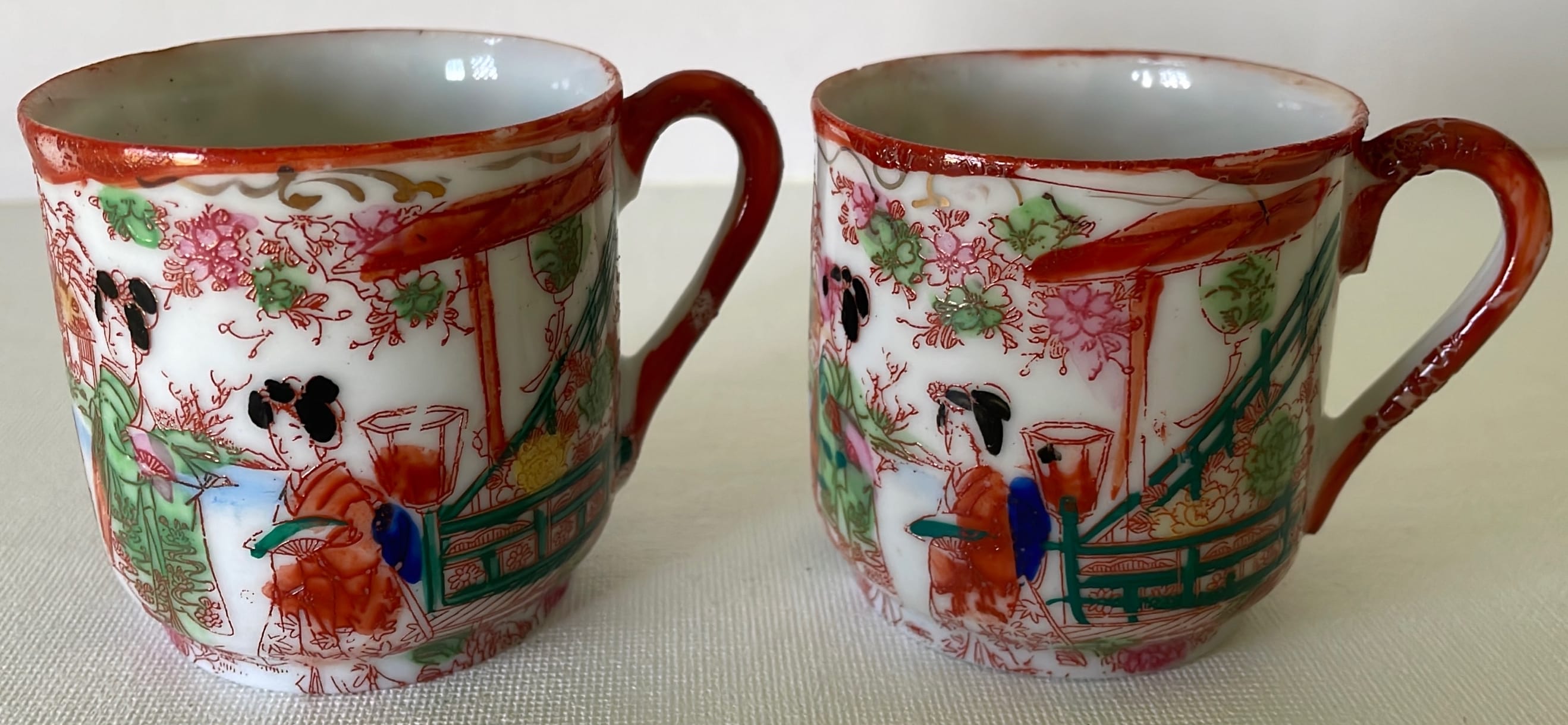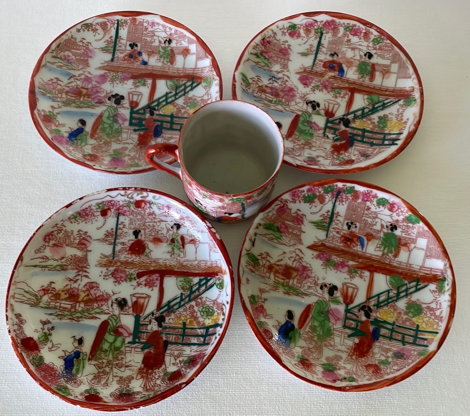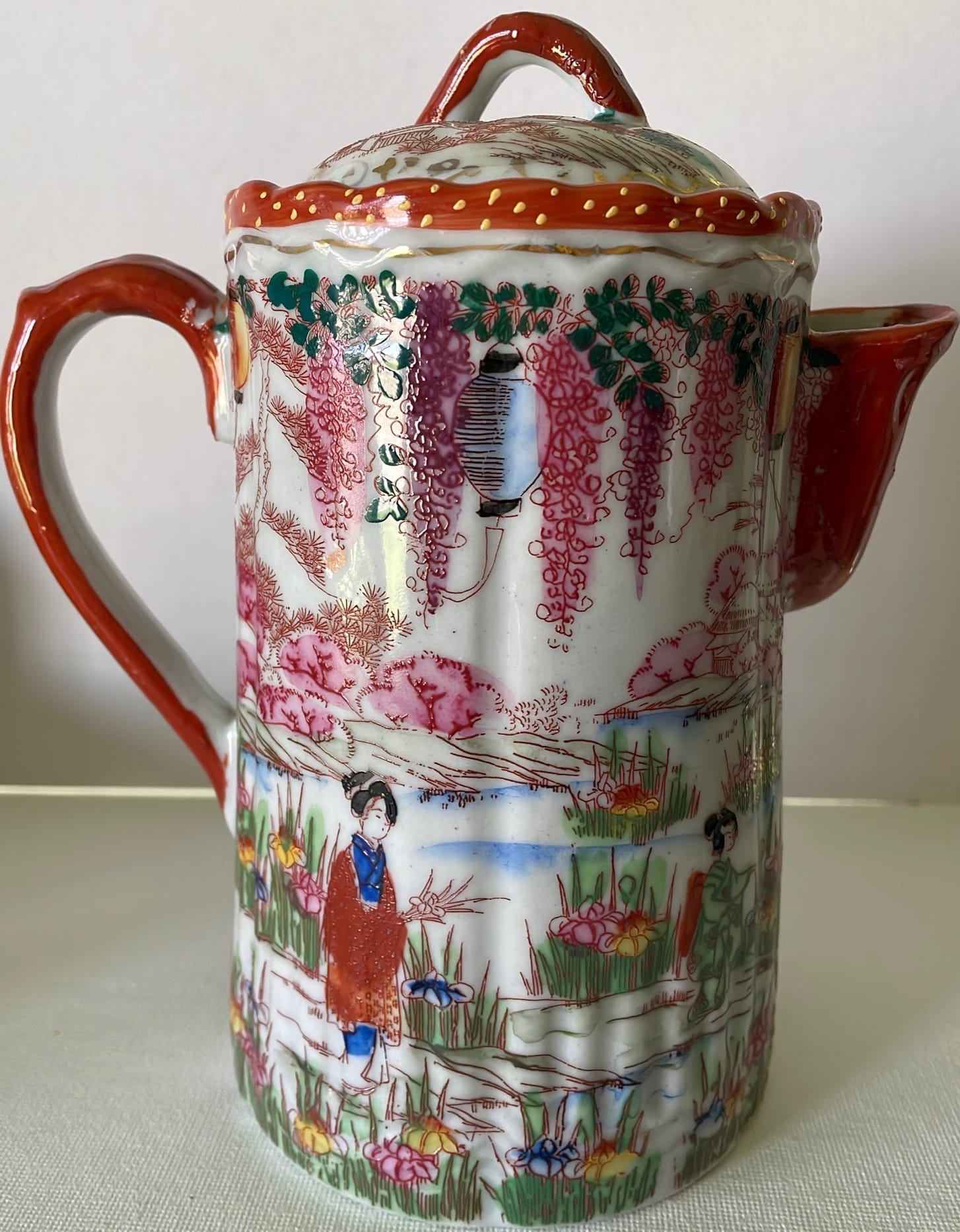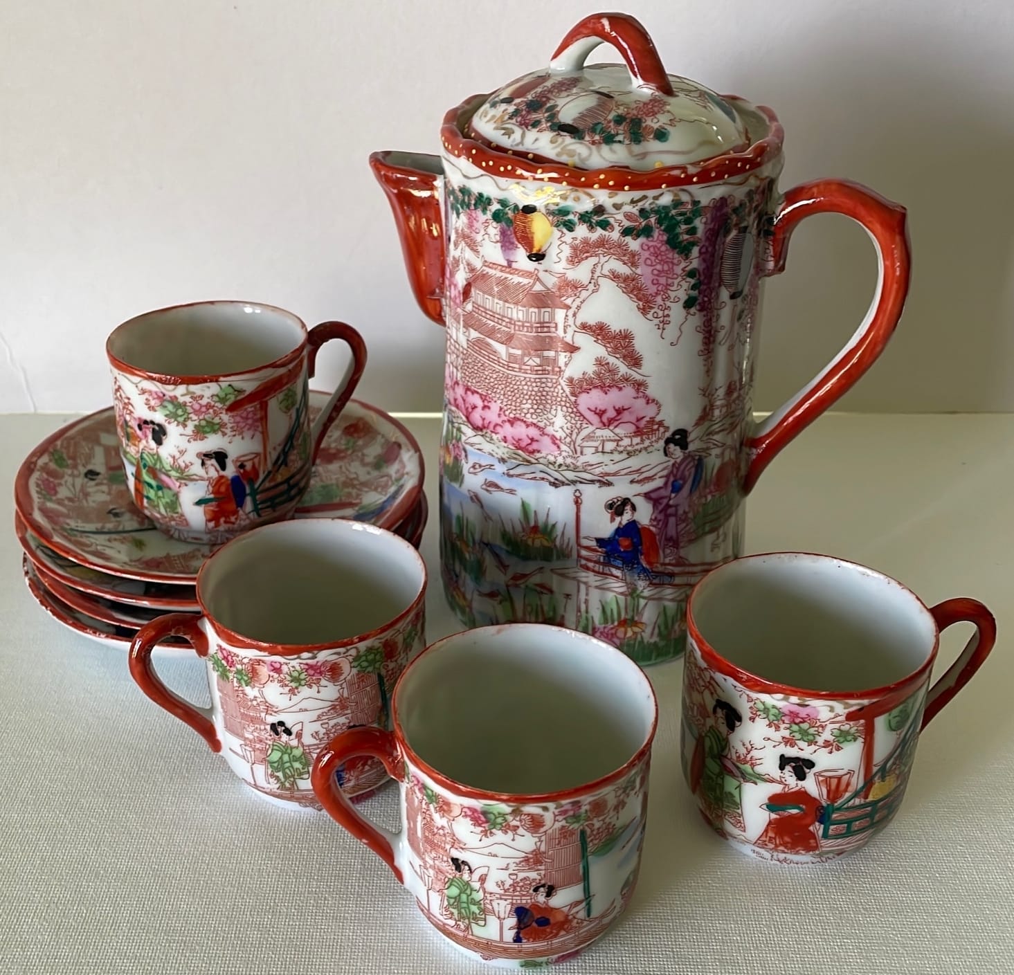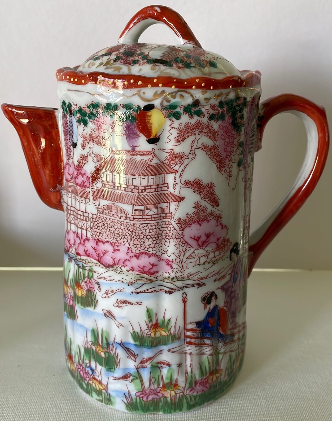 6 Vintage 6 3/4”H lidded teapot with four 2 1/4”H cups and four 4 1/2”Dia. saucers - all have imperfections in the paint or glaze - Japanese, with scenes of geishas by the water enjoying fish and water lillies - all have imperfections in the paint or glaze - cups and saucers have a few small chips