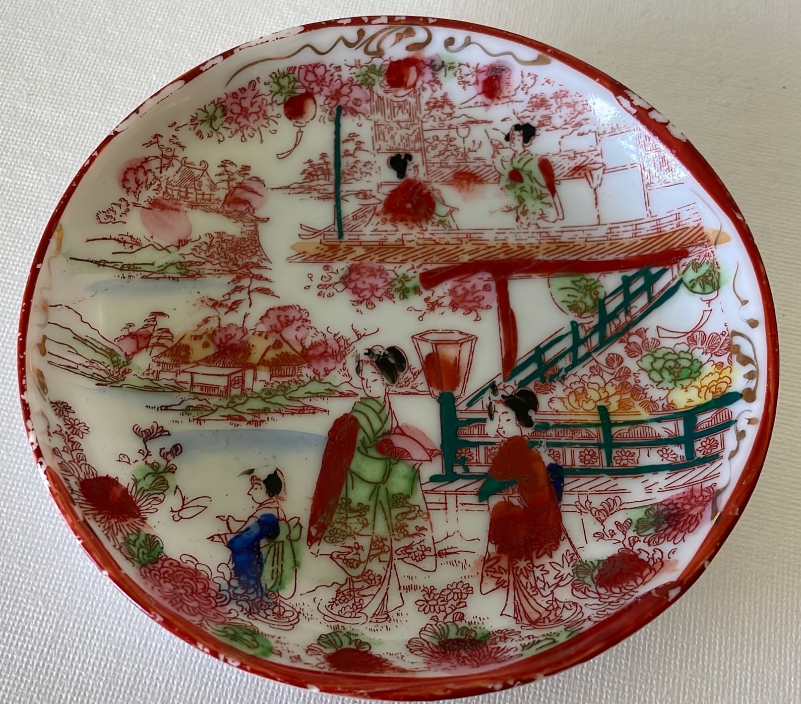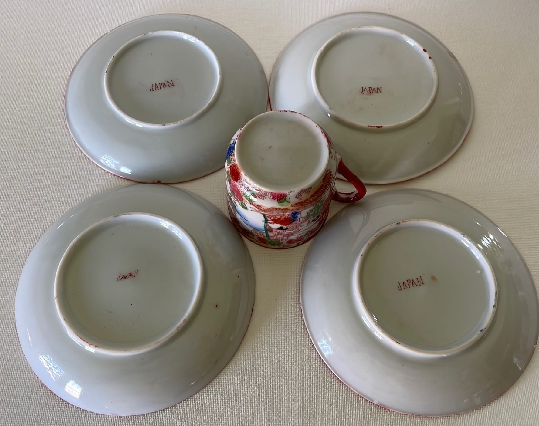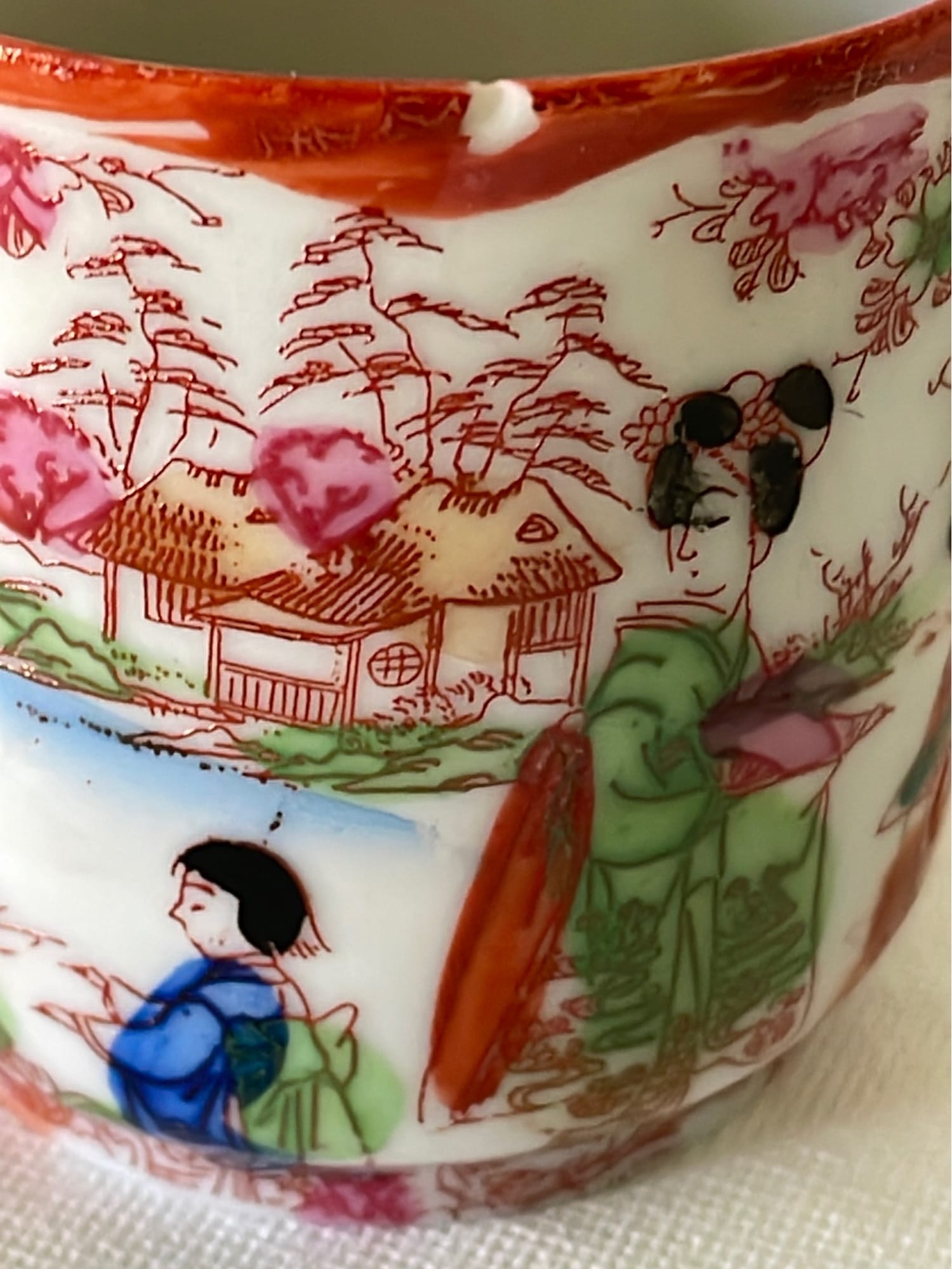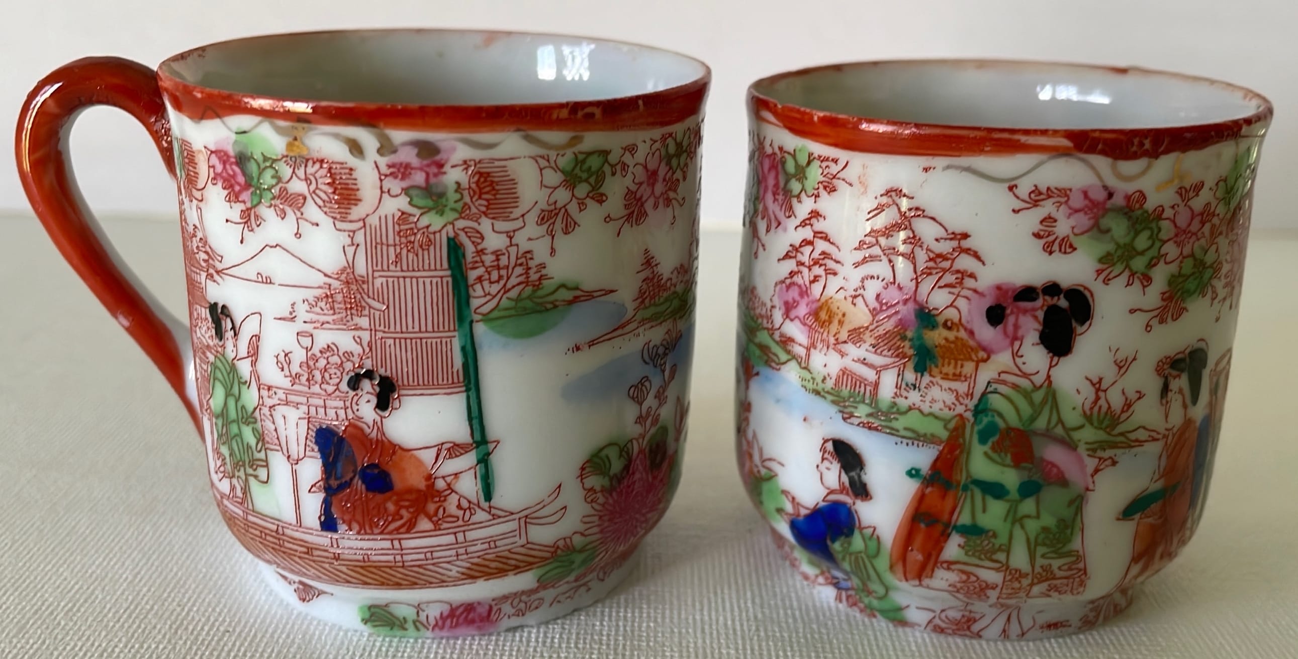 6 Vintage 6 3/4”H lidded teapot with four 2 1/4”H cups and four 4 1/2”Dia. saucers - all have imperfections in the paint or glaze - Japanese, with scenes of geishas by the water enjoying fish and water lillies - all have imperfections in the paint or glaze - cups and saucers have a few small chips