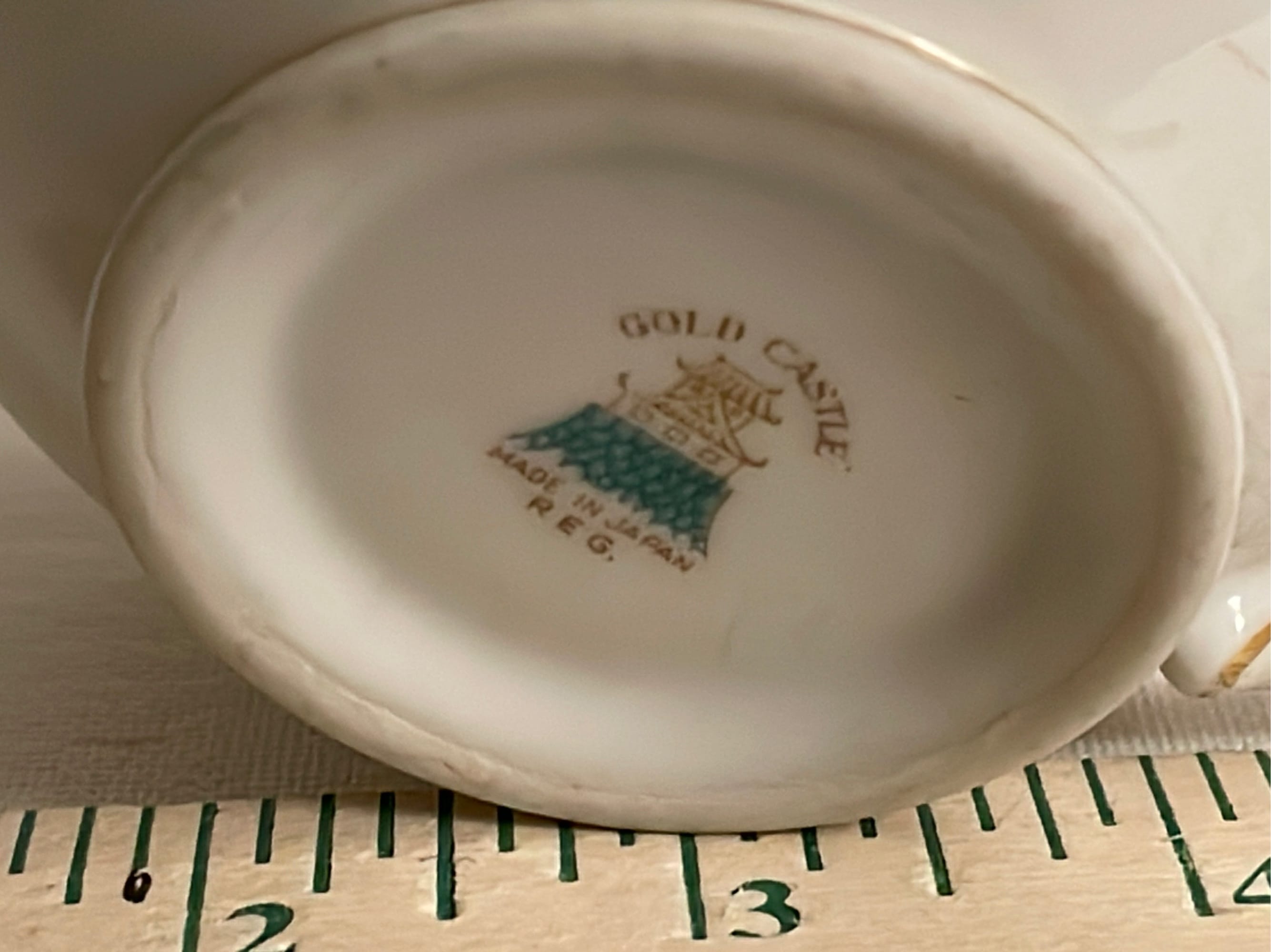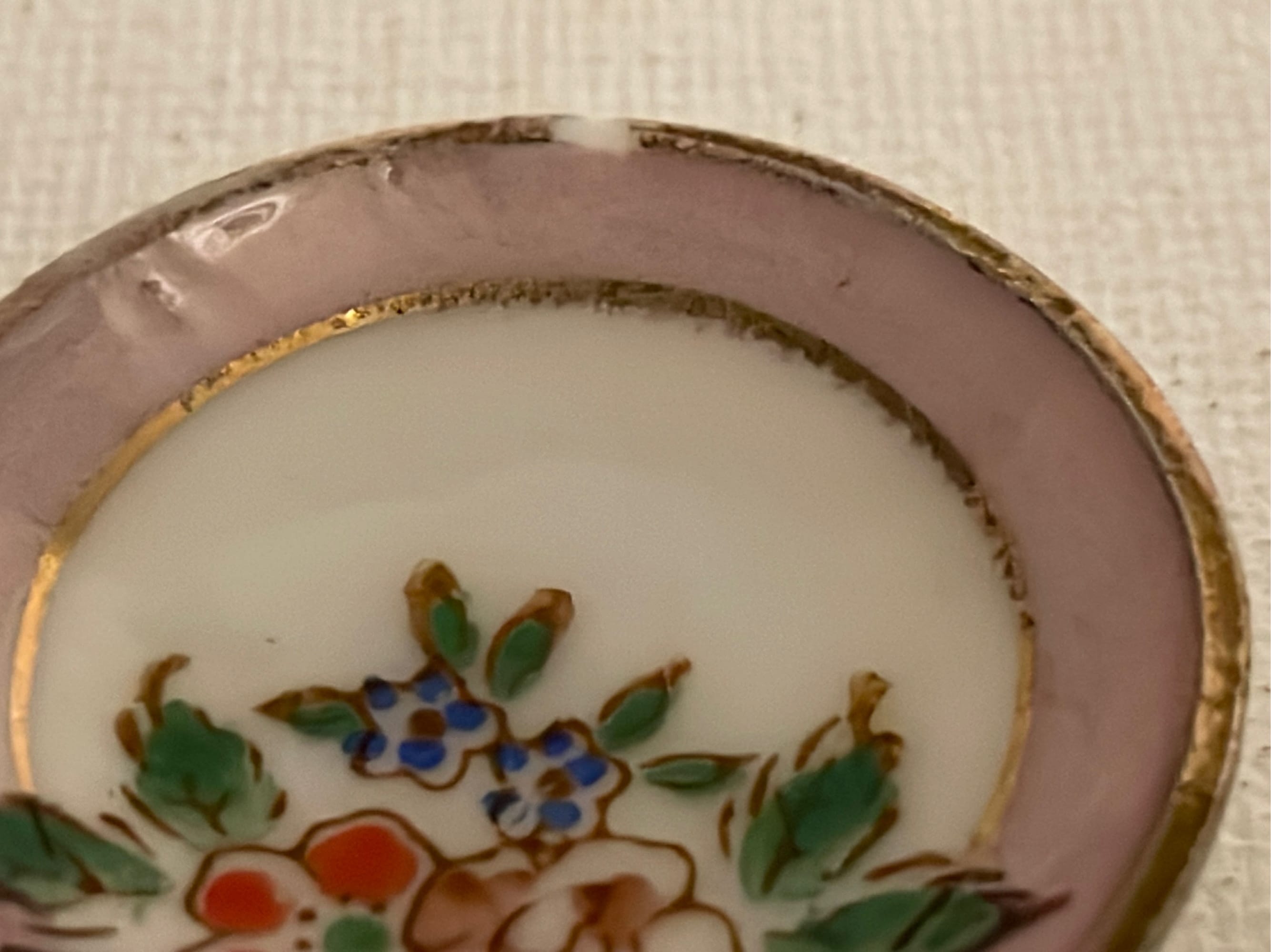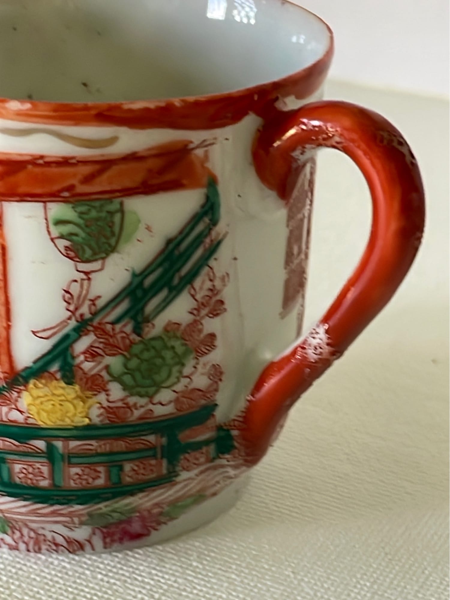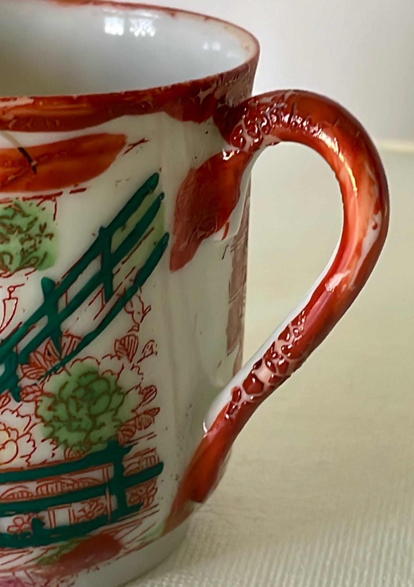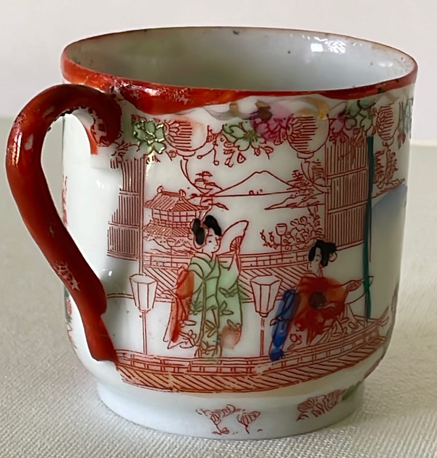 6 Vintage 6 3/4”H lidded teapot with four 2 1/4”H cups and four 4 1/2”Dia. saucers - all have imperfections in the paint or glaze - Japanese, with scenes of geishas by the water enjoying fish and water lillies - all have imperfections in the paint or glaze - cups and saucers have a few small chips