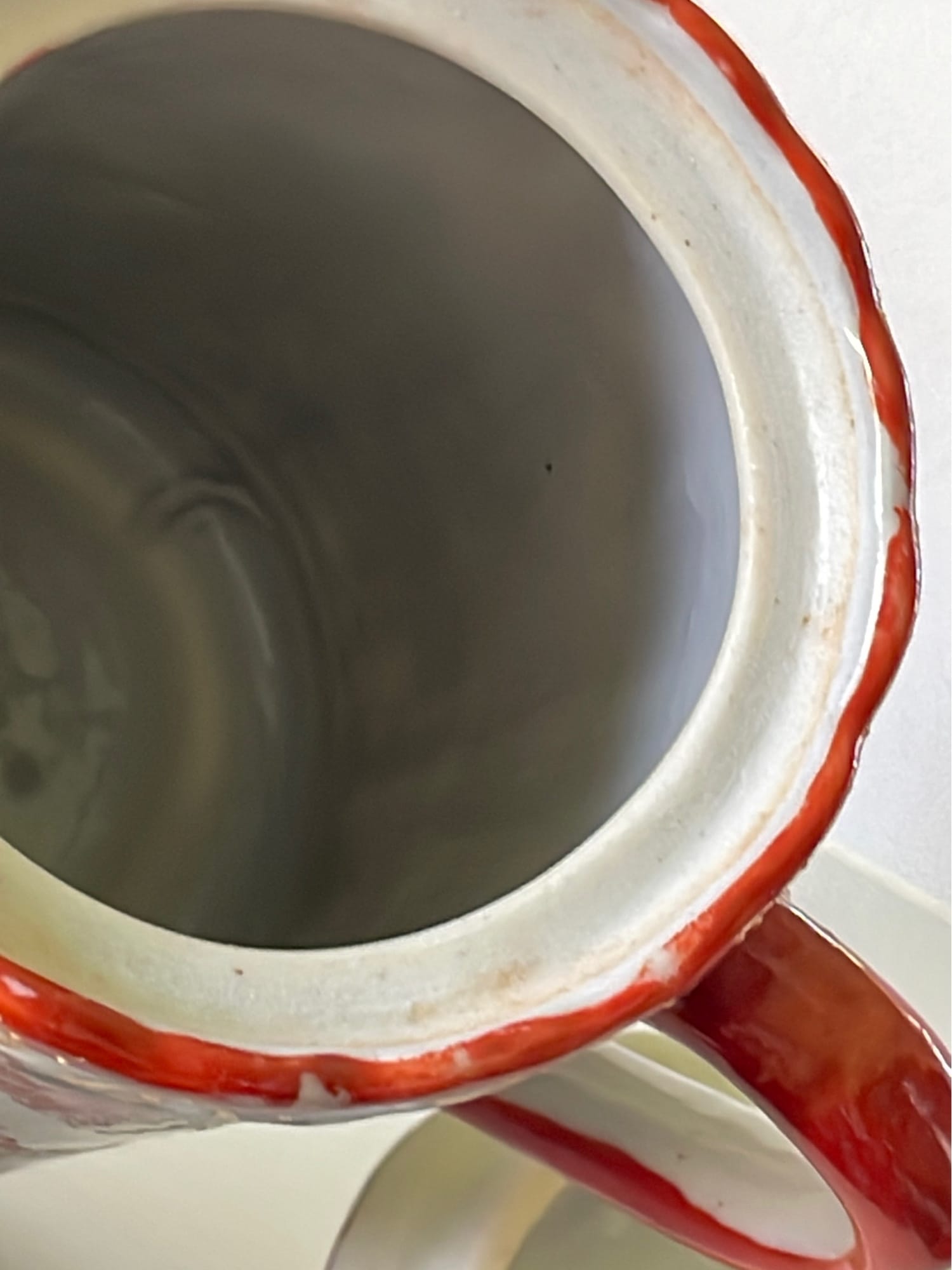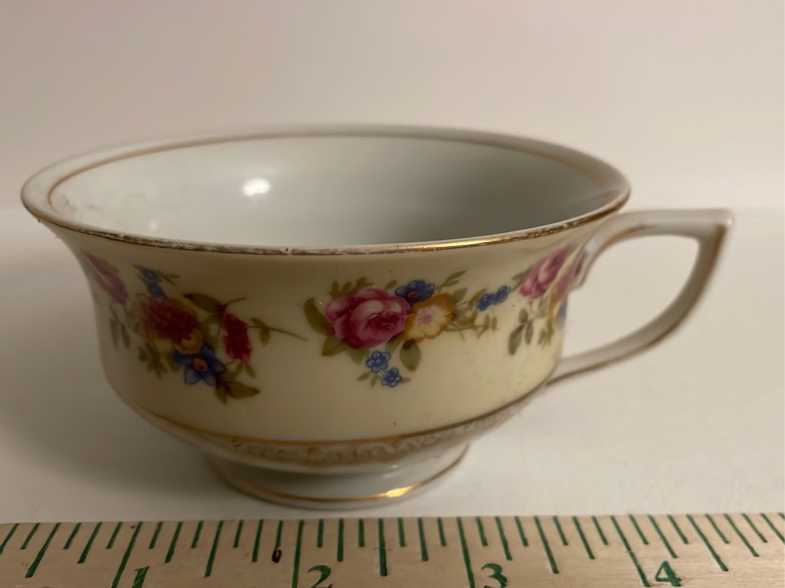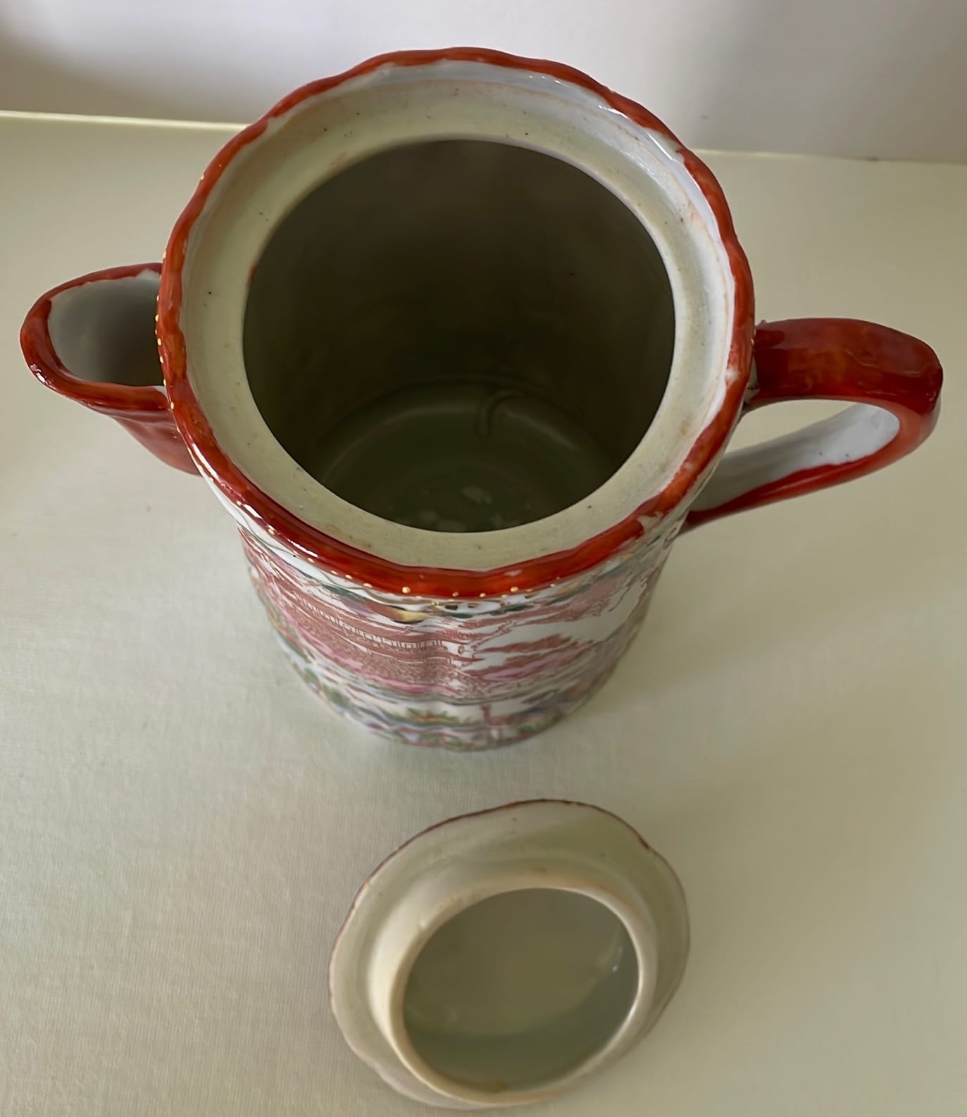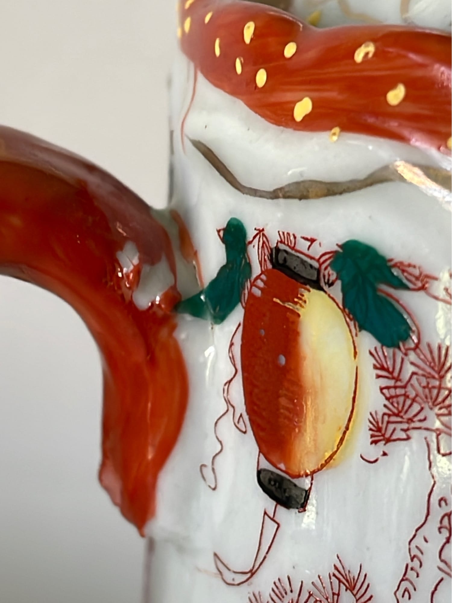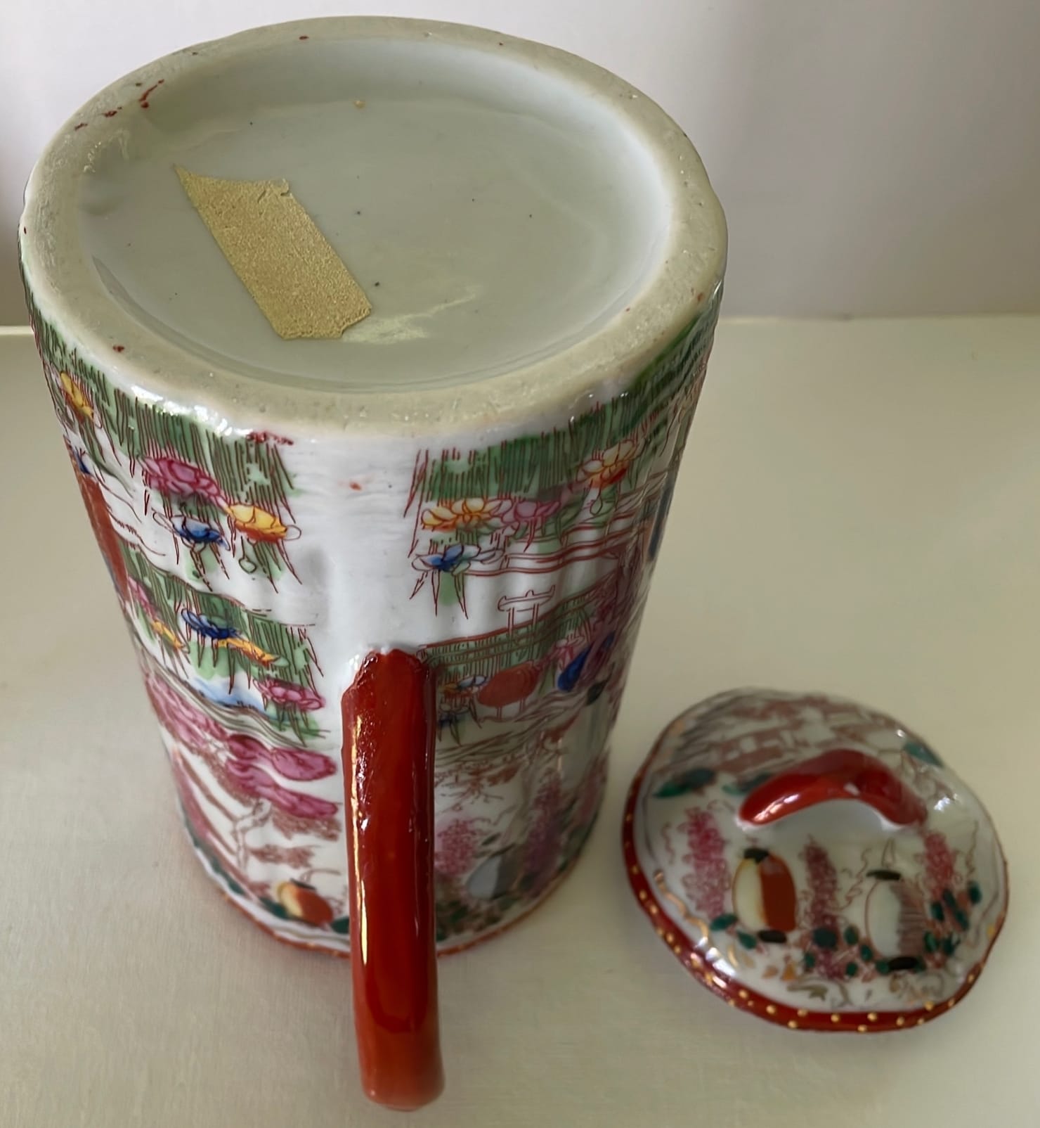 6 Vintage 6 3/4”H lidded teapot with four 2 1/4”H cups and four 4 1/2”Dia. saucers - all have imperfections in the paint or glaze - Japanese, with scenes of geishas by the water enjoying fish and water lillies - all have imperfections in the paint or glaze - cups and saucers have a few small chips