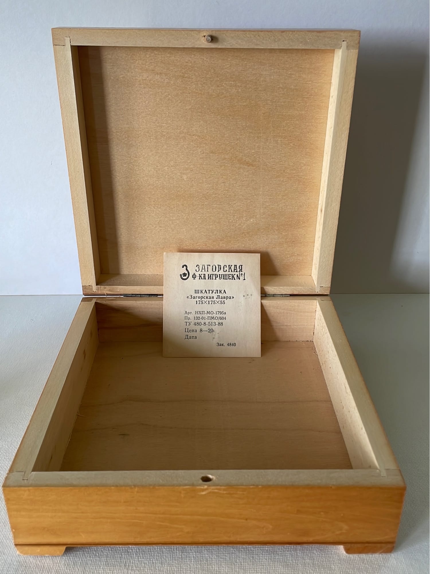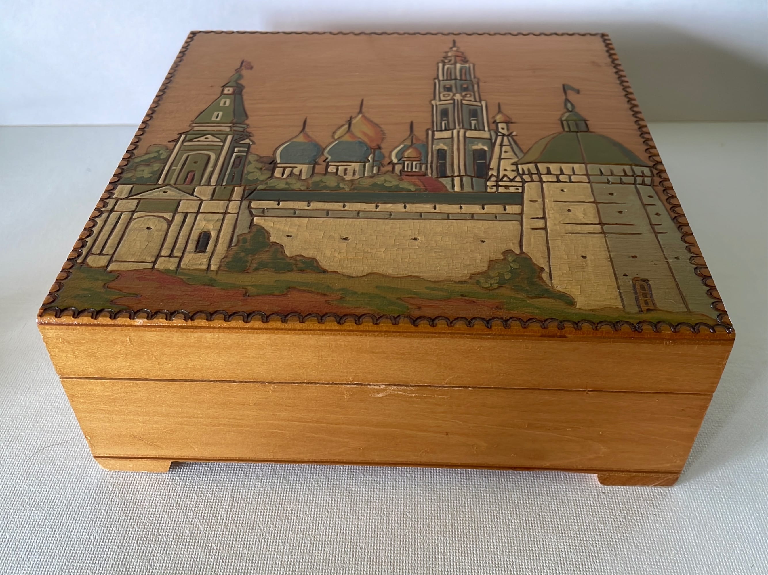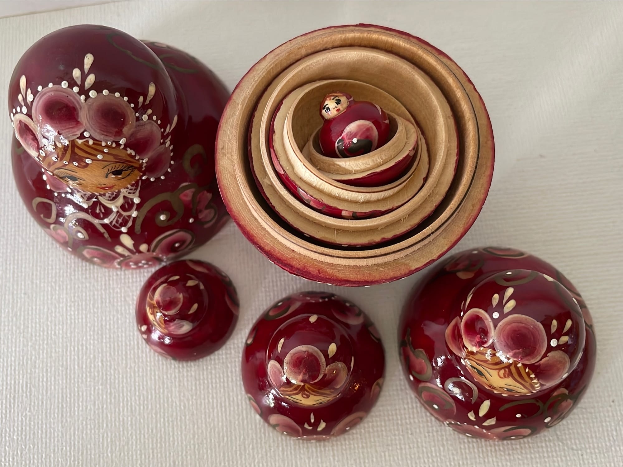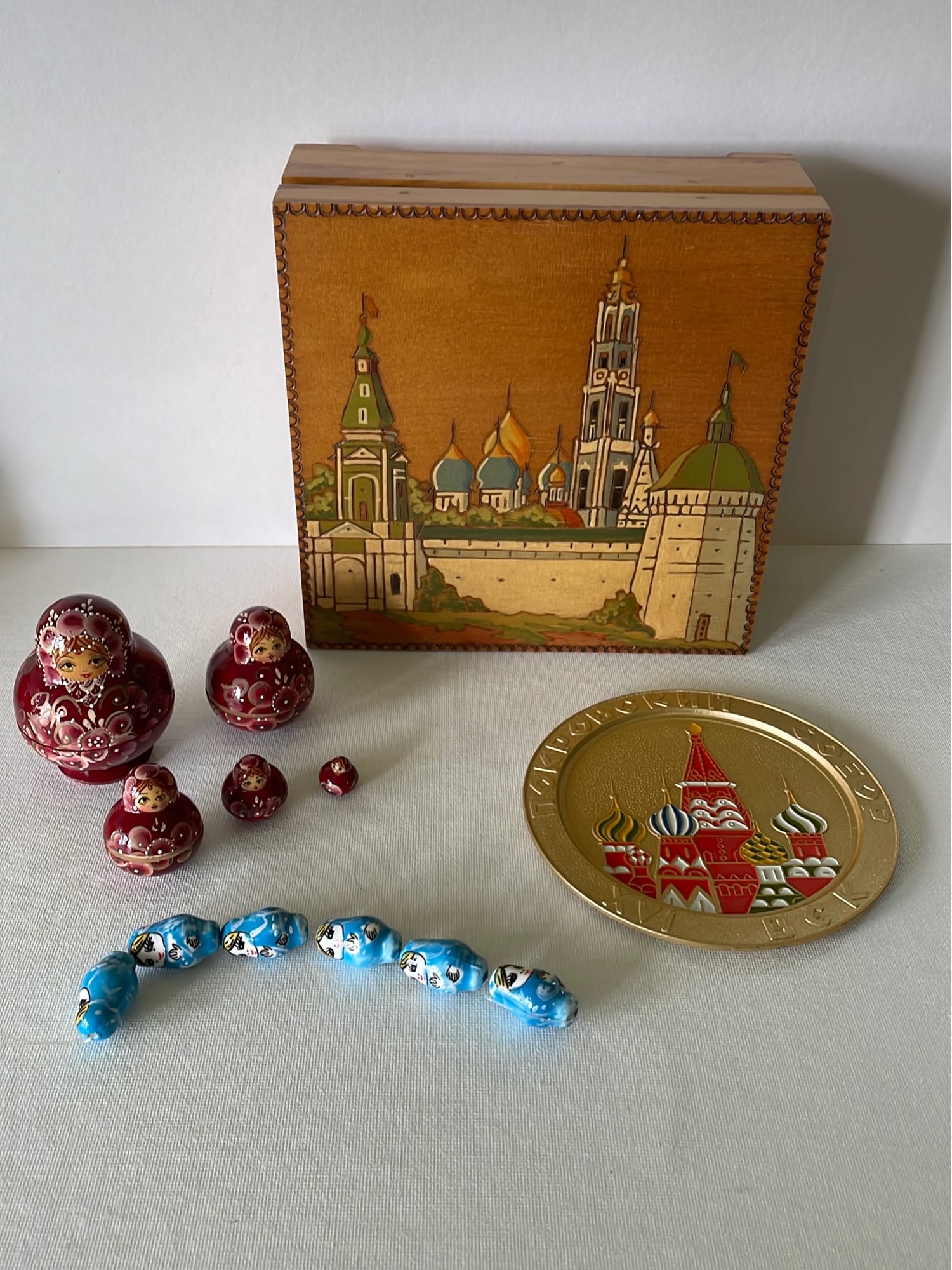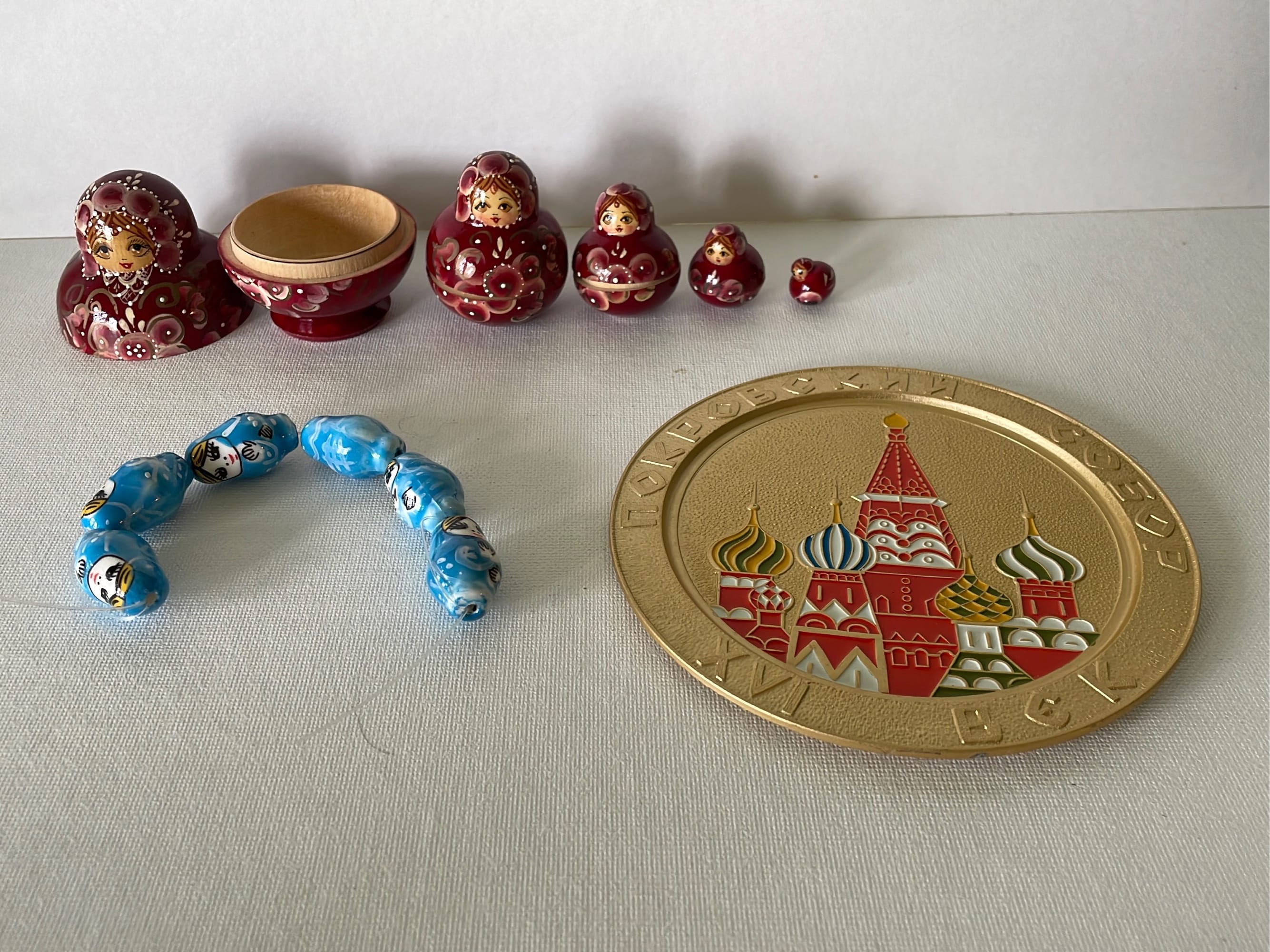 7 4 - Russian Collection: 1 Hinged Box 6 7/8” Square, Nesting Dolls ( 2 1/2“H to 1/4”H - signed by artist), Beads in the Form of Nesting Dolls (approx, 7/8”L - origin unknown), Decorative Tray 4 3/4” Dia.