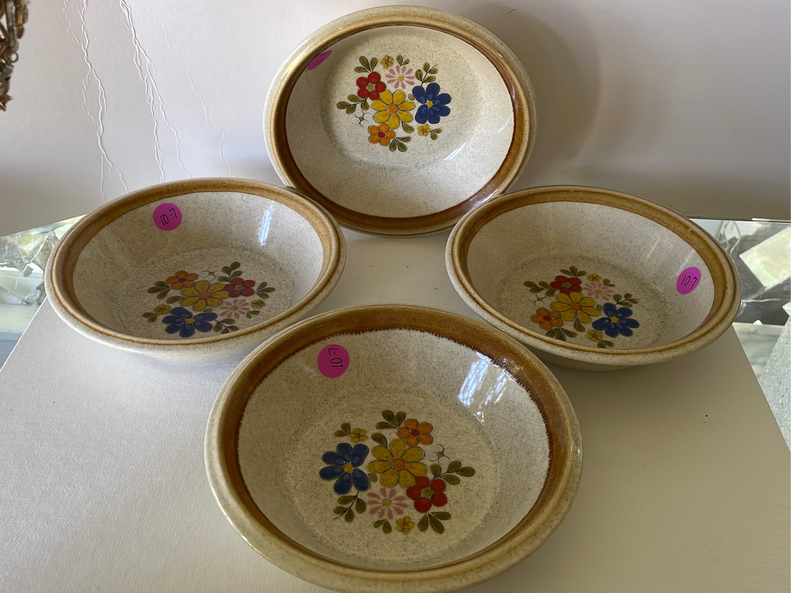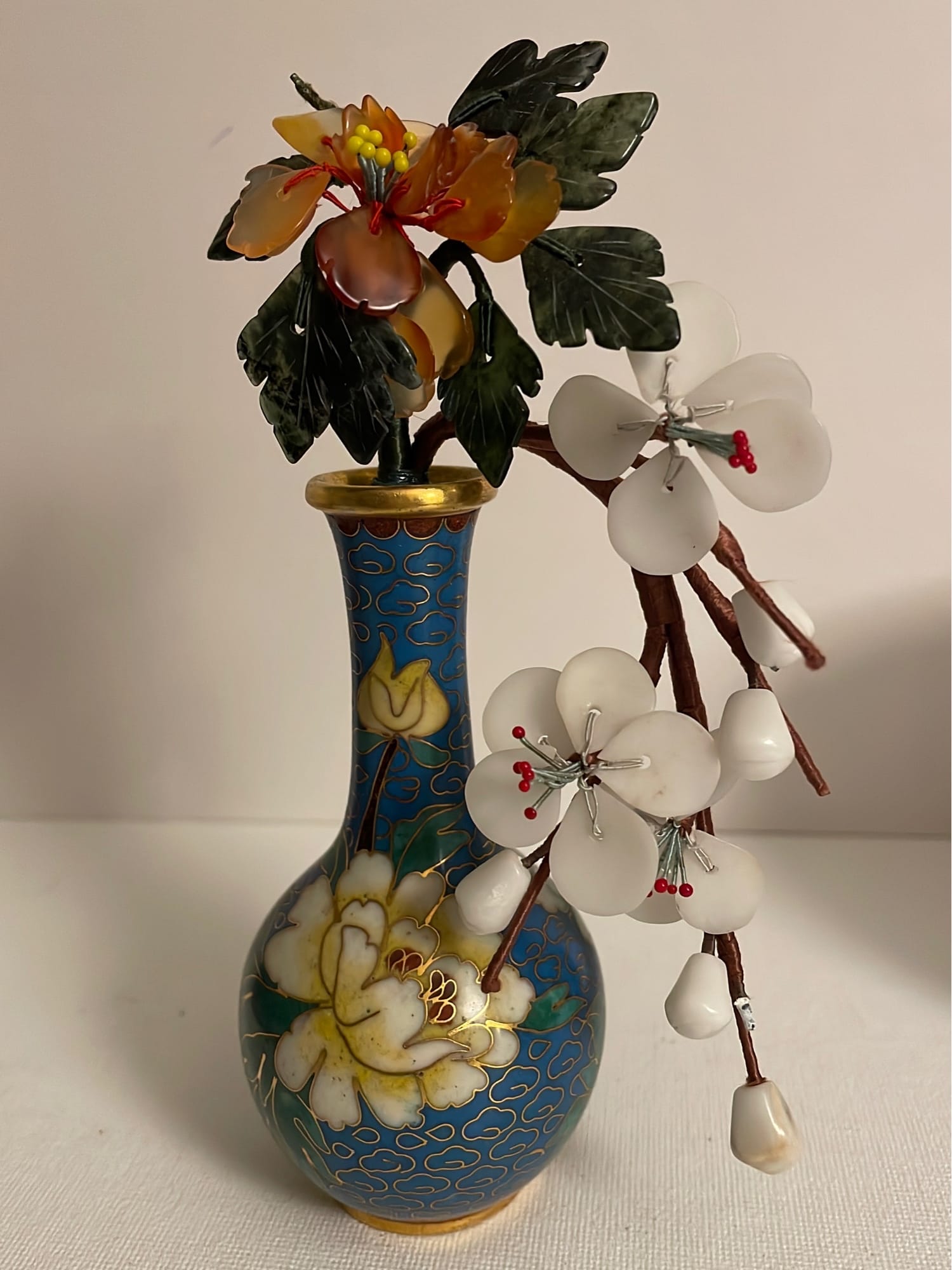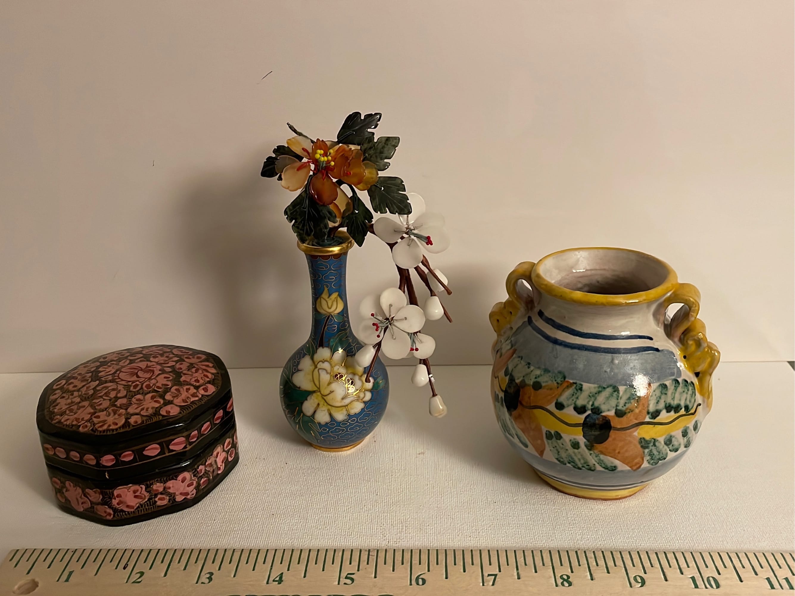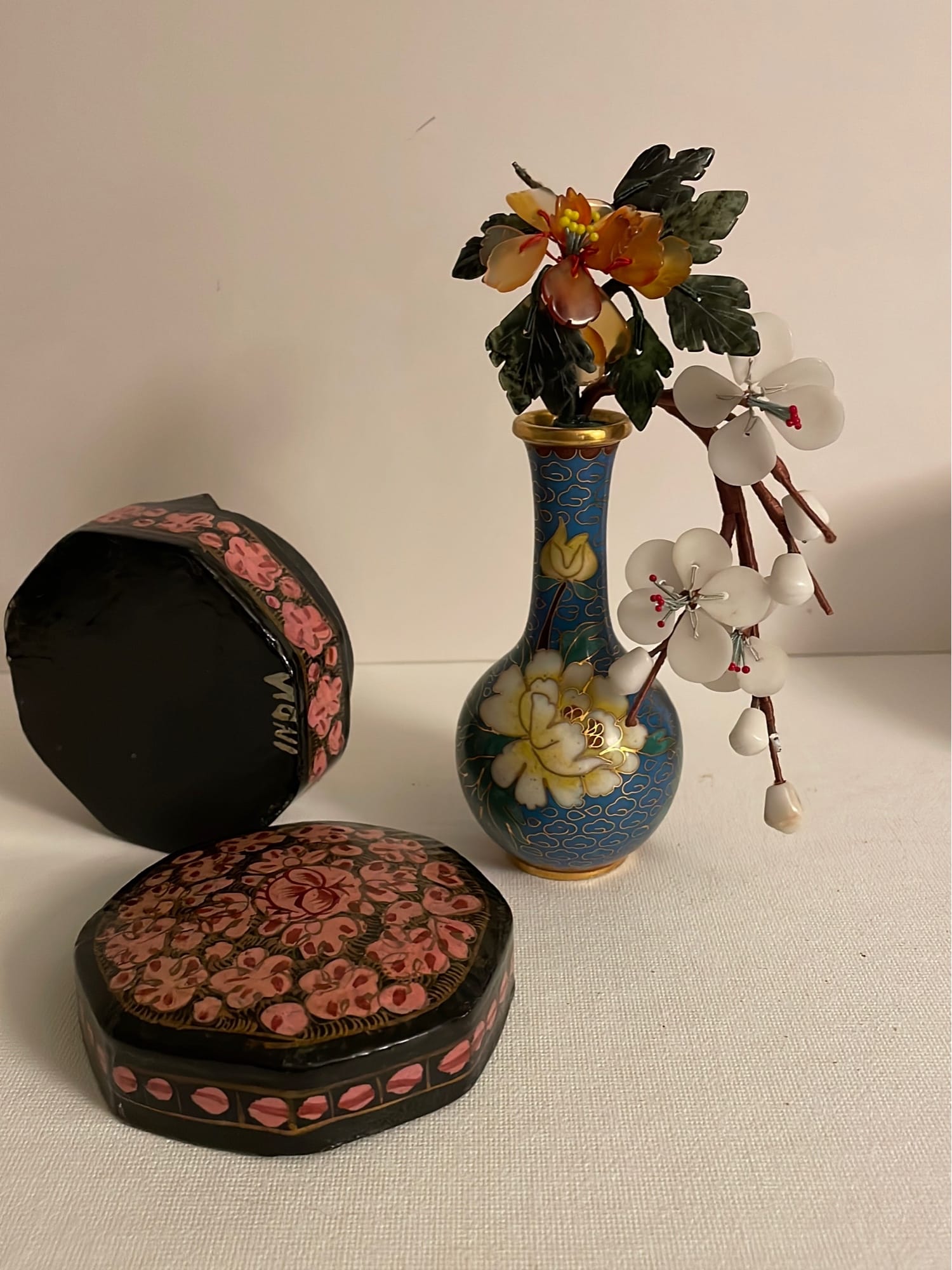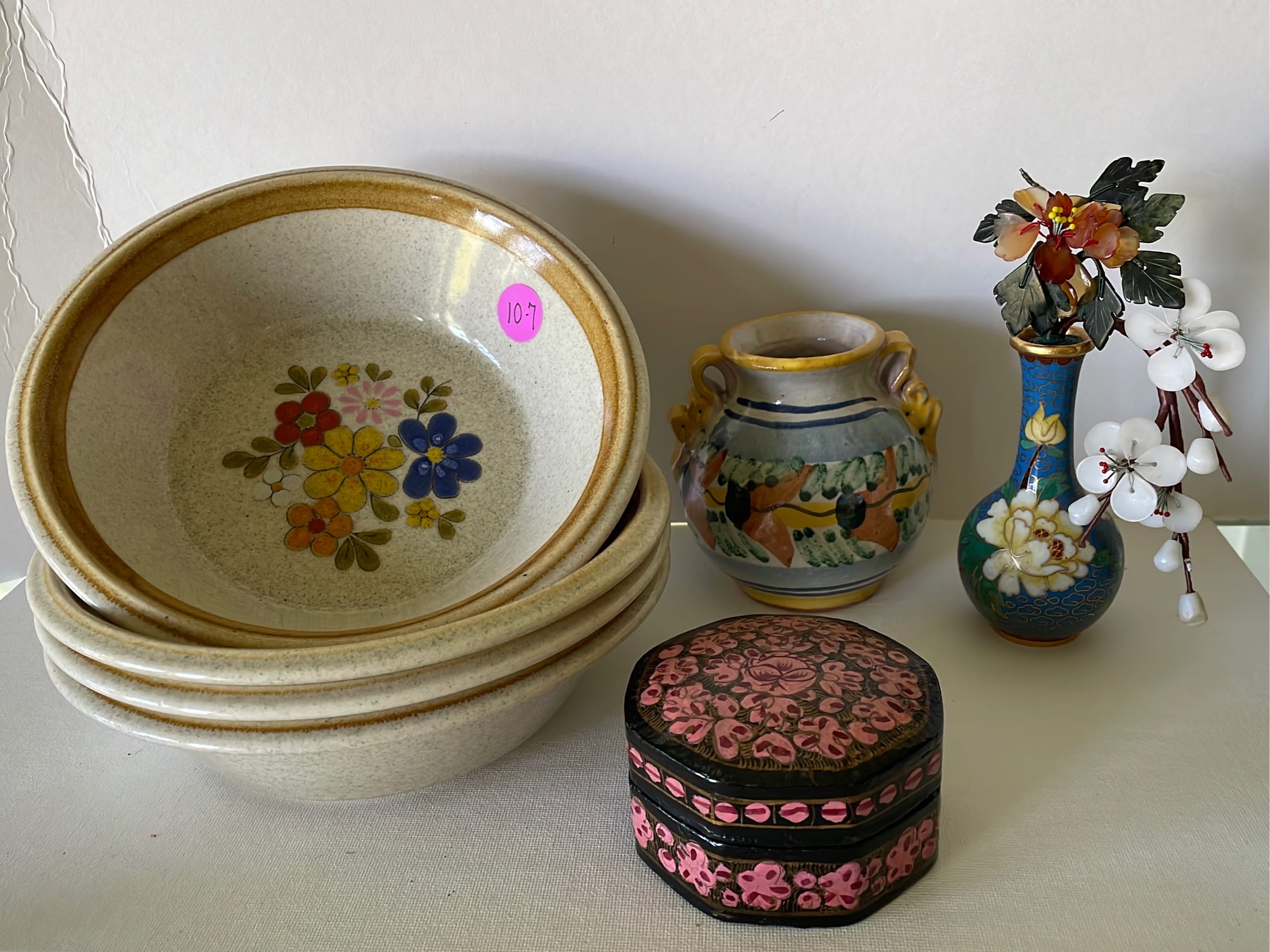 10 Mikasa Bowls and International Objects: Painted and Laquered Box (India, c. 1970’s), Ceramic Vase (South America), Cloisonné Vase With Shell and Stone Flowers (Asia)