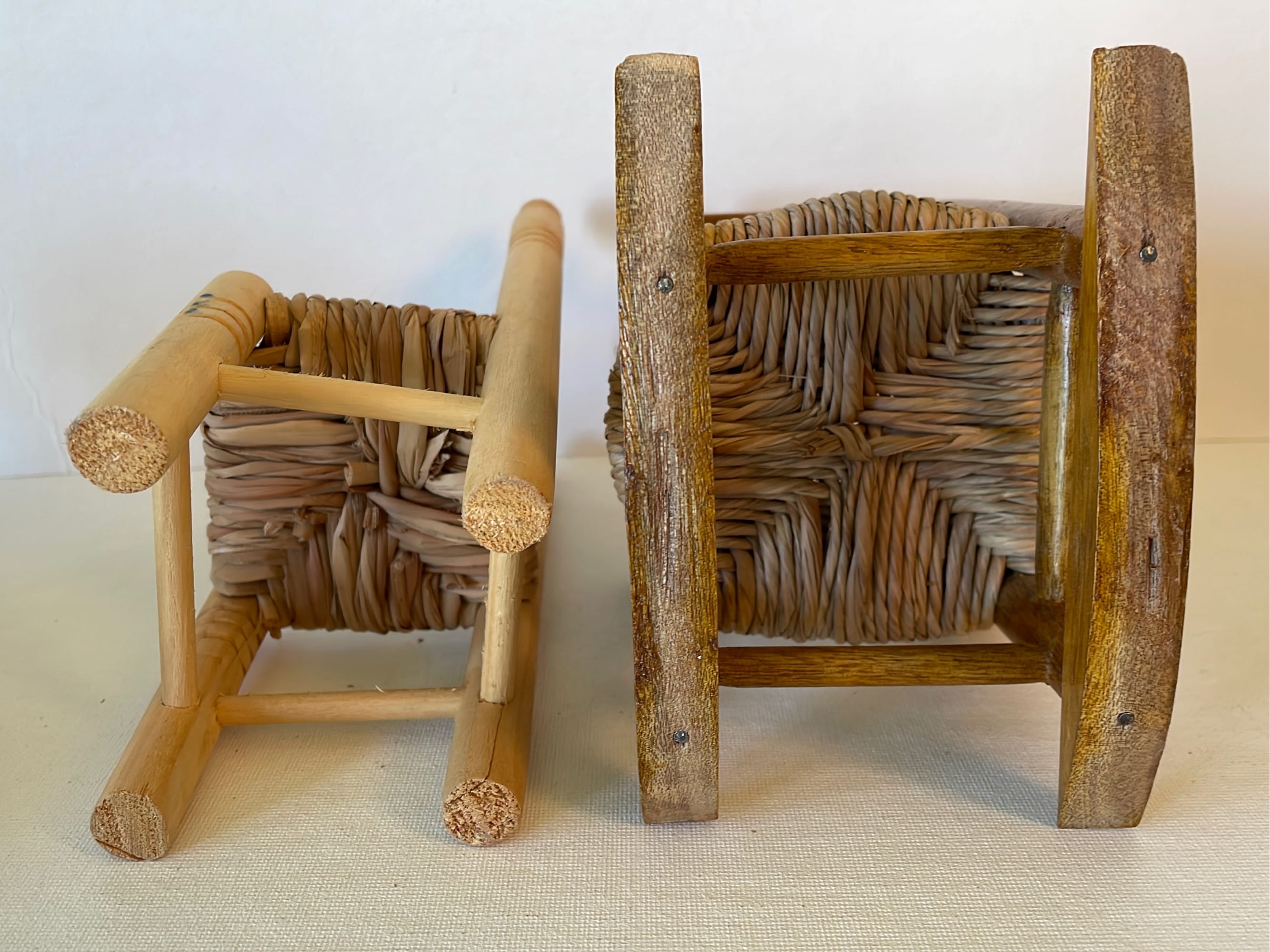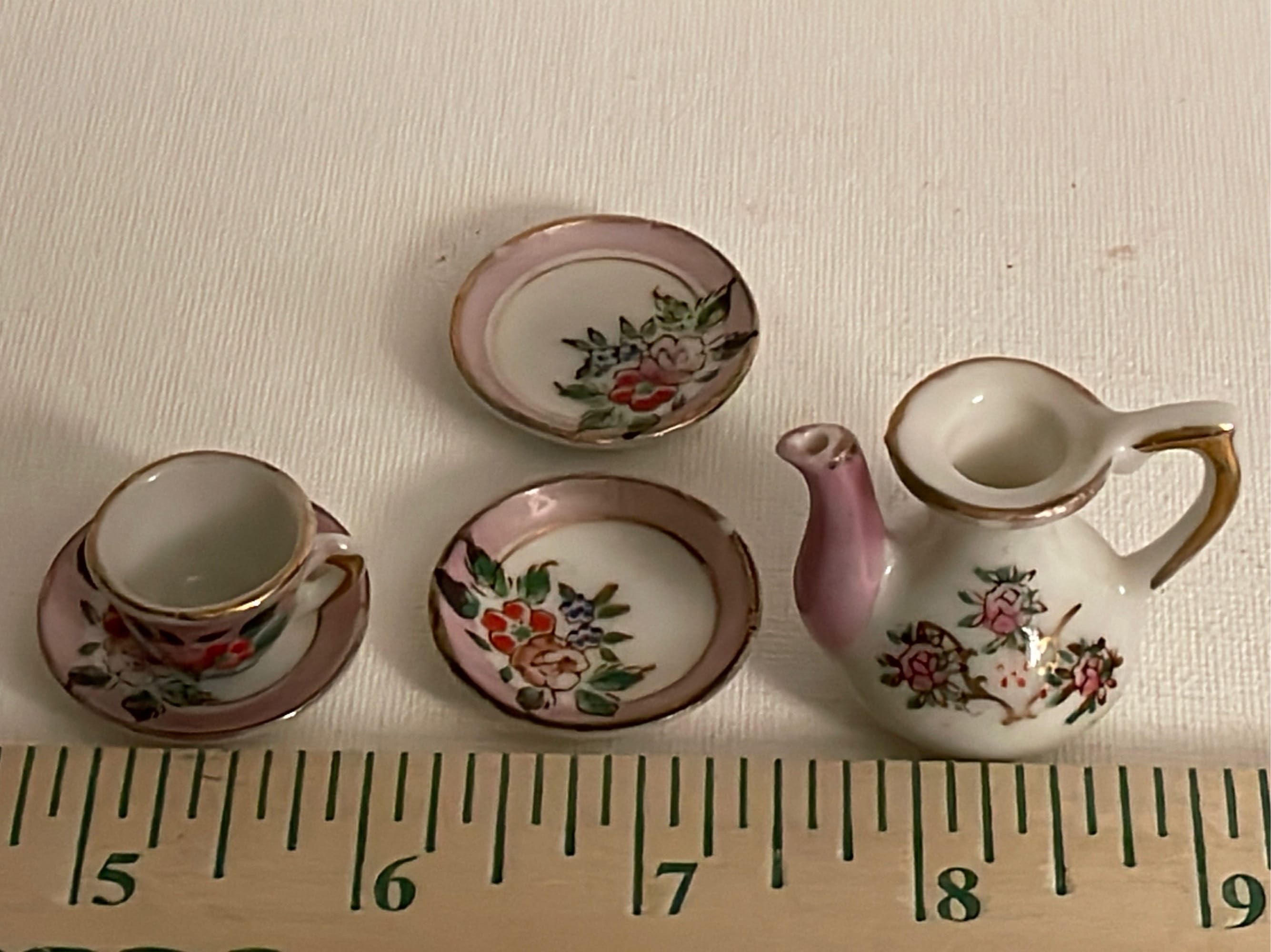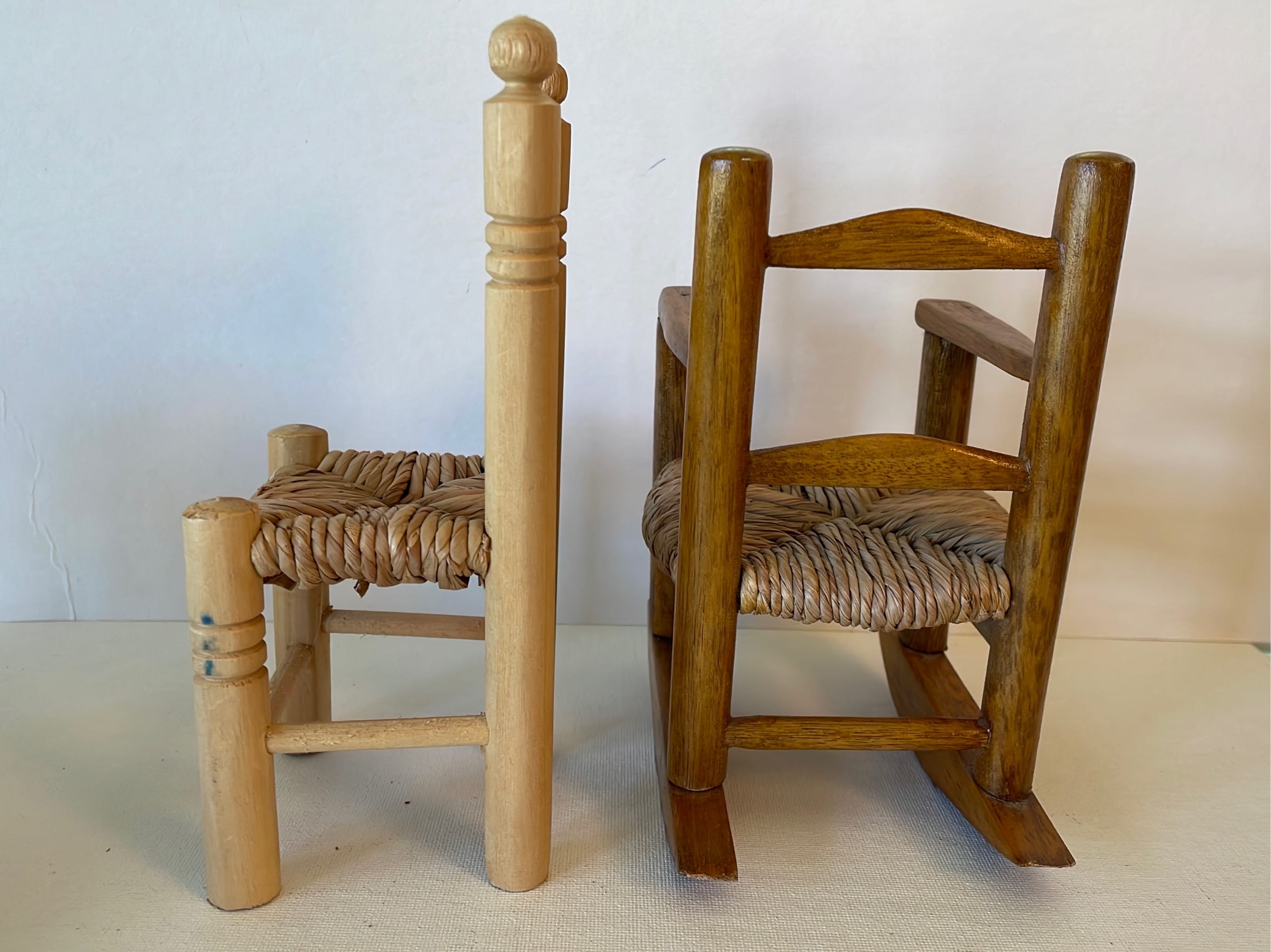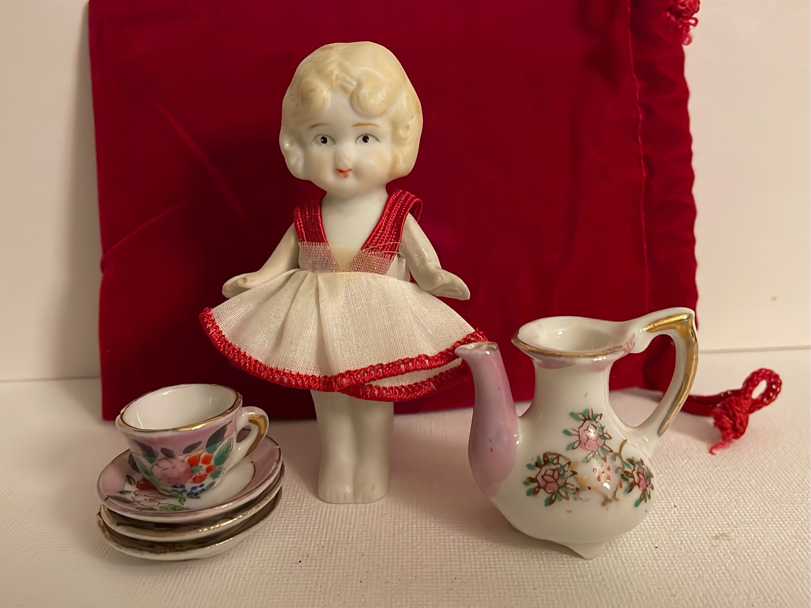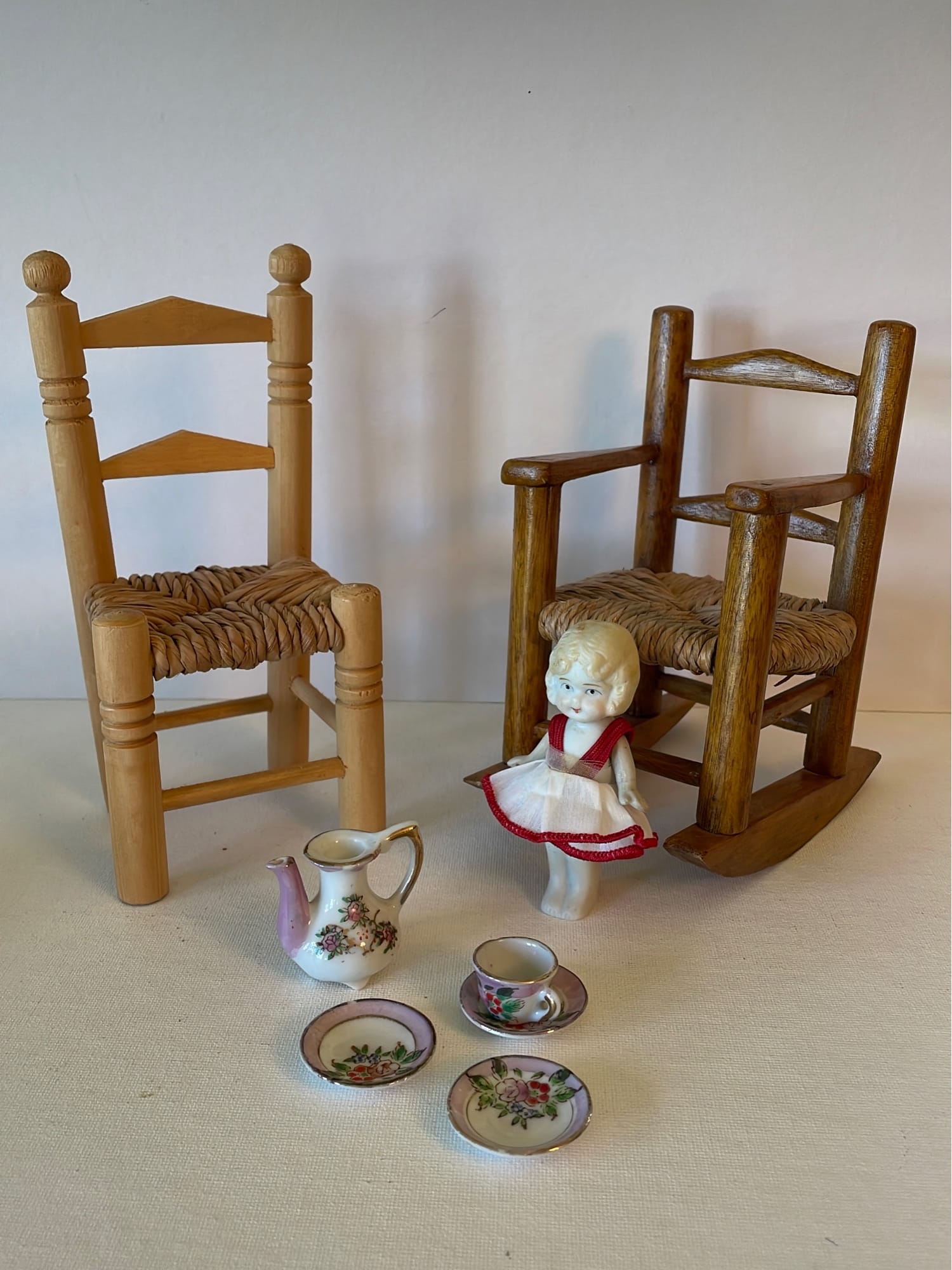 12 Vintage Bisque Doll 3 1/4”H and Doll China Tea Set Pieces (1 chipped), and Wicker Doll Furnitire 7 1/8”H and 6 3/8”H