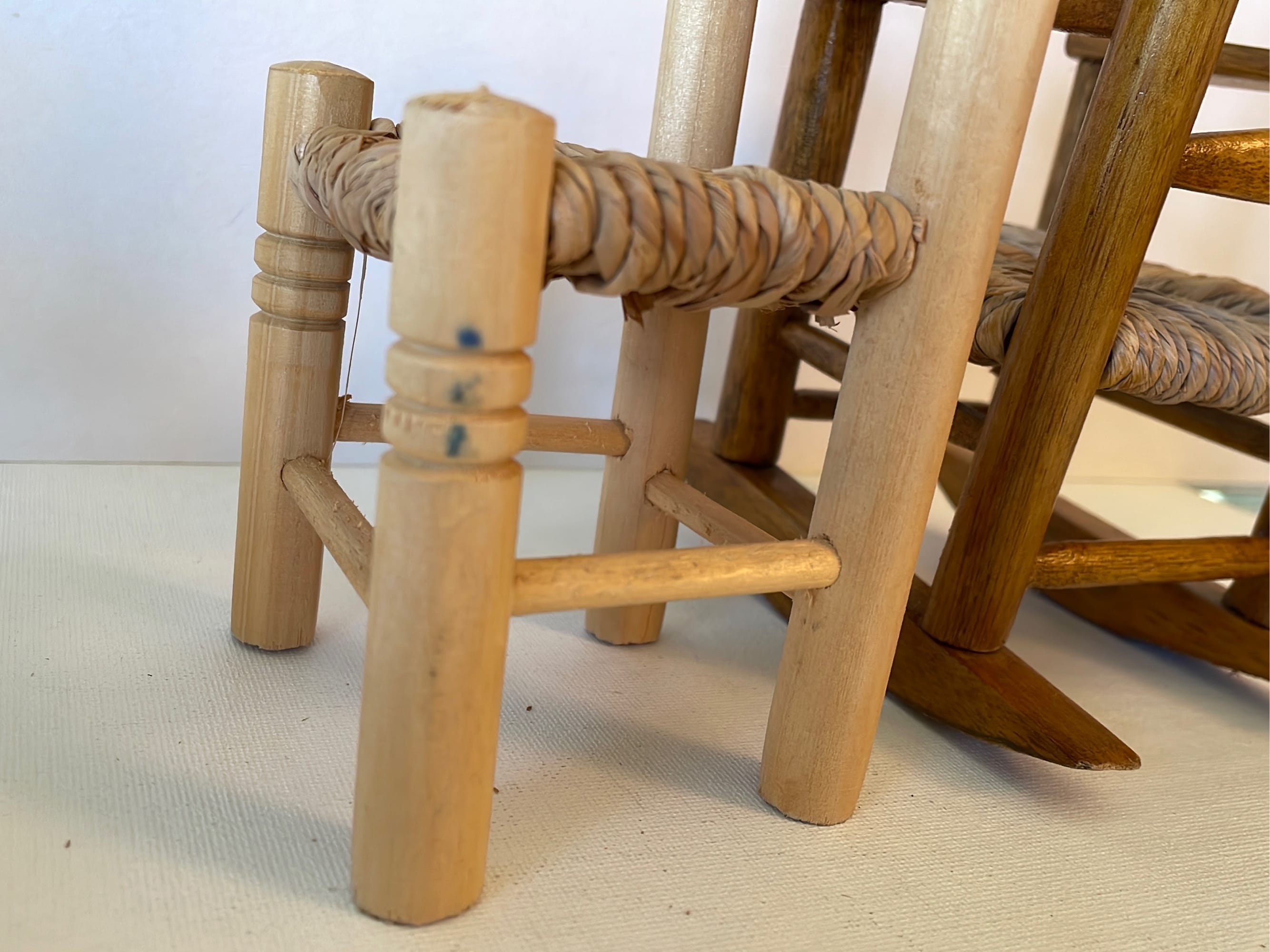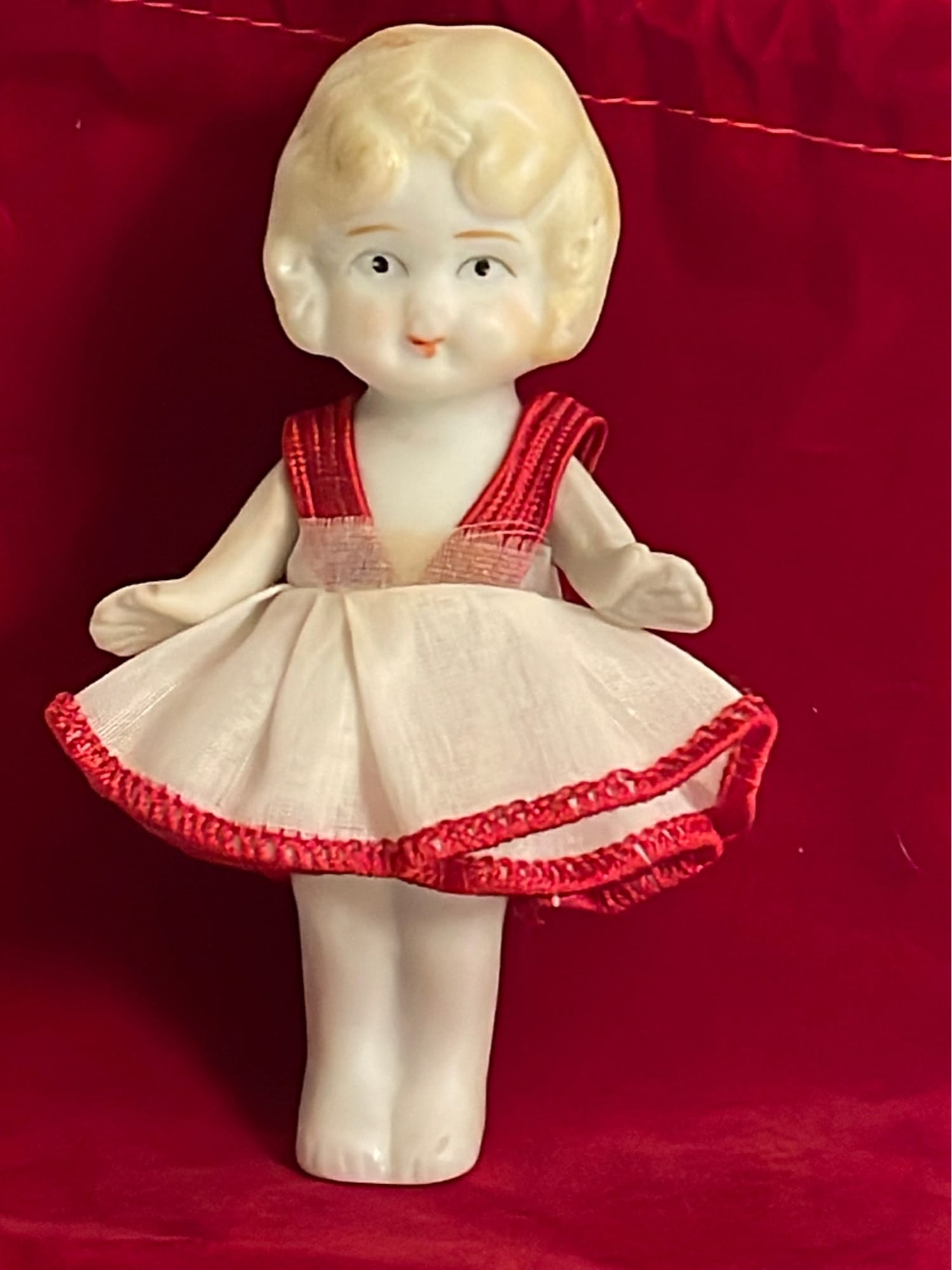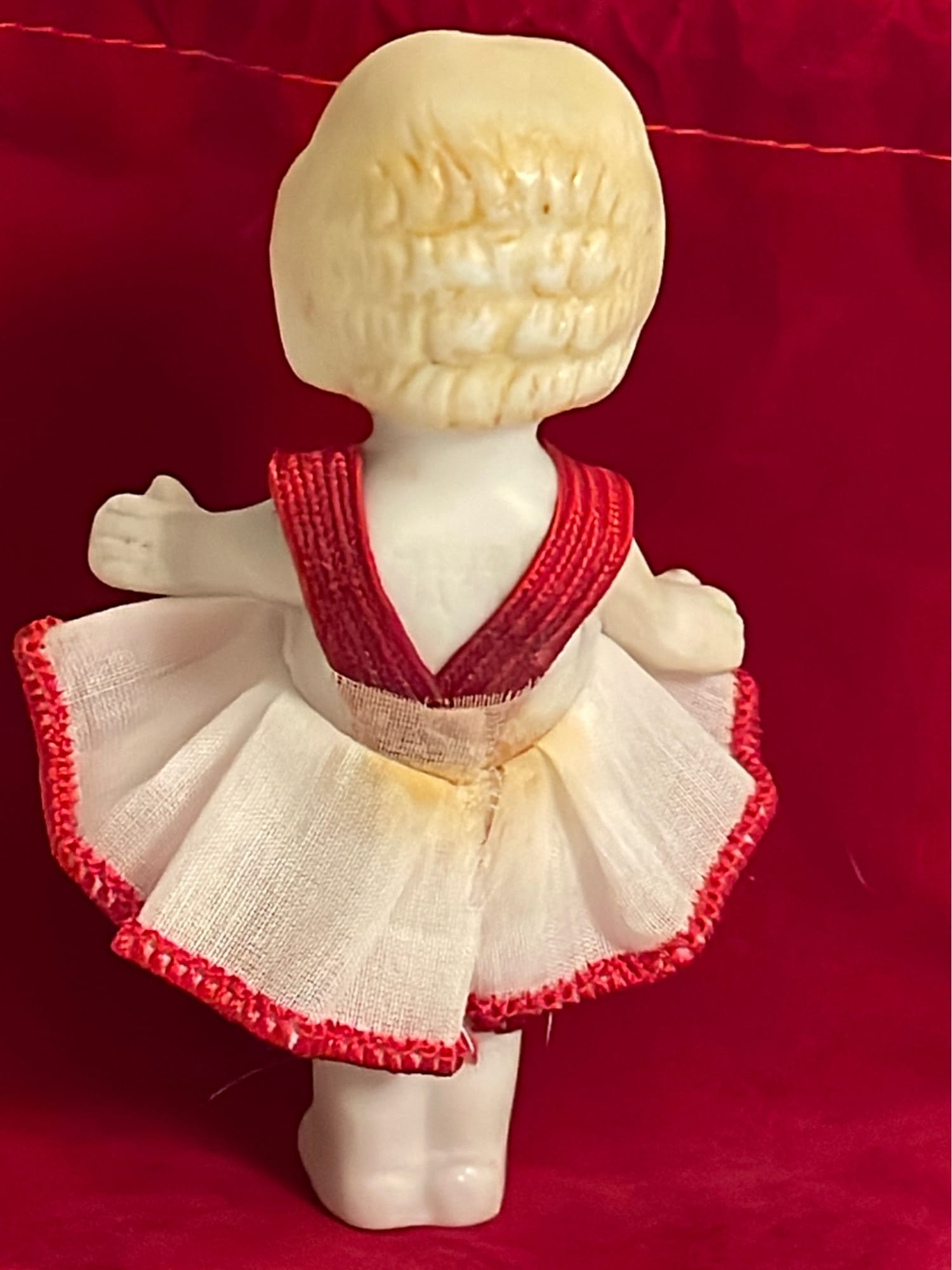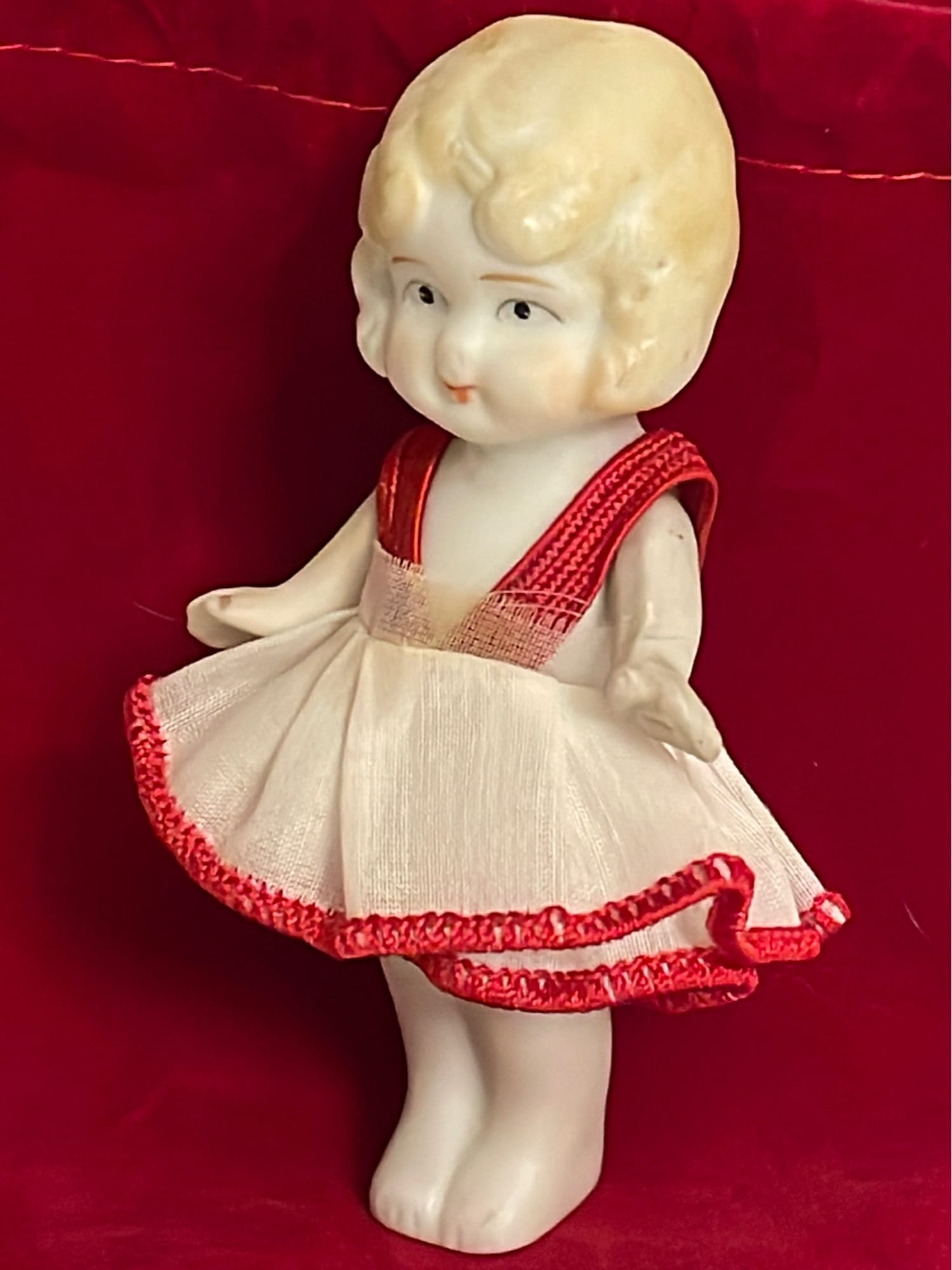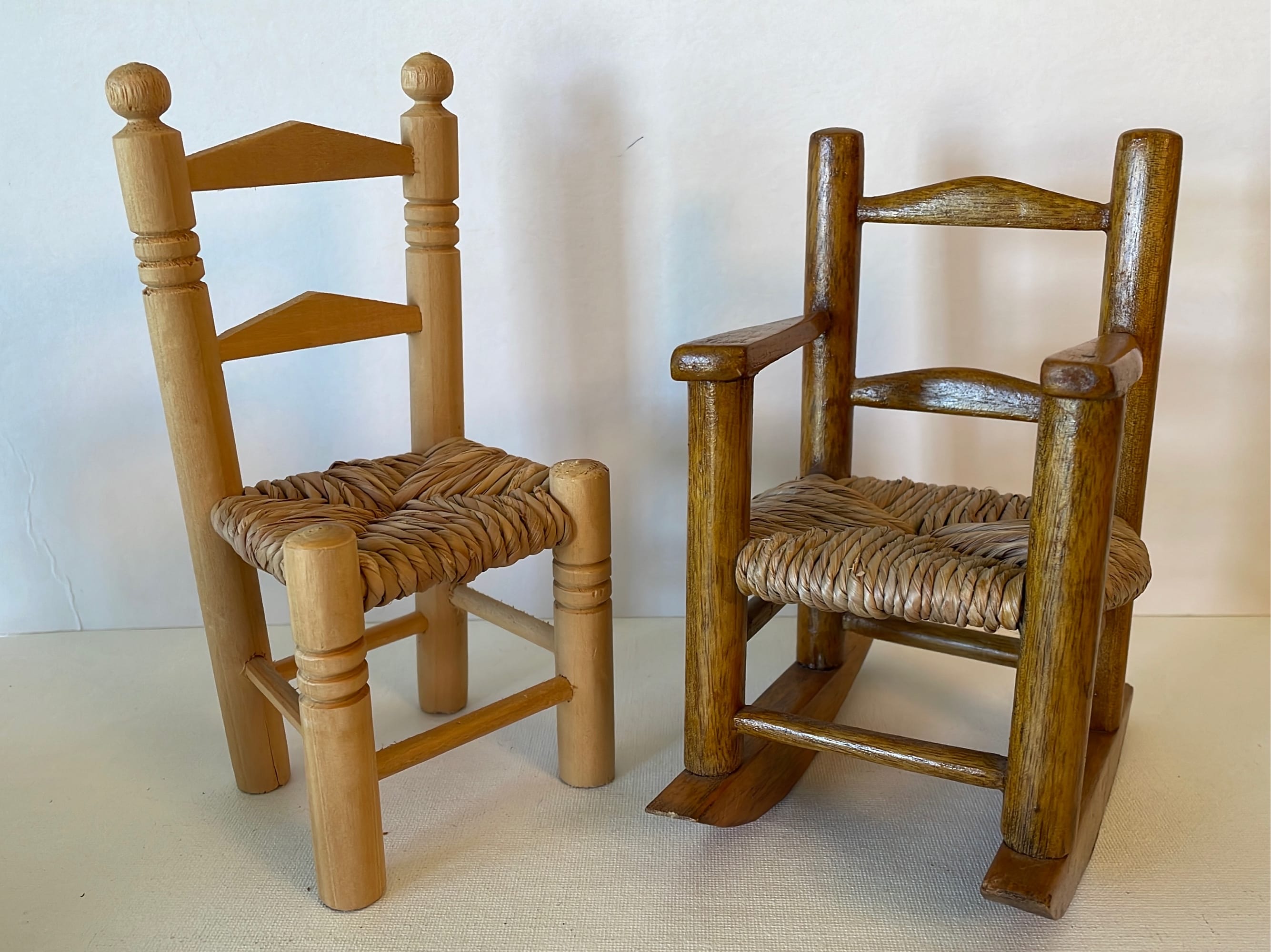 12 Vintage Bisque Doll 3 1/4”H and Doll China Tea Set Pieces (1 chipped), and Wicker Doll Furnitire 7 1/8”H and 6 3/8”H