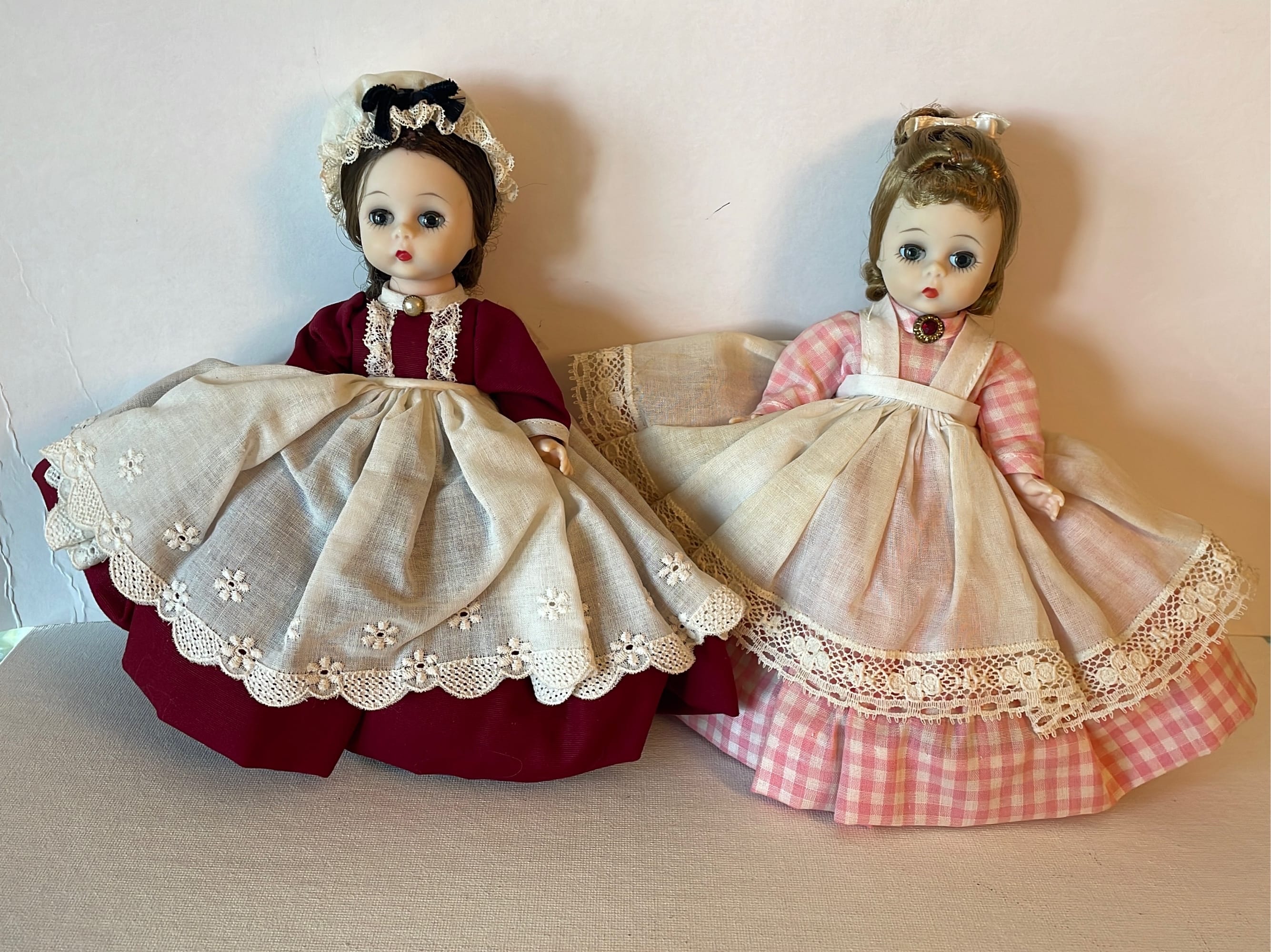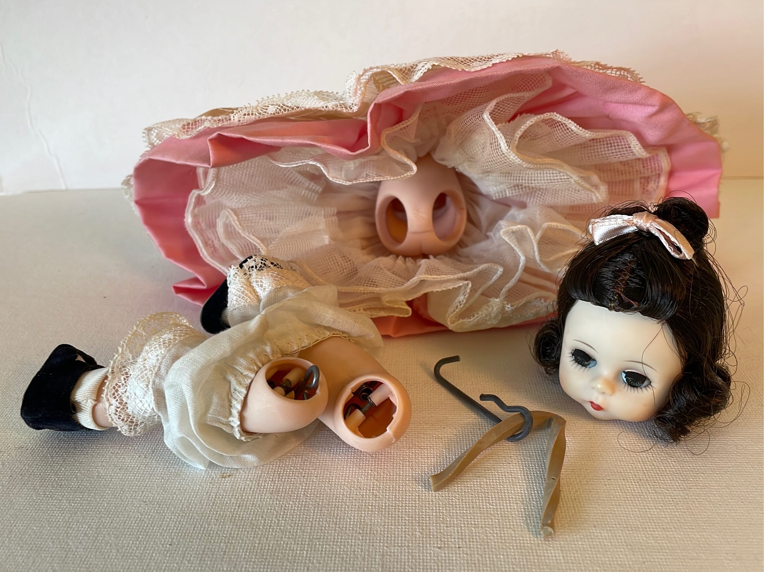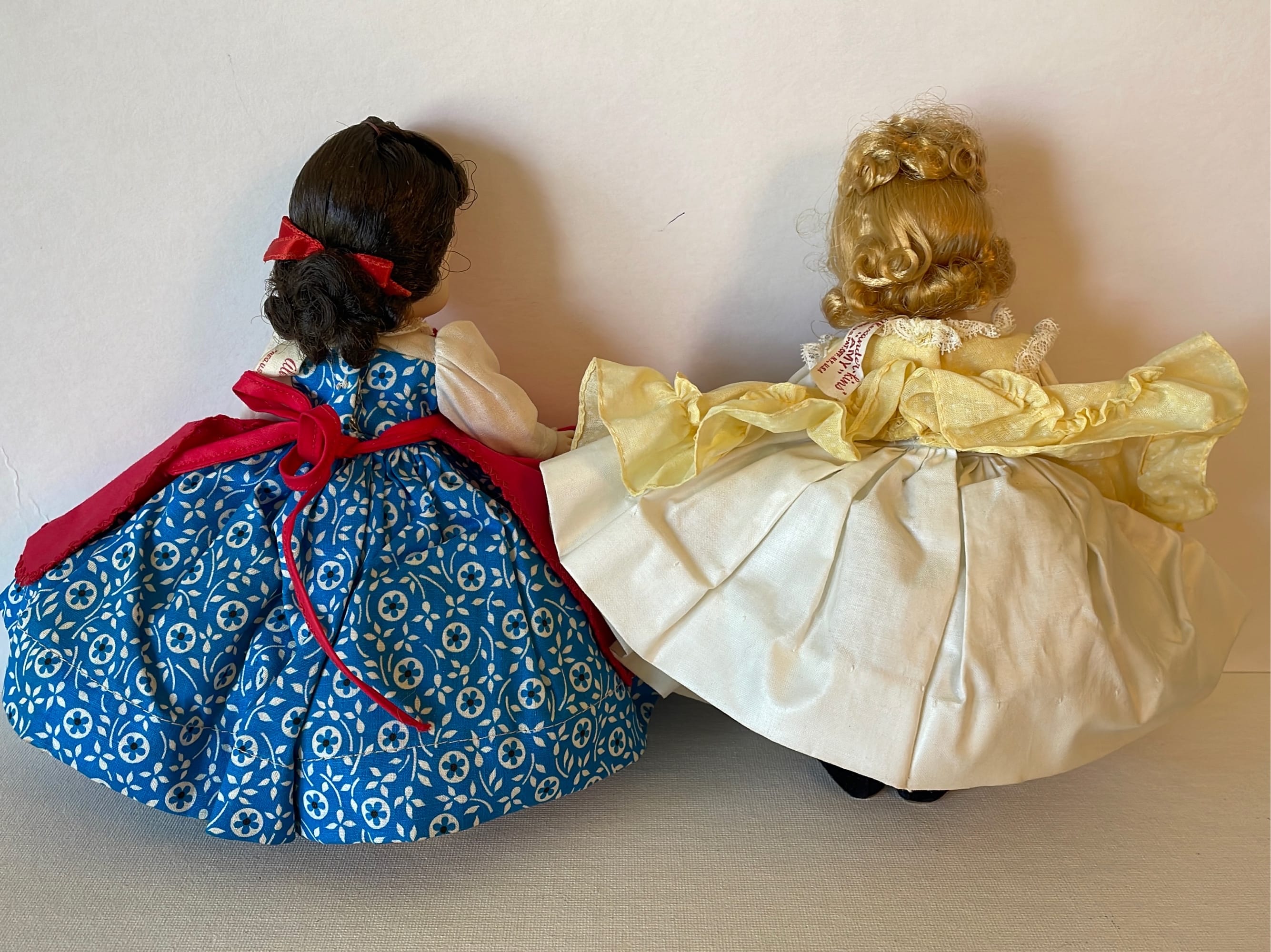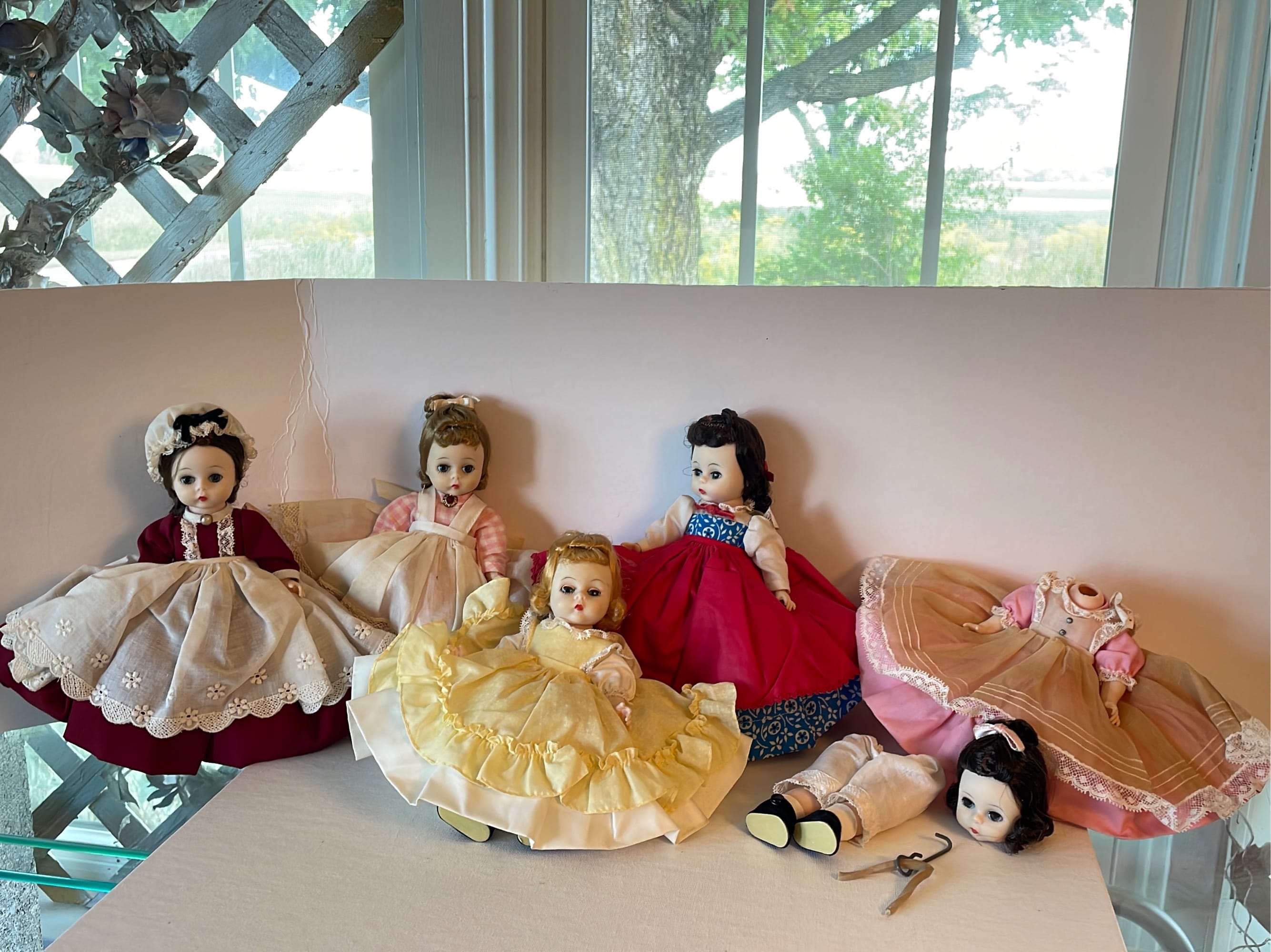 12A 5 Vintage Madame Alexander Little Women dolls from the 1960s: Marme, Meg, Beth (not in good shape), Joe and Amy - all have fabric discoloration, and were purchased during the same era as Beth (whose rubber bands have dried and broken )