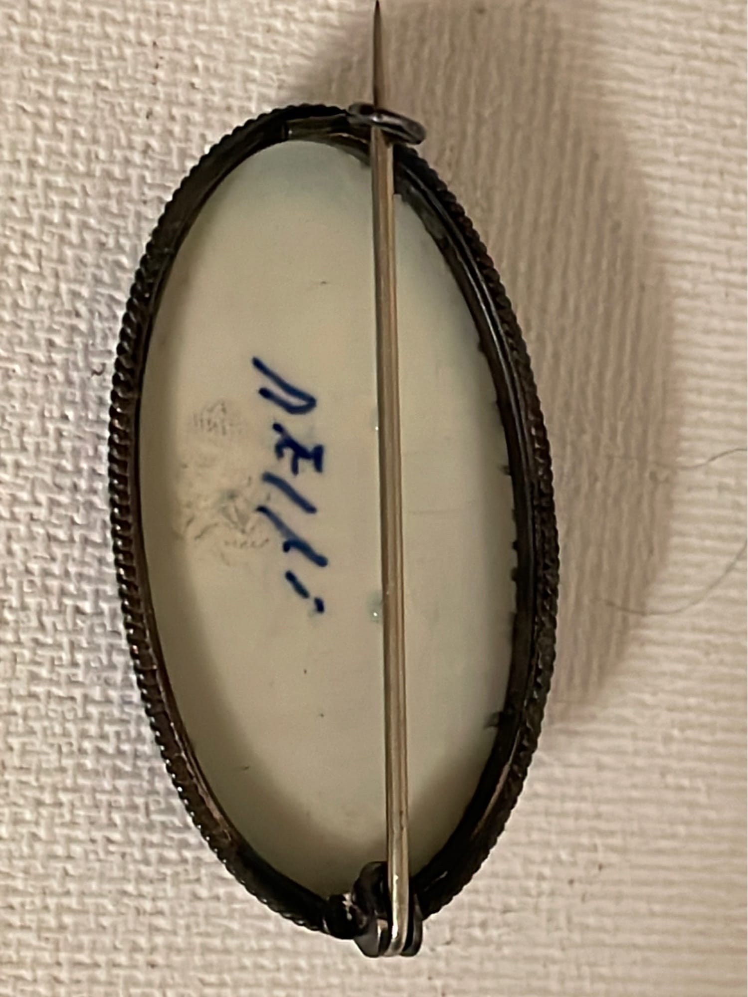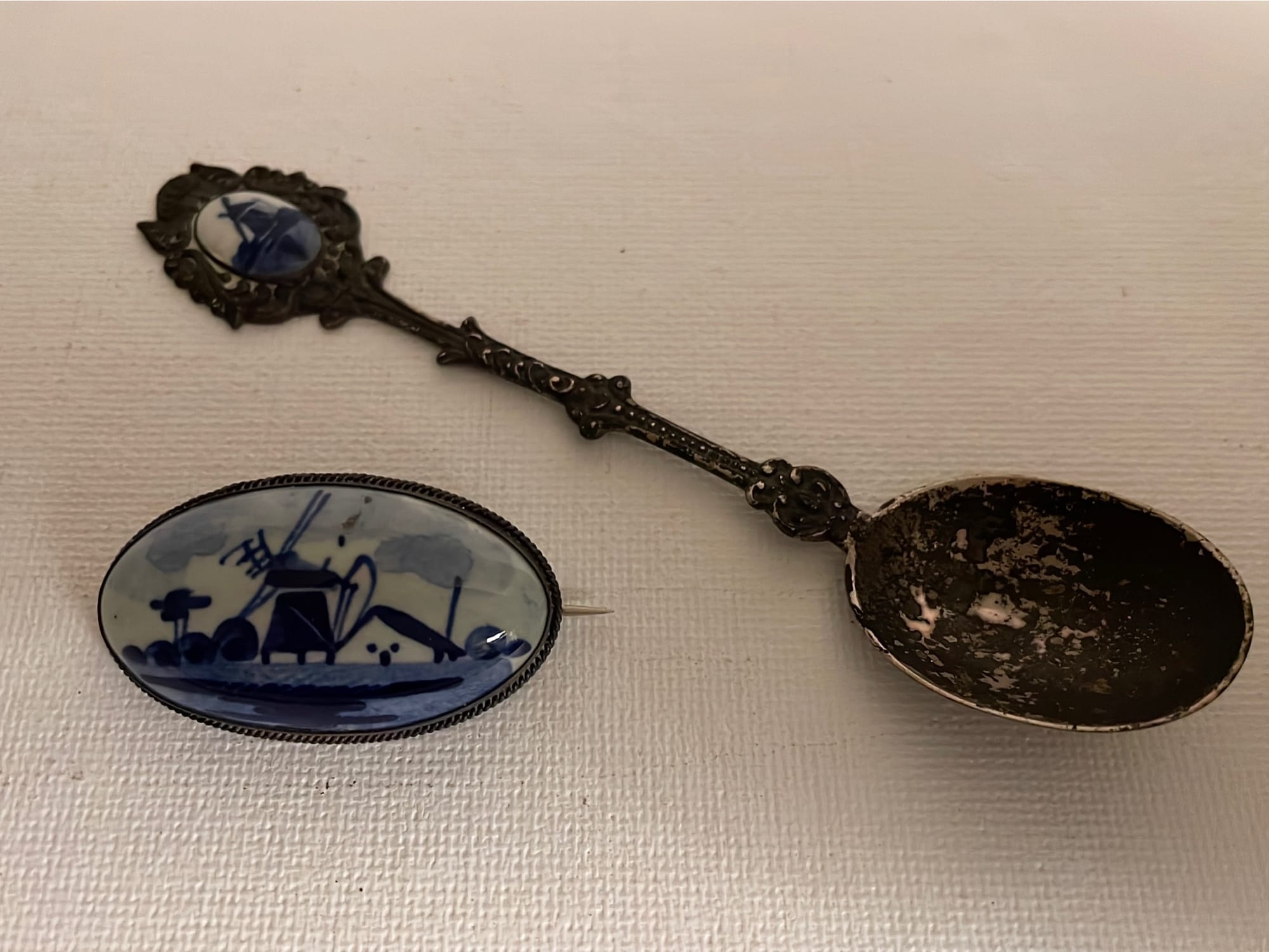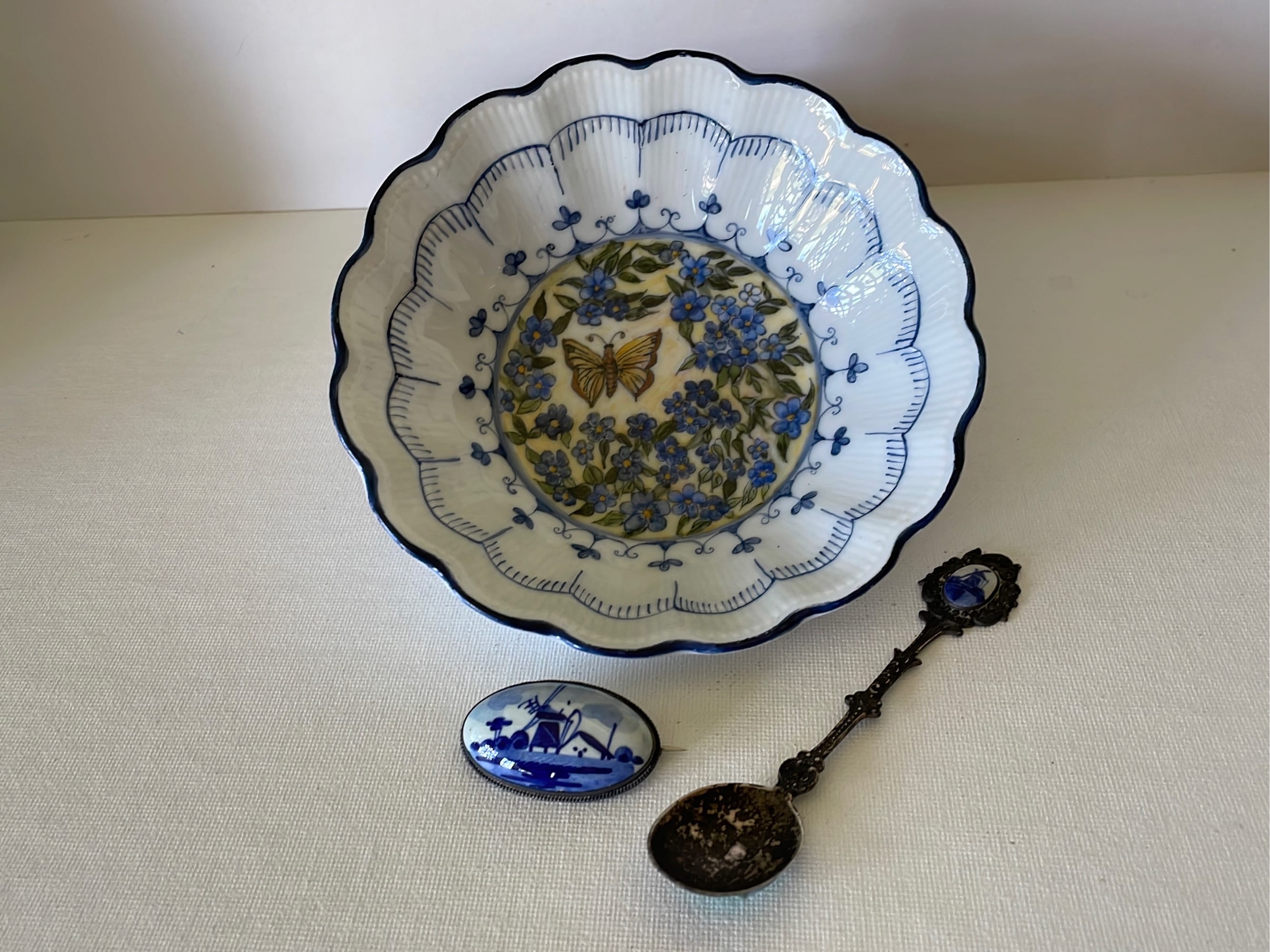 13 Delft China Brooch (1 in.), Kaiser of Germany “Romantica” dish dates 1987, and Blue/White Holland Collectable Spoon 4 3/8” (chipped)