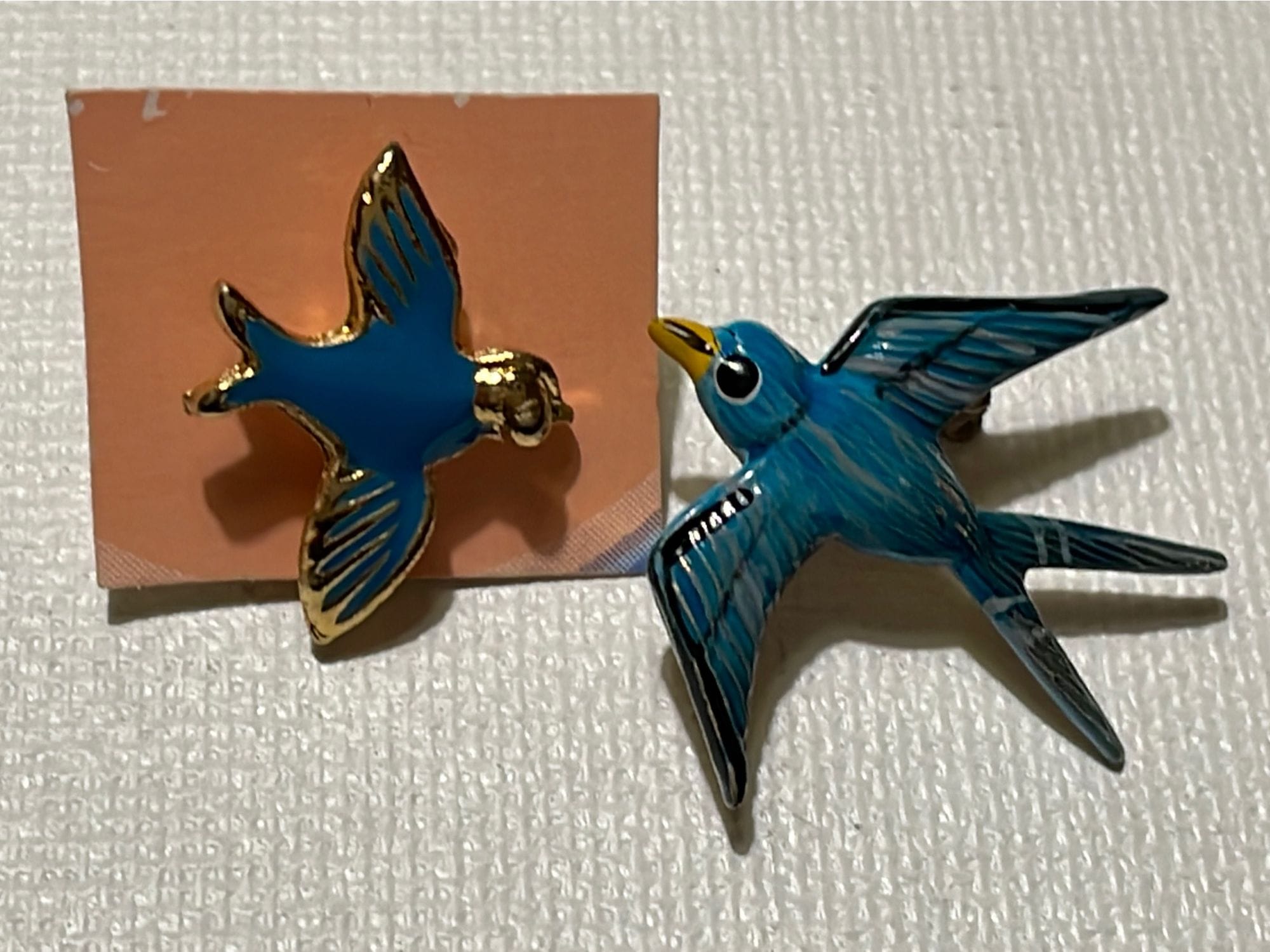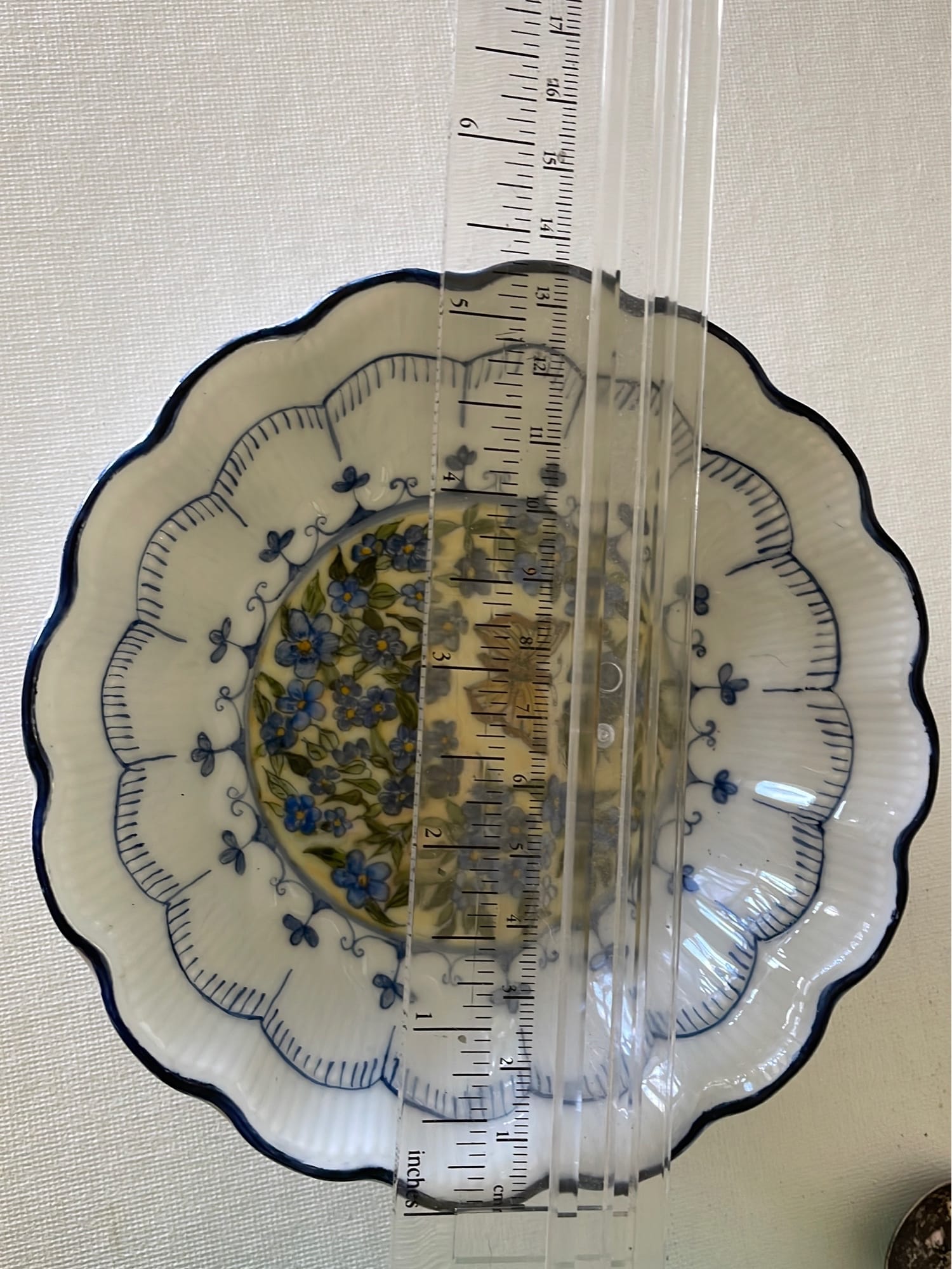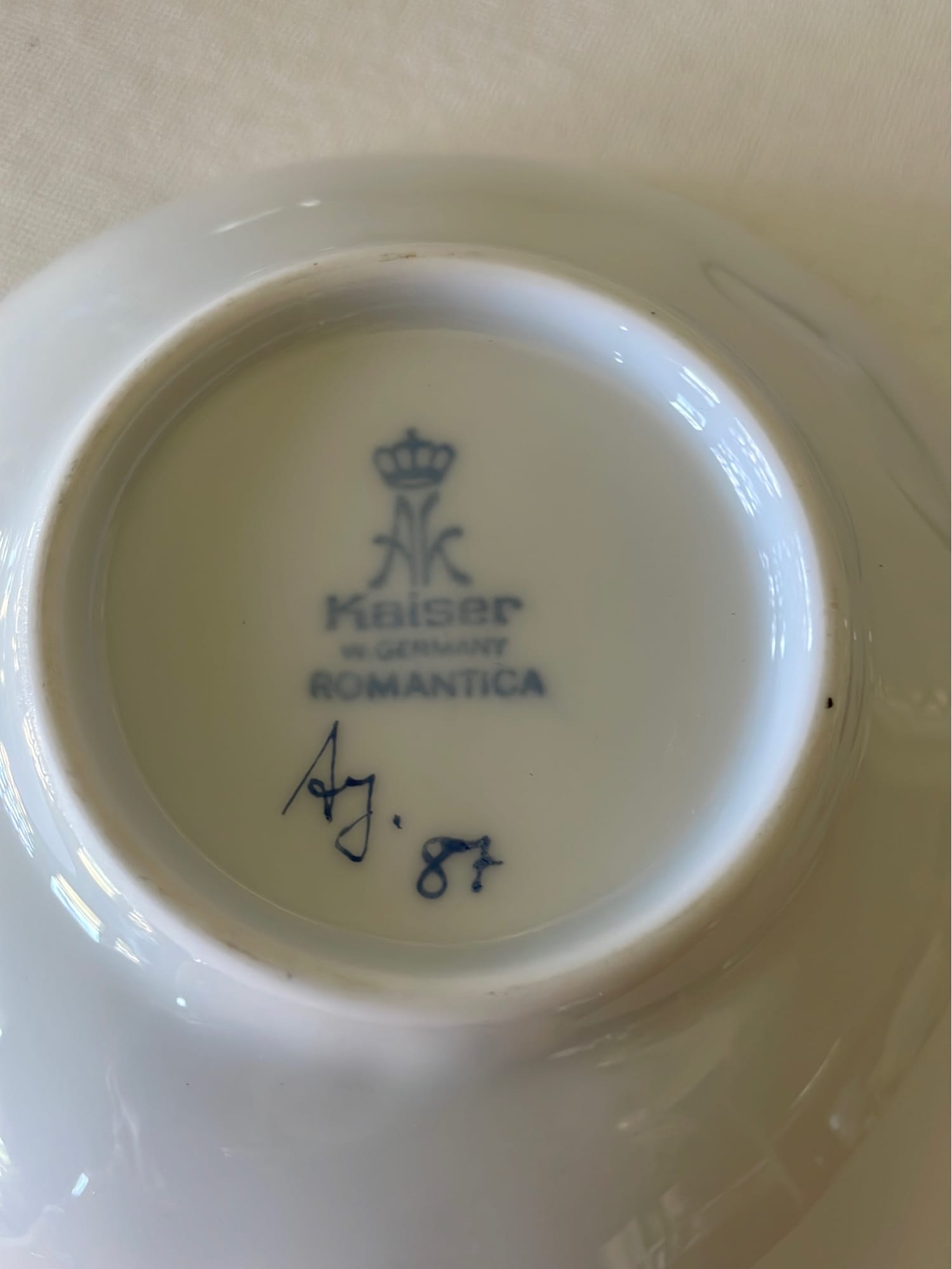 13 Delft China Brooch (1 in.), Kaiser of Germany “Romantica” dish dates 1987, and Blue/White Holland Collectable Spoon 4 3/8” (chipped)