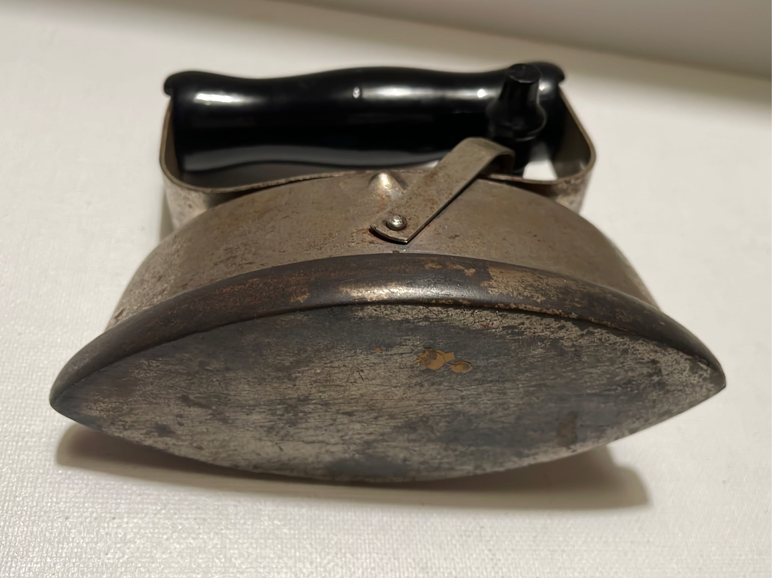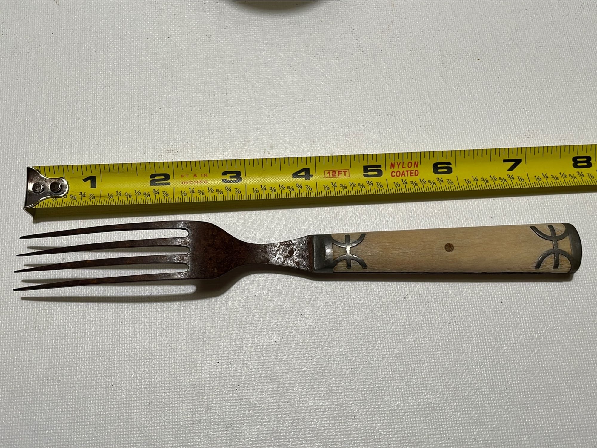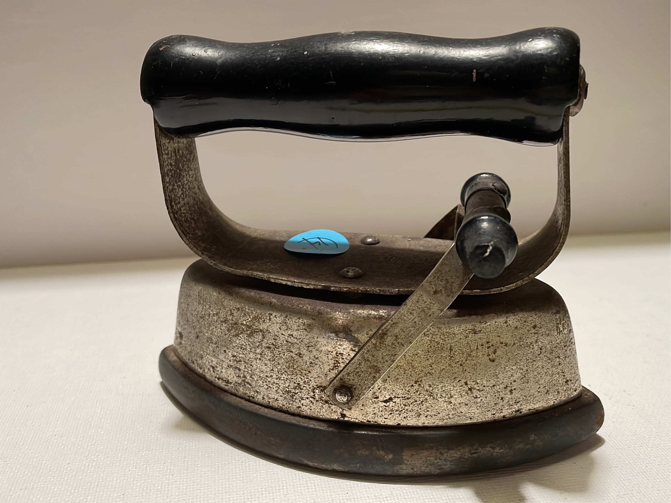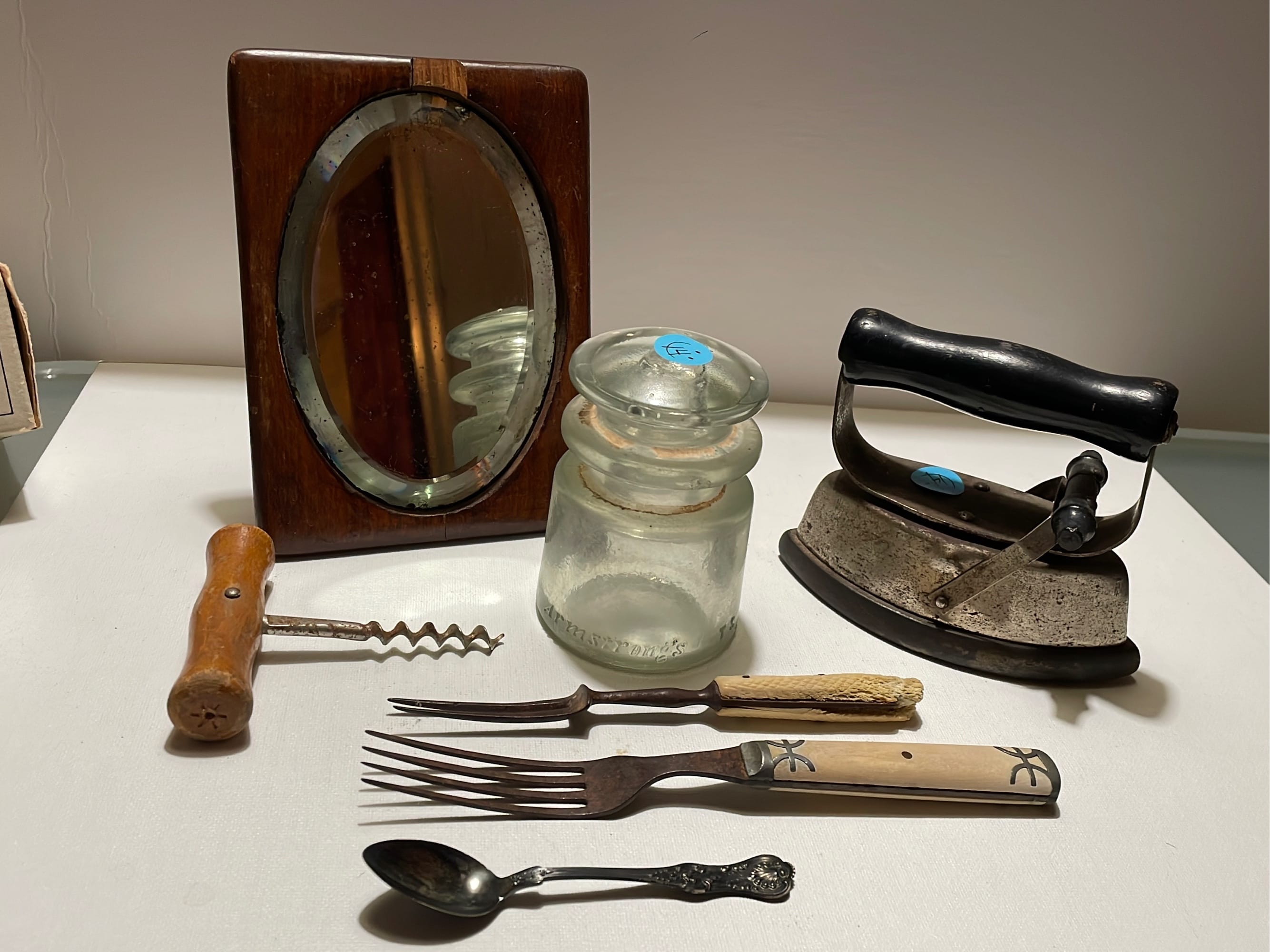 14 Iron, Armstrong glass insulator, Corkscrew, forks (1 with broken handle), small beveled mirror in chipped wooden frame, spoon marked “Sterling”