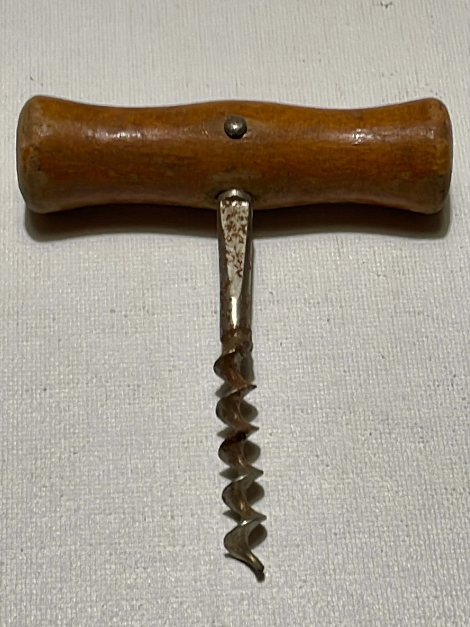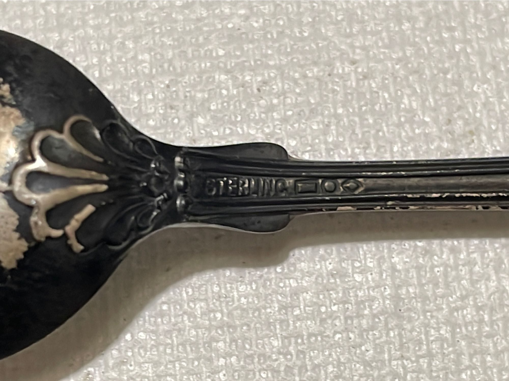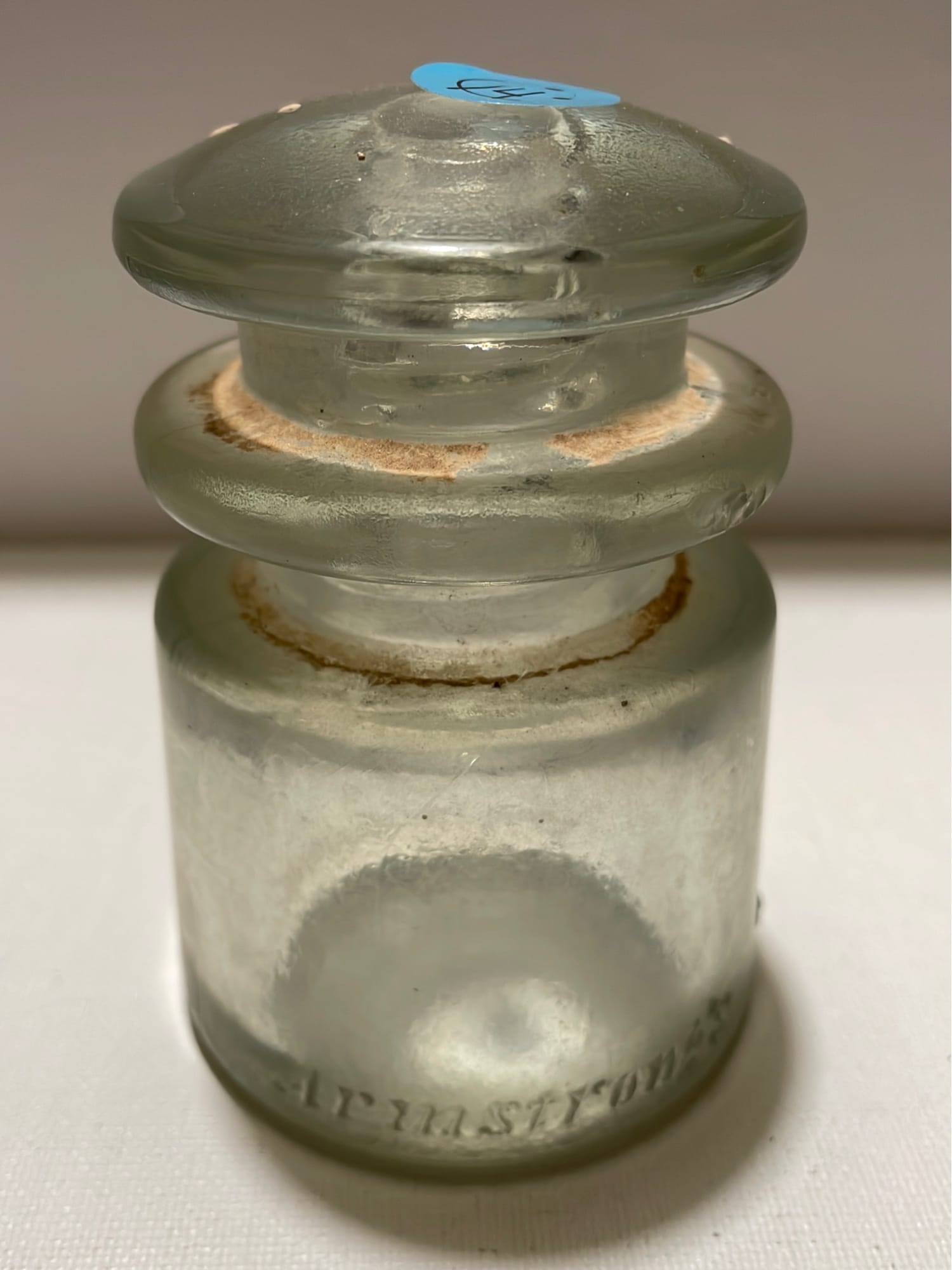 14 Iron, Armstrong glass insulator, Corkscrew, forks (1 with broken handle), small beveled mirror in chipped wooden frame, spoon marked “Sterling”