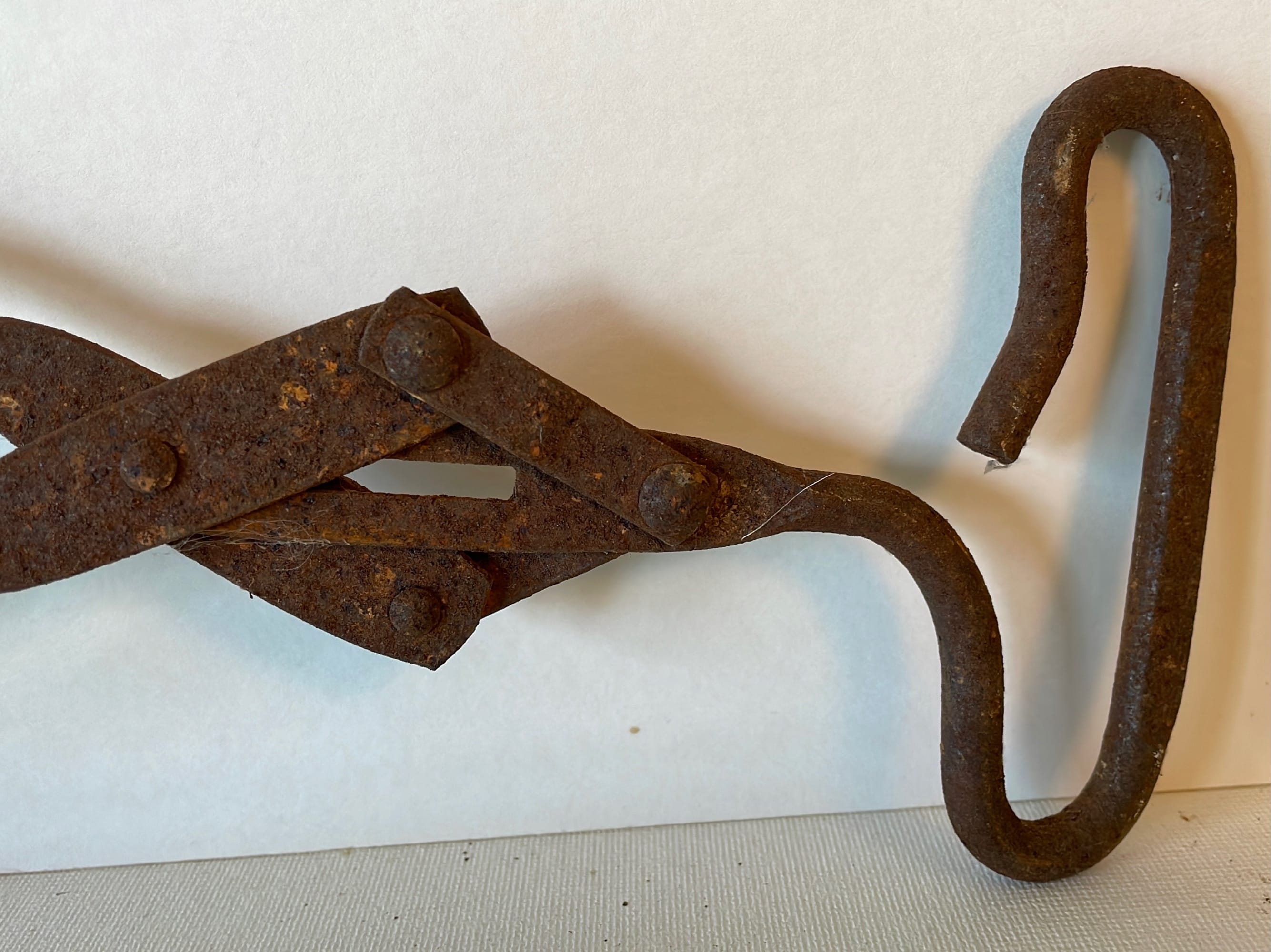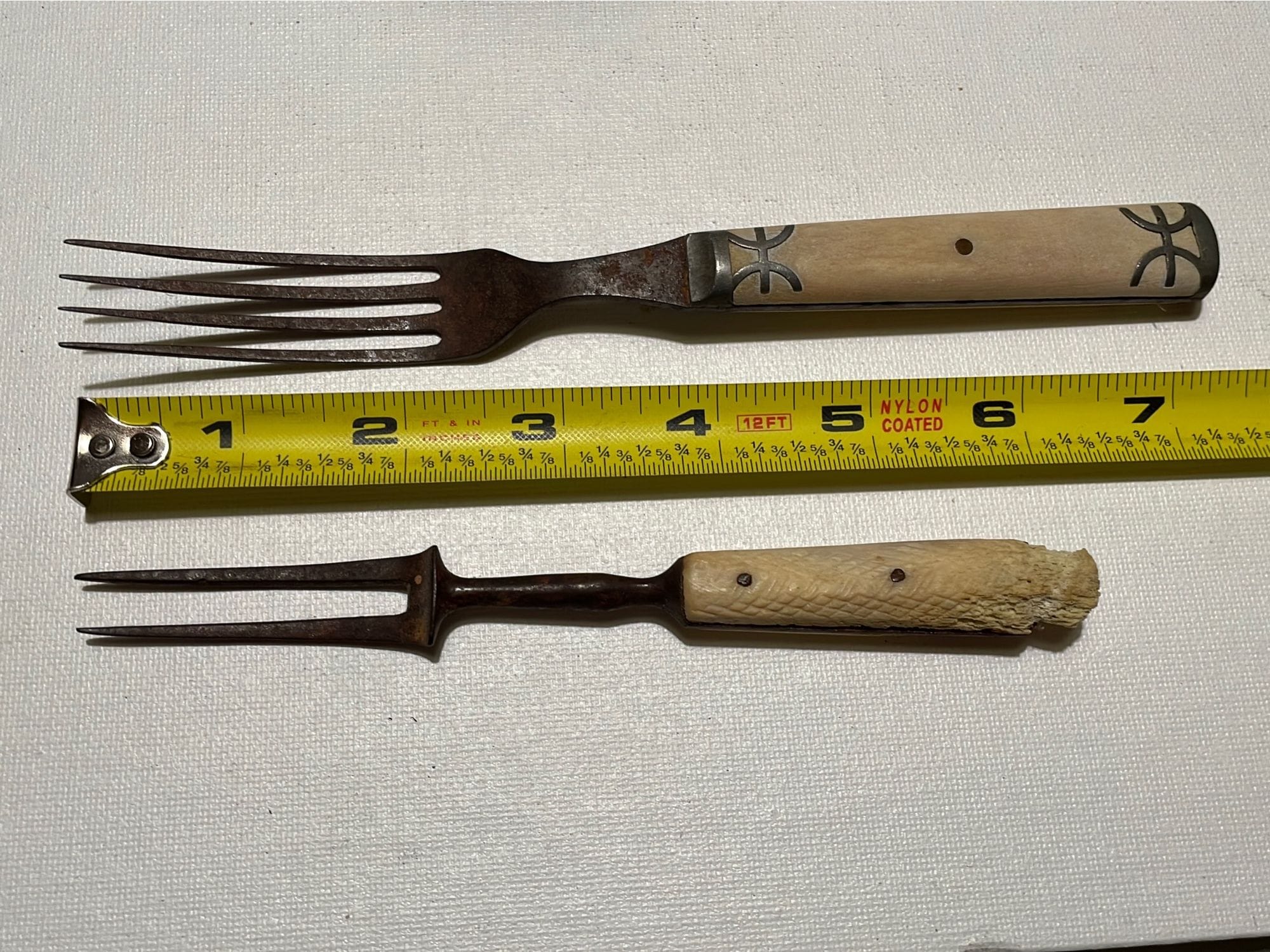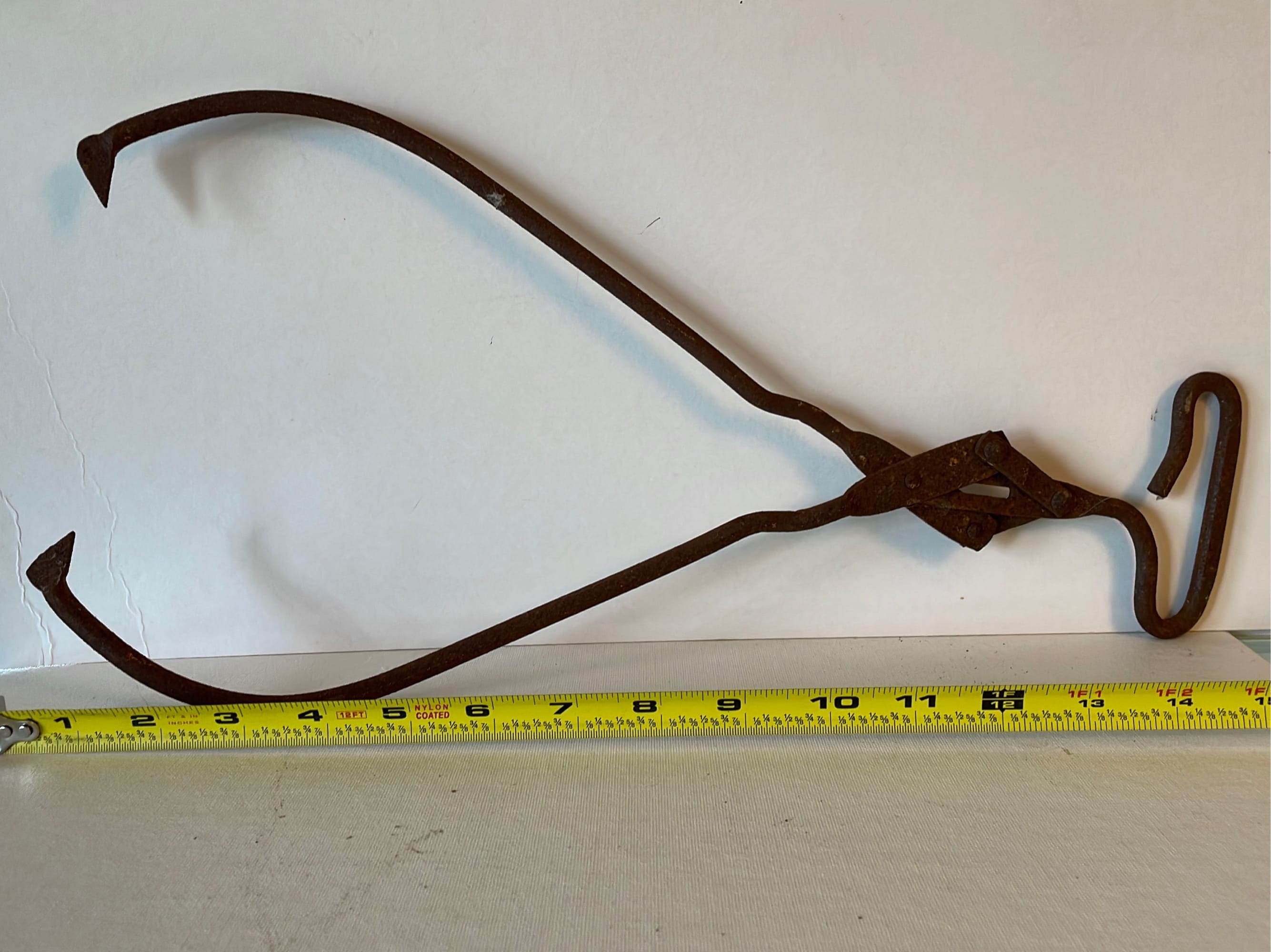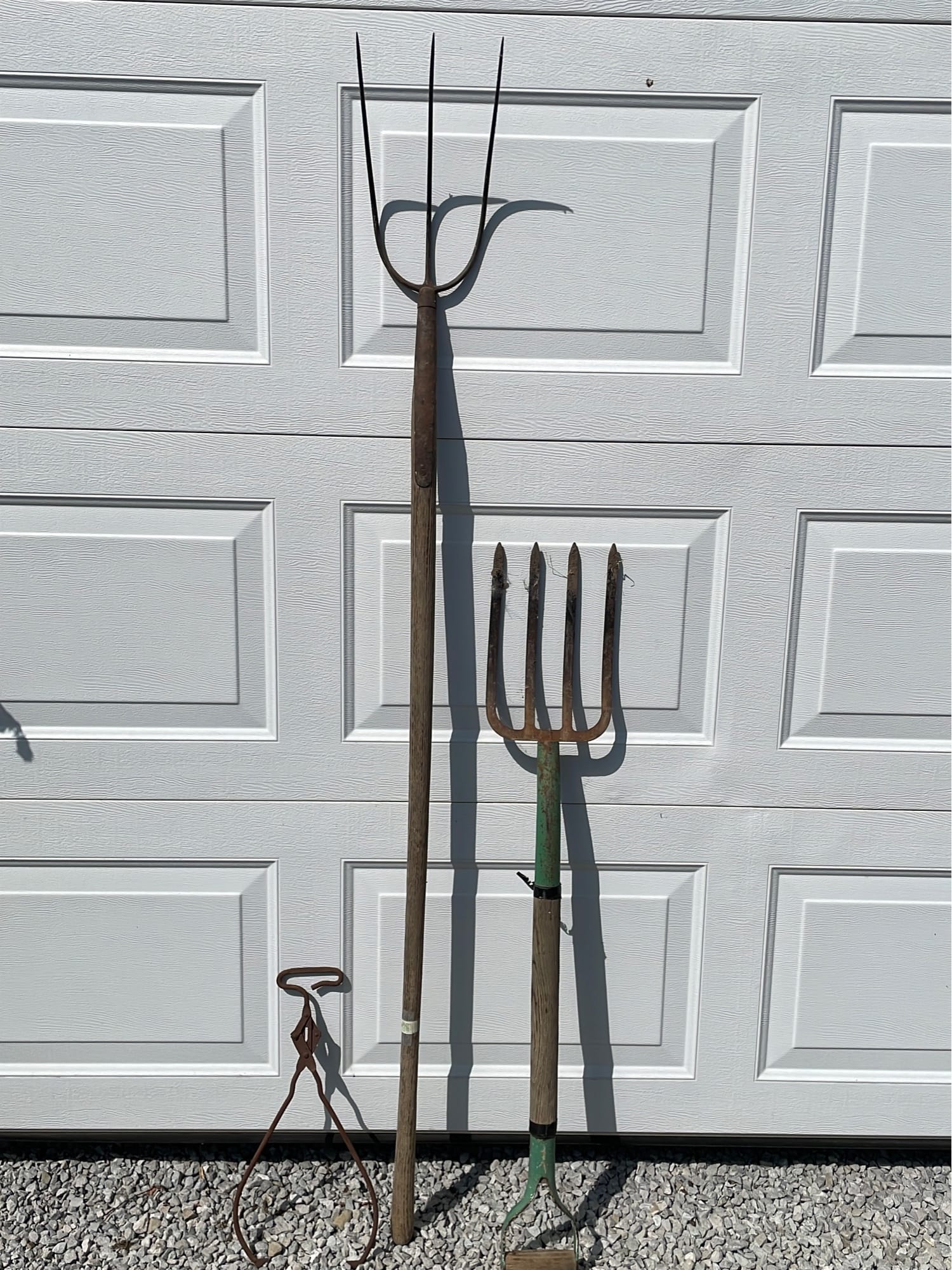 35 3 Vintage tools - 1 held together with duct tape: rusty ice tongs, 2 pitch and garden forks