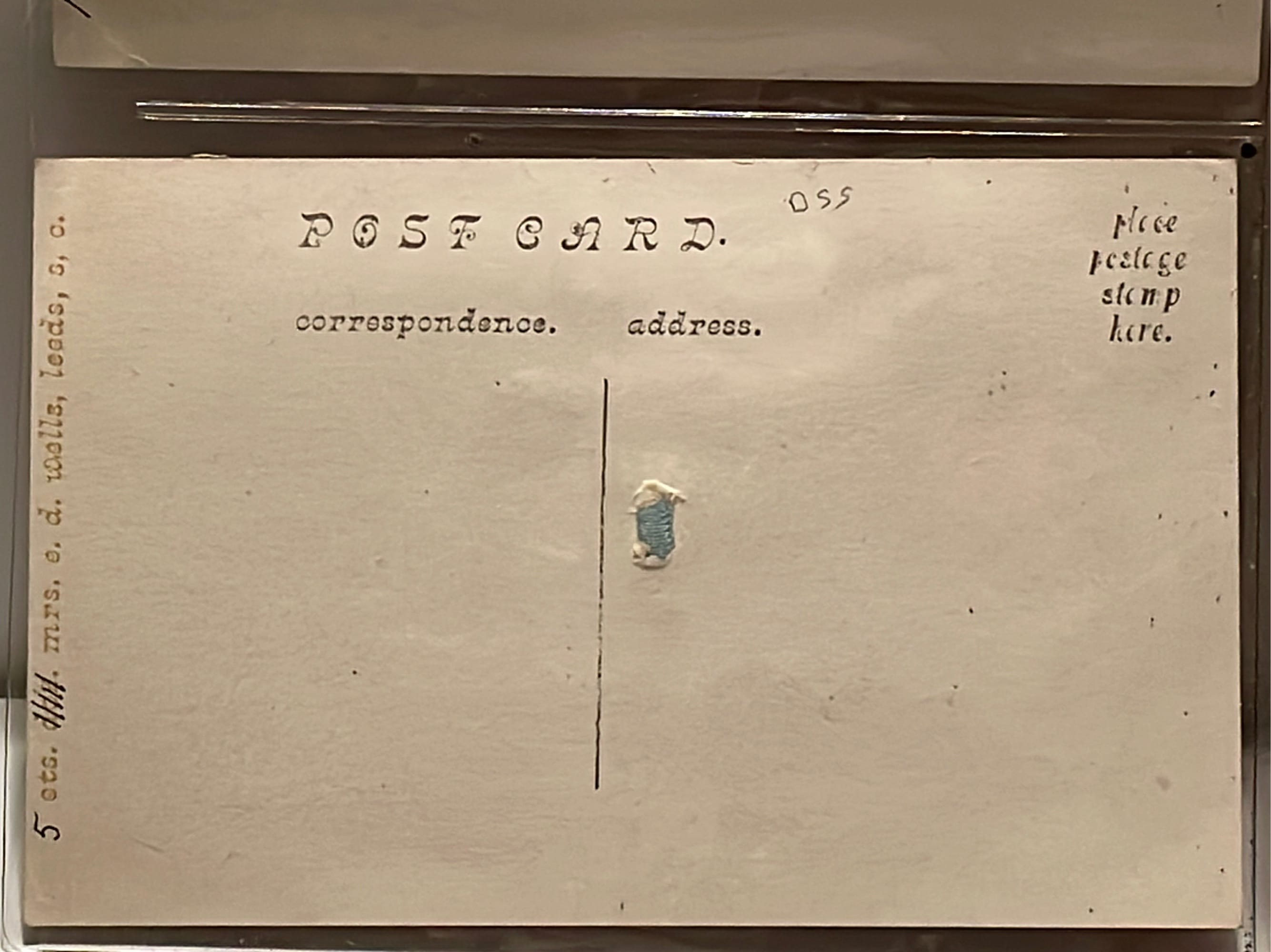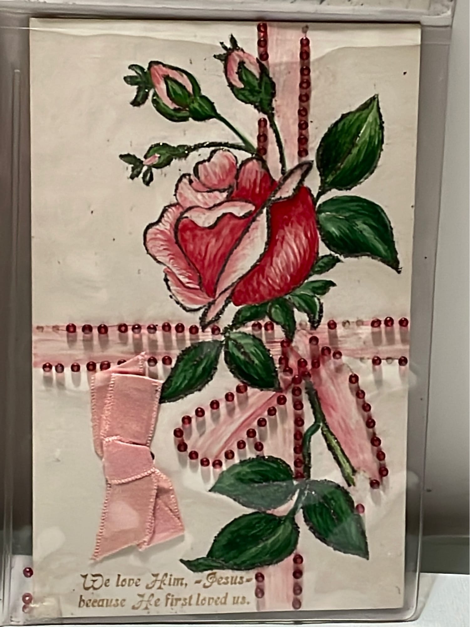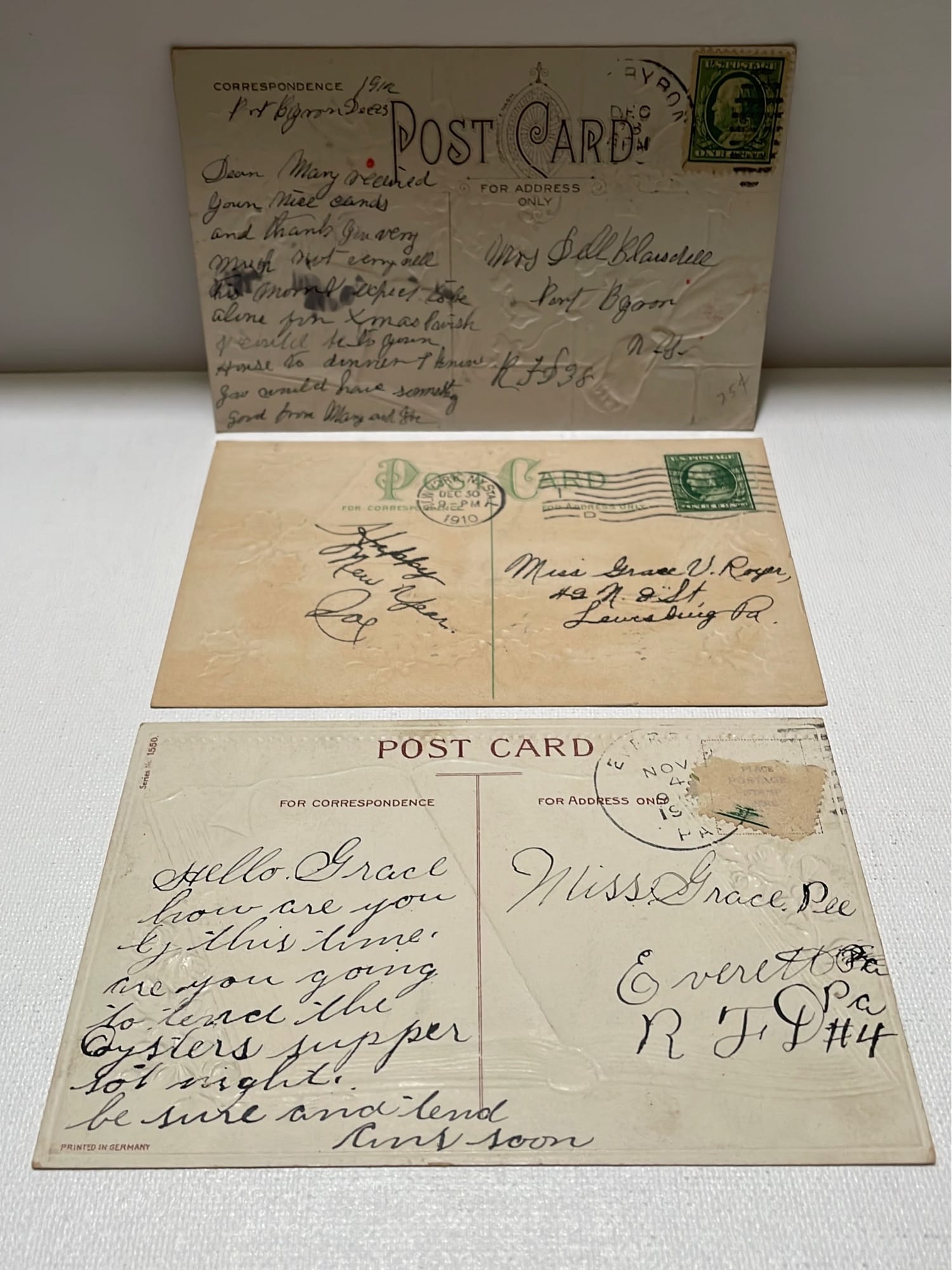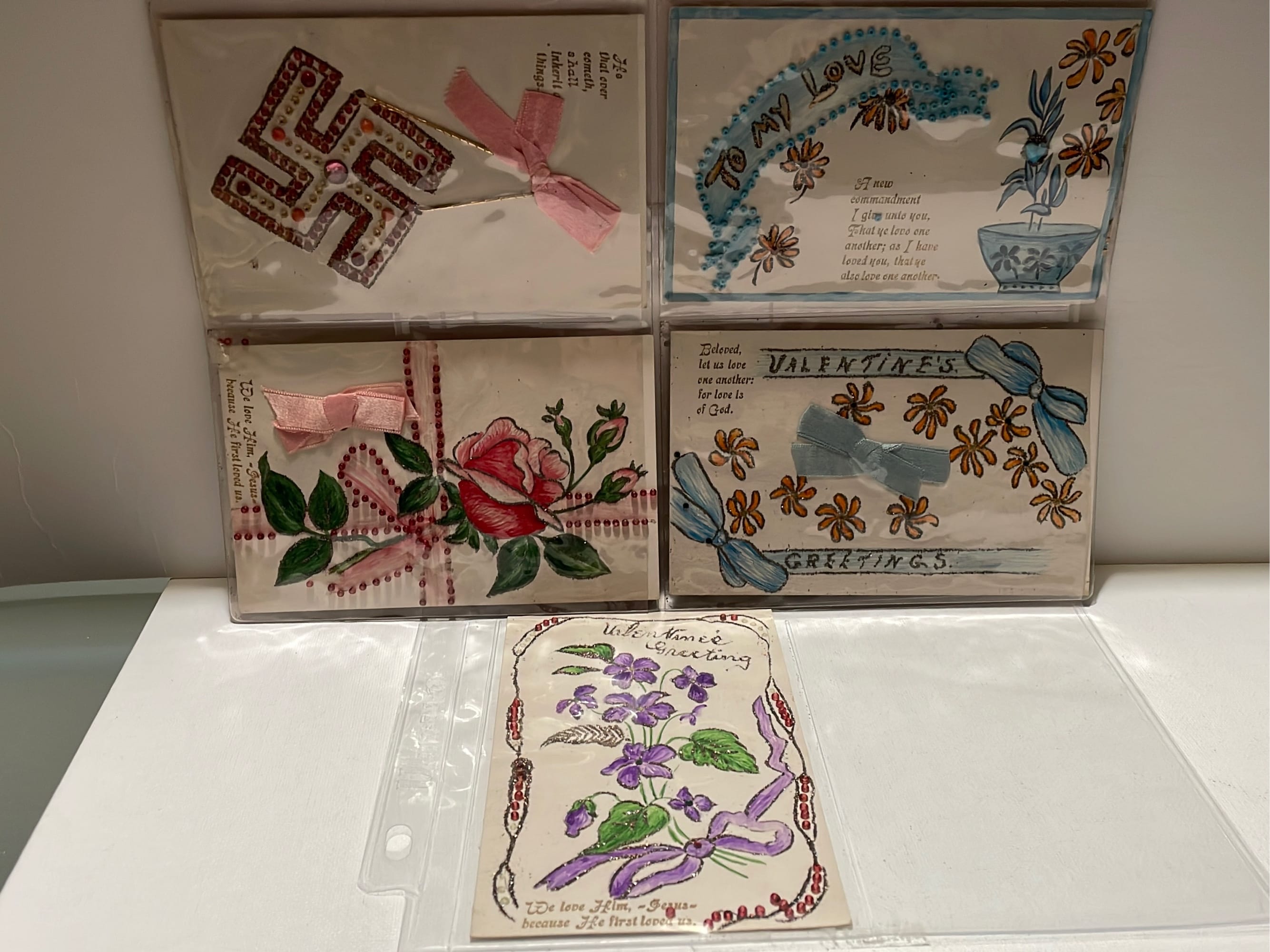 26 5 Vintage postcards: Seemingly handmade, 4 with the name of Mrs. E. D. Wells, Leads, S. C. (some beads losing adhesion and popping off)