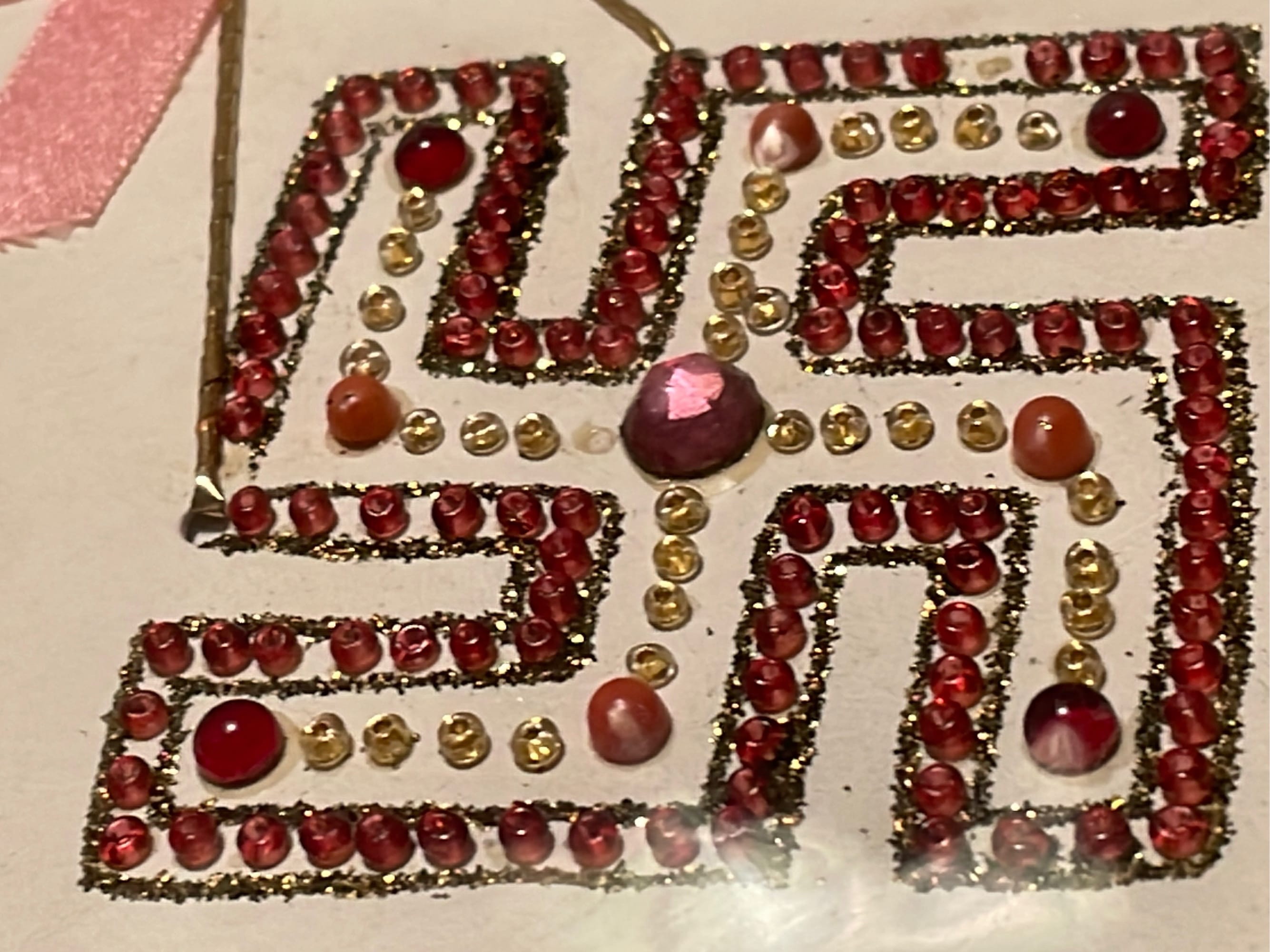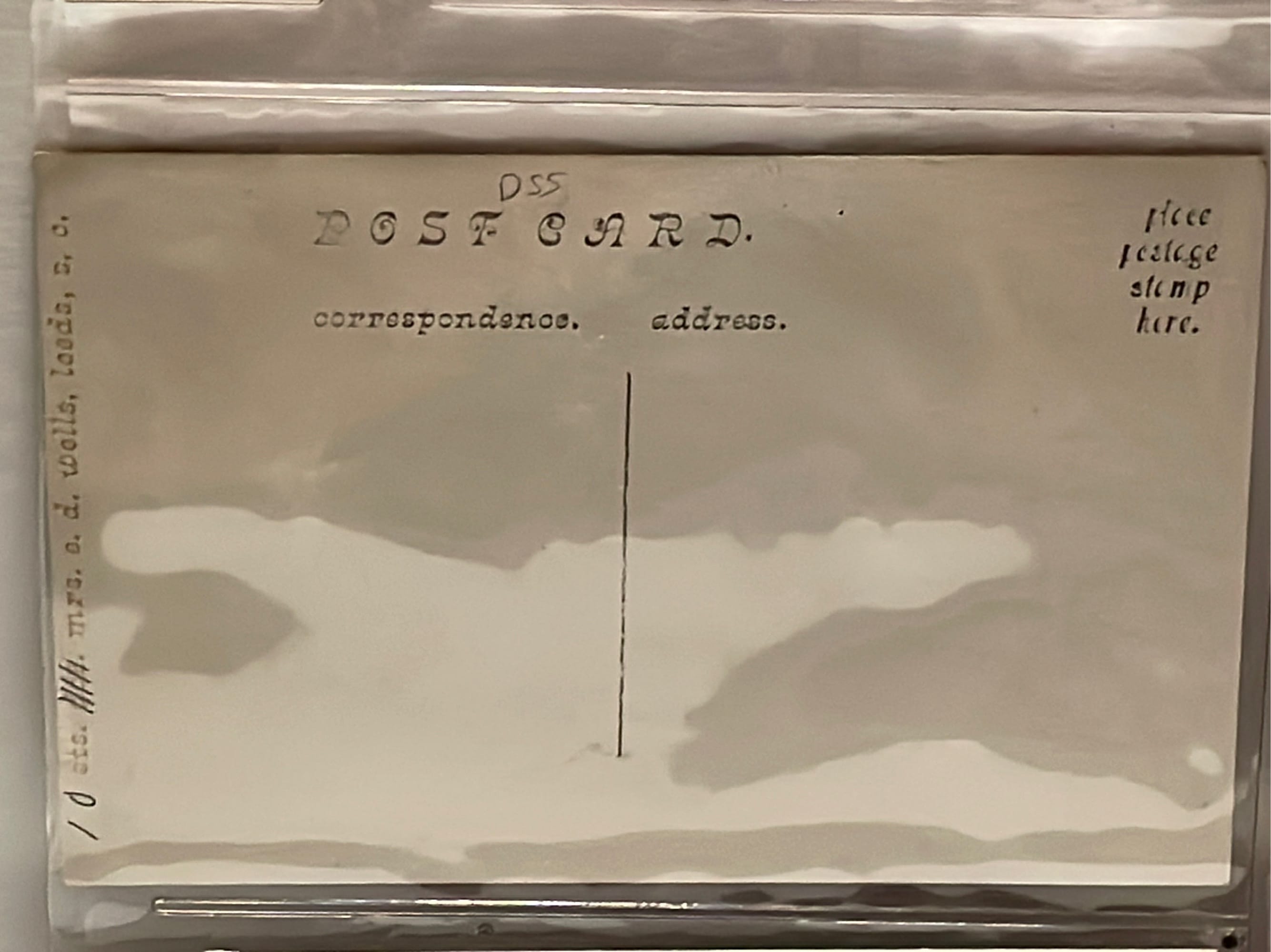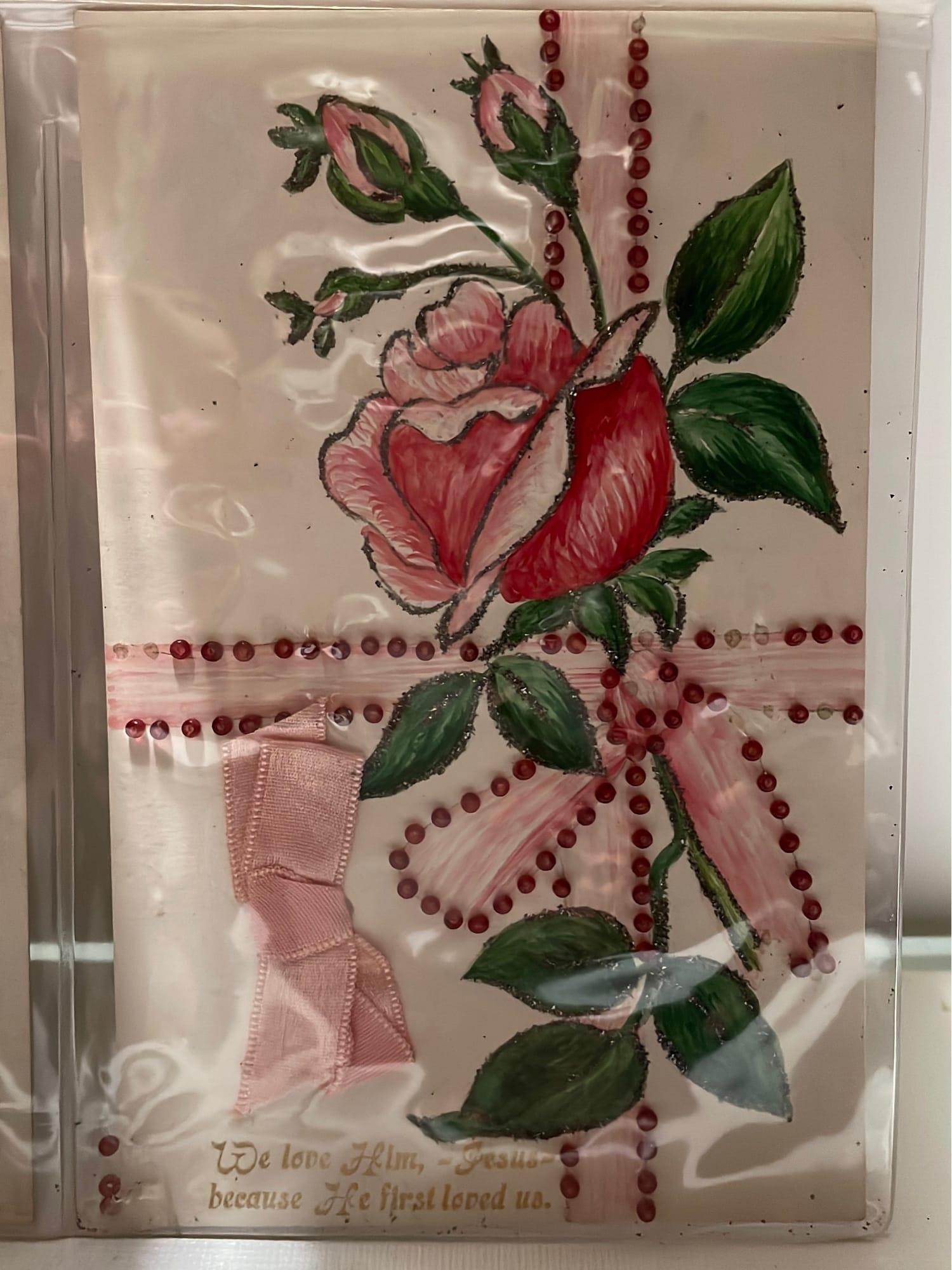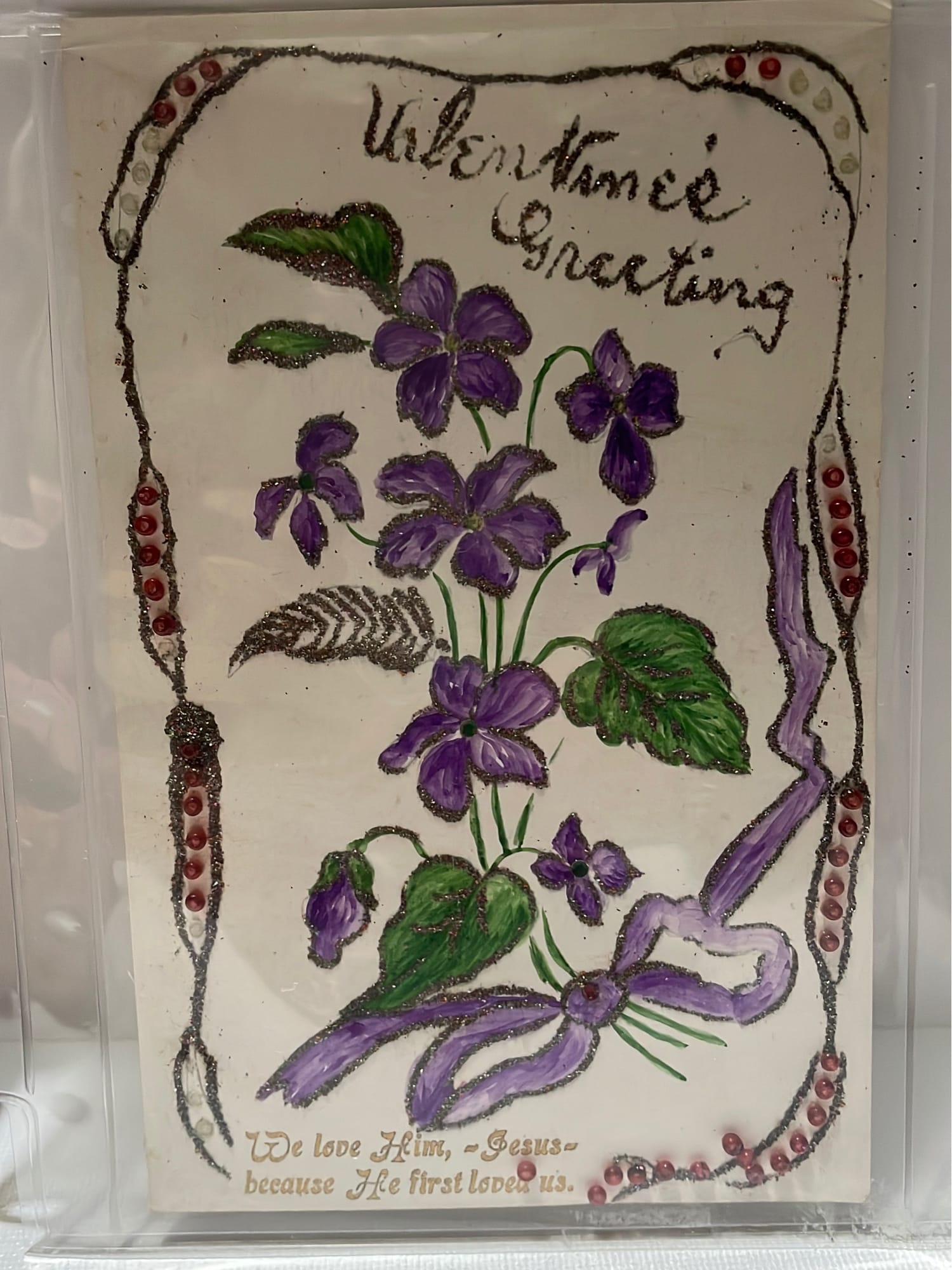 26 5 Vintage postcards: Seemingly handmade, 4 with the name of Mrs. E. D. Wells, Leads, S. C. (some beads losing adhesion and popping off)