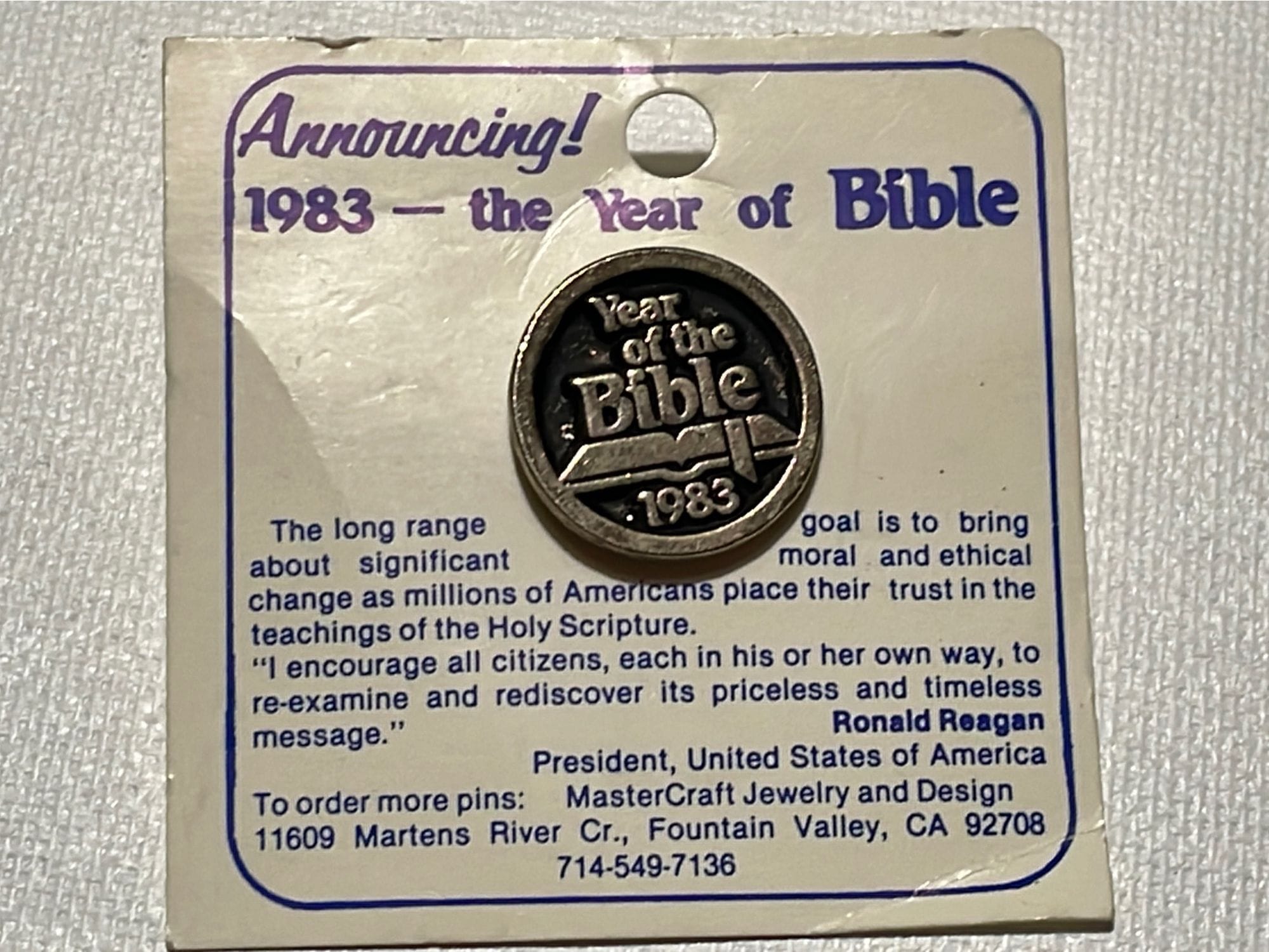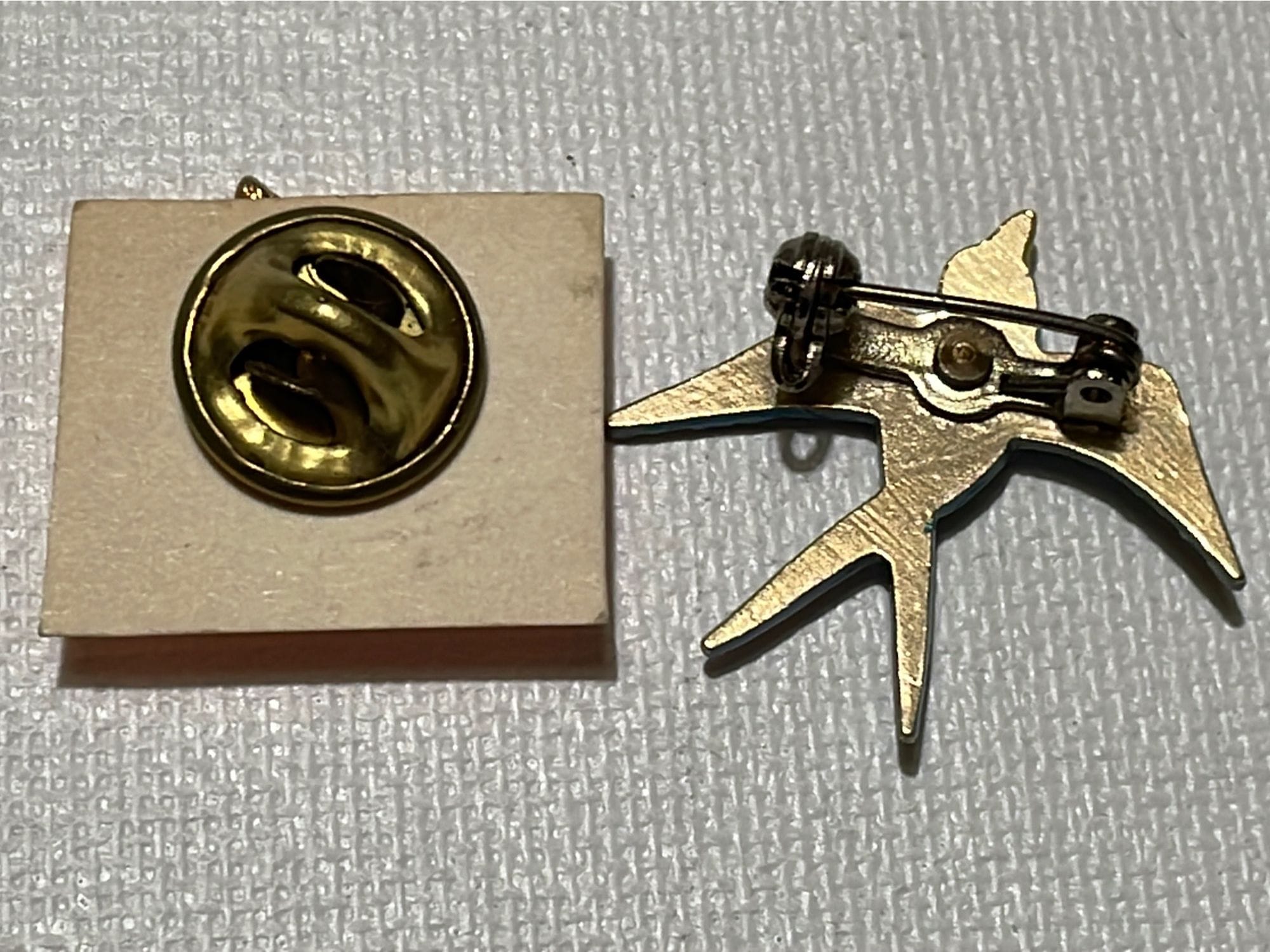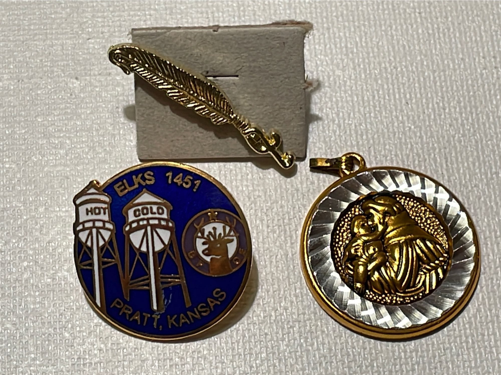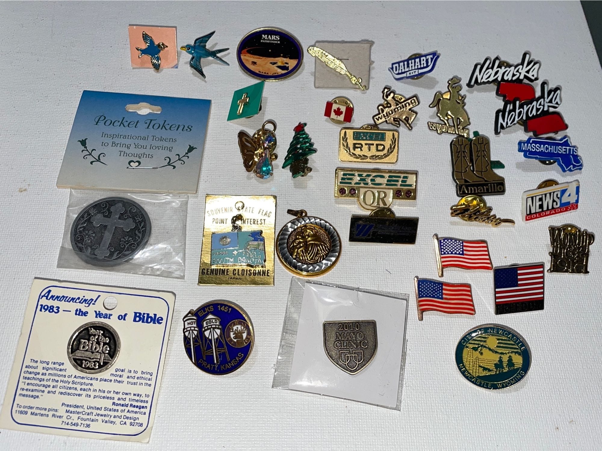 25 Metal and plastic lapel pins and charms, including: Elks Pratt, Kansas, Rhode Island, South Dakota, Mars Pathfinder, Ronald Reagan’s “1983 Year of Bible,” American flags, Mayo Clinic, etc.