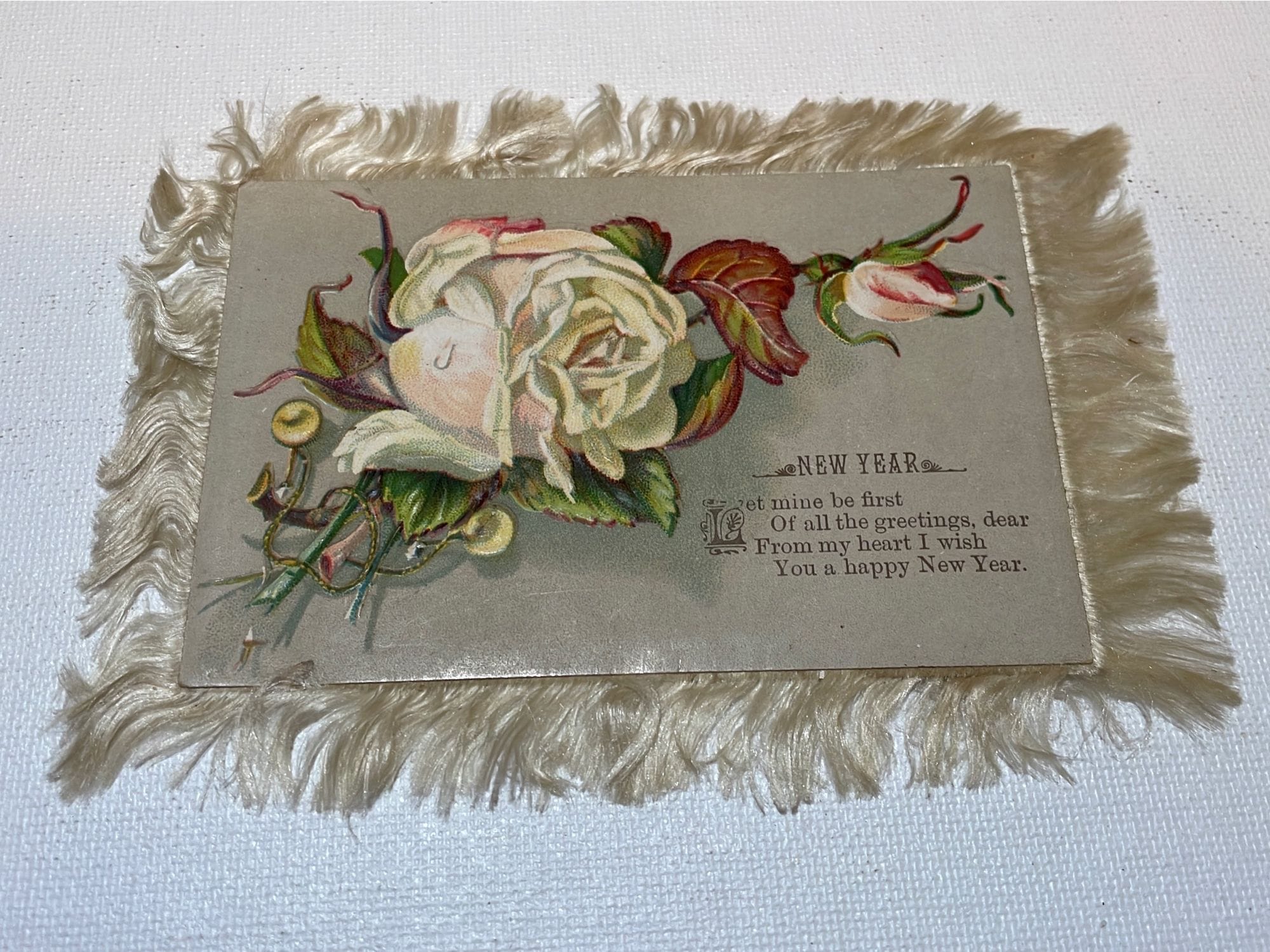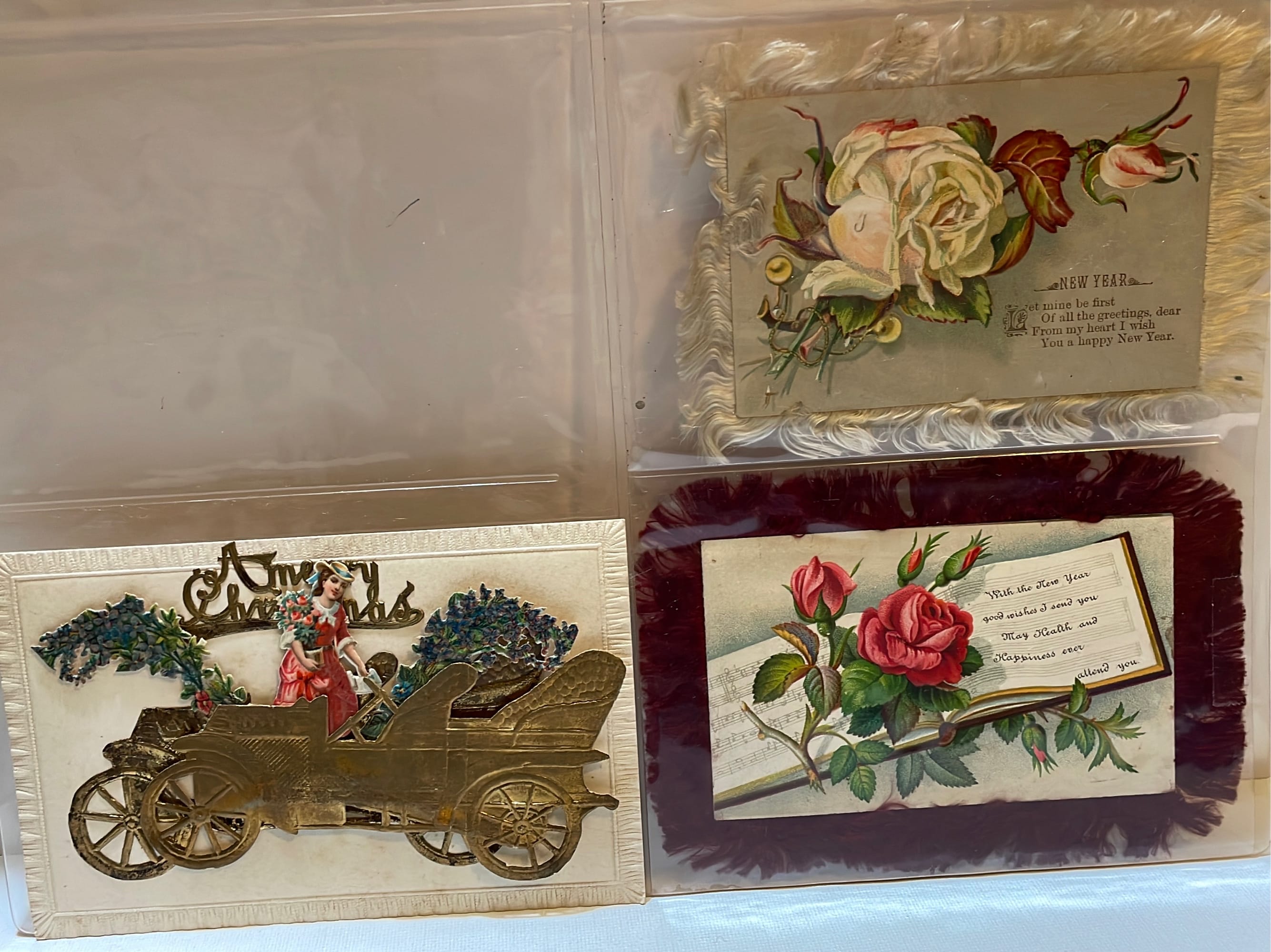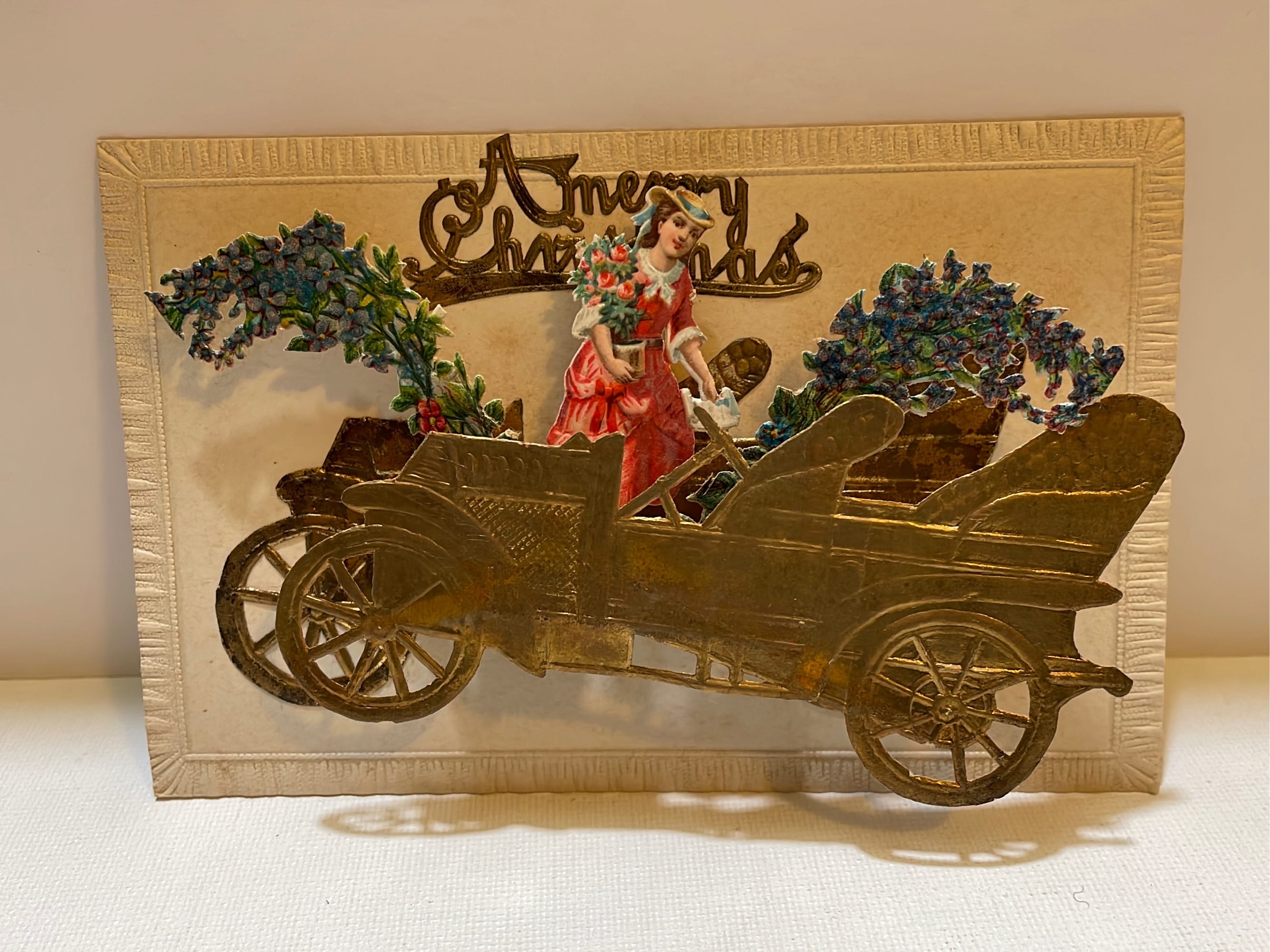 28 3 Special Vintage postcards: 2 fringed Christmas/New Year cards, and 1 3-Dimensional Christmas card of woman entering car