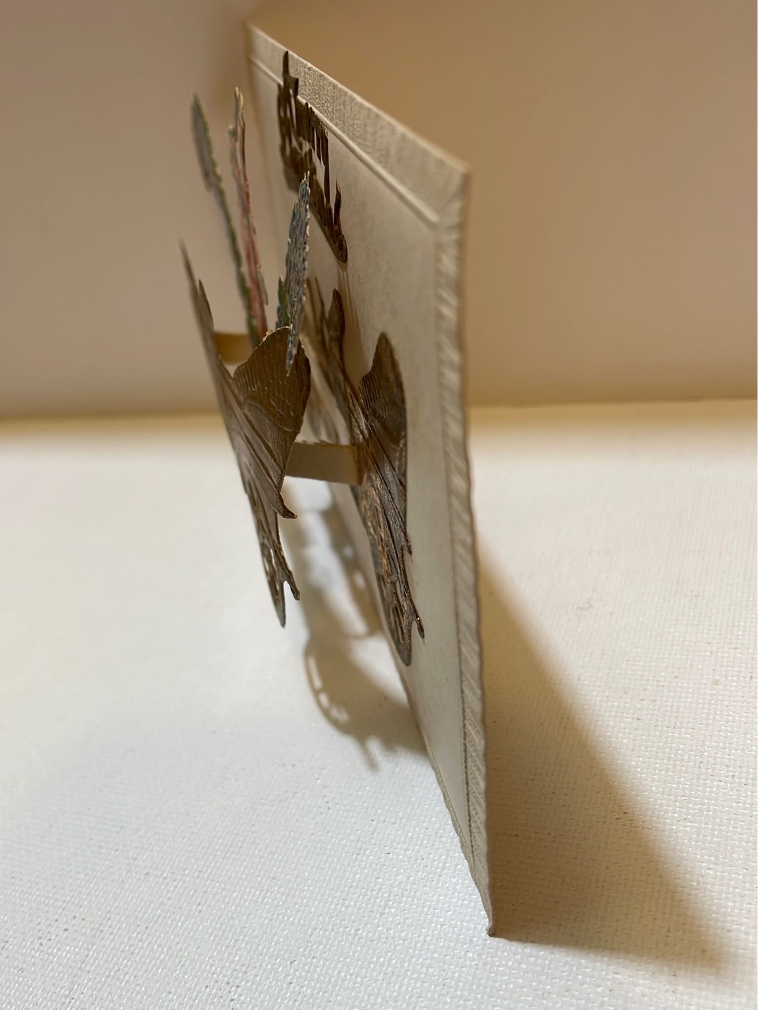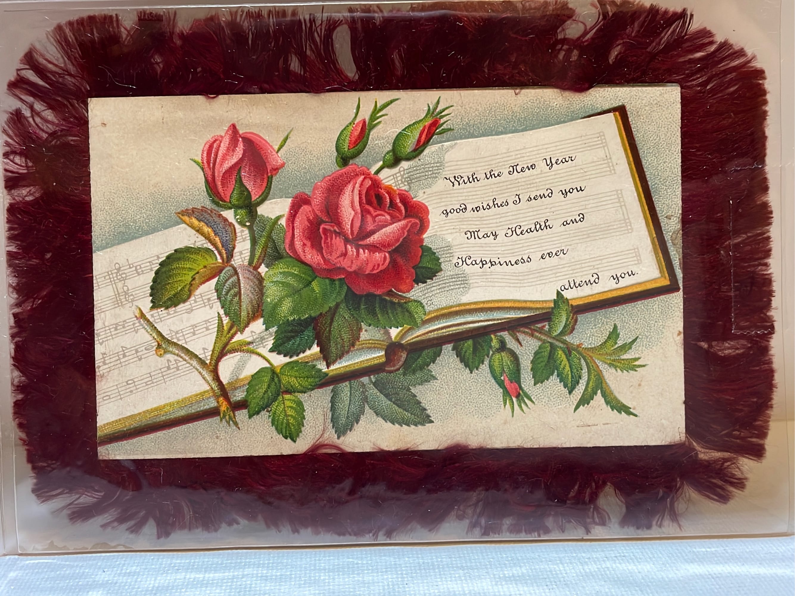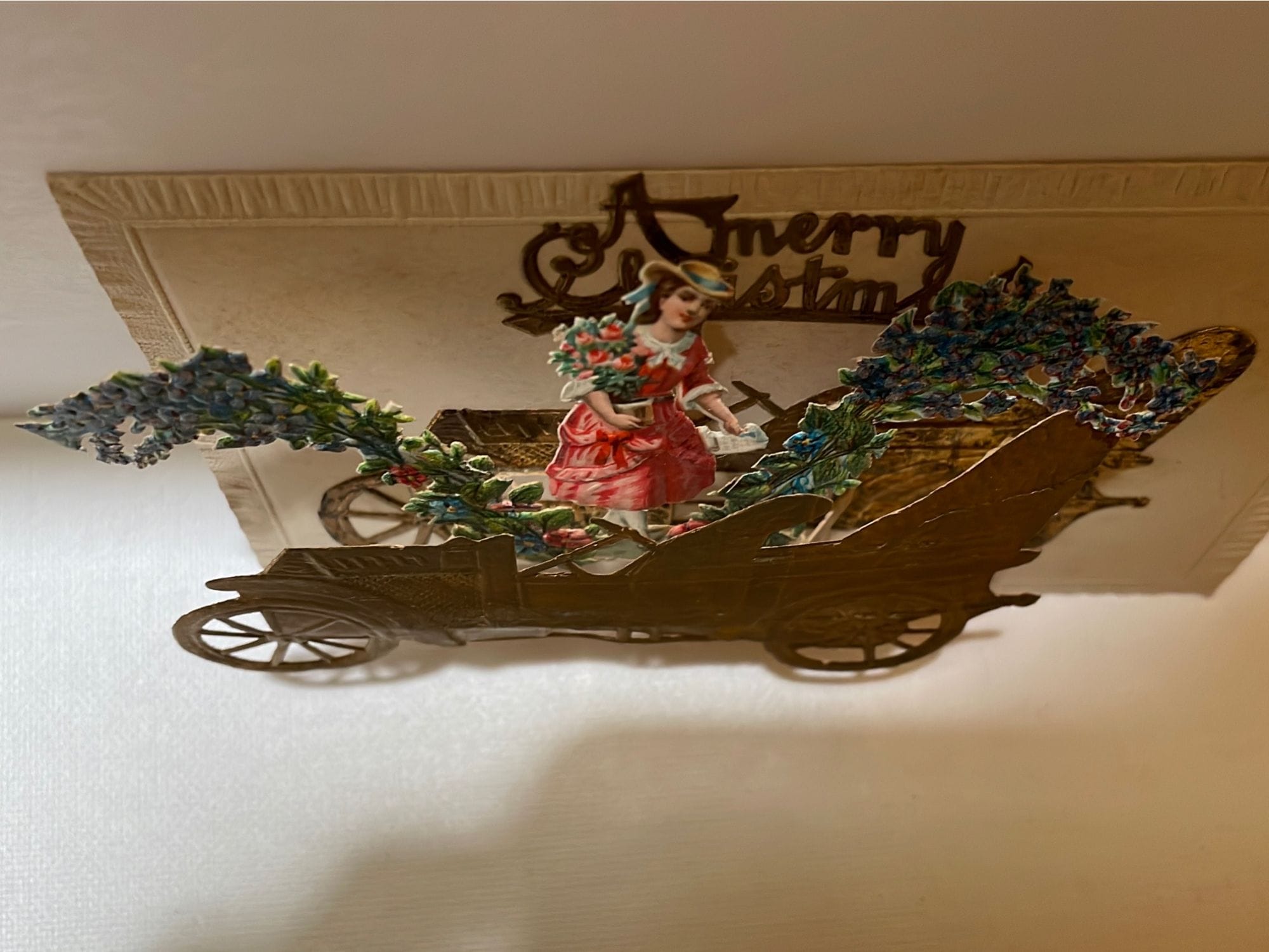 28 3 Special Vintage postcards: 2 fringed Christmas/New Year cards, and 1 3-Dimensional Christmas card of woman entering car